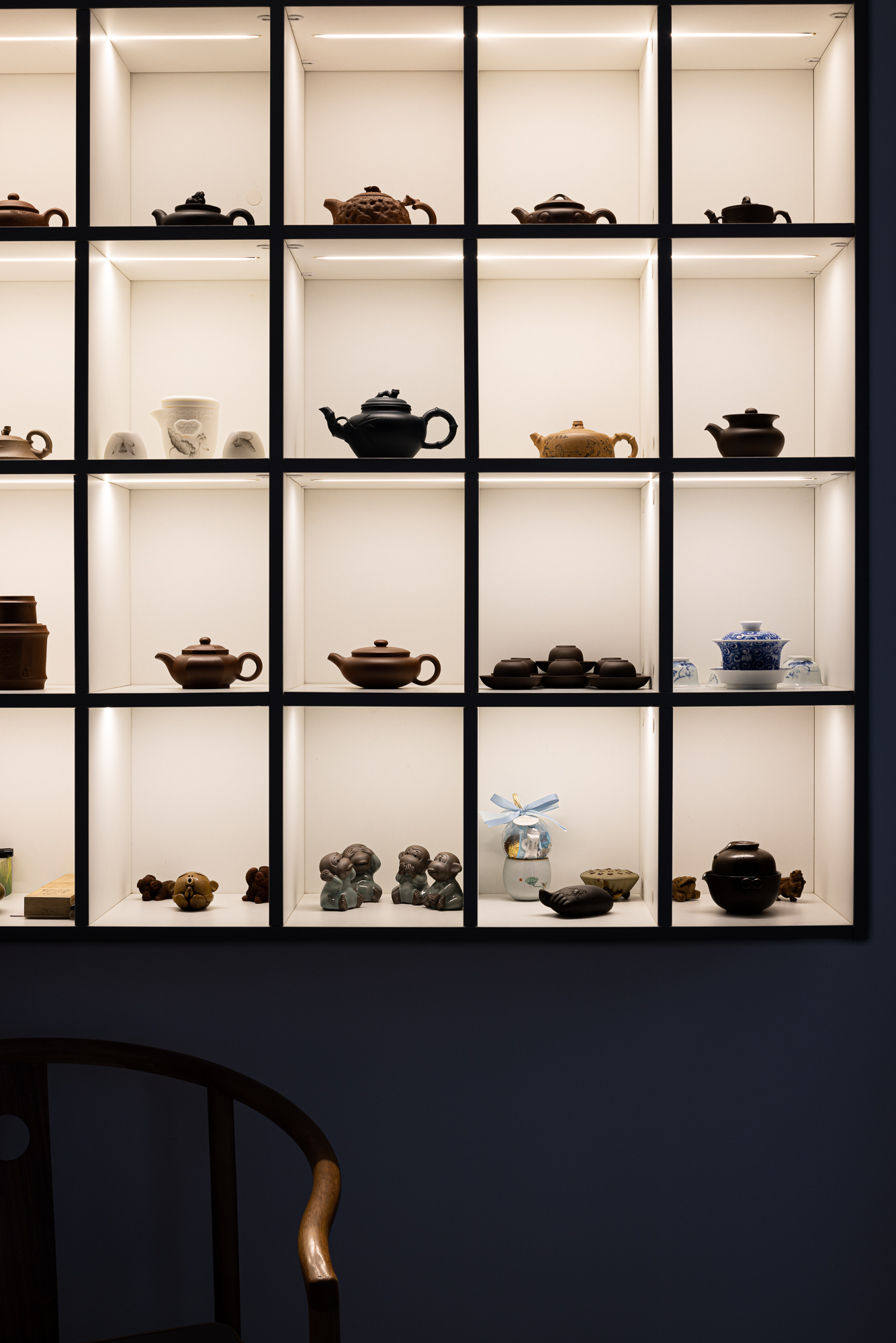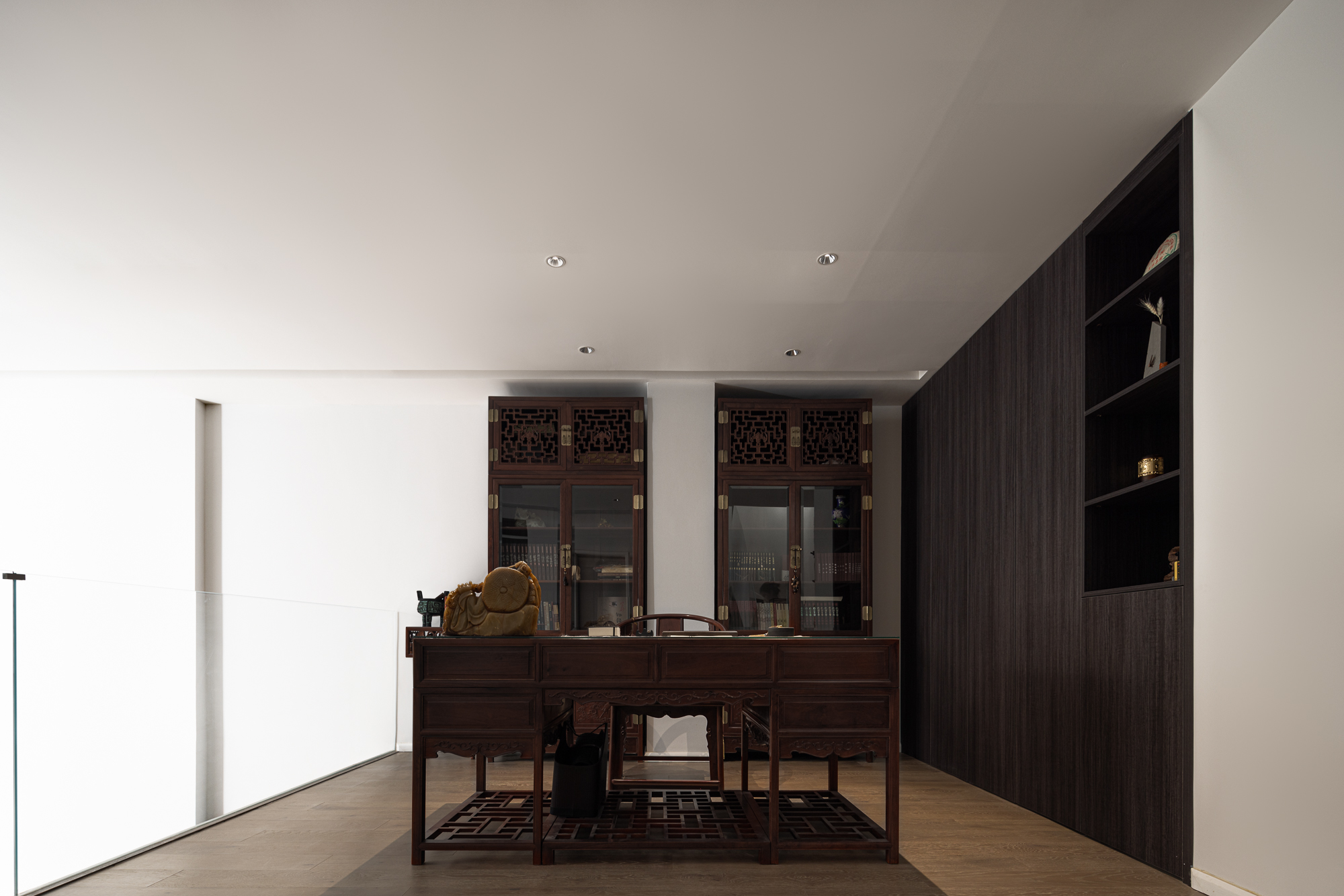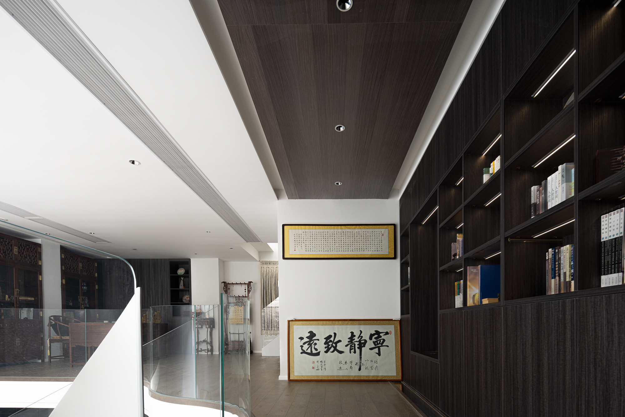 空间布局:1.因为屋主喜欢喝茶、看书、收藏,,老屋准备传承的中式家具必须用心打理,那些收藏看了半辈子的书籍也要好好保管,于是,设计师利用负二层高做搭建,多出了这个写字画画的地方,一整面墙通顶而上将藏品与书籍妥妥安放它们与空间相互融合,如风格一般有自己的特色,没有特定的风格,相互融合彼此装点就很好。