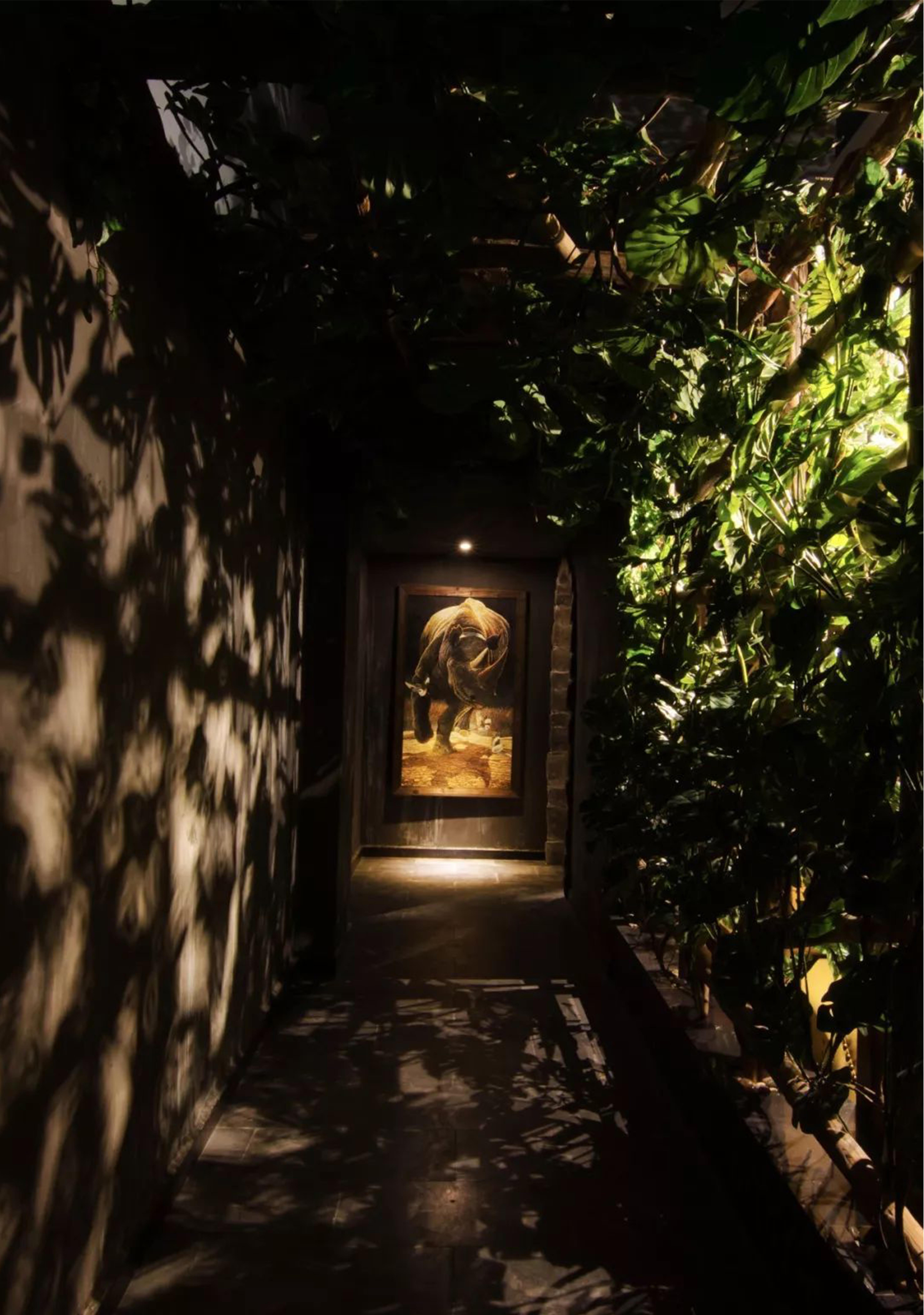 用旧椽木和绿植围合出一个进入二楼大厅前的走廊,青石地面,水泥本色的墙身,光线从绿叶的缝隙中透射入廊里,形成的光斑如儿时村里的瓜棚,人在光斑的折射下穿梭而行,别有一份惬意之情。