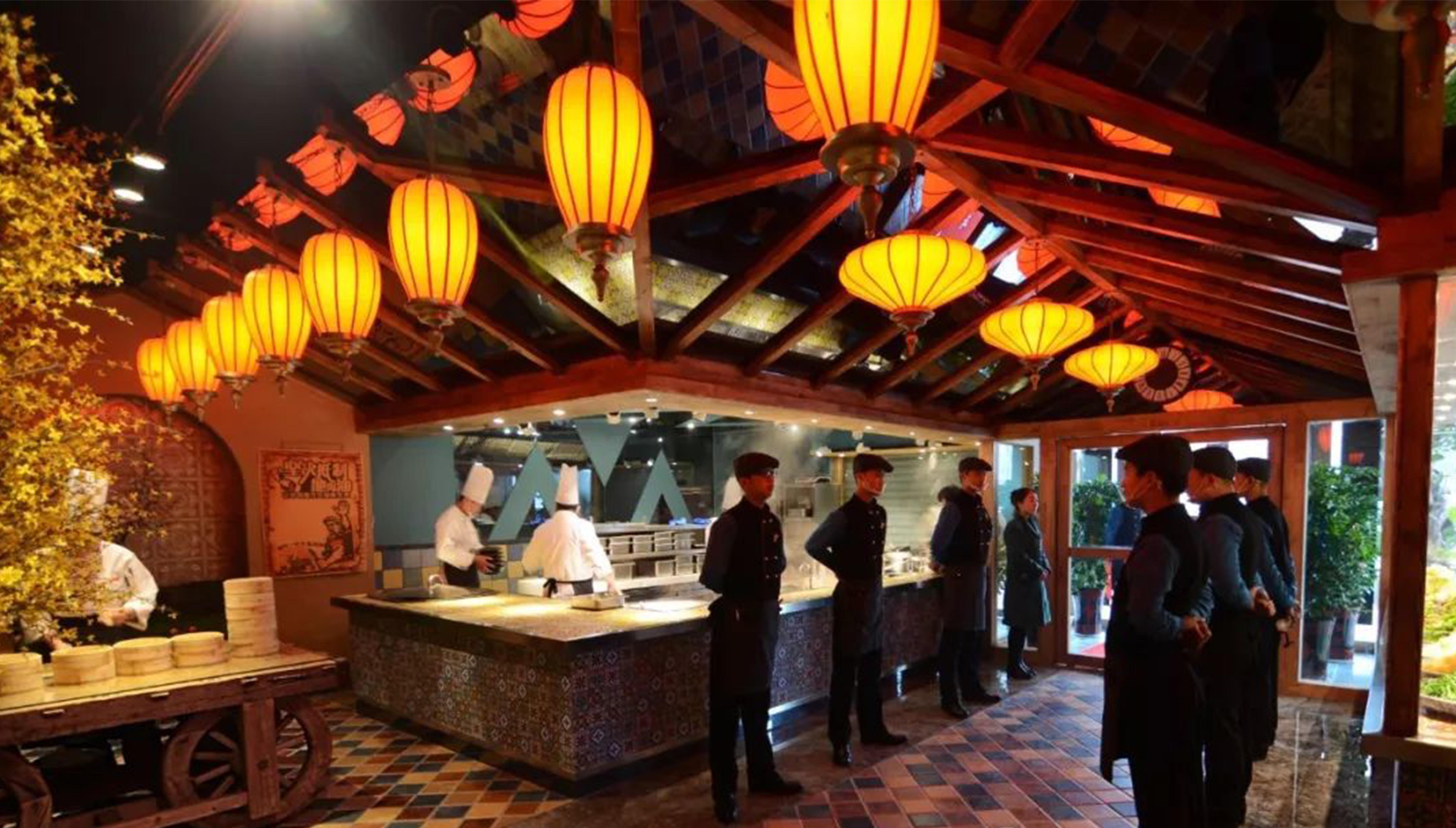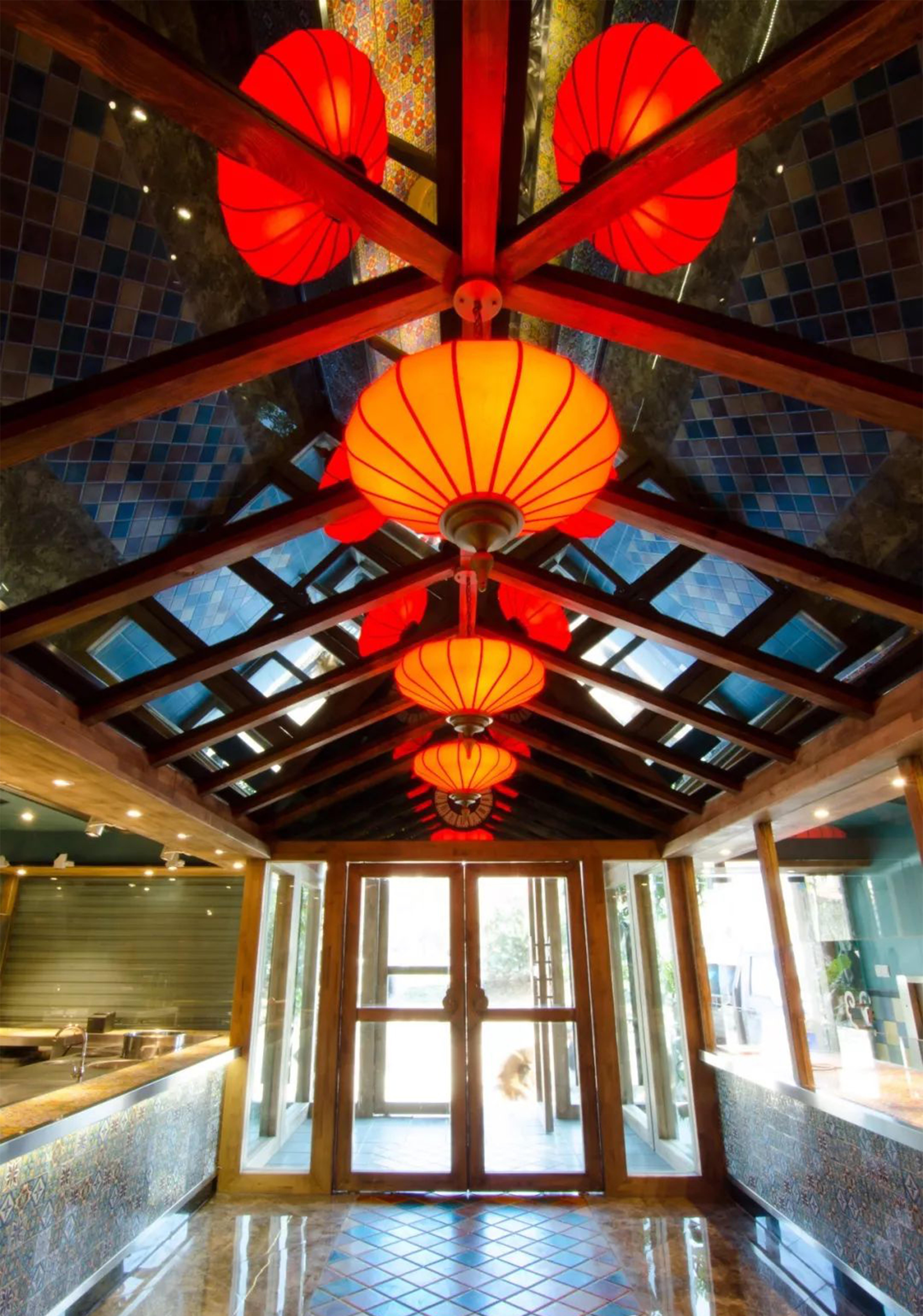 将炖煮区和凉菜区安置于入口处,菜的烹饪方式、香味、进出和点菜的人流穿梭于此,红红的灯笼与屋顶的灰镜折射出繁华的集市感