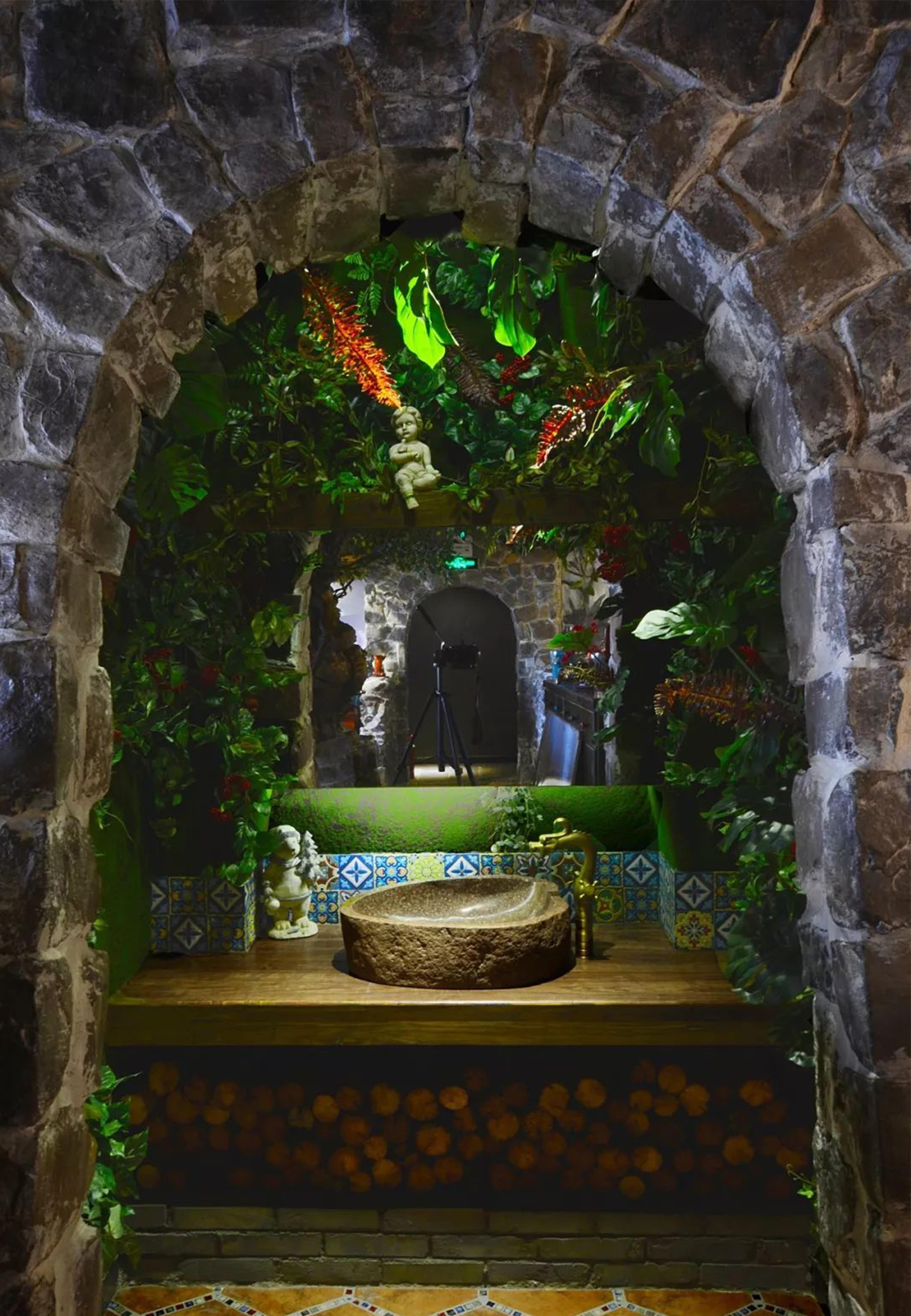 二楼的卫生间距主空间较远,因此在大厅专门安置了一个情趣洗手空间。为避免洗面台下暖气分水阀的裸露,选用一堆”柴火遮羞”。
