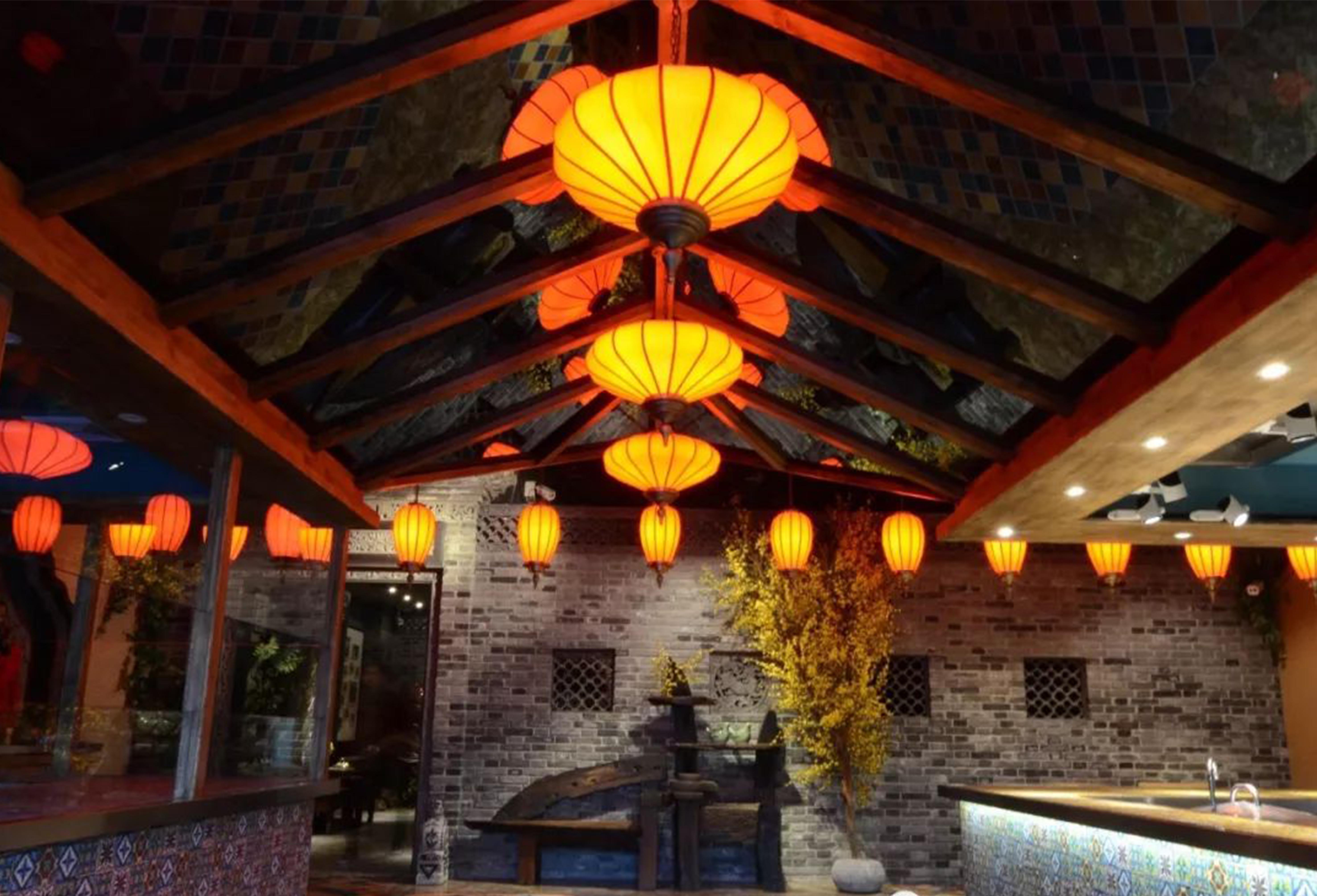 地面多色拼铺的仿古砖,明档台的彩釉花砖,顶面的木结构和灰镜、红红的灯笼以及正面朴实的青砖墙......看似无章法的材料运用,实质上是希望通过材料组合出的绚丽热情来表达热闹的集市感(即便是客人很少,仍然不显冷清)。