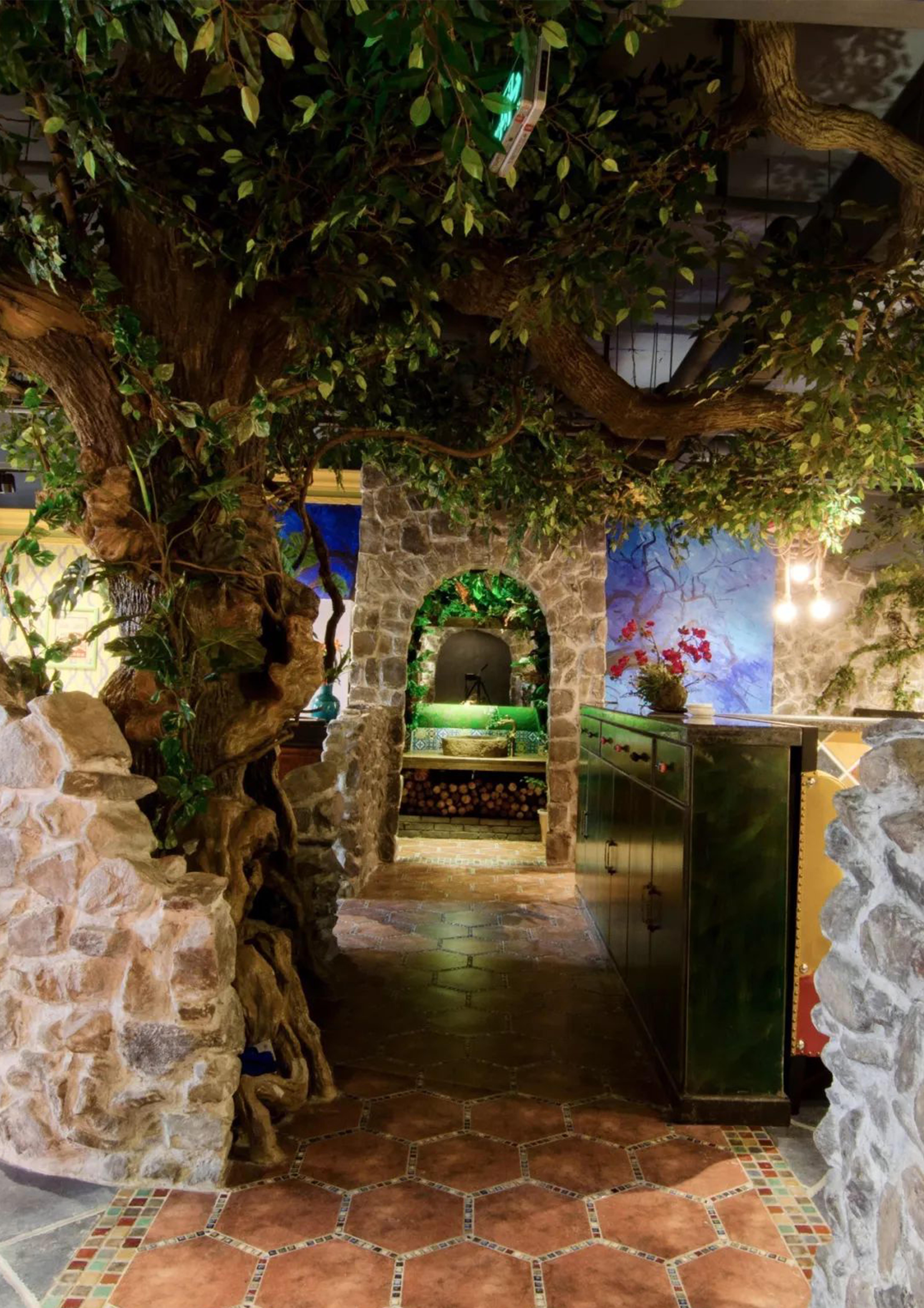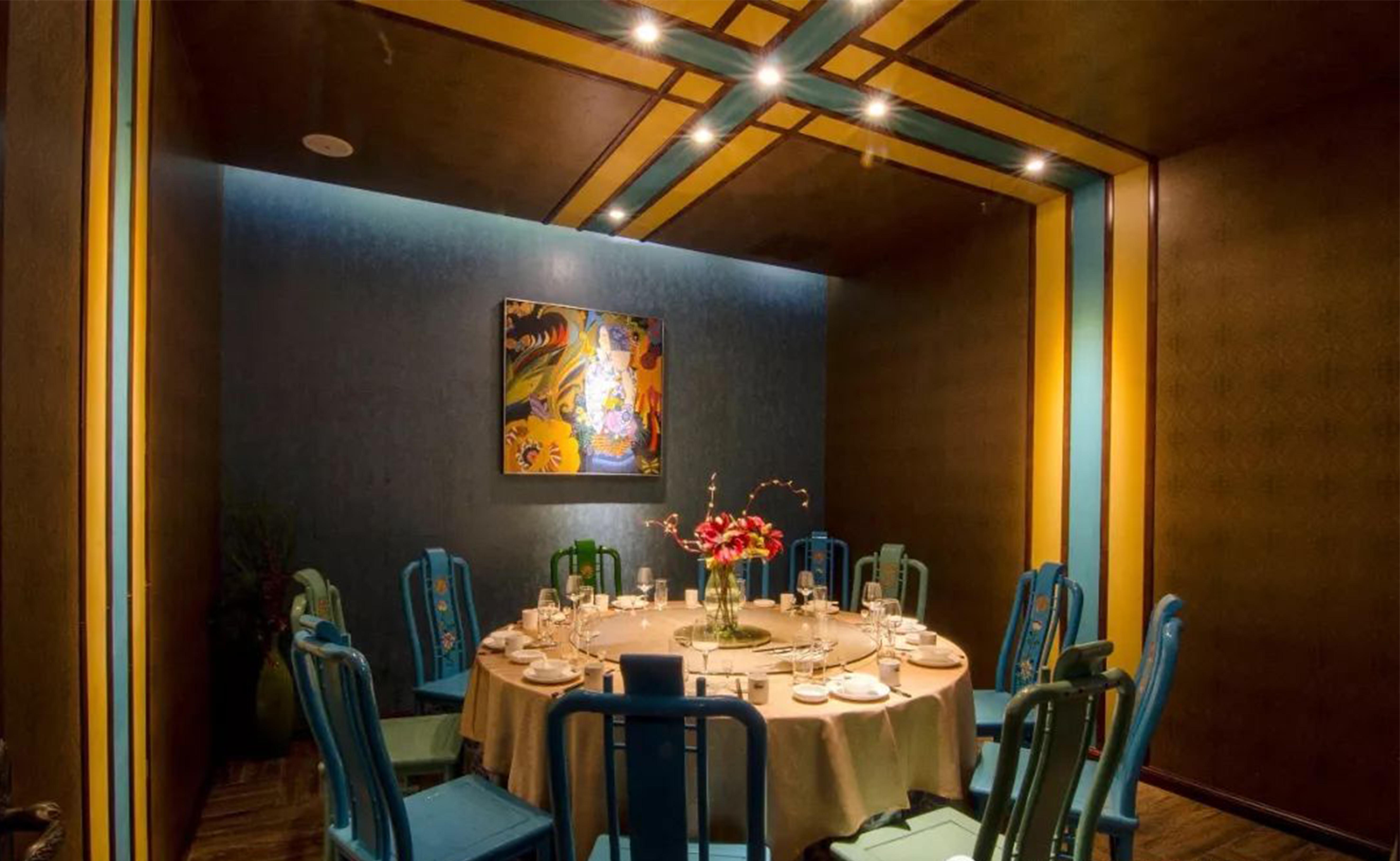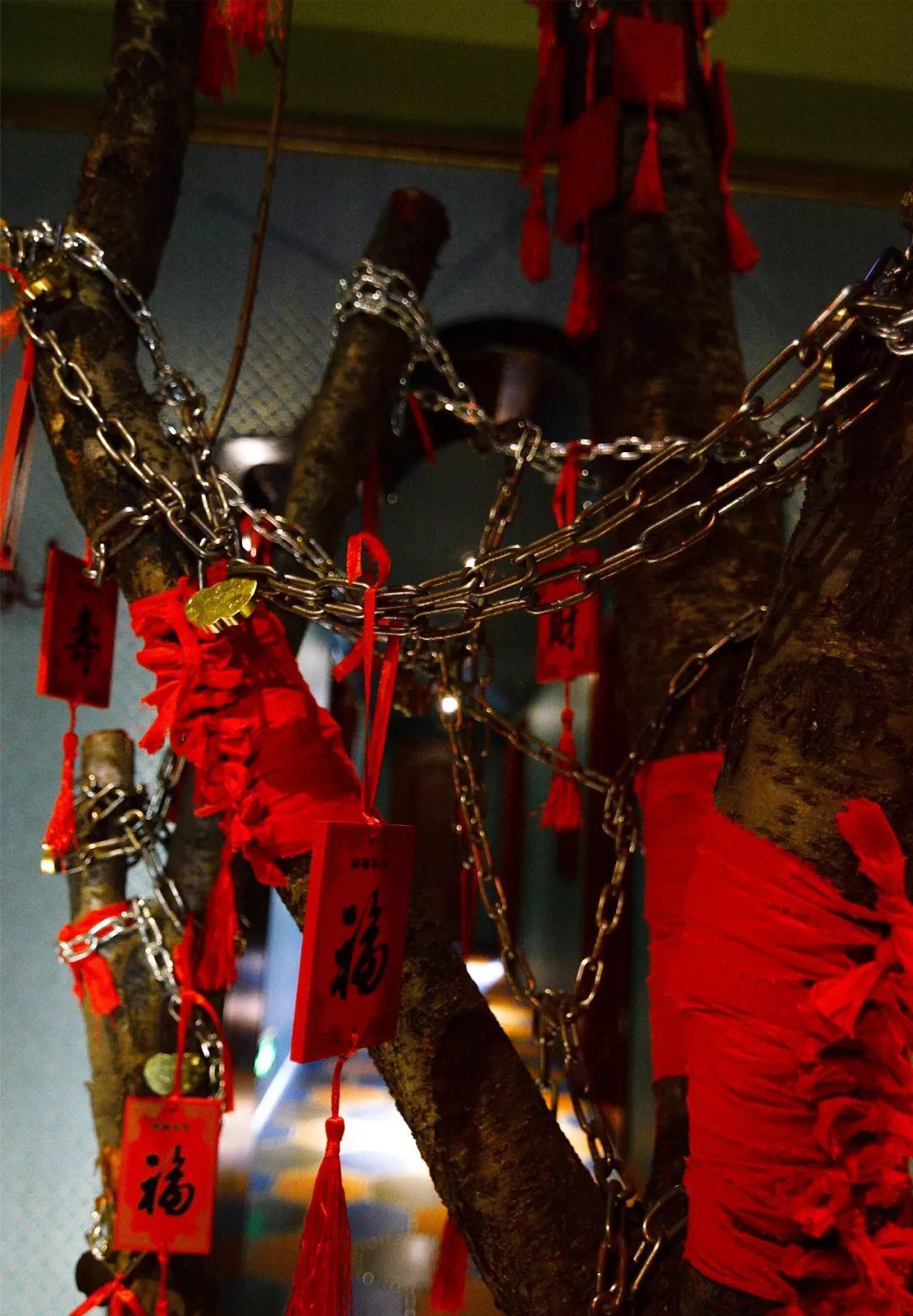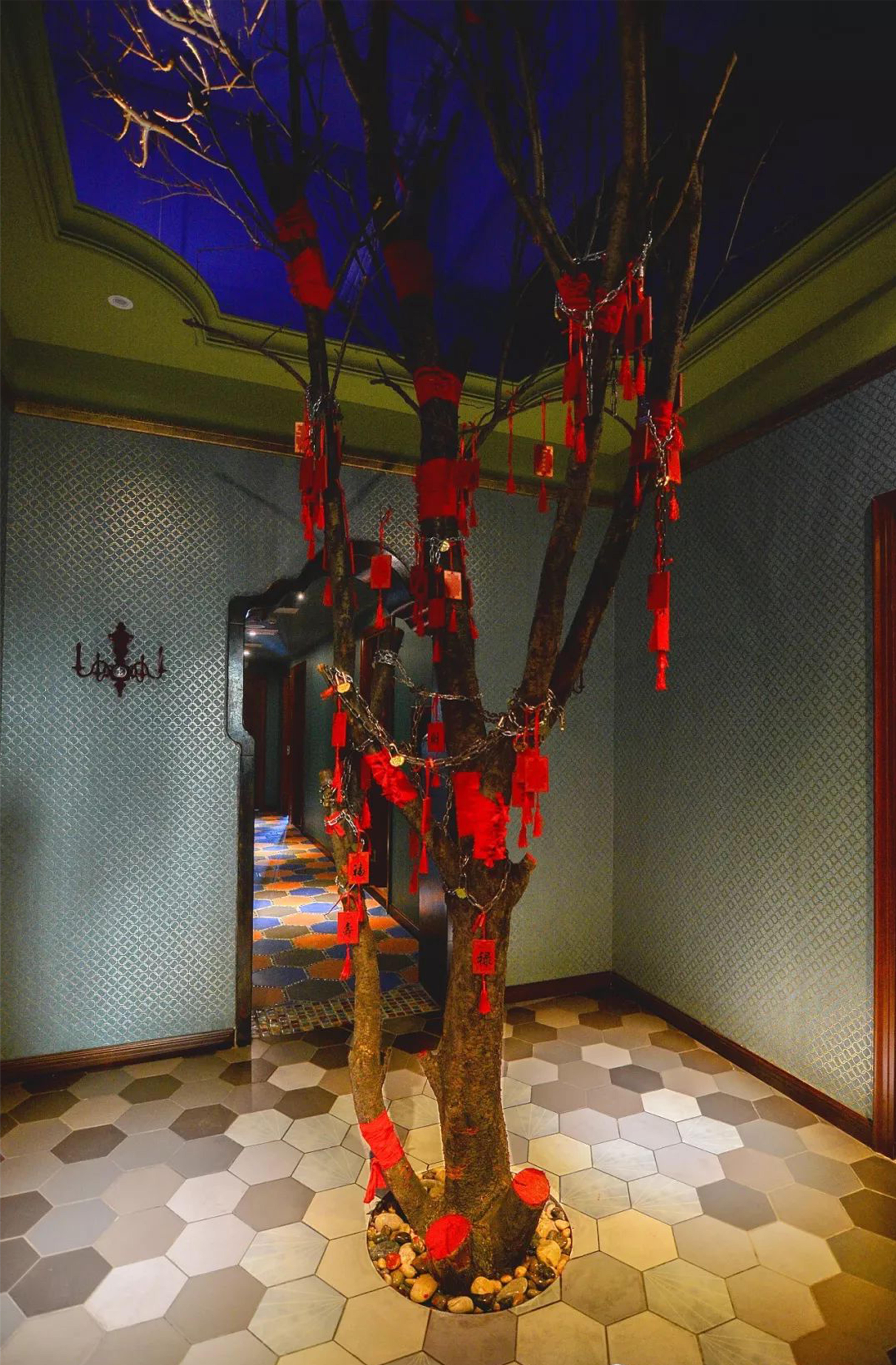 三楼的包间是整个饭店的尊享消费区,因此刻意地在过道前预留了前厅作为进入仪式,为超越三楼楼梯间尽头的“狂欢”,设计从宗教的精神层面构思,在前厅中心安置了一颗可以祈福许愿的桃树,树上捆绑的红绳、锁牌和神秘光色的蓝顶营造出可以覆盖和压制“狂欢”的情绪,以示隆重进入。