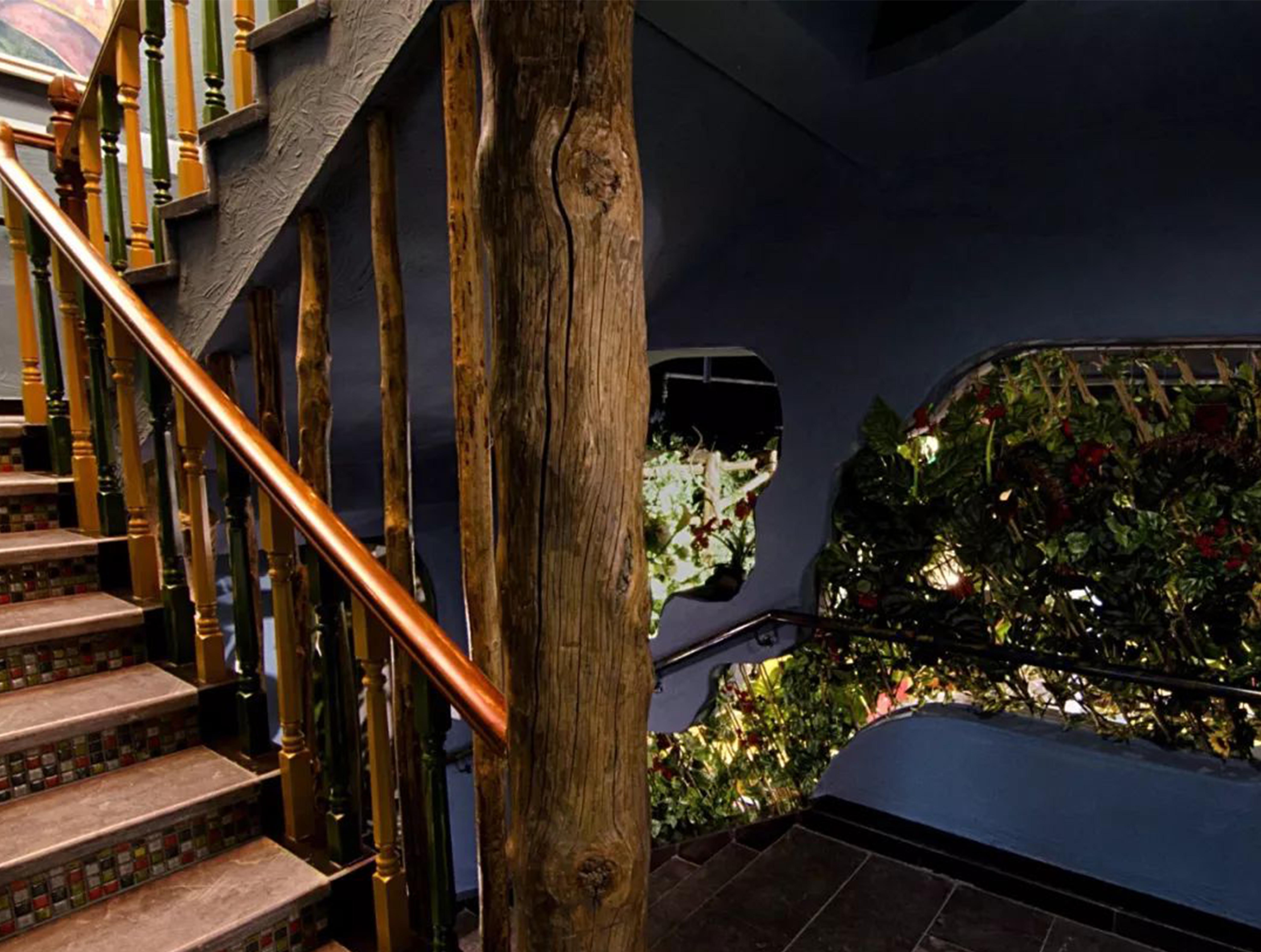 深灰蓝色乳胶漆做的墙顶面,青石做的踏步,旧椽木以特殊的方式做成栏杆扶手,上三楼之前的楼梯间是一段黑暗而且略显压抑的路径,起到压制情绪的作用,为二楼大厅和楼梯间尽头的高调起到了铺垫作用。