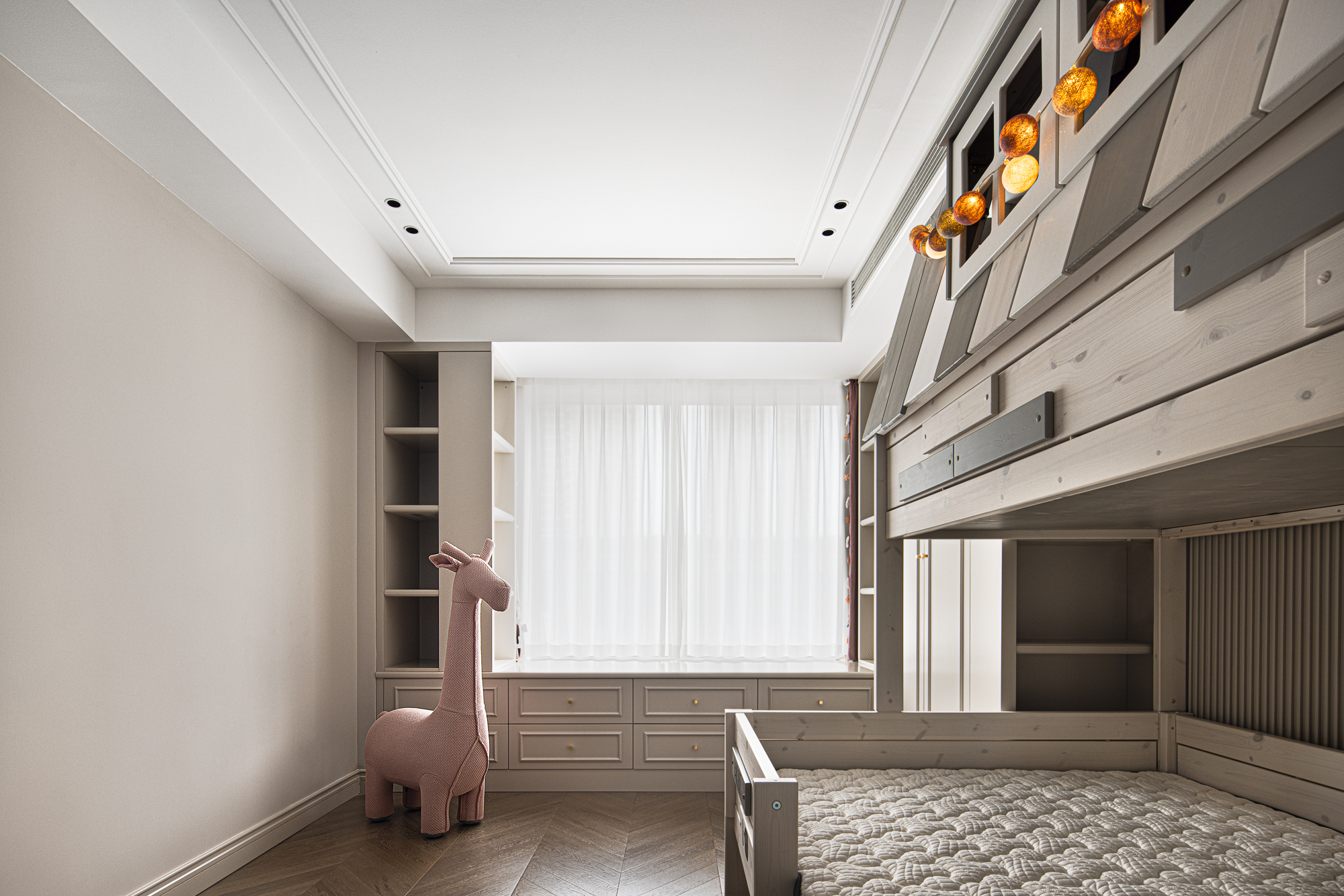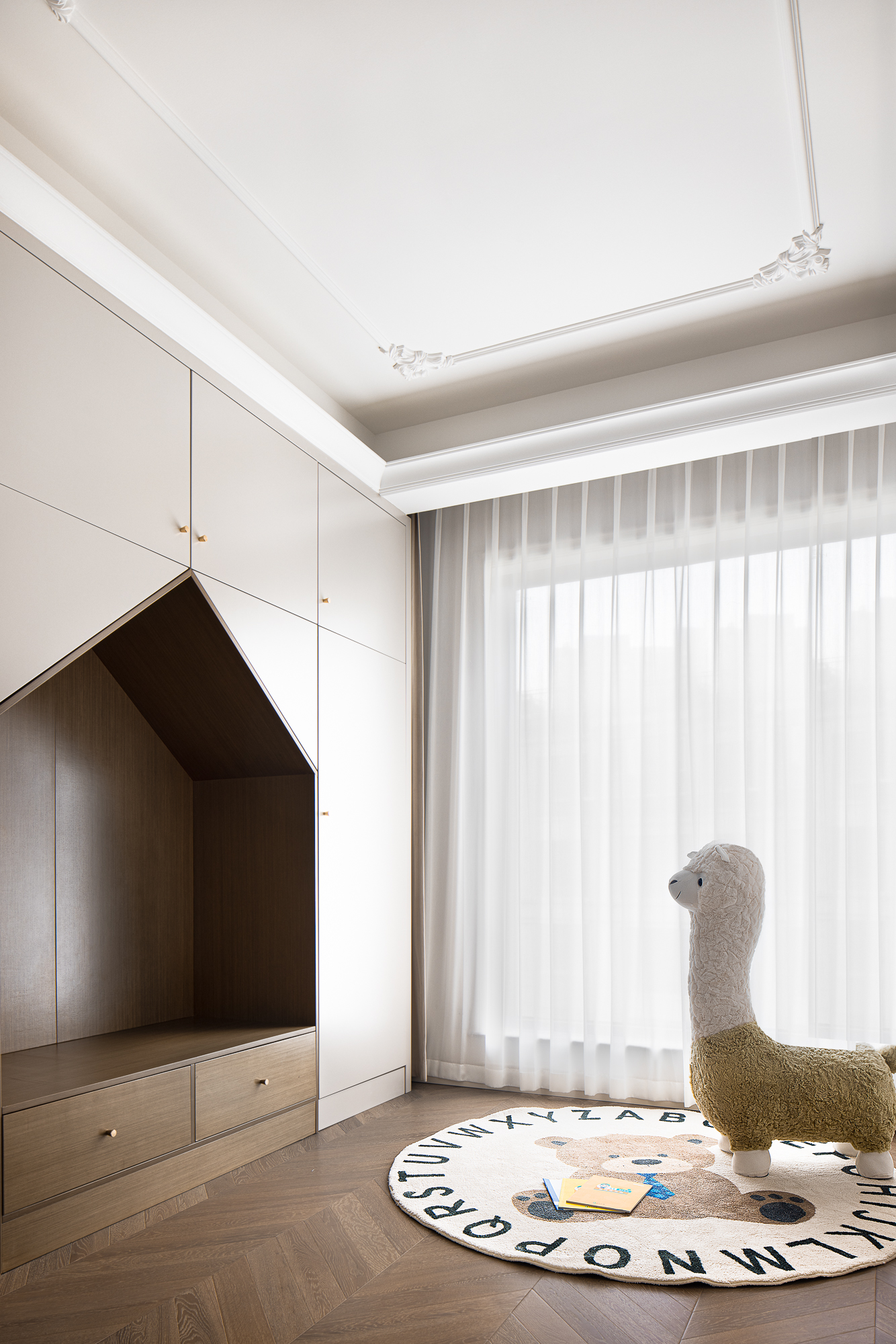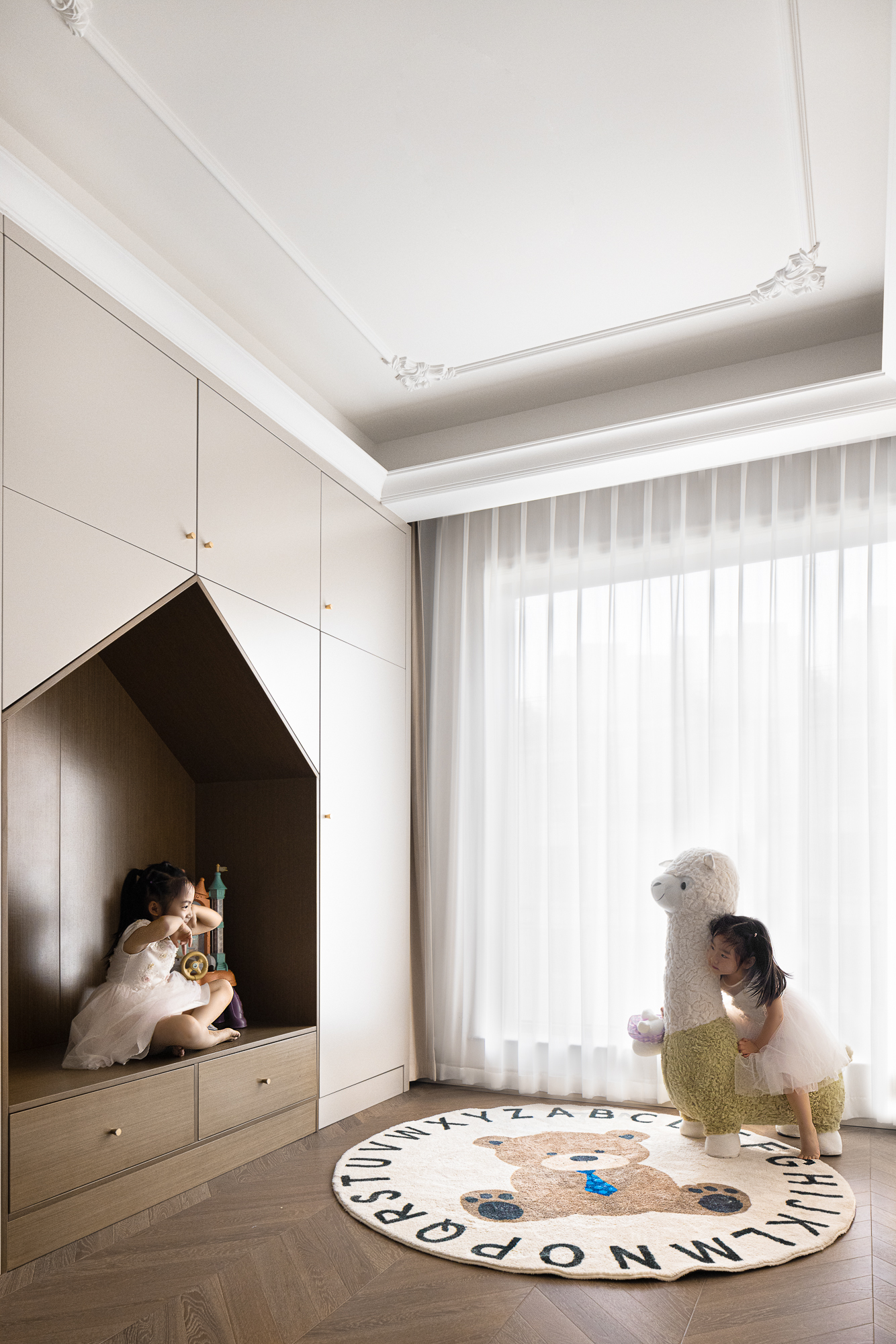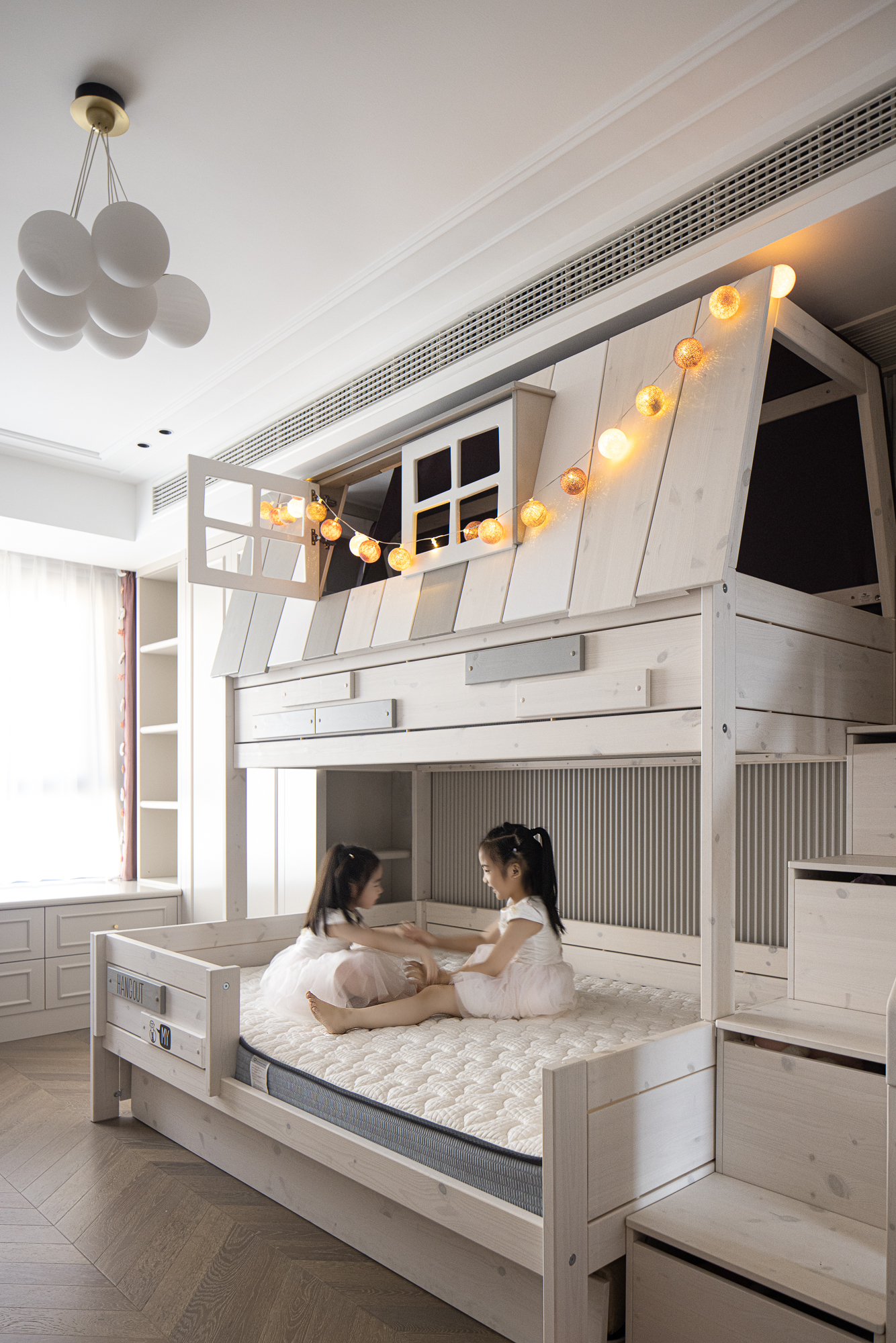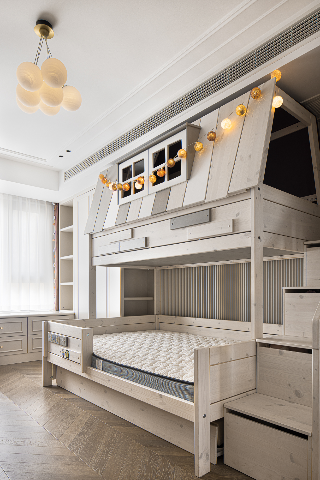 5.年龄相差不大的可爱姊妹花,是父母心里最重要的存在,于是设计师将露台搭建,多出这间娱乐室提供多元功能。儿童房亦在精确的度量下,放上她们喜欢的小木屋双人床,在你们的秘密花园,陪你们可可爱爱。 -