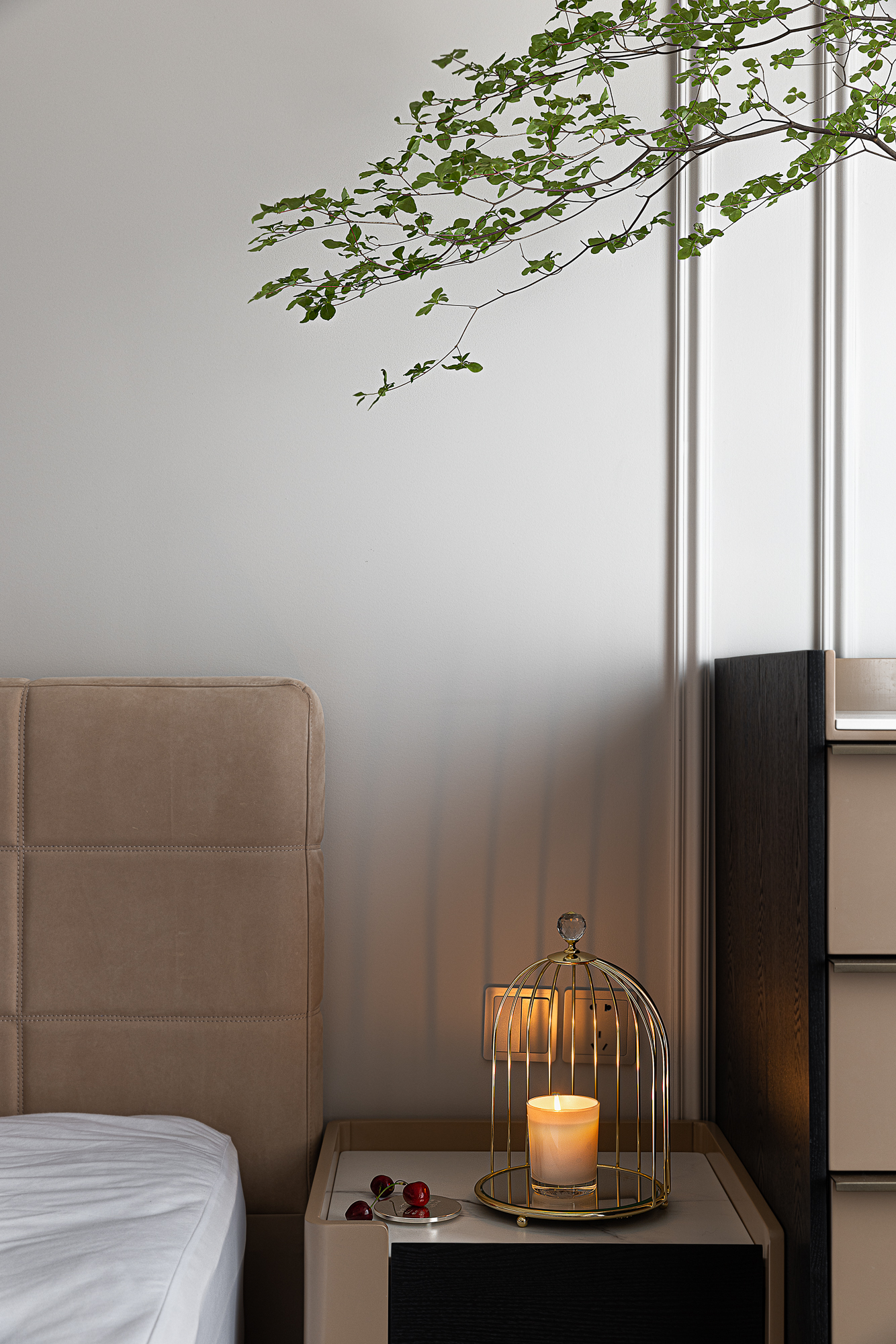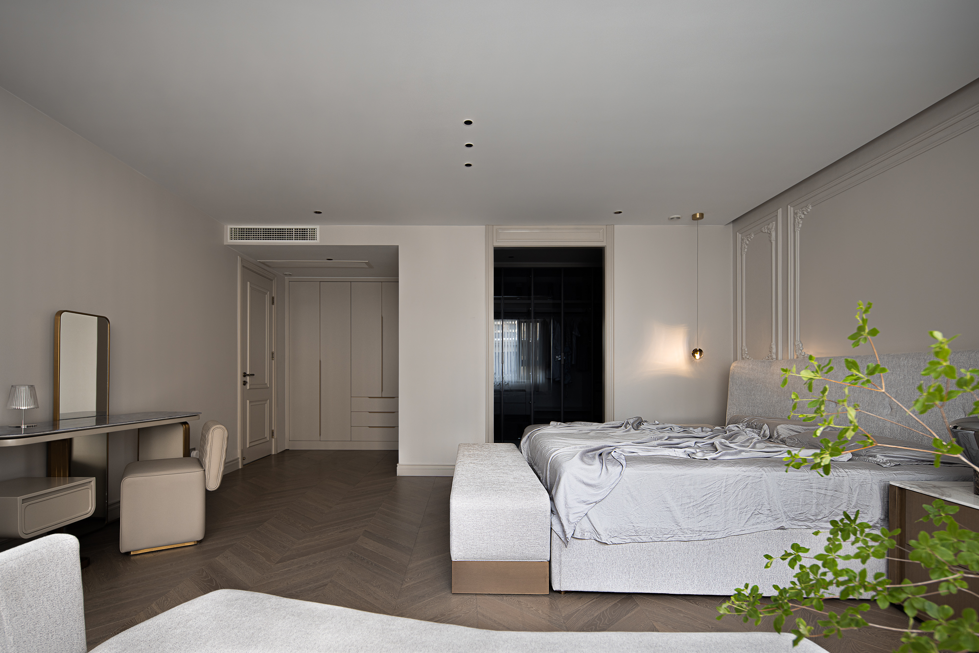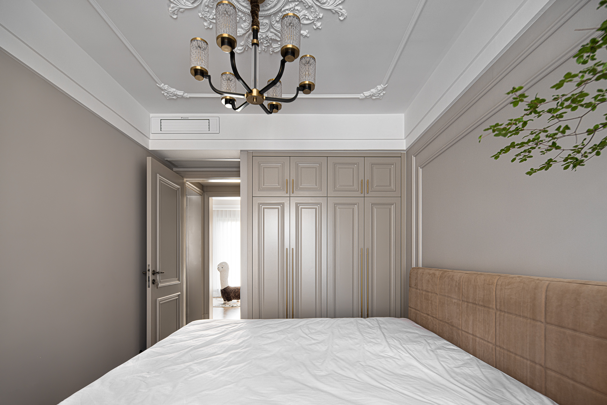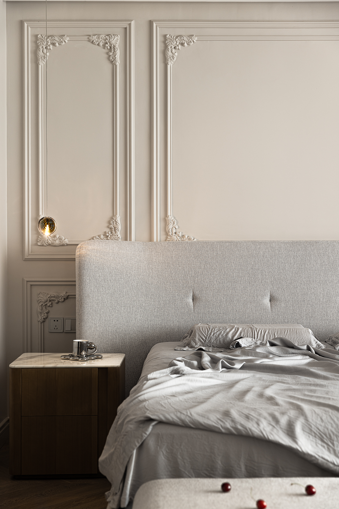设计选材:不论是硬装阶段的主材辅材,还是软装阶段的家具、配饰品,都以性价比为基础来为业主选择,不仅实现了功能,还增加了空间的审美。比如,将PU线条与角花的元素延续进卧室,风格的统一中多了唯美浪漫,这里没有过多的功能,只还原最纯粹的睡眠,点光源氤氲一室好眠。