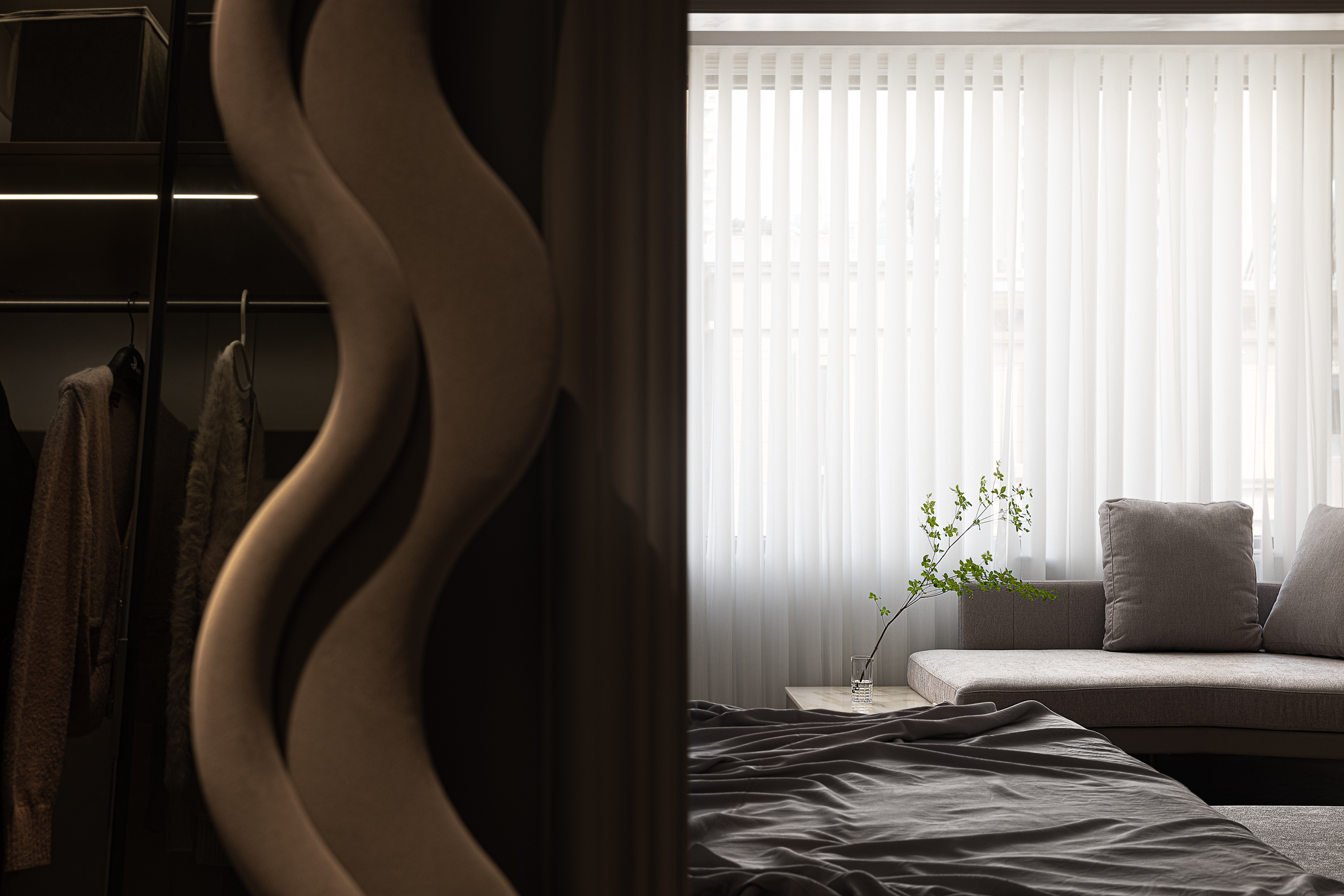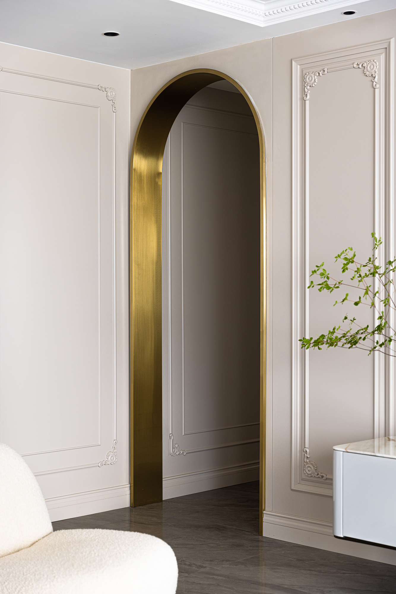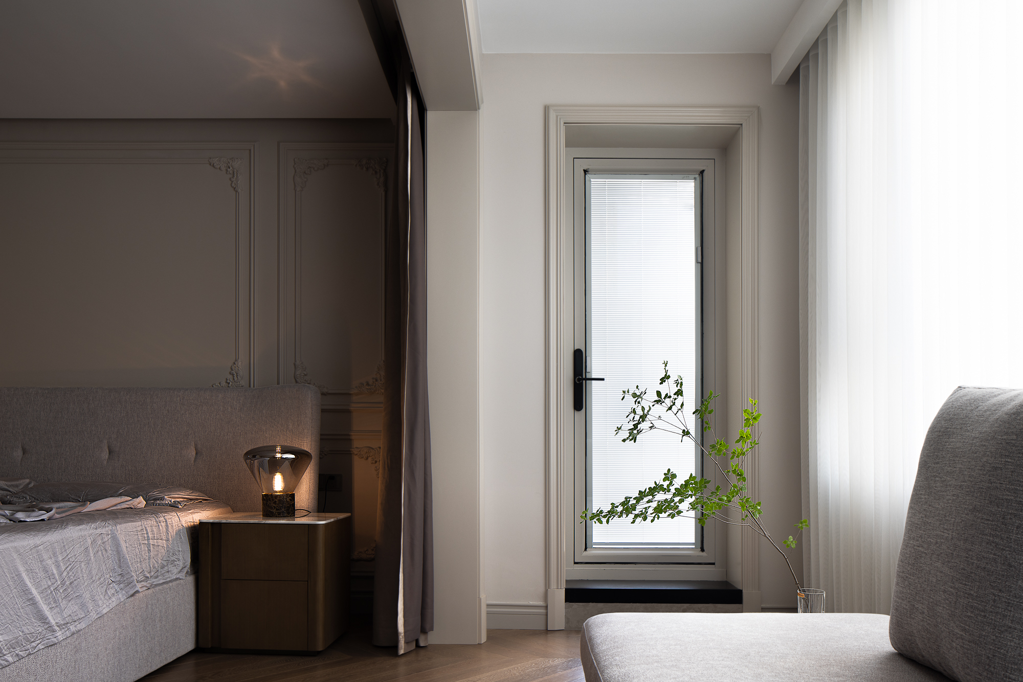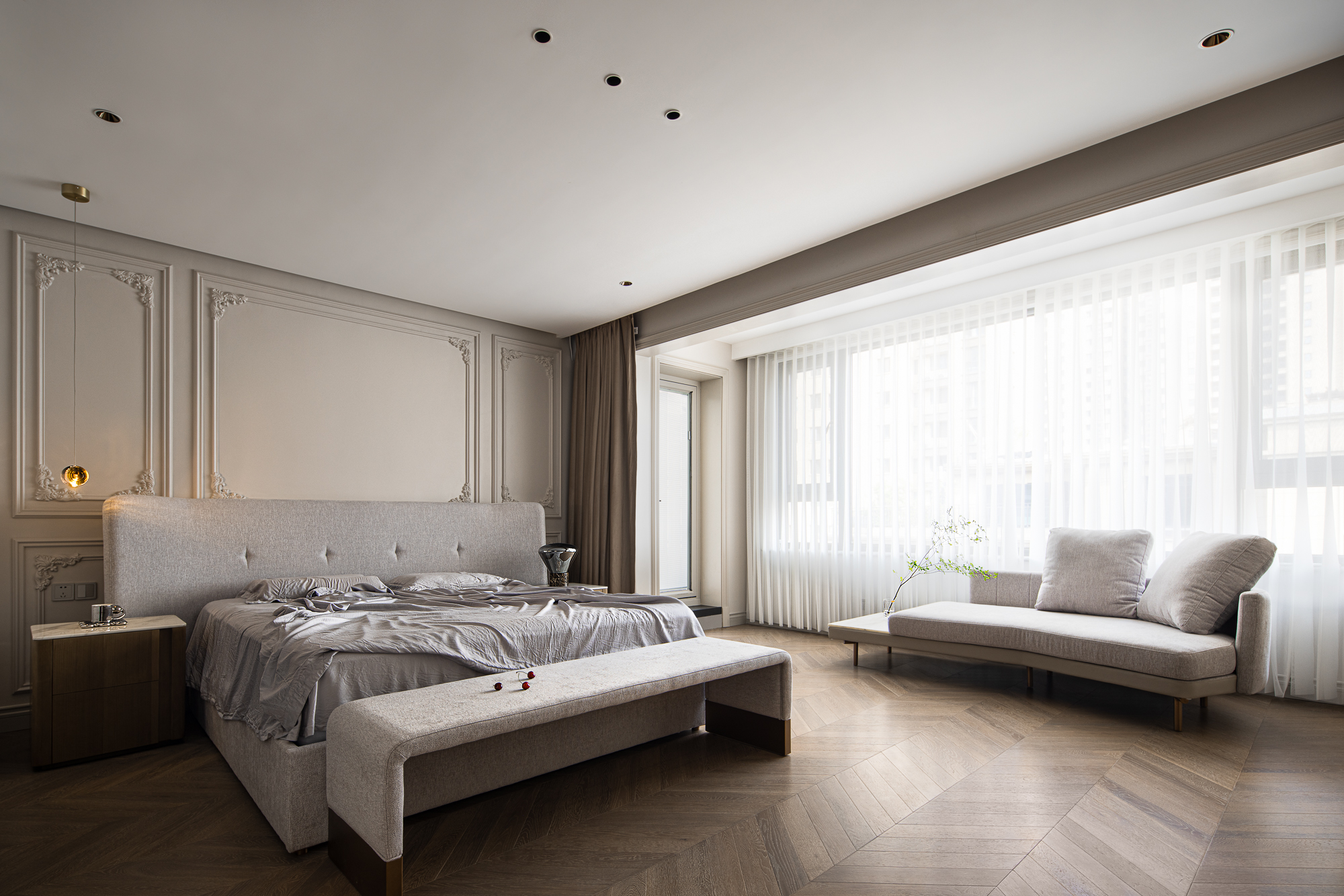 设计选材:不论是硬装阶段的主材辅材,还是软装阶段的家具、配饰品,都以性价比为基础来为业主选择,不仅实现了功能,还增加了空间的审美。比如,将PU线条与角花的元素延续进卧室,风格的统一中多了唯美浪漫,这里没有过多的功能,只还原最纯粹的睡眠,点光源氤氲一室好眠。