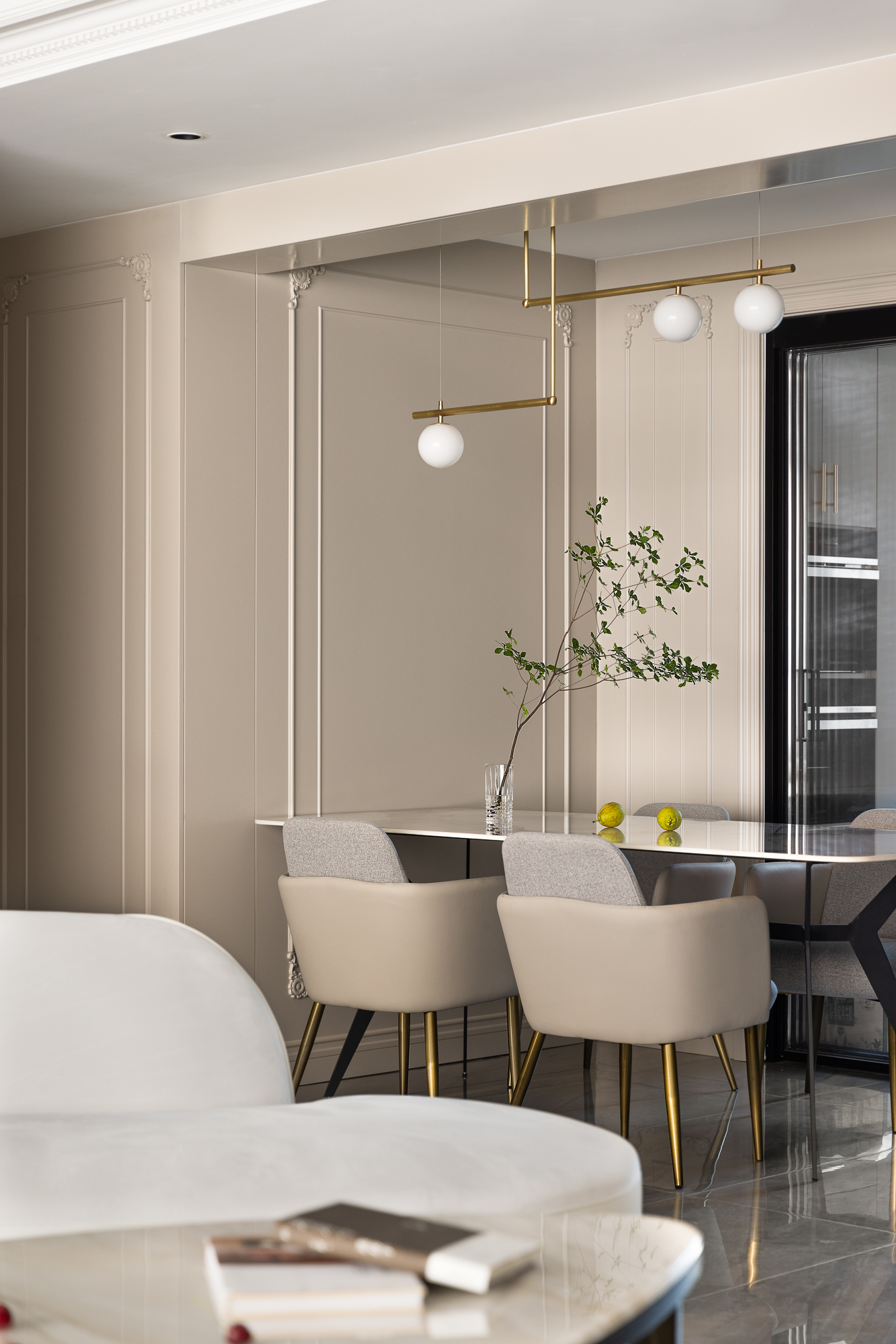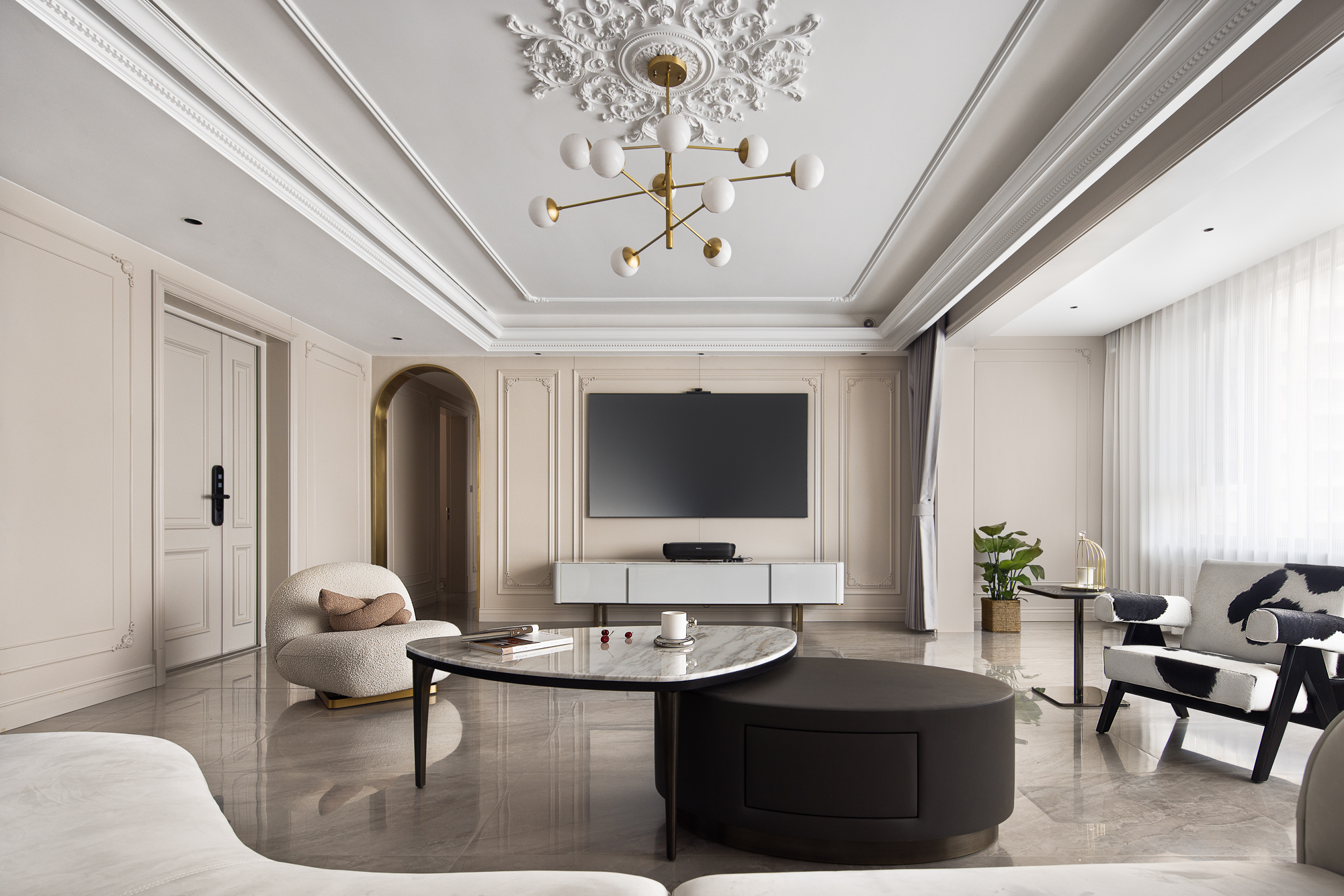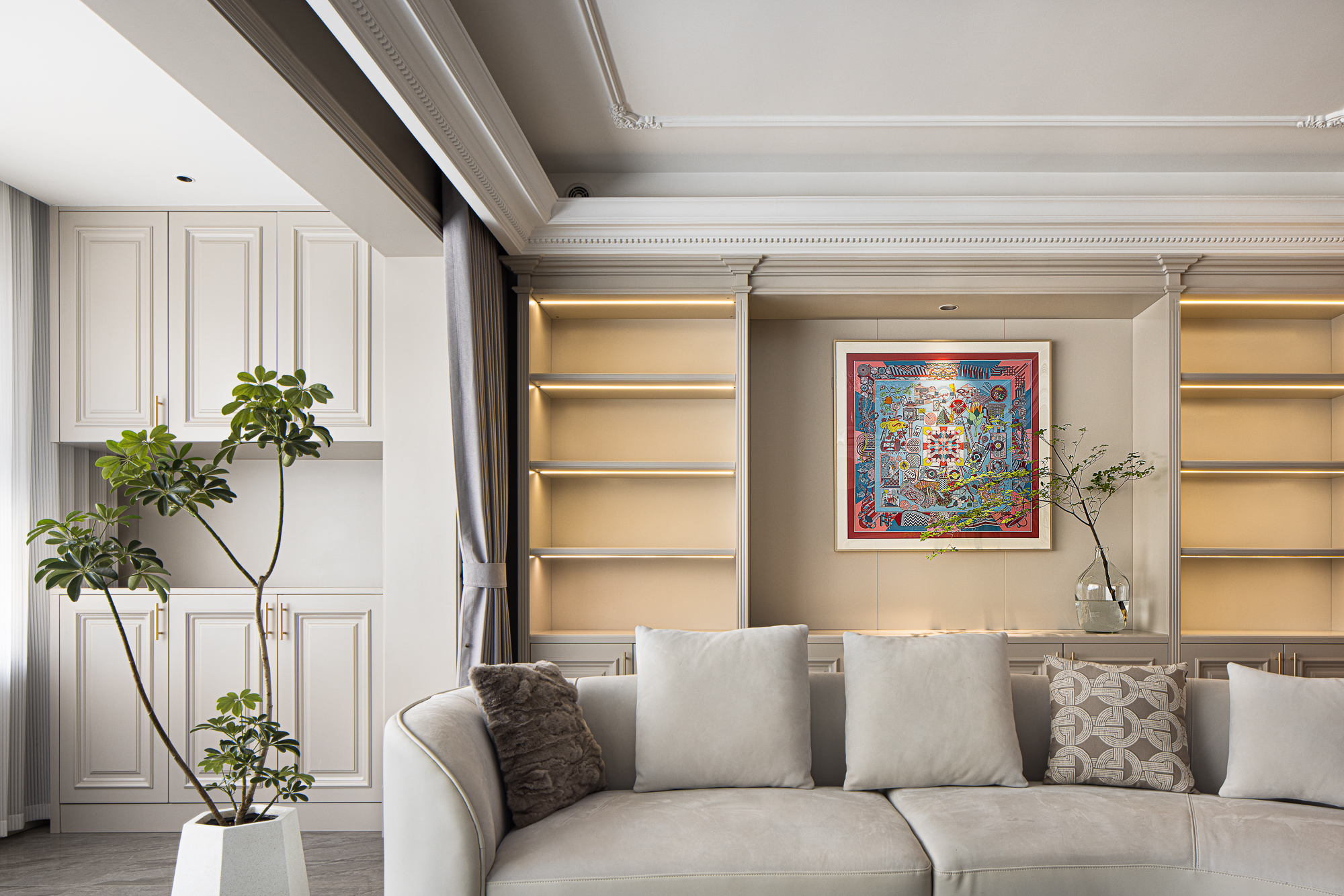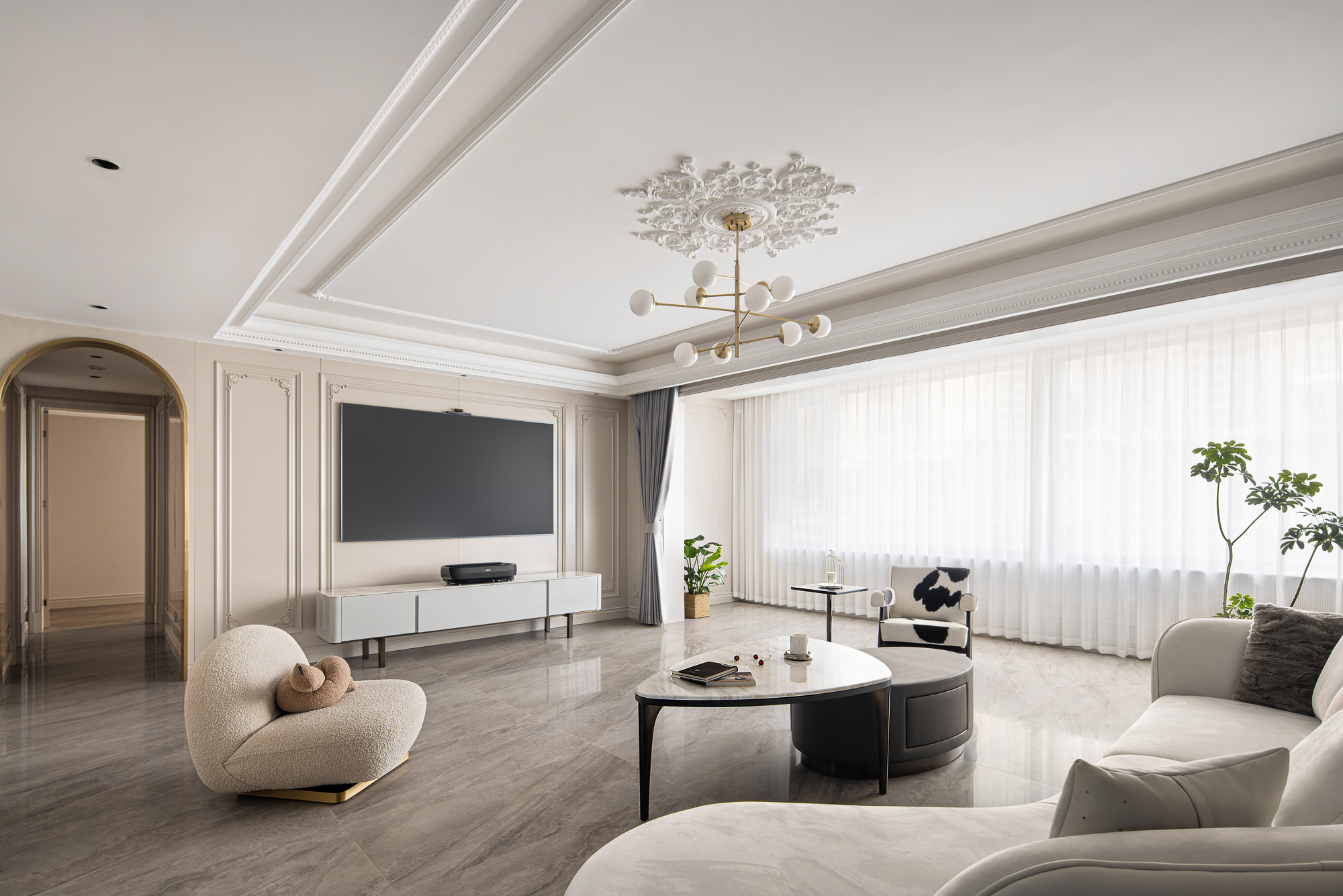 设计选材:不论是硬装阶段的主材辅材,还是软装阶段的家具、配饰品,都以性价比为基础来为业主选择,不仅实现了功能,还增加了空间的审美。比如,将PU线条与角花的元素延续进卧室,风格的统一中多了唯美浪漫,这里没有过多的功能,只还原最纯粹的睡眠,点光源氤氲一室好眠。