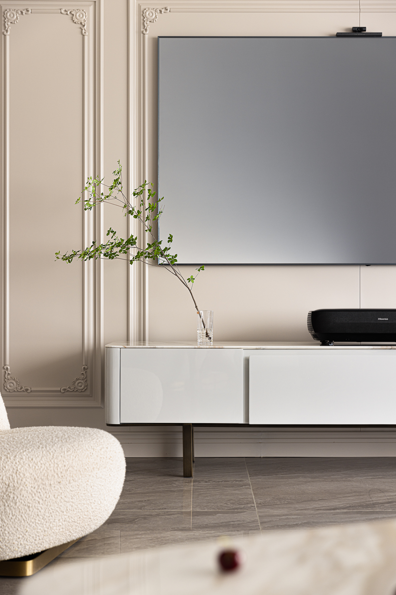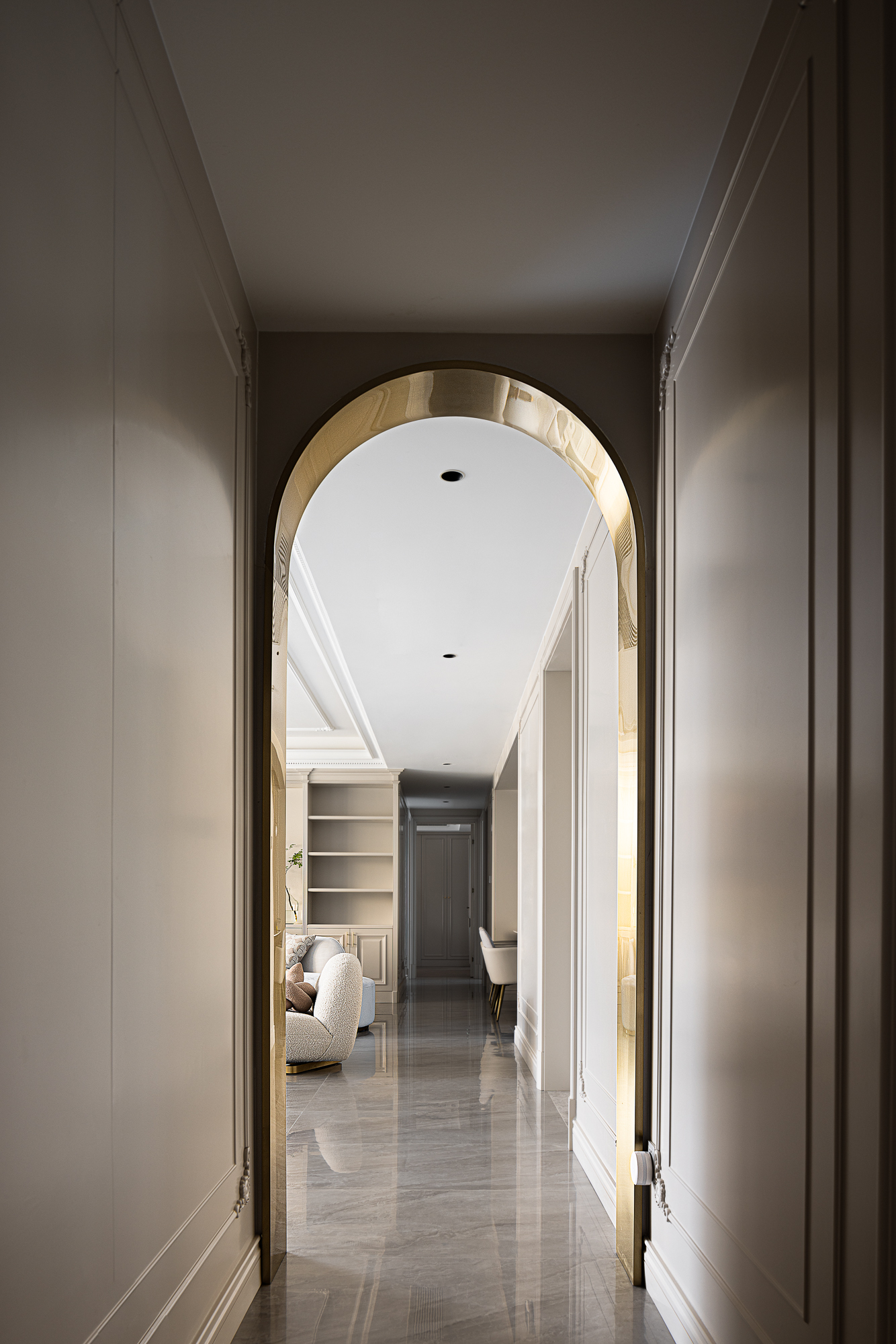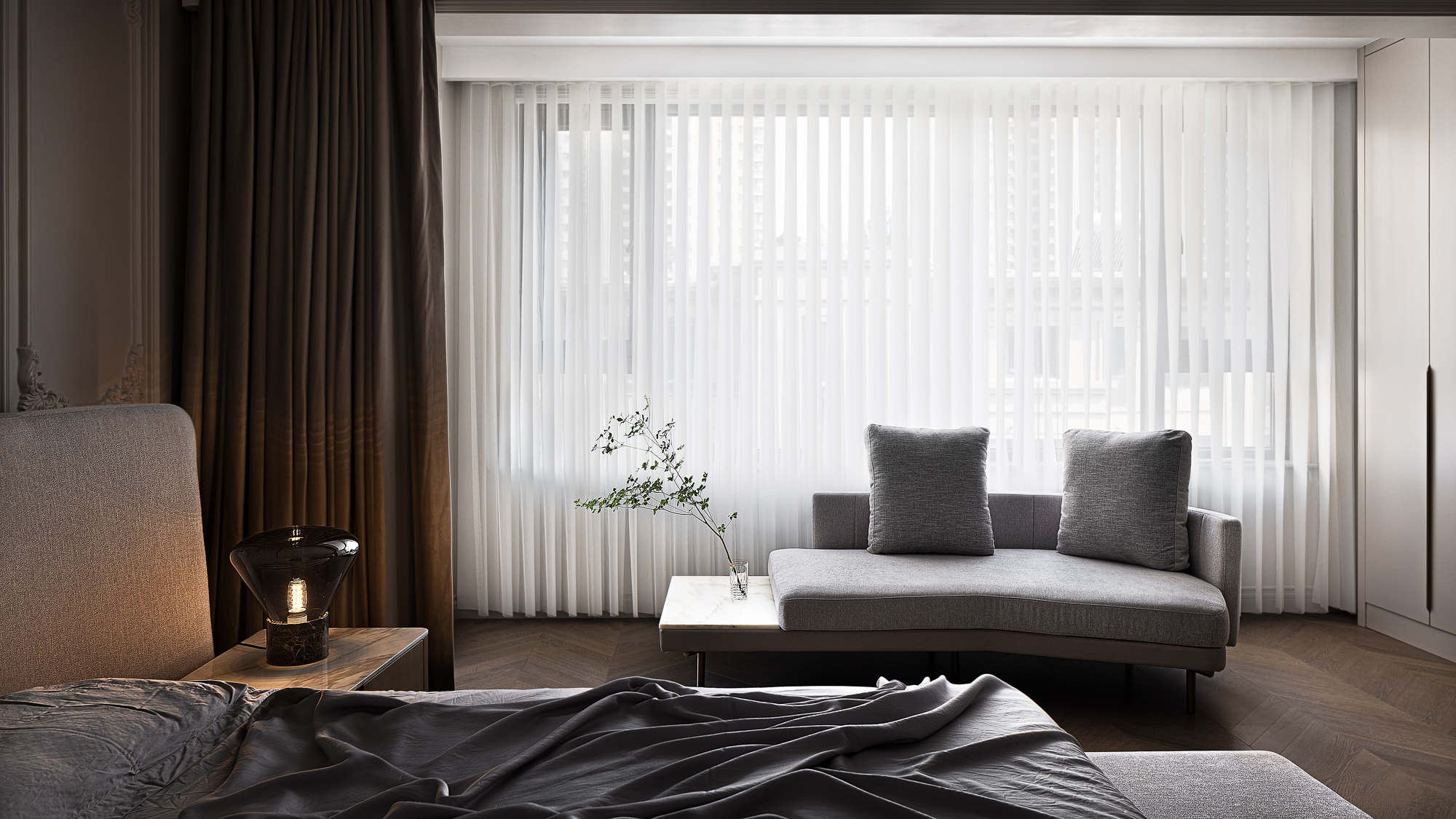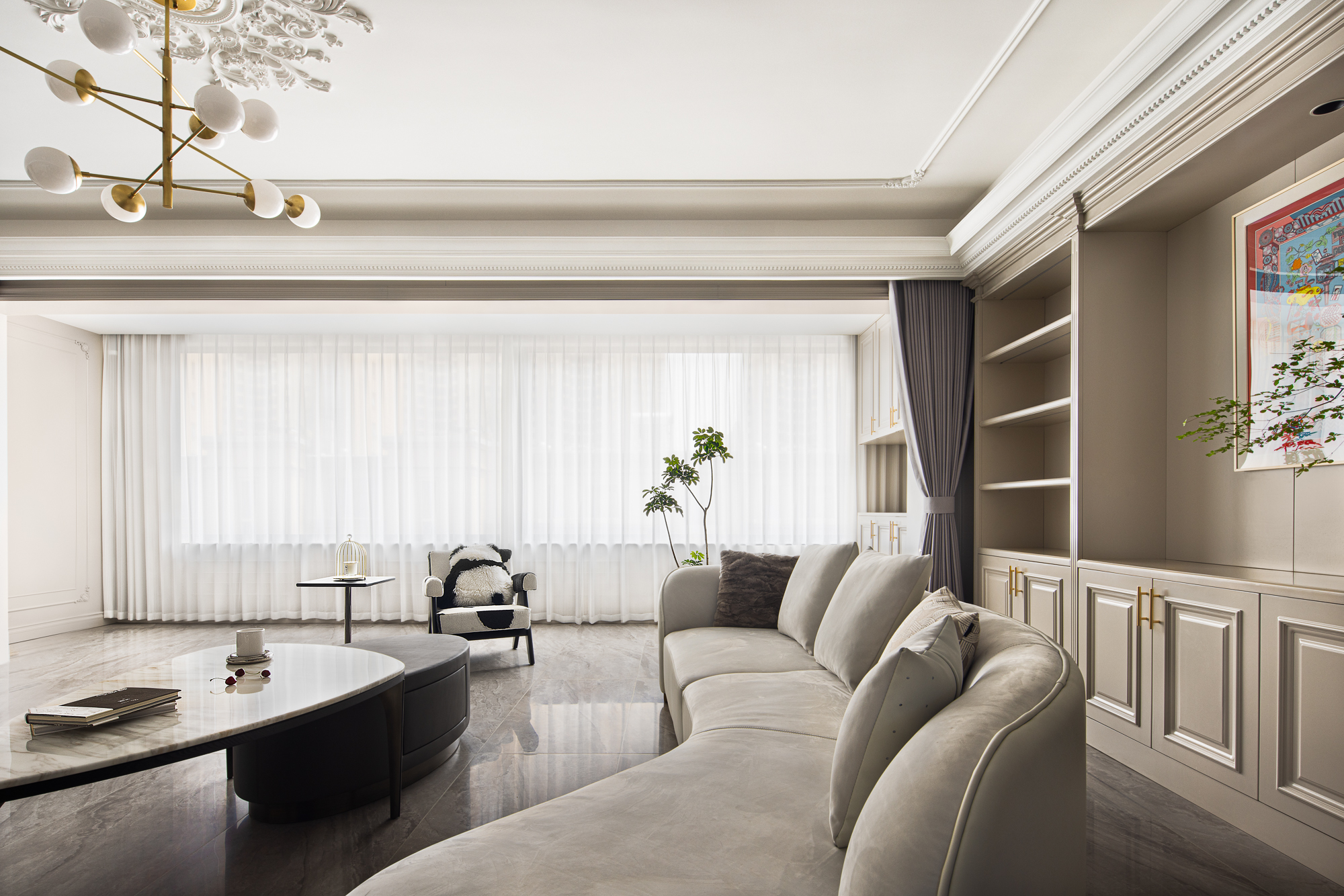 设计选材:不论是硬装阶段的主材辅材,还是软装阶段的家具、配饰品,都以性价比为基础来为业主选择,不仅实现了功能,还增加了空间的审美。比如,将PU线条与角花的元素延续进卧室,风格的统一中多了唯美浪漫,这里没有过多的功能,只还原最纯粹的睡眠,点光源氤氲一室好眠。