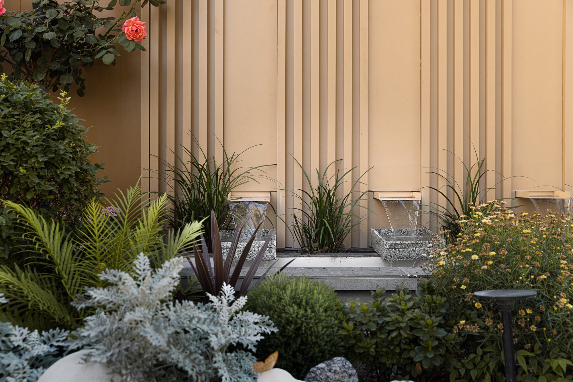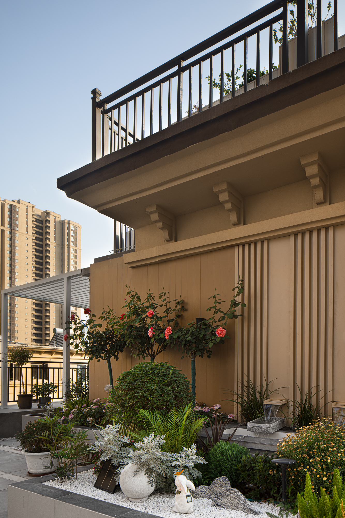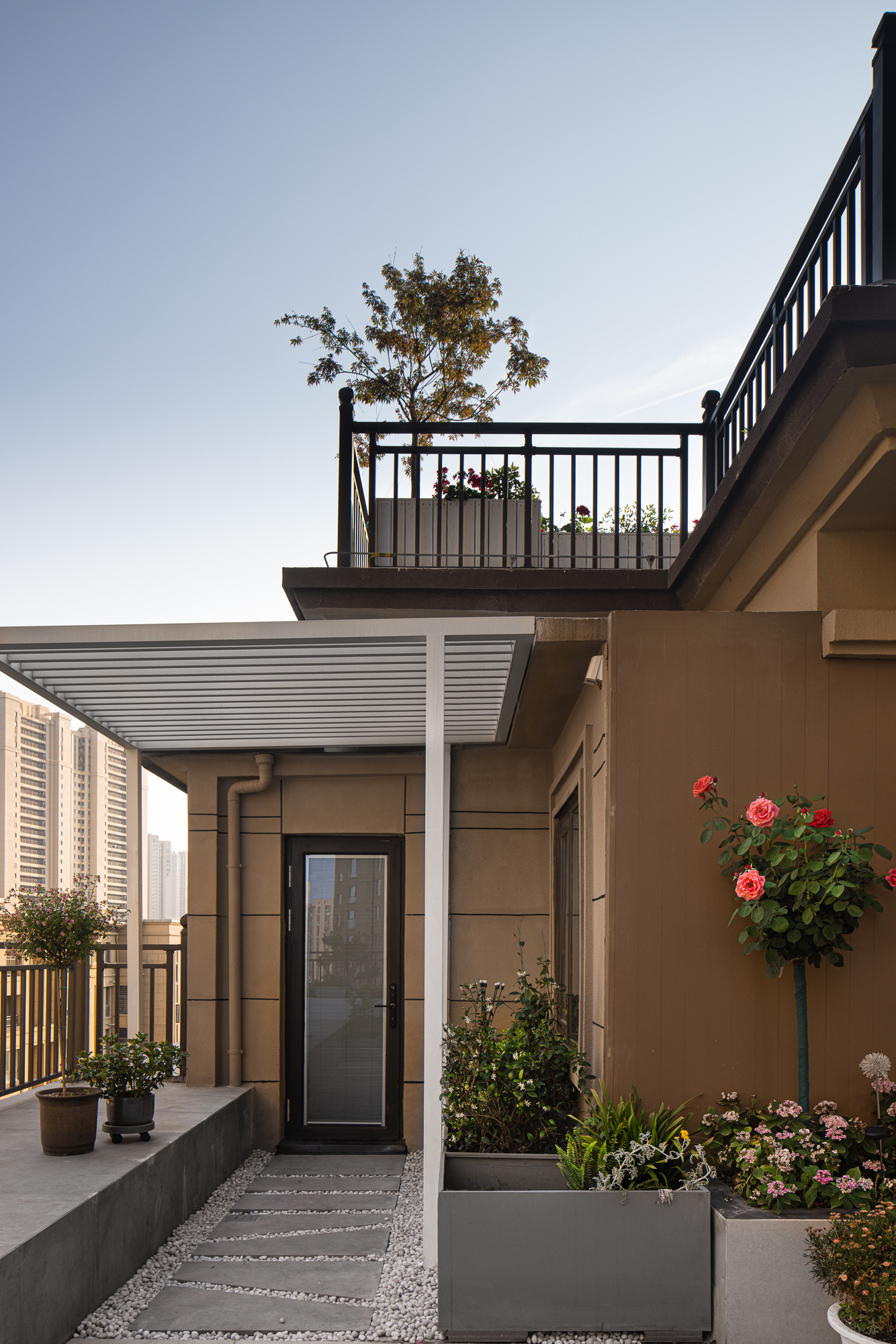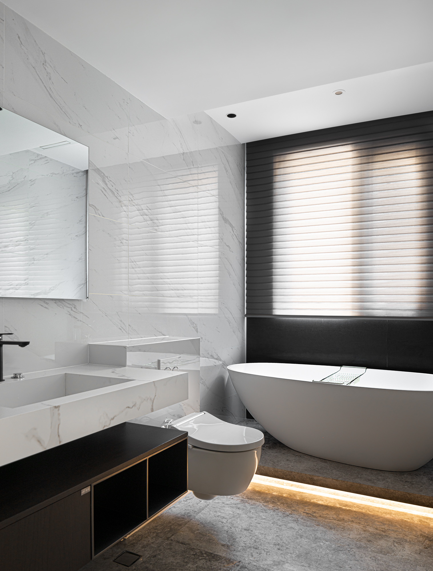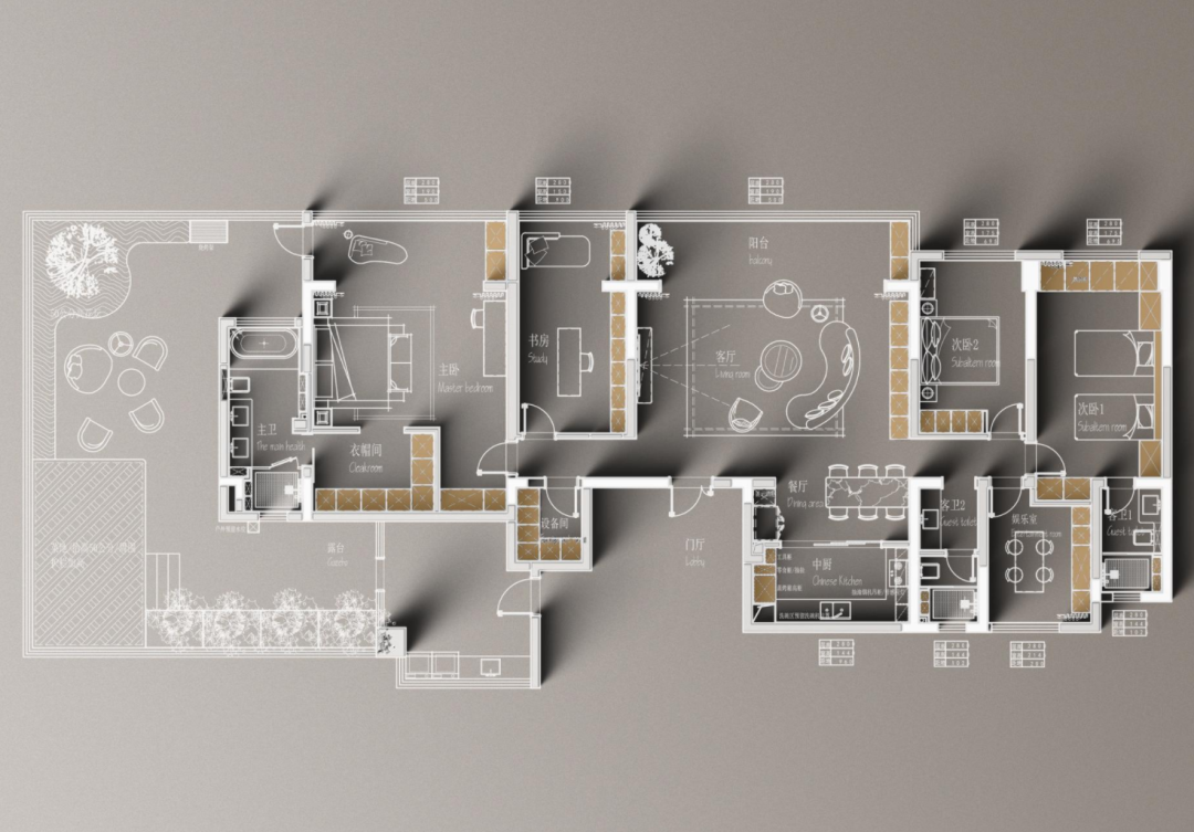 4.改变主卧入口,北向阳台扩建入内,套房面积增大,于是安排步入式衣帽间,增设梳妆台与休闲区,且预留出直达户外花园的路径。合理规划主卫动线,增加浴缸功能,私密区功能丰富动线流畅,一应俱全里绘制出生动的空间场景。
