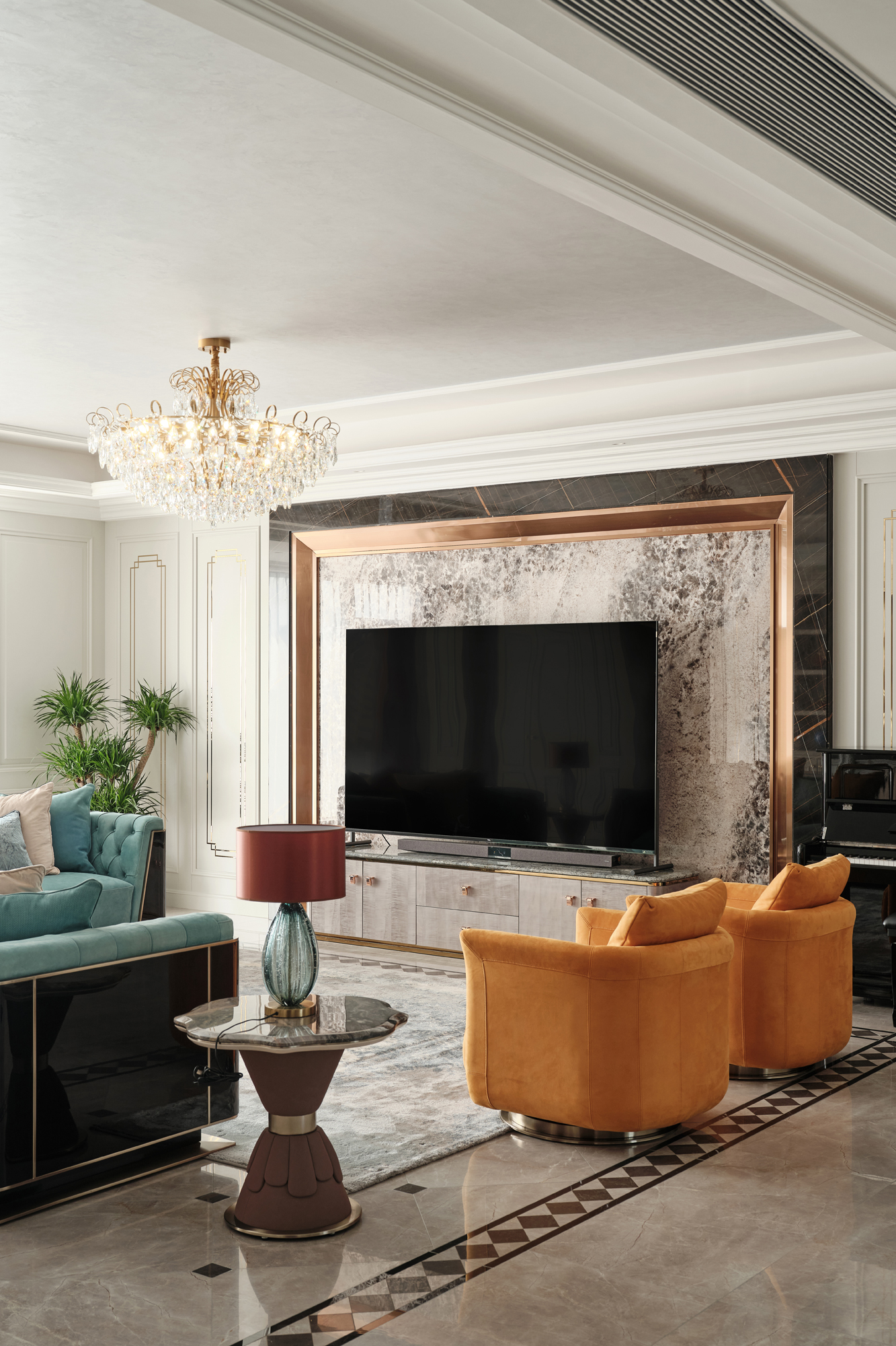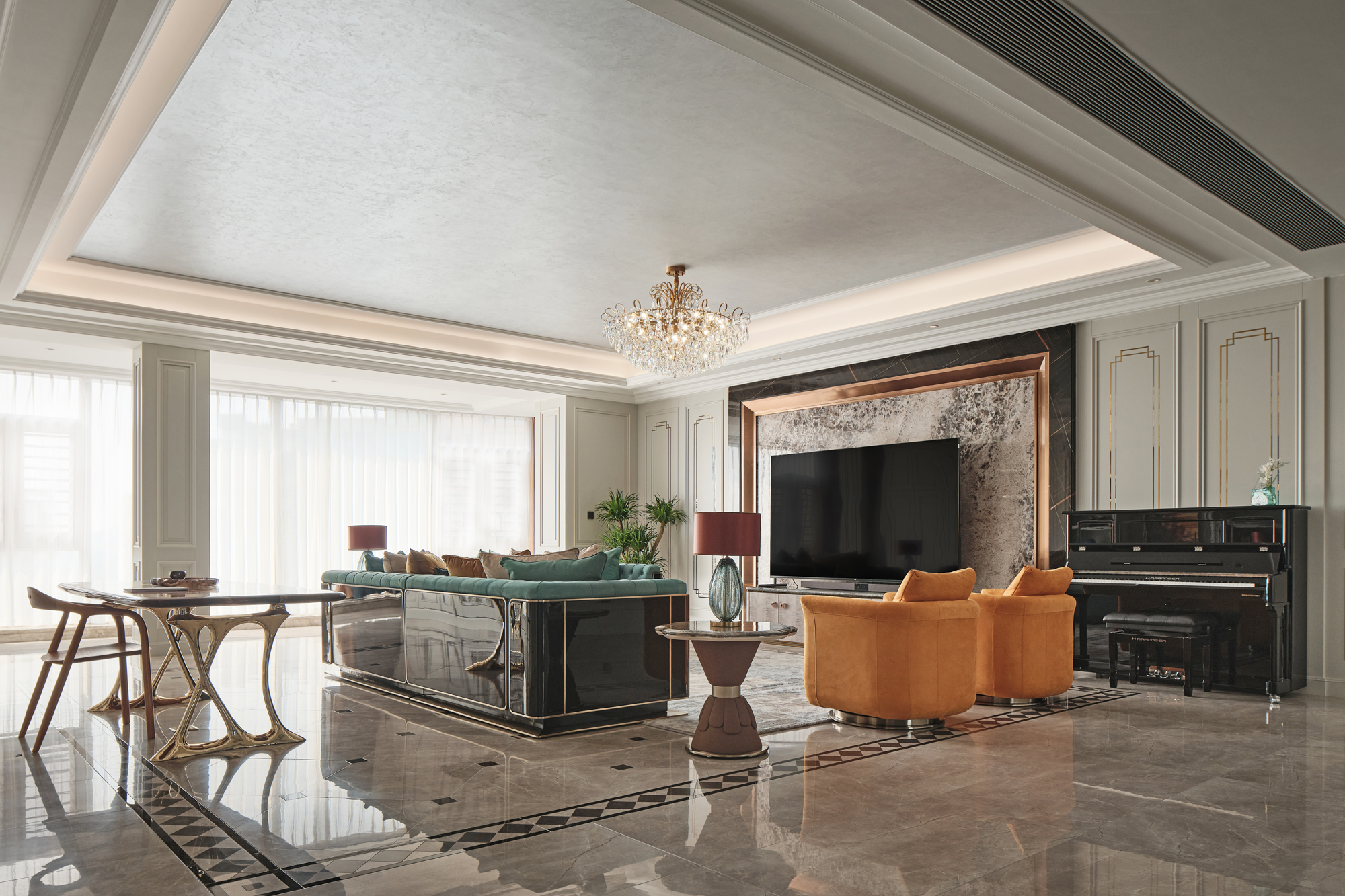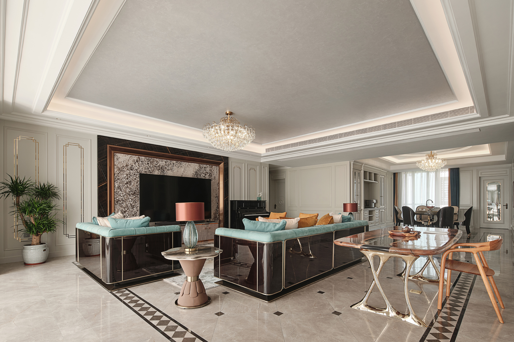 宏鼎海山壹号这套大平层的设计,去繁就简,将怀古的浪漫与现代人的生活需求相结合,将艺术的浪漫以细腻的笔触融入到空间,再透过醉人的细节锻造,给人不俗的生活享受。
