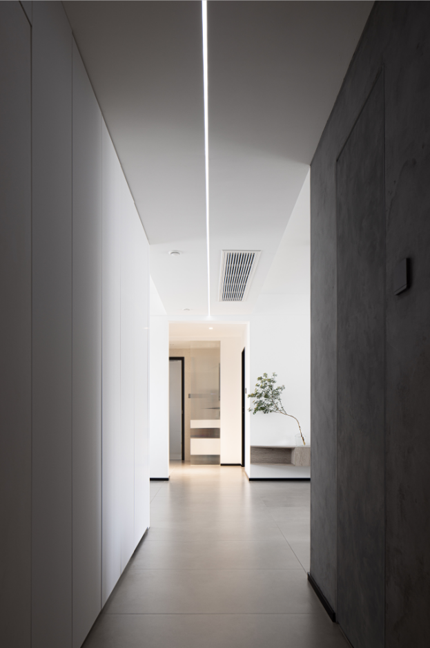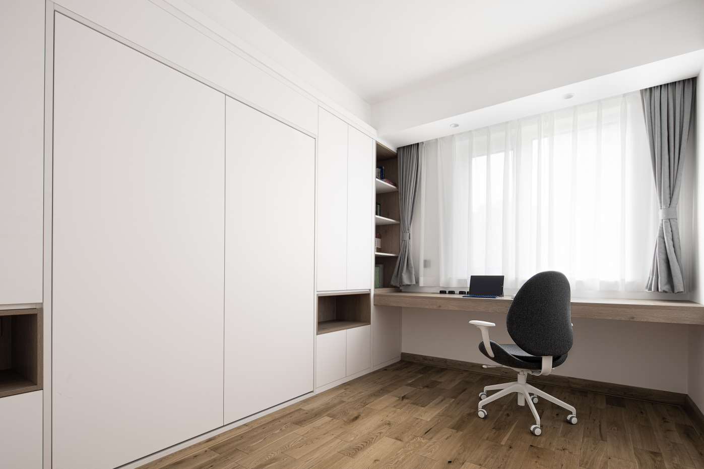 4.门厅过道实则是“隐藏高手”,集鞋柜-书房隐形门-储物柜等功能为一体,以统一的材质形成一个块面整体。考虑屋主经常会居家办公,客卧兼容书房功能,将床体“收进”墙内,墙面被赋予各种职责,空间自有分寸让生活井然。