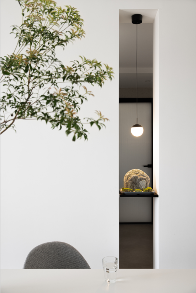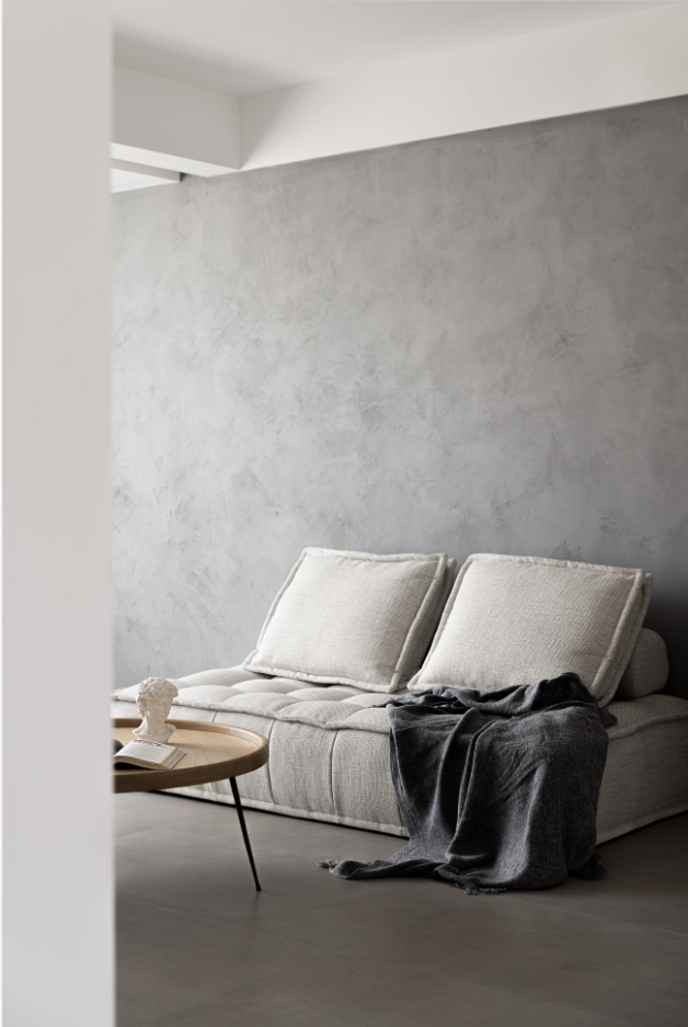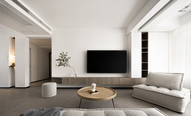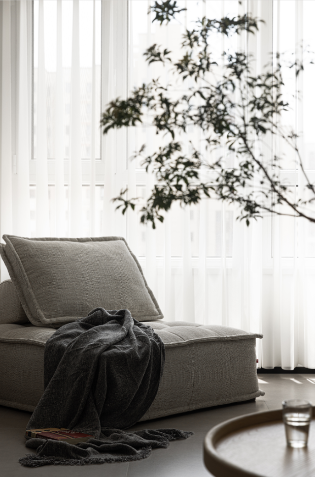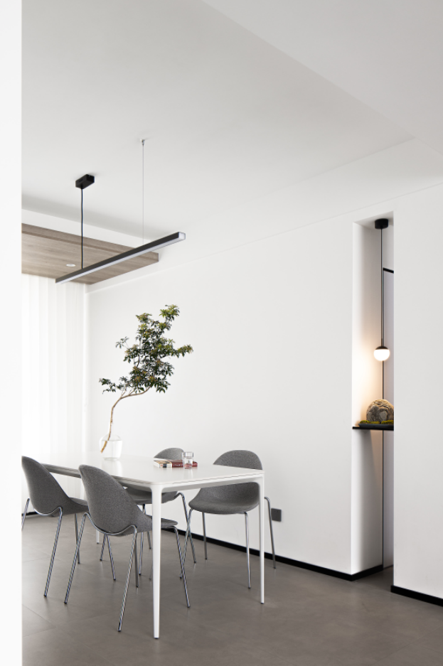 空间意境:素色,包纳万象。这儿,克制的材料,再简单不过的客厅,人置身其中创造生活的痕迹,空间就绽放出强烈的美好去迎接。灰白调,乳胶漆的细腻与艺术涂料的肌理,碰撞出耐看场景。可随意拆分组合的粗织物沙发,大体块的绵软接住任意姿态的身躯,开放与自由随处可见,空间的不设限便是生活的多种可能。
