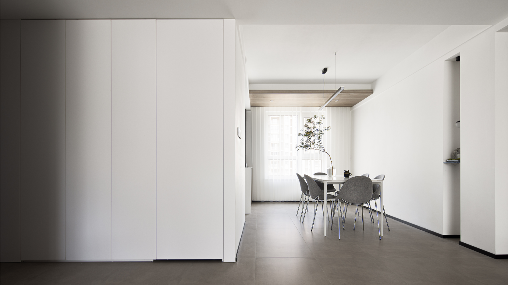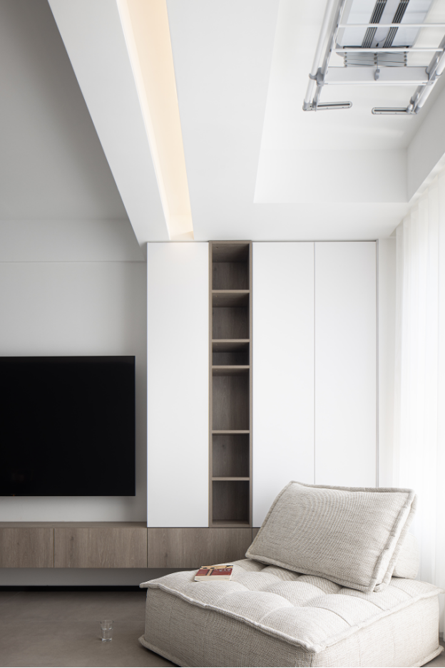 空间布局:1.有了空间的视觉中心,一些收纳就要藏起来,还给家该有的干干净净。屋主律师的职业属性,让其衣物选择多衬衫及正装,入户平整的柜体收拢了“机巧机关”,将洗衣烘干功能区填满于此,空间立面不再是单一的装饰,省去晾晒的空间,砸掉北向阳台纳入客厅,极简亦是满满的内里功底展现。