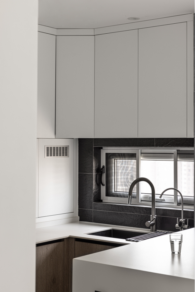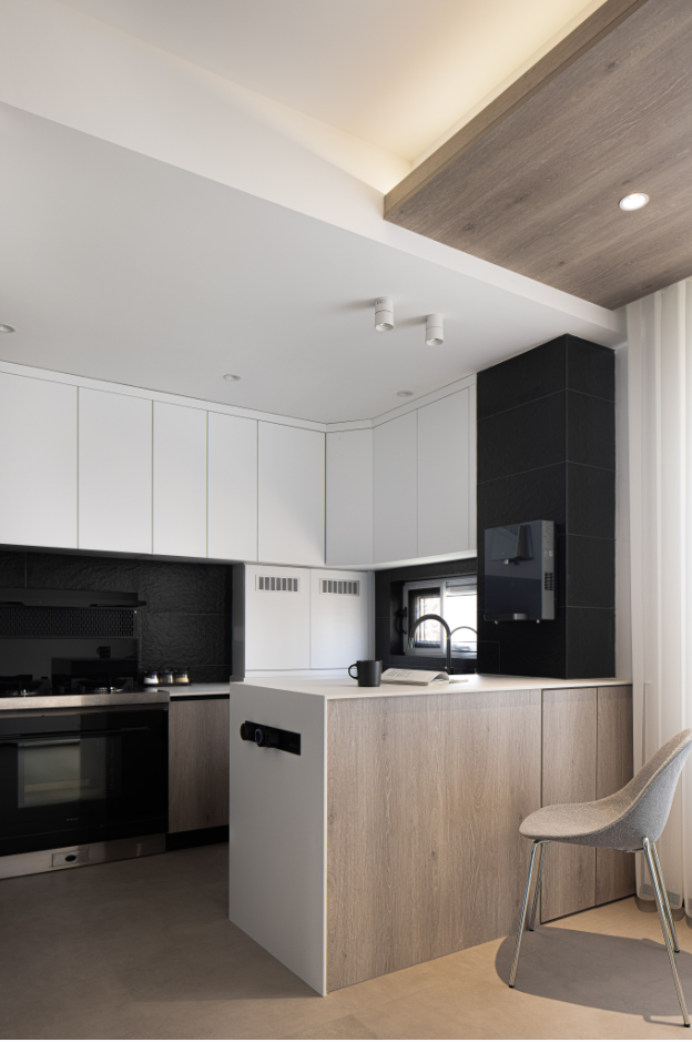 3.了解其一周在家做饭3-4次,偶尔朋友在家聚会,设计考量做开放式厨房,餐厨一体化打开空间格局,解决厨房采光弱的问题。墙面仿黑色石材的砖,与白色橱柜形成对比,视线错落层次分明,烟火地亦可有条不紊拥有秩序美感。
