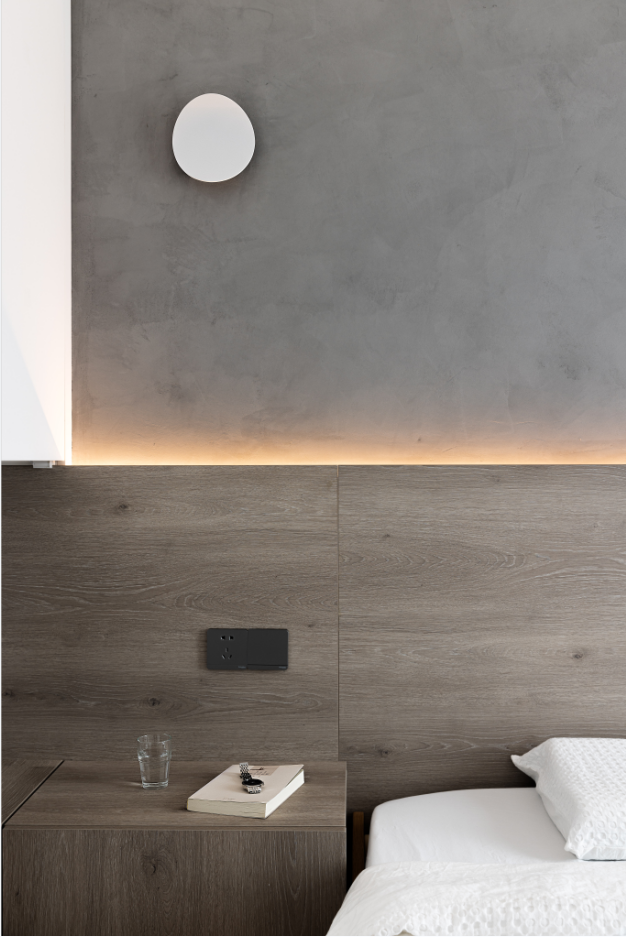 设计选材:引主材质灰调艺术涂料进入主卧,借助简洁凝练的设计语言,为这一方私密空间,提供纯粹的情绪表达。木质柜体延伸刚好做床头柜使用,线性灯穿行而过,简雅的明度让情绪放松舒缓,明月一盏伴着一夜好眠。