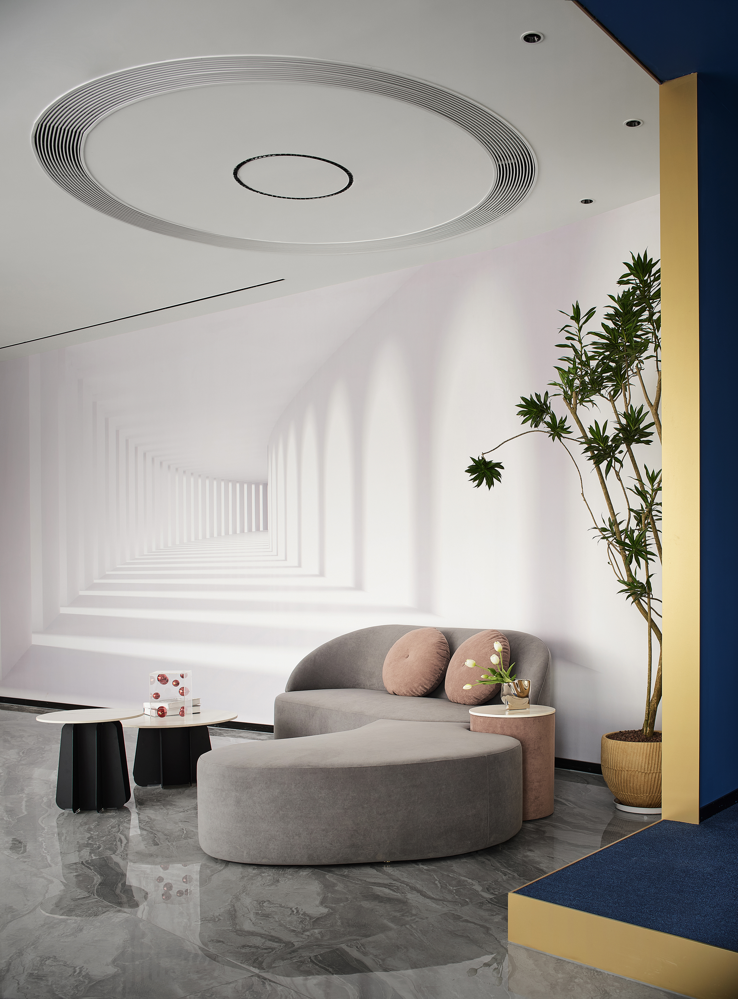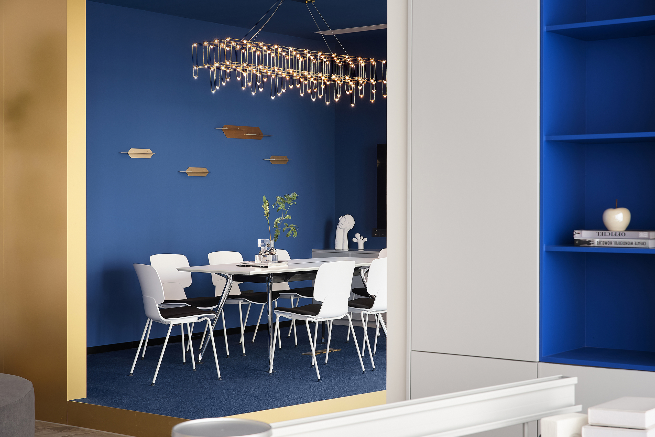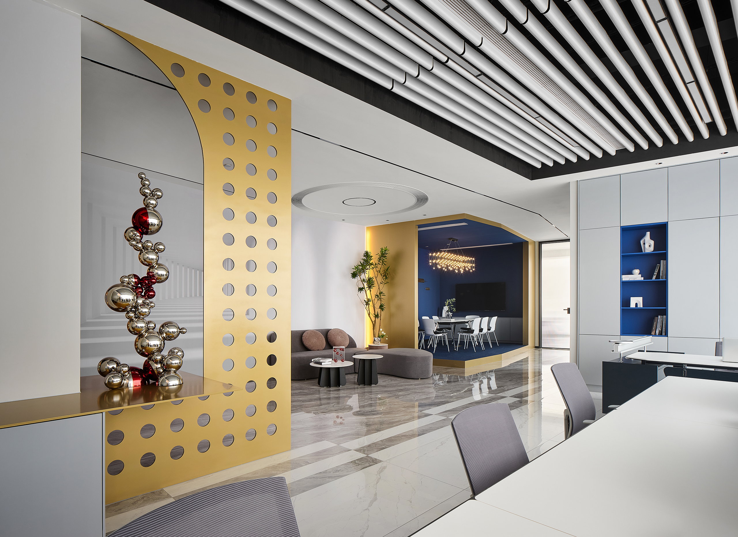 颜色在很大程度上影响心情和感受,这直接影响到工作的质量和员工的创造力,因此空间和元素的颜色和色调选择了深蓝和金黄两种对比色。深蓝---宁静、深邃、温柔、智慧的代表。金黄---熠熠生辉,热情步步攀升。