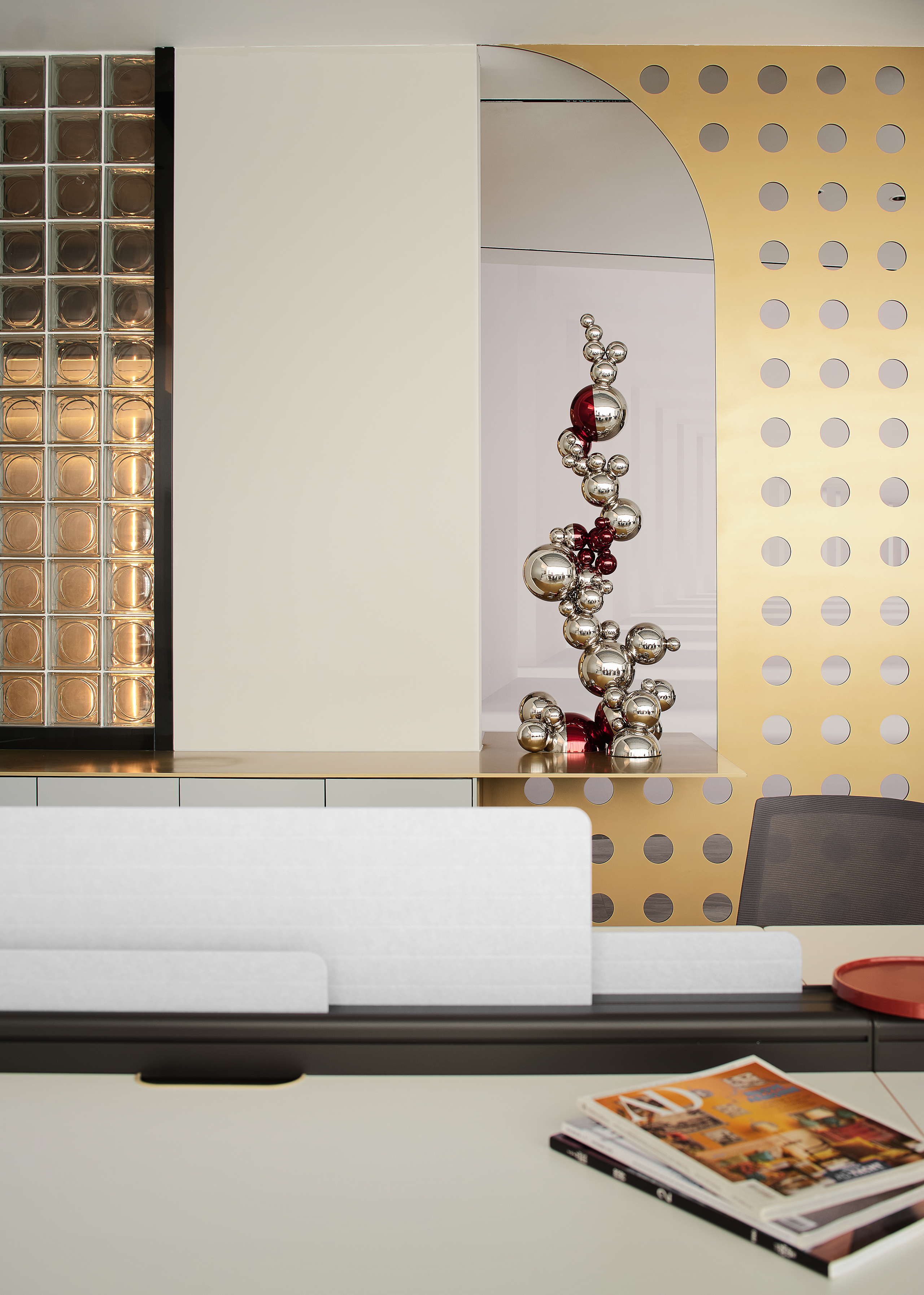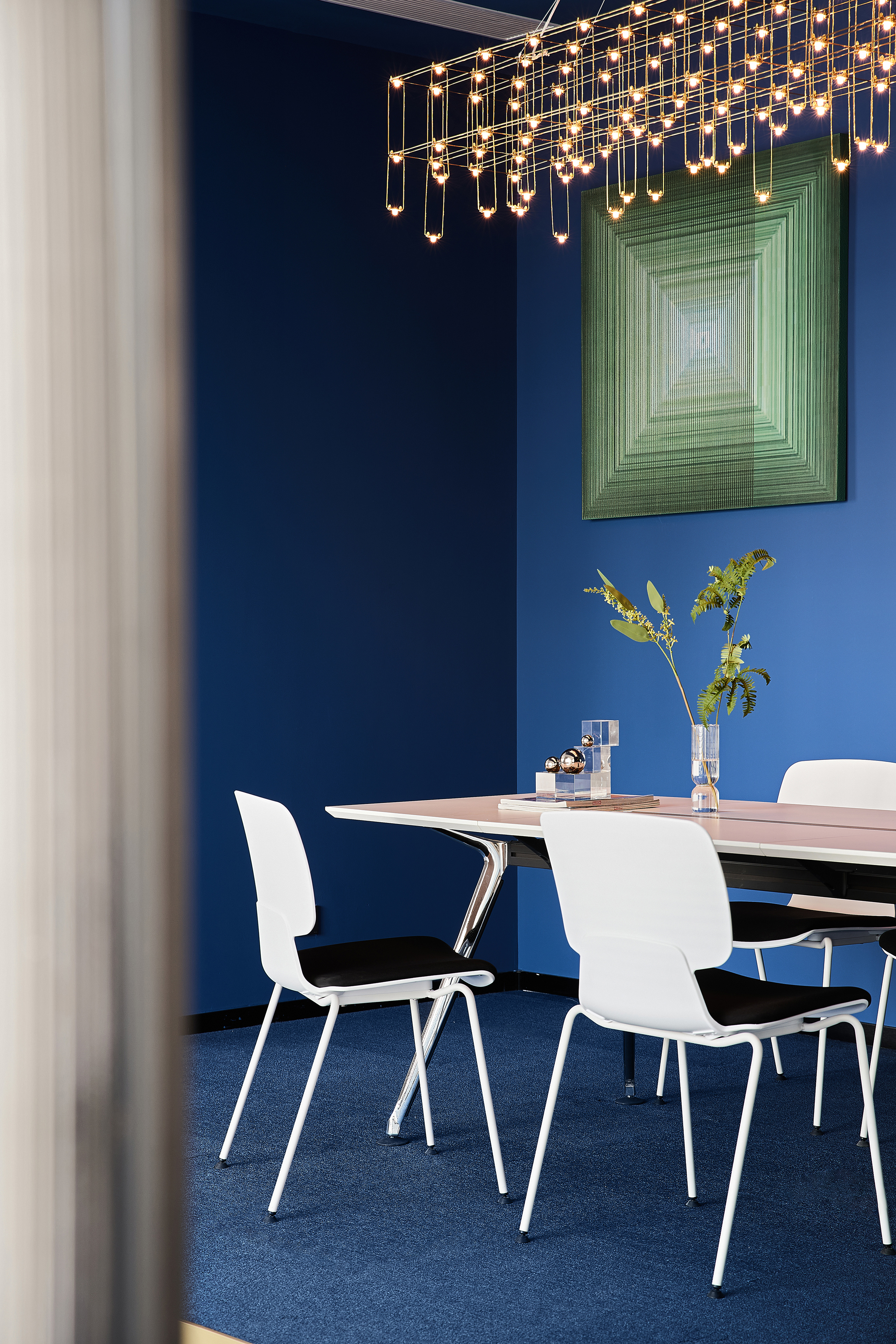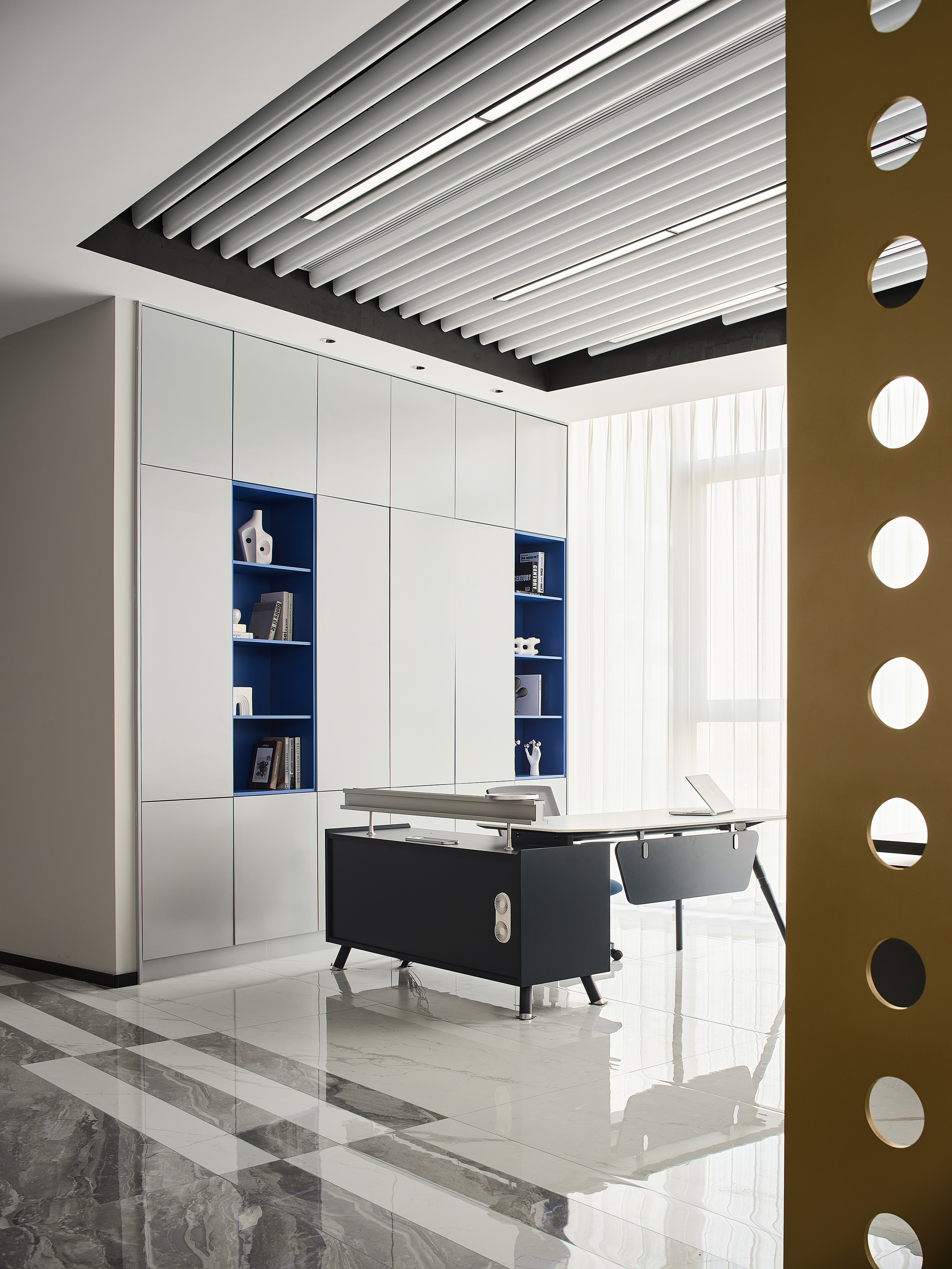 颜色在很大程度上影响心情和感受,这直接影响到工作的质量和员工的创造力,因此空间和元素的颜色和色调选择了深蓝和金黄两种对比色。深蓝---宁静、深邃、温柔、智慧的代表。金黄---熠熠生辉,热情步步攀升。