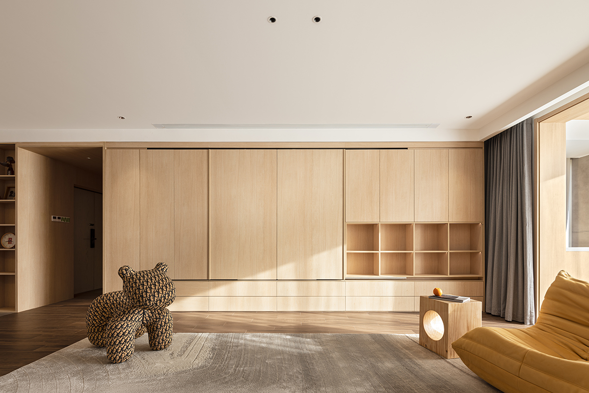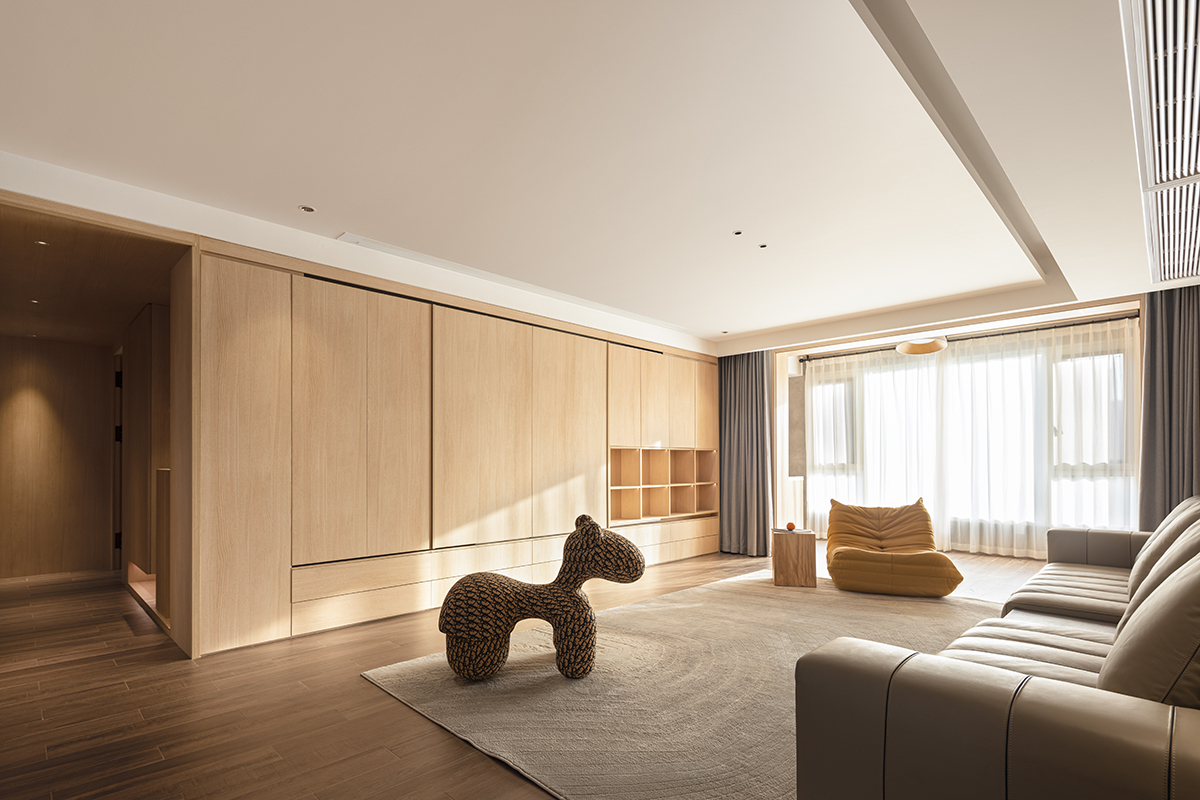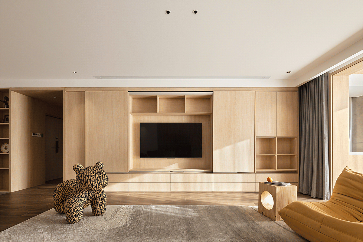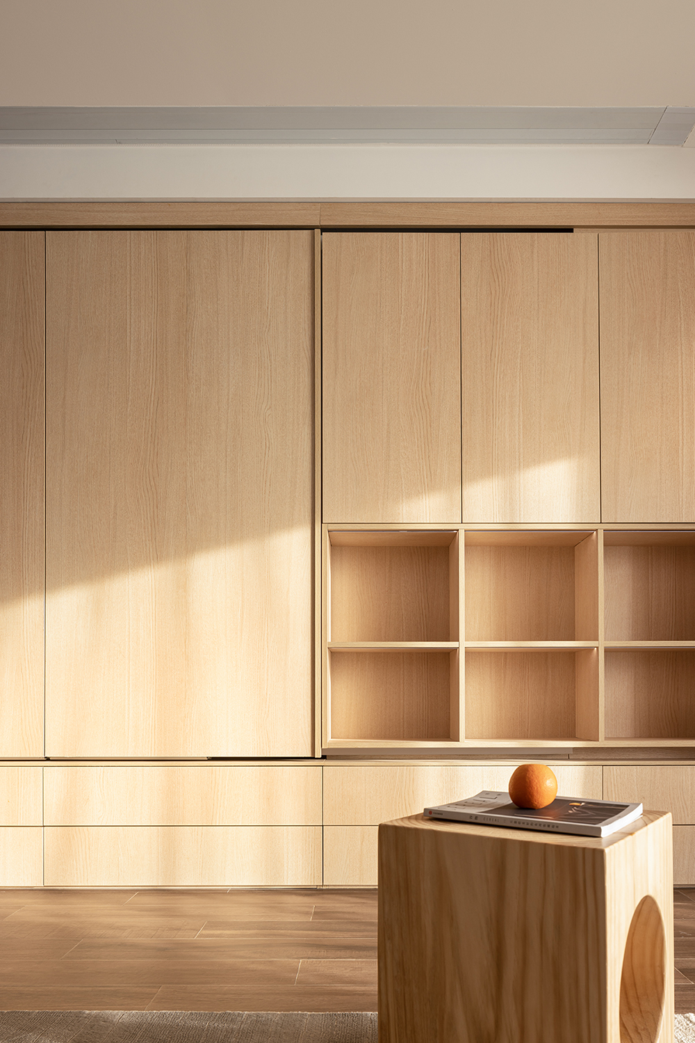 空间意境:区别于传统的电视背景墙设计,借助柜门“开合”的形式呈现整个展示面。从另外一个角度来说,也是在“去客厅化”。当家庭成员相聚于此处,大家更多是在交流、分享,或是沉浸式阅读。错落的光线镌刻时光的痕迹,记录当下的写意生活。