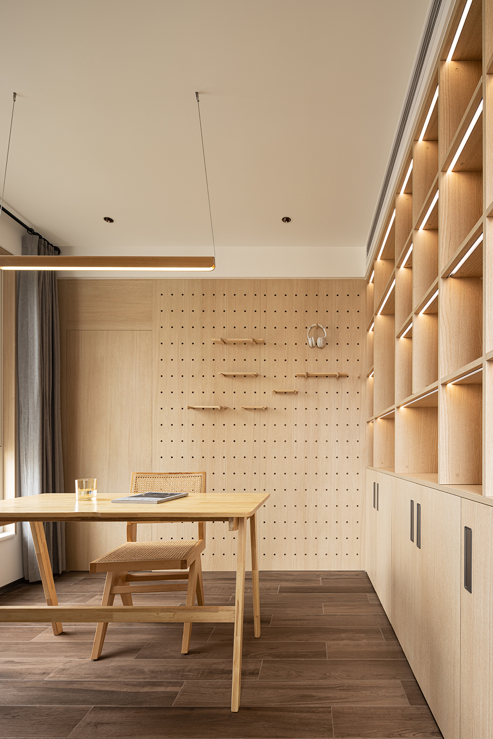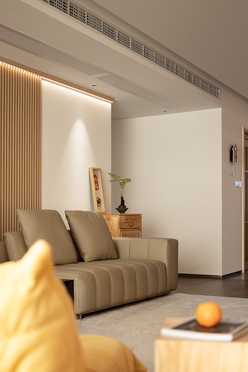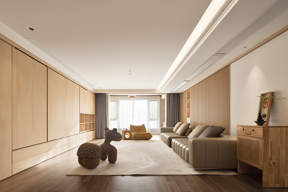 空间意境:区别于传统的电视背景墙设计,借助柜门“开合”的形式呈现整个展示面。从另外一个角度来说,也是在“去客厅化”。当家庭成员相聚于此处,大家更多是在交流、分享,或是沉浸式阅读。错落的光线镌刻时光的痕迹,记录当下的写意生活。
