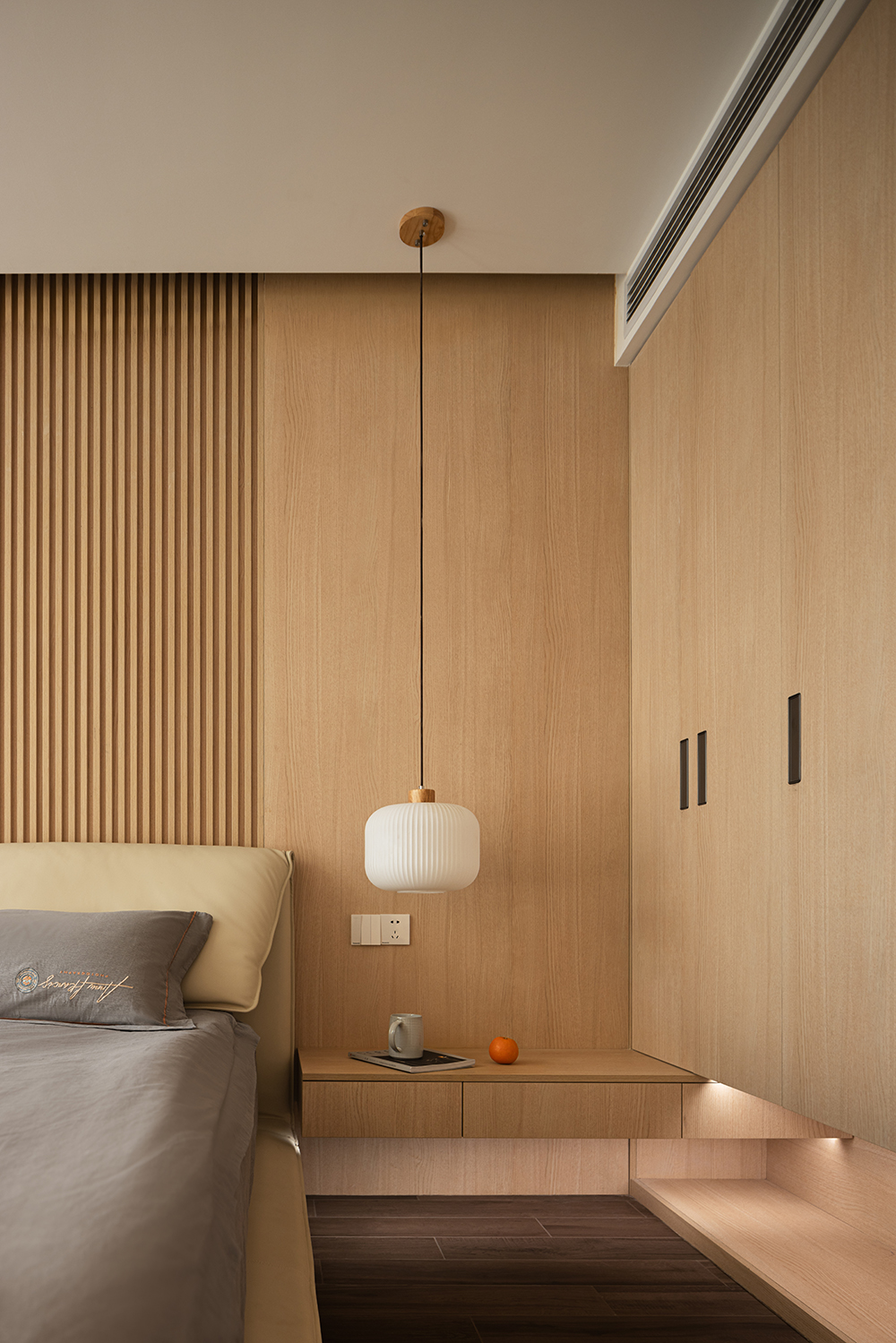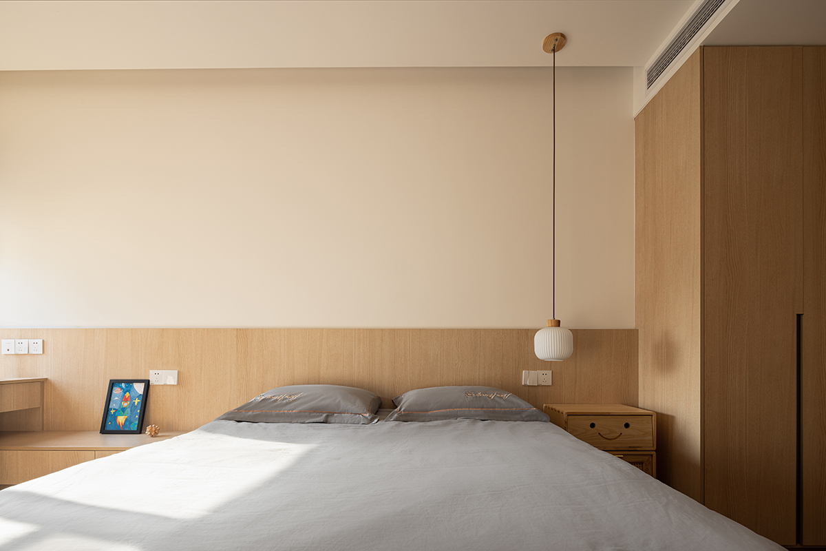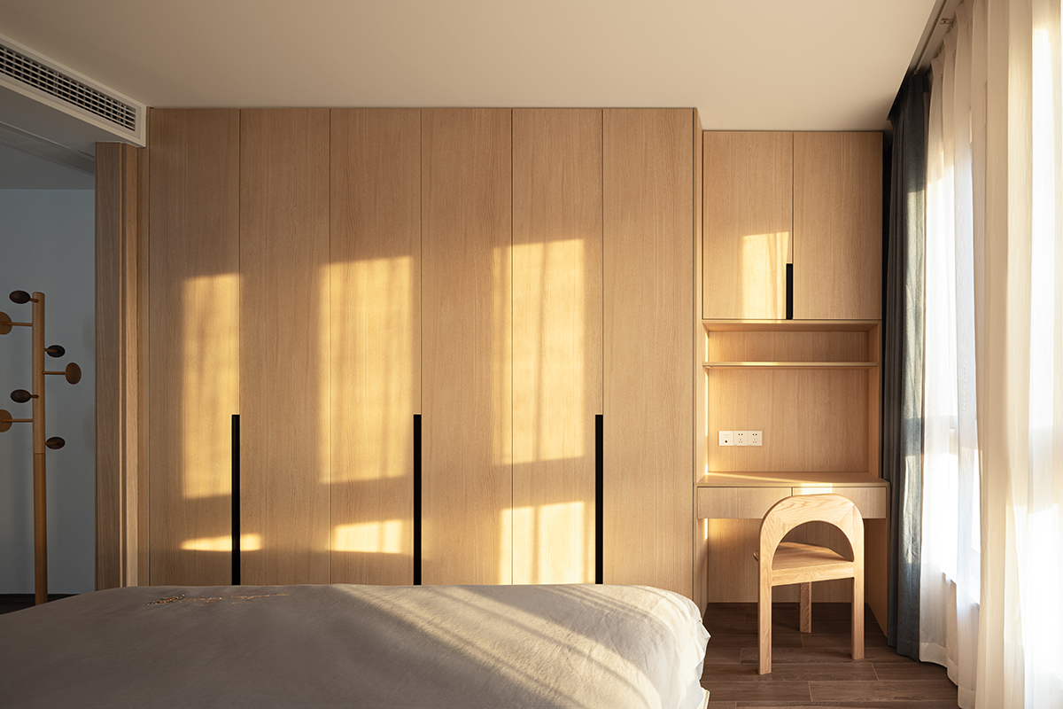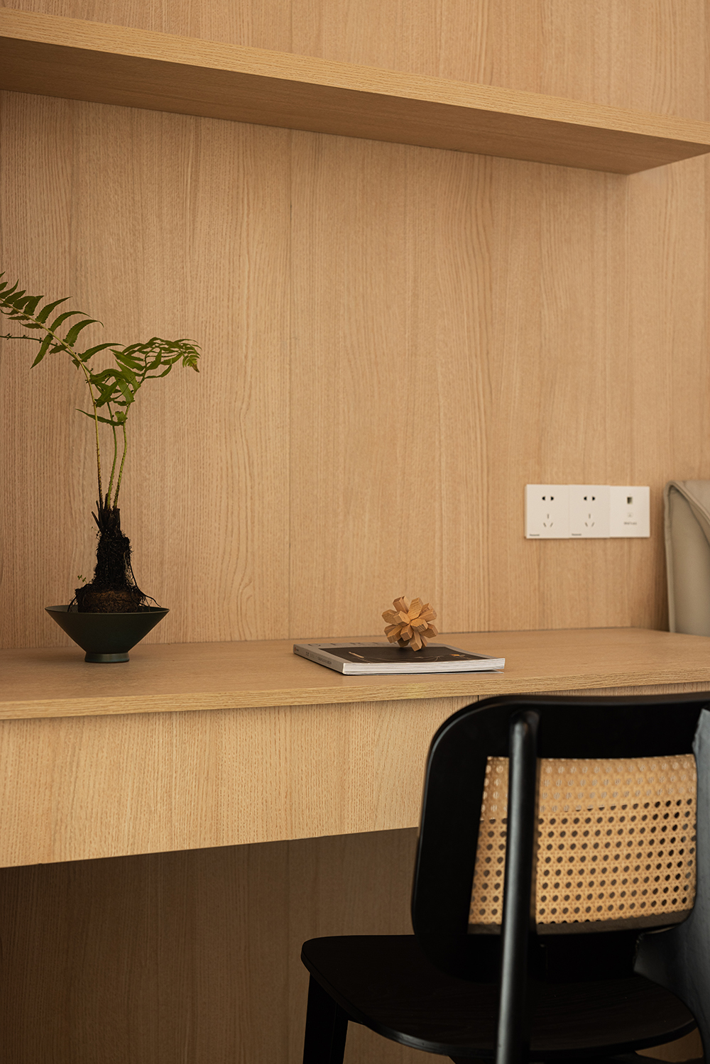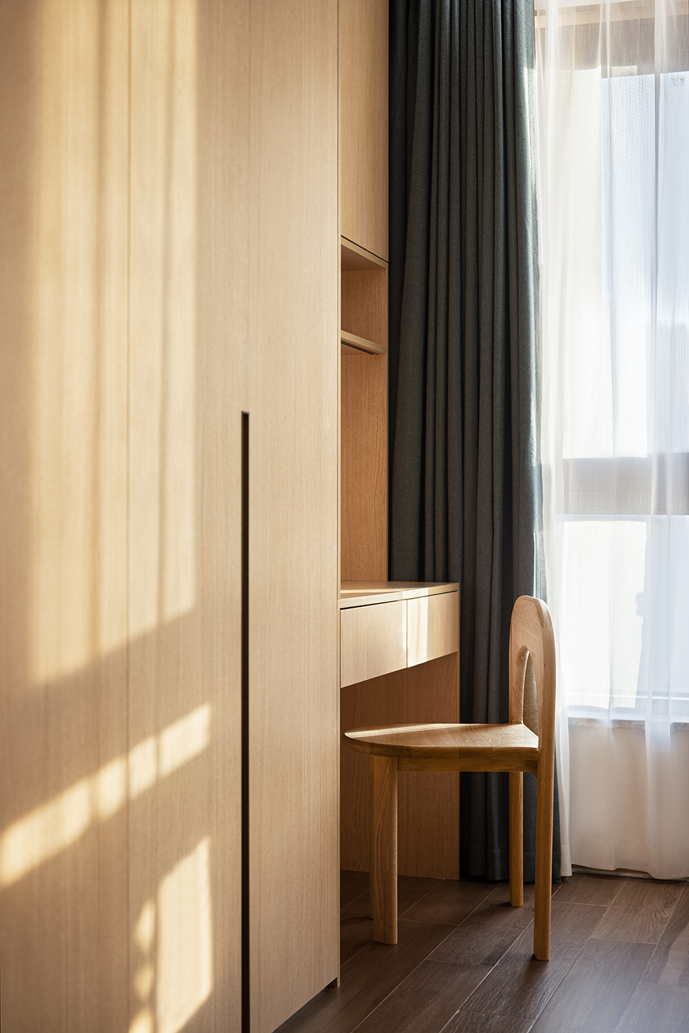 设计选材:餐厅延续了客厅的原木风,一整面的柜体设计,保持了空间的井然有序。与之呼应的餐桌、餐椅,从细节处建立了用餐的仪式感。在温润的木质肌理中,营造出一种岁月静好的沉淀感。