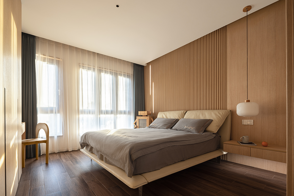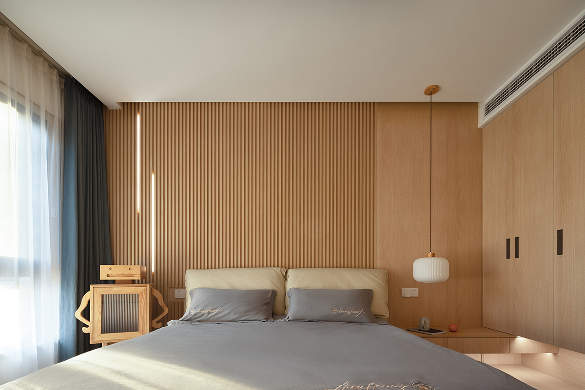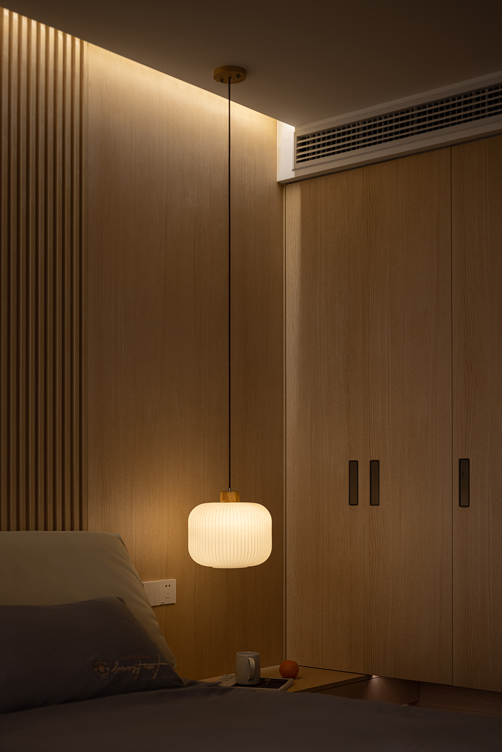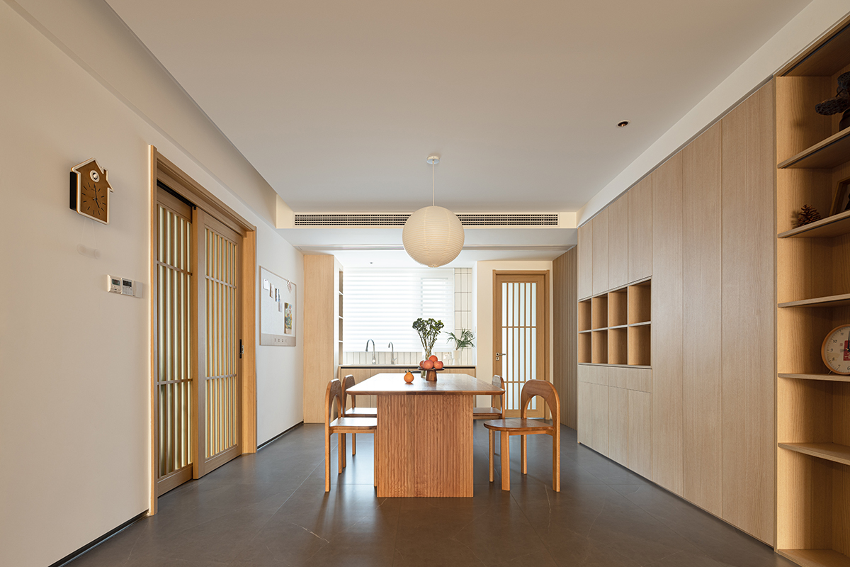 设计选材:餐厅延续了客厅的原木风,一整面的柜体设计,保持了空间的井然有序。与之呼应的餐桌、餐椅,从细节处建立了用餐的仪式感。在温润的木质肌理中,营造出一种岁月静好的沉淀感。