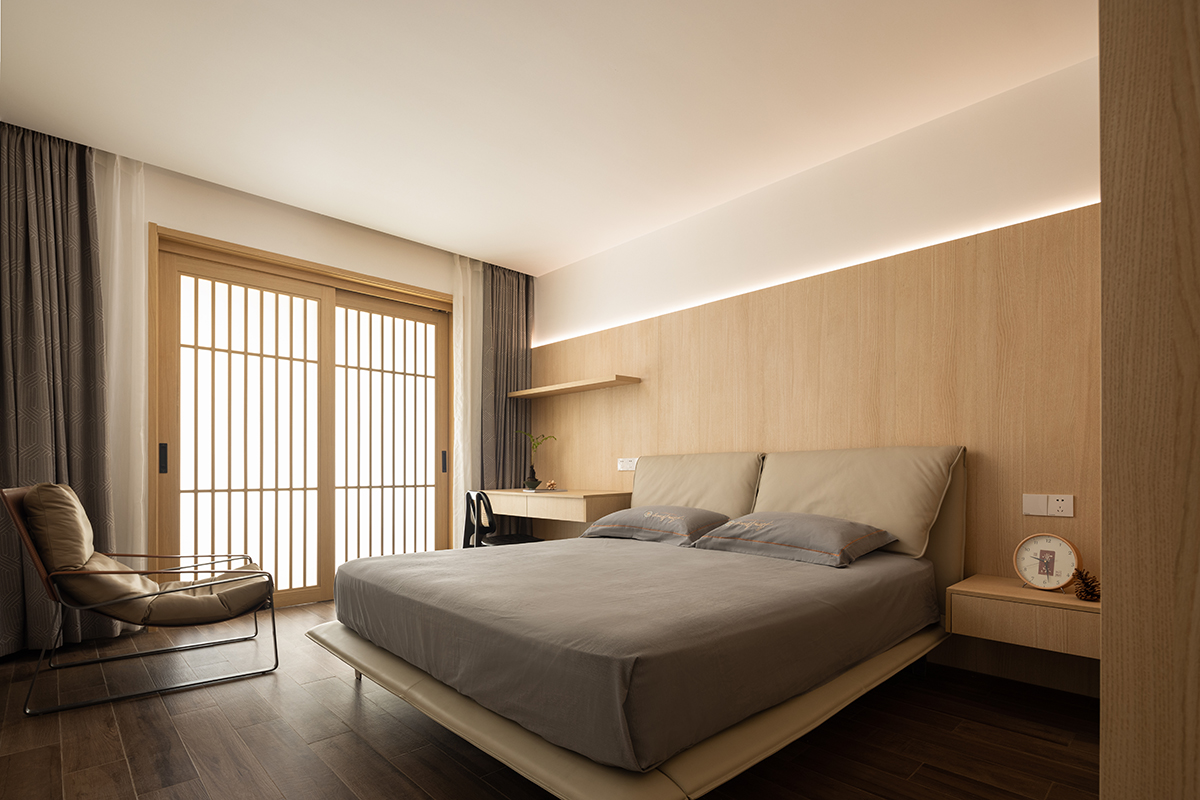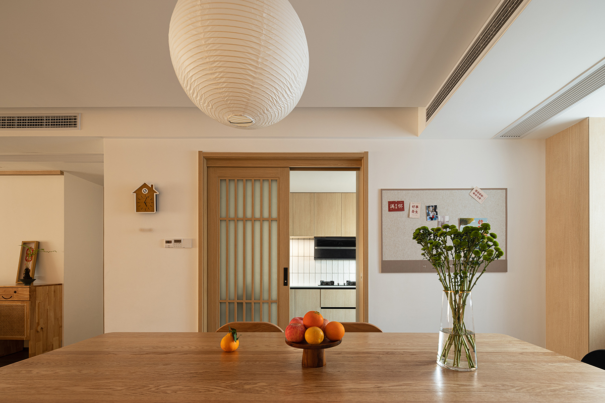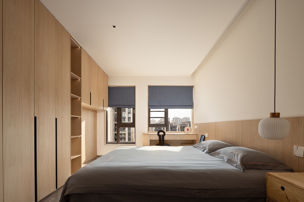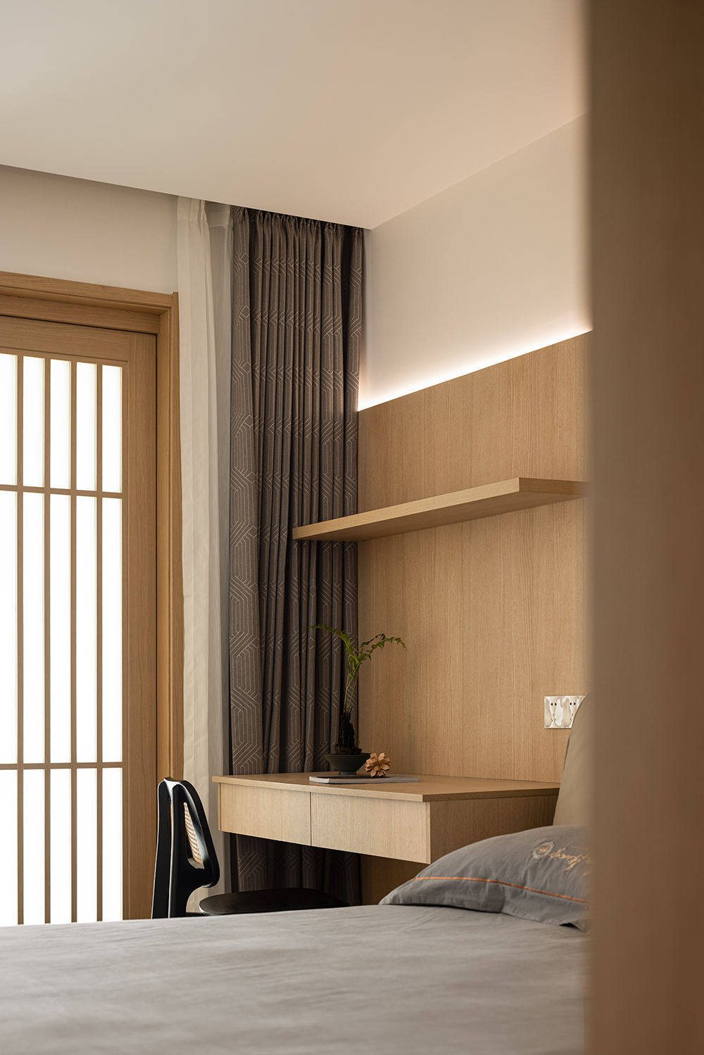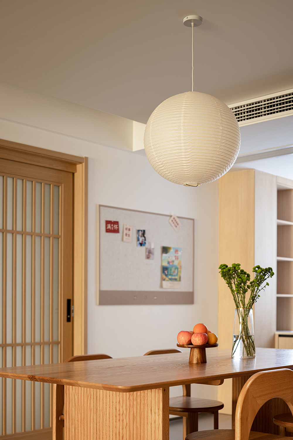 设计选材:餐厅延续了客厅的原木风,一整面的柜体设计,保持了空间的井然有序。与之呼应的餐桌、餐椅,从细节处建立了用餐的仪式感。在温润的木质肌理中,营造出一种岁月静好的沉淀感。