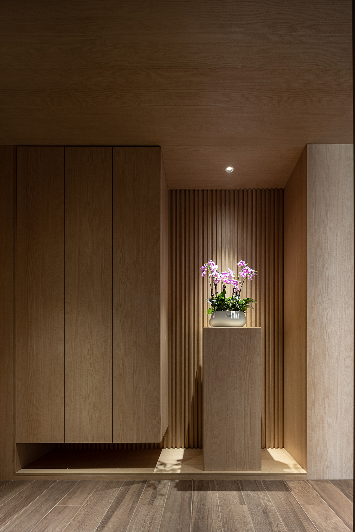 空间布局:进入室内,雅致、明亮的气息迎面而来,将原本局促的玄关一分为二,柜体设计增加了空间的储物功能,落地的花艺摆件扩大了空间感,也给予归家的仪式感。