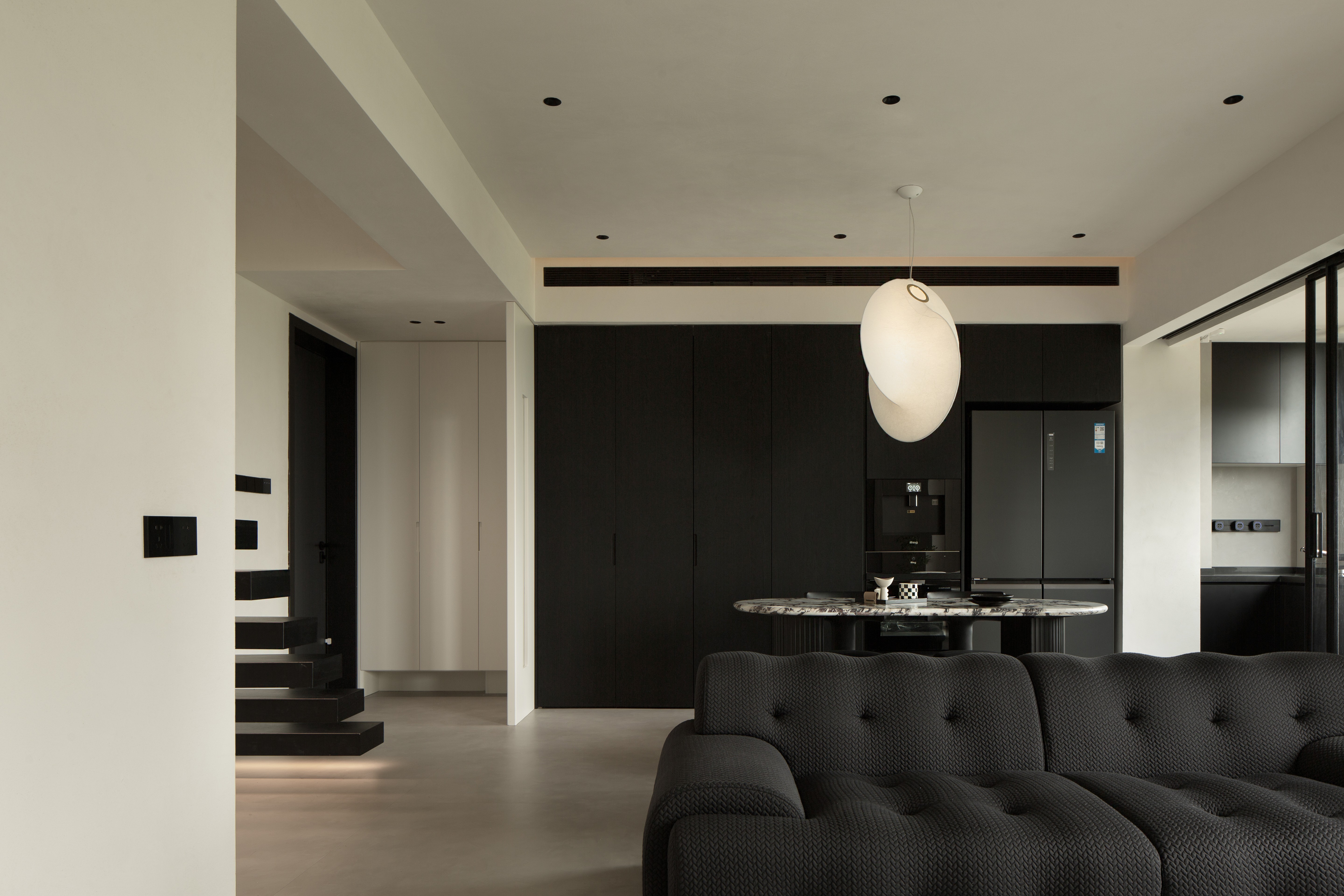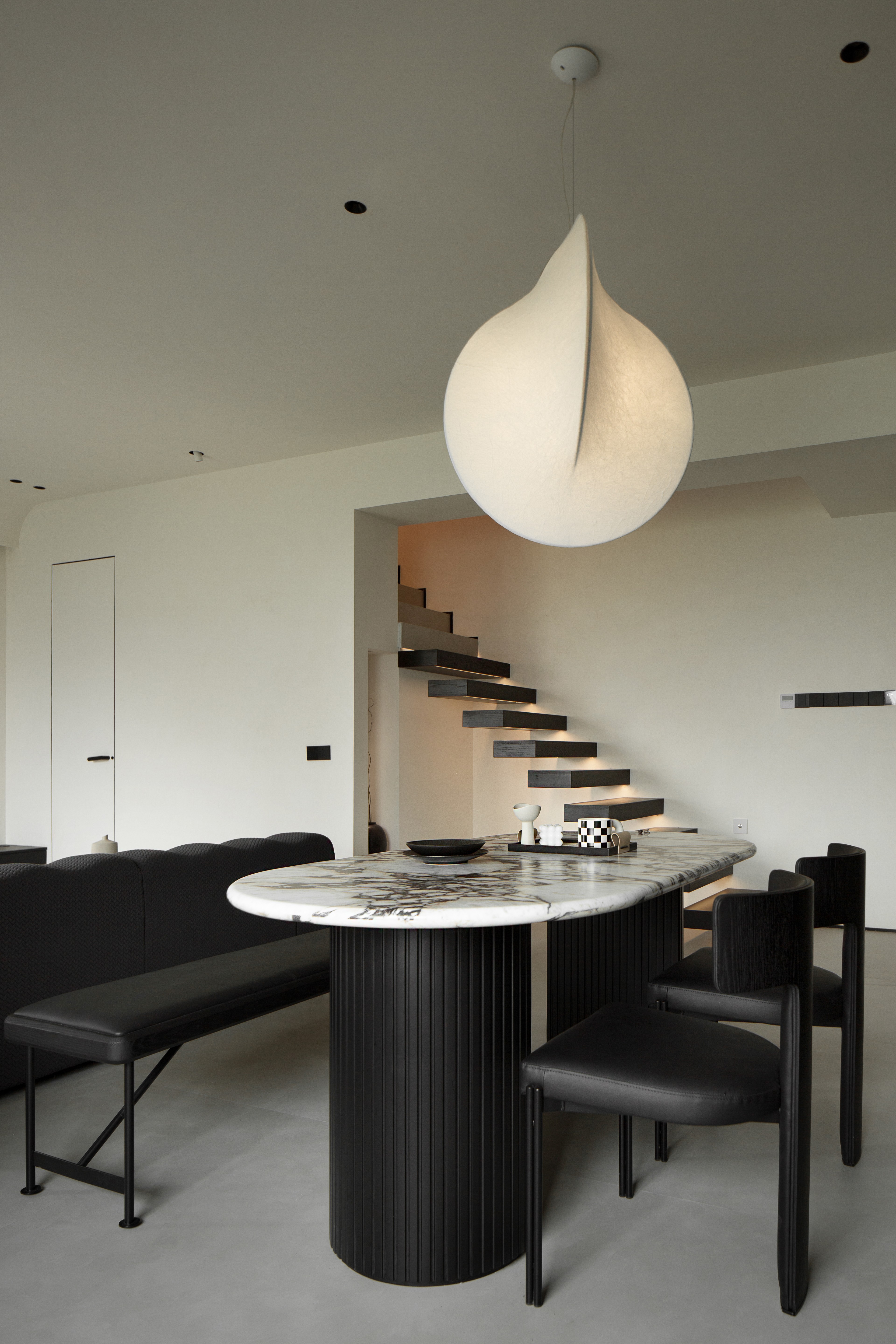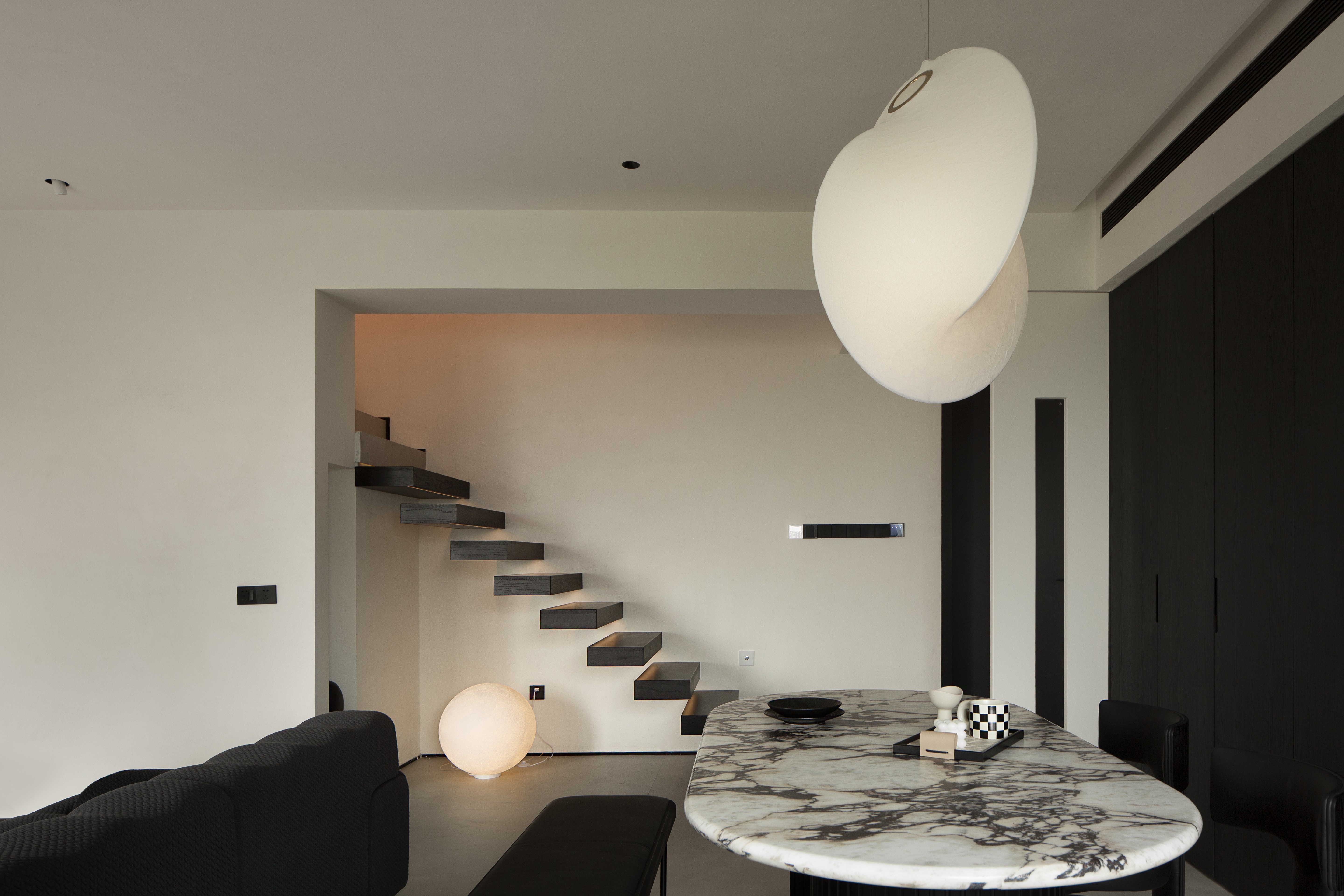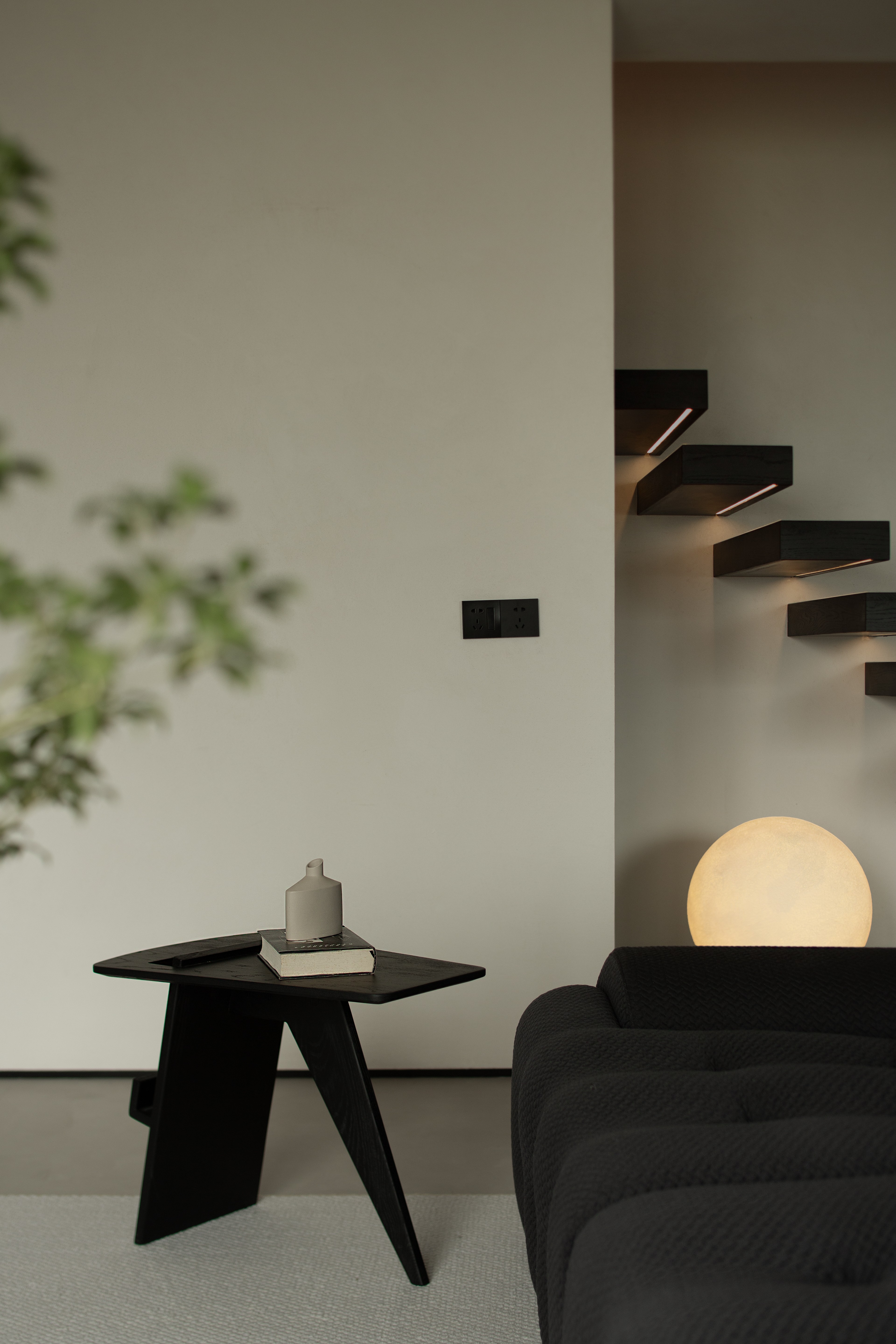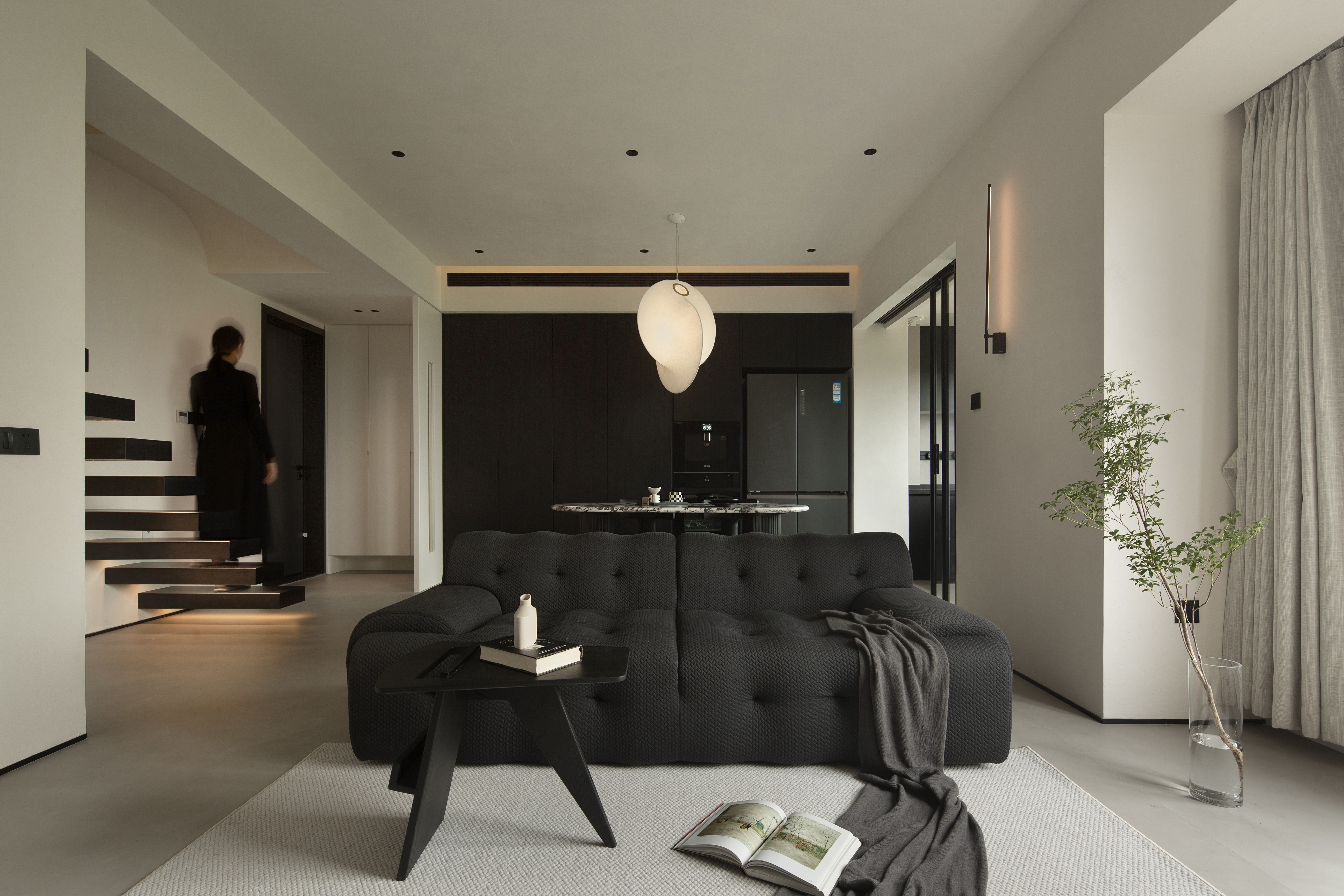 整体以黑白为主,但是其中家具饰品,灯具才是这个家的灵魂所在。黑色的橡木实木贴皮,让柜子,楼梯更显质感。墙顶面是微水泥的原浆色,带点暖白,我选择是比较粗糙的质感面。地面是比微水泥色深点的纯哑光岩板通铺。