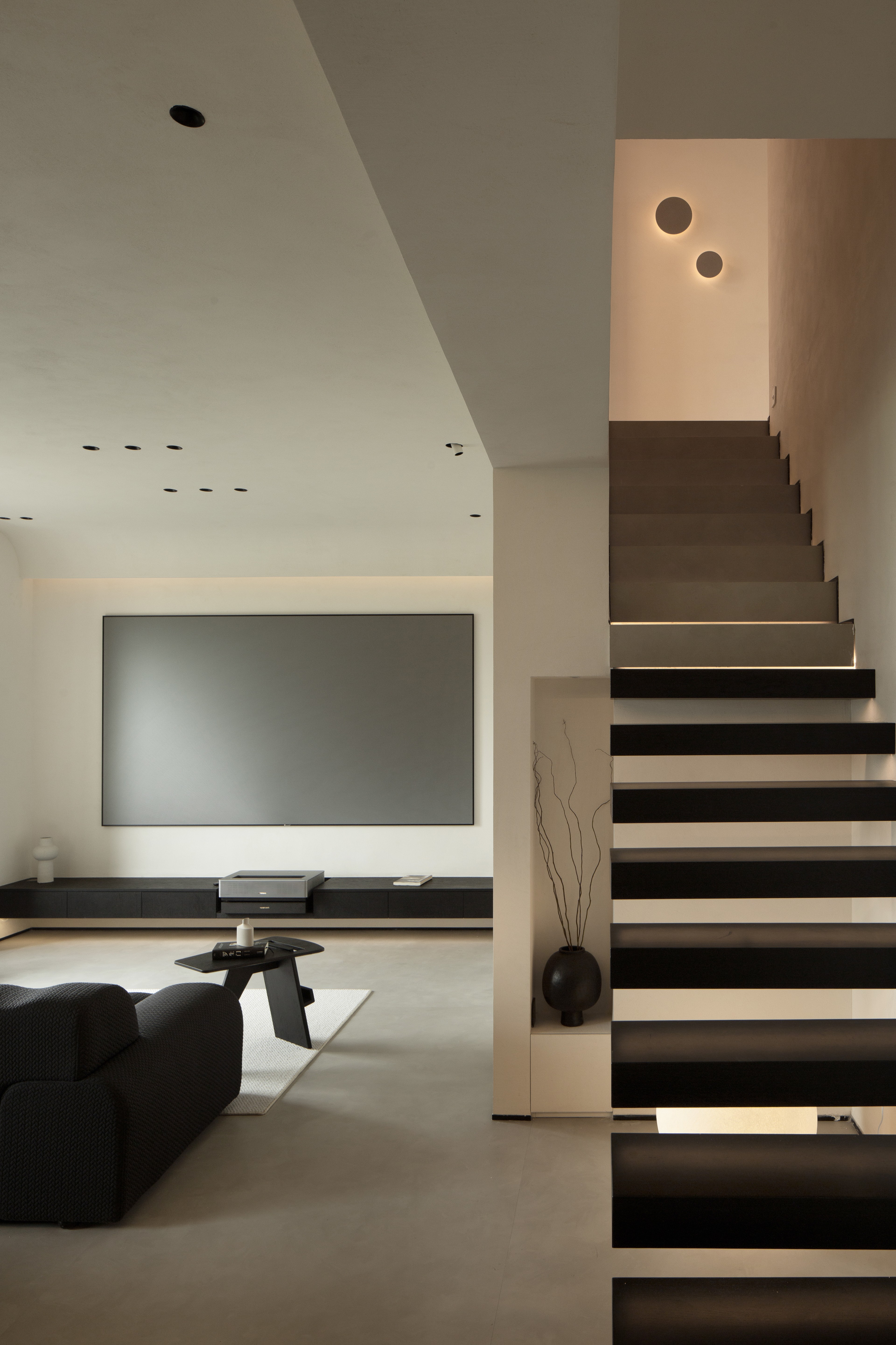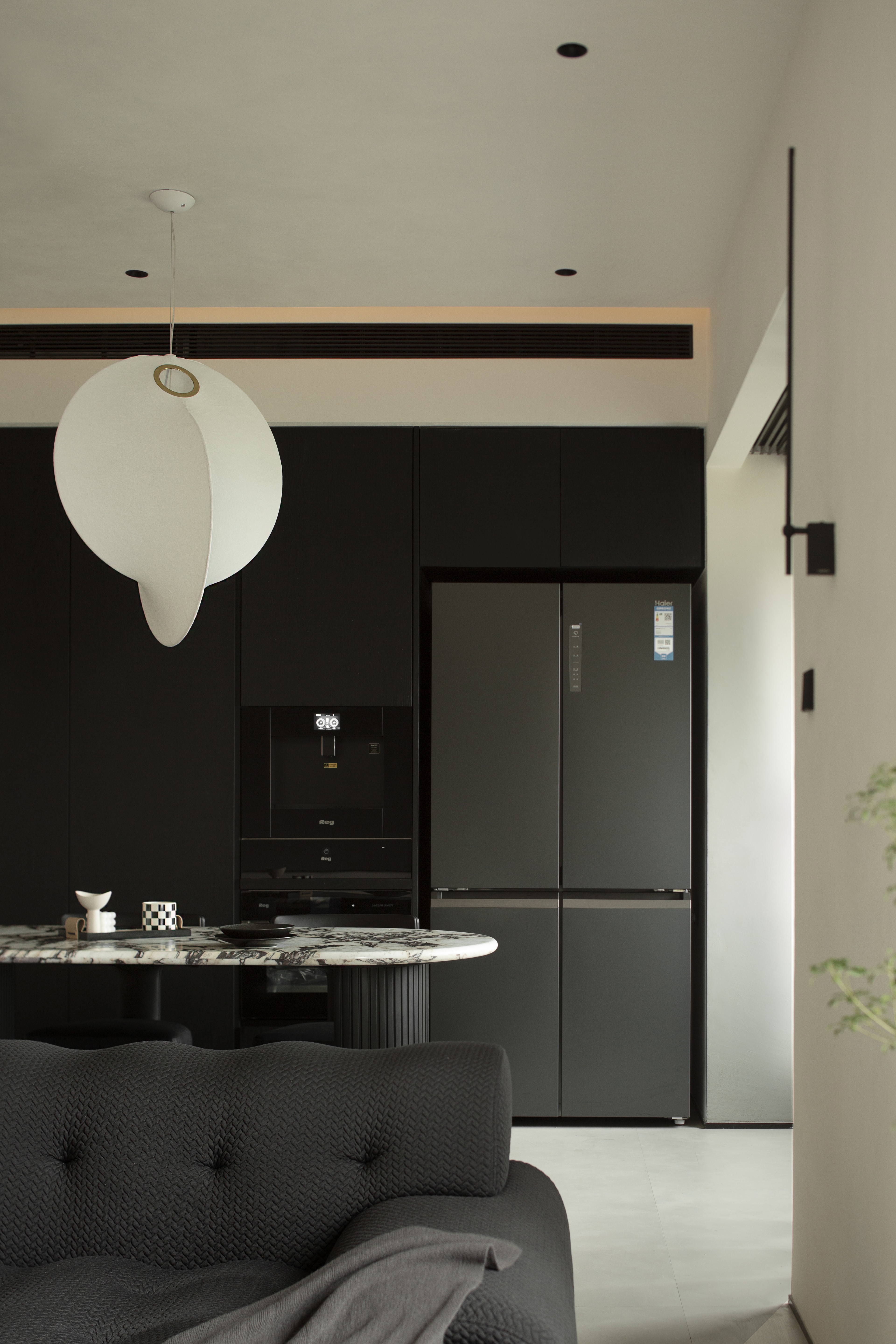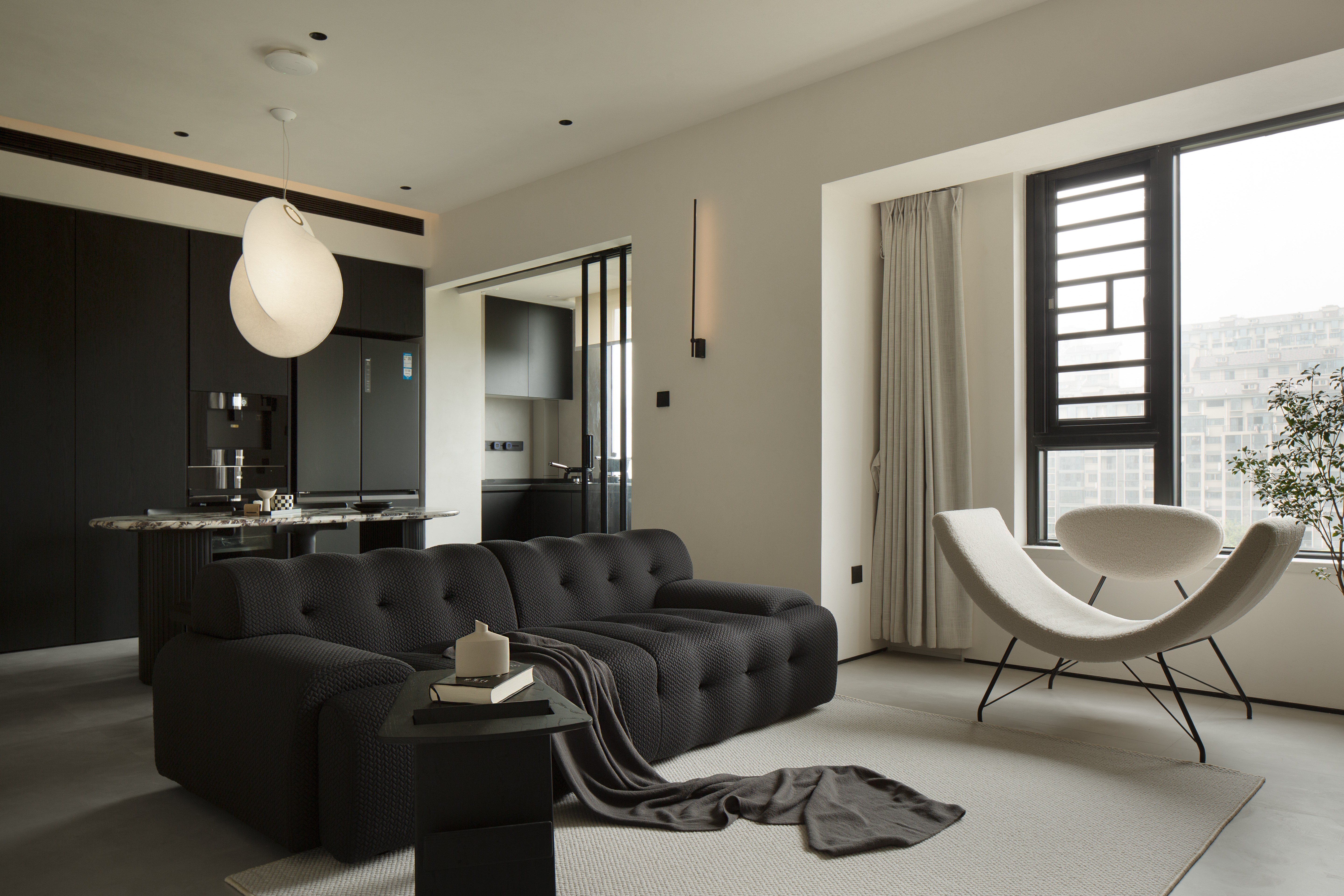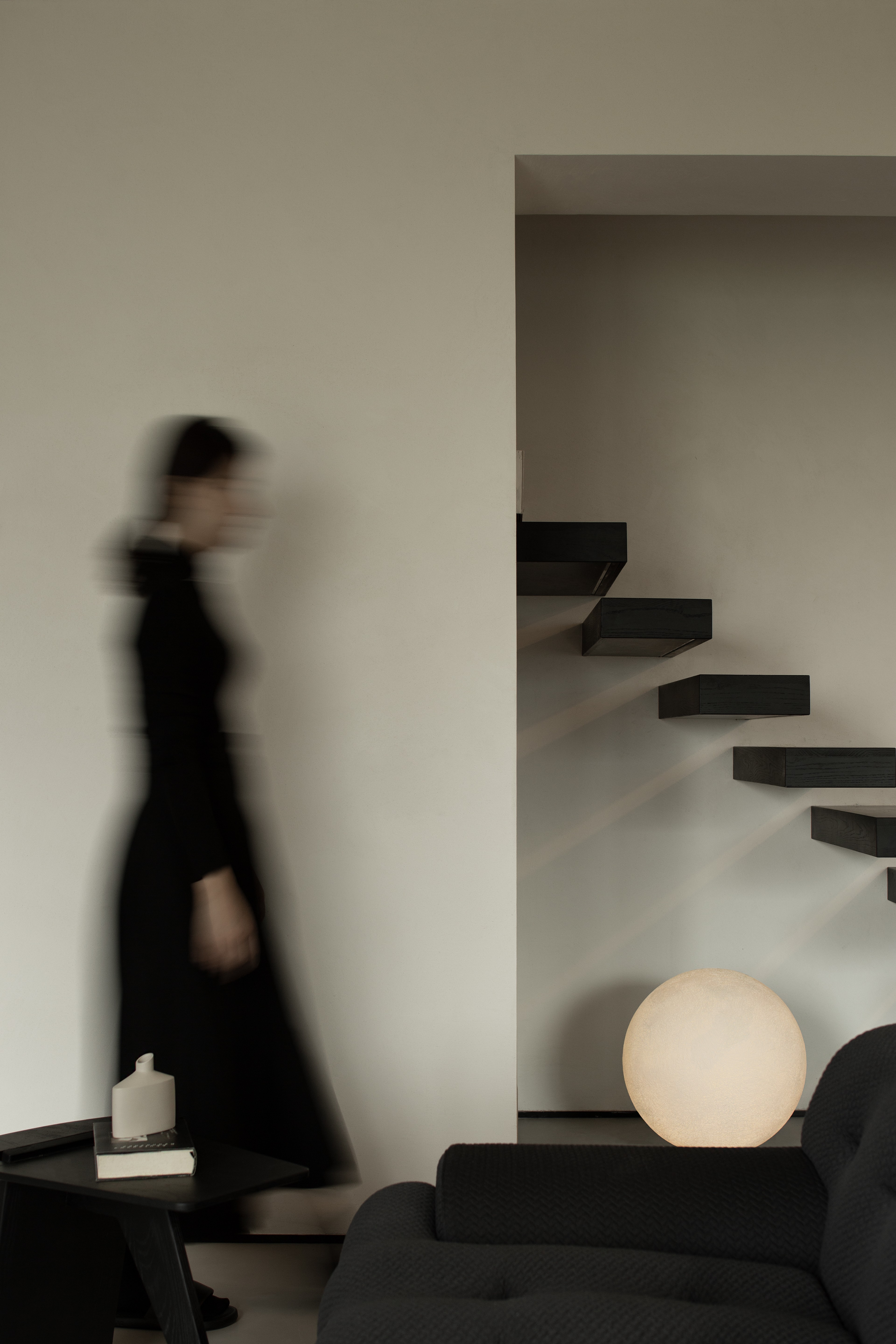 整体以黑白为主,但是其中家具饰品,灯具才是这个家的灵魂所在。黑色的橡木实木贴皮,让柜子,楼梯更显质感。墙顶面是微水泥的原浆色,带点暖白,我选择是比较粗糙的质感面。地面是比微水泥色深点的纯哑光岩板通铺。