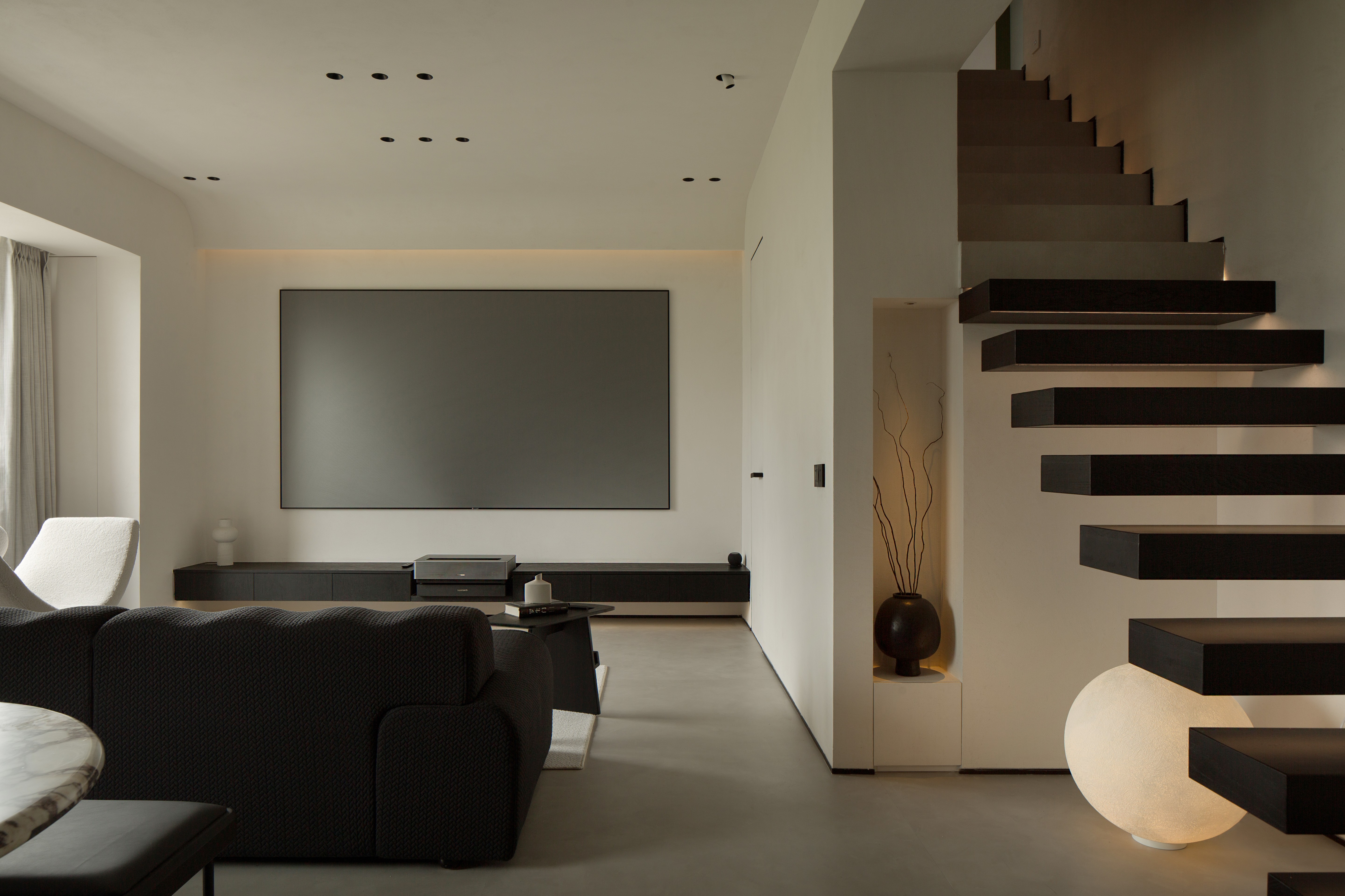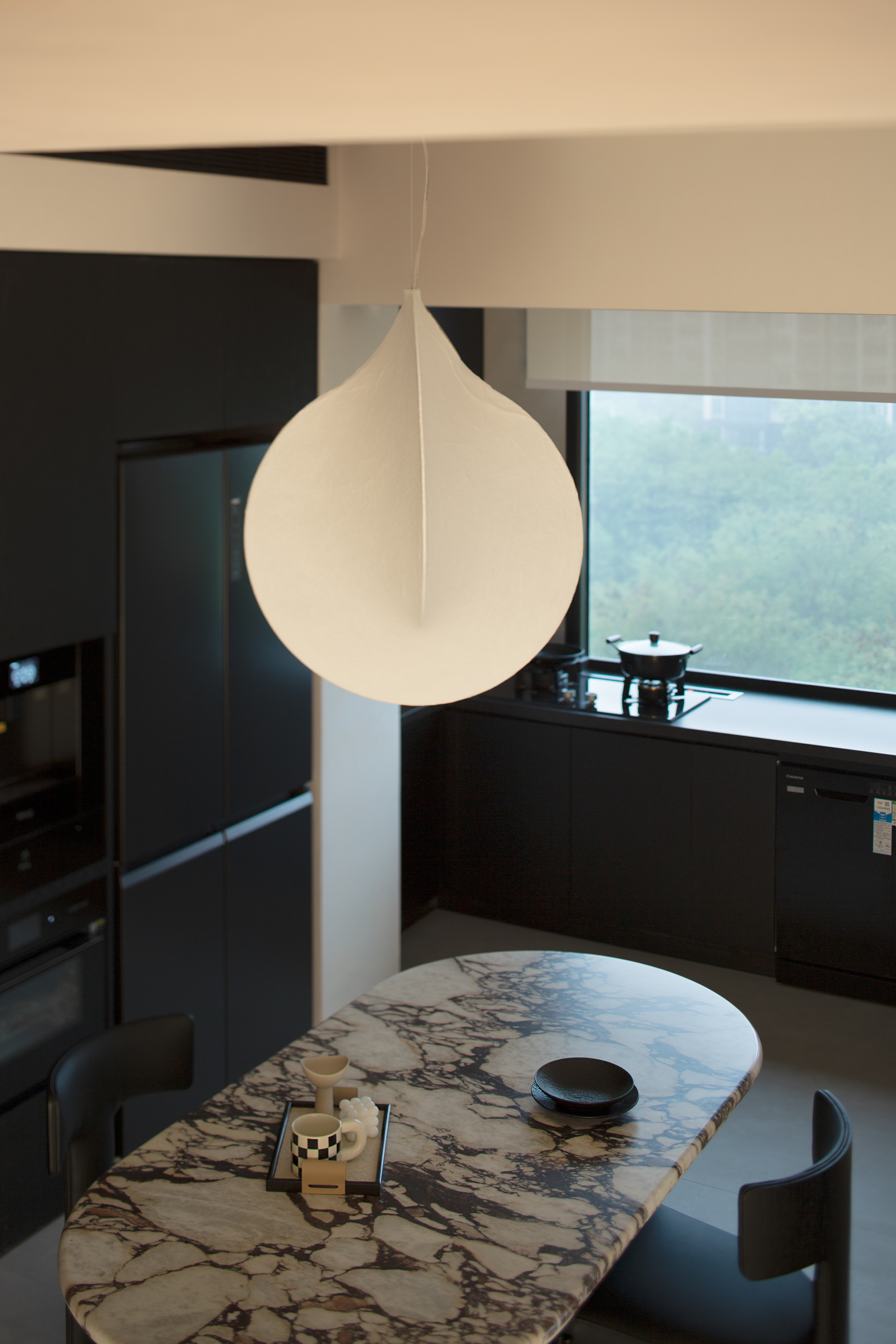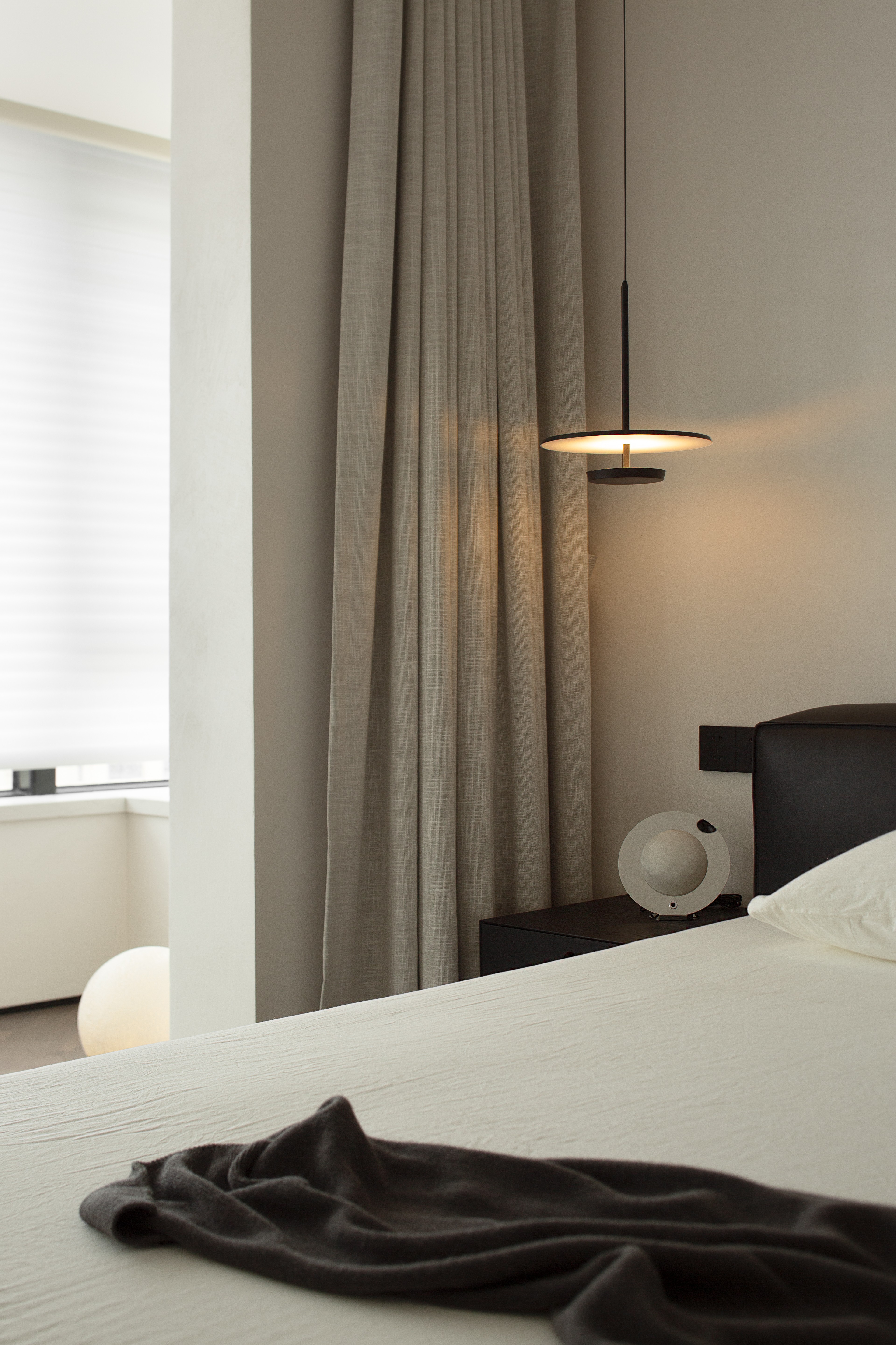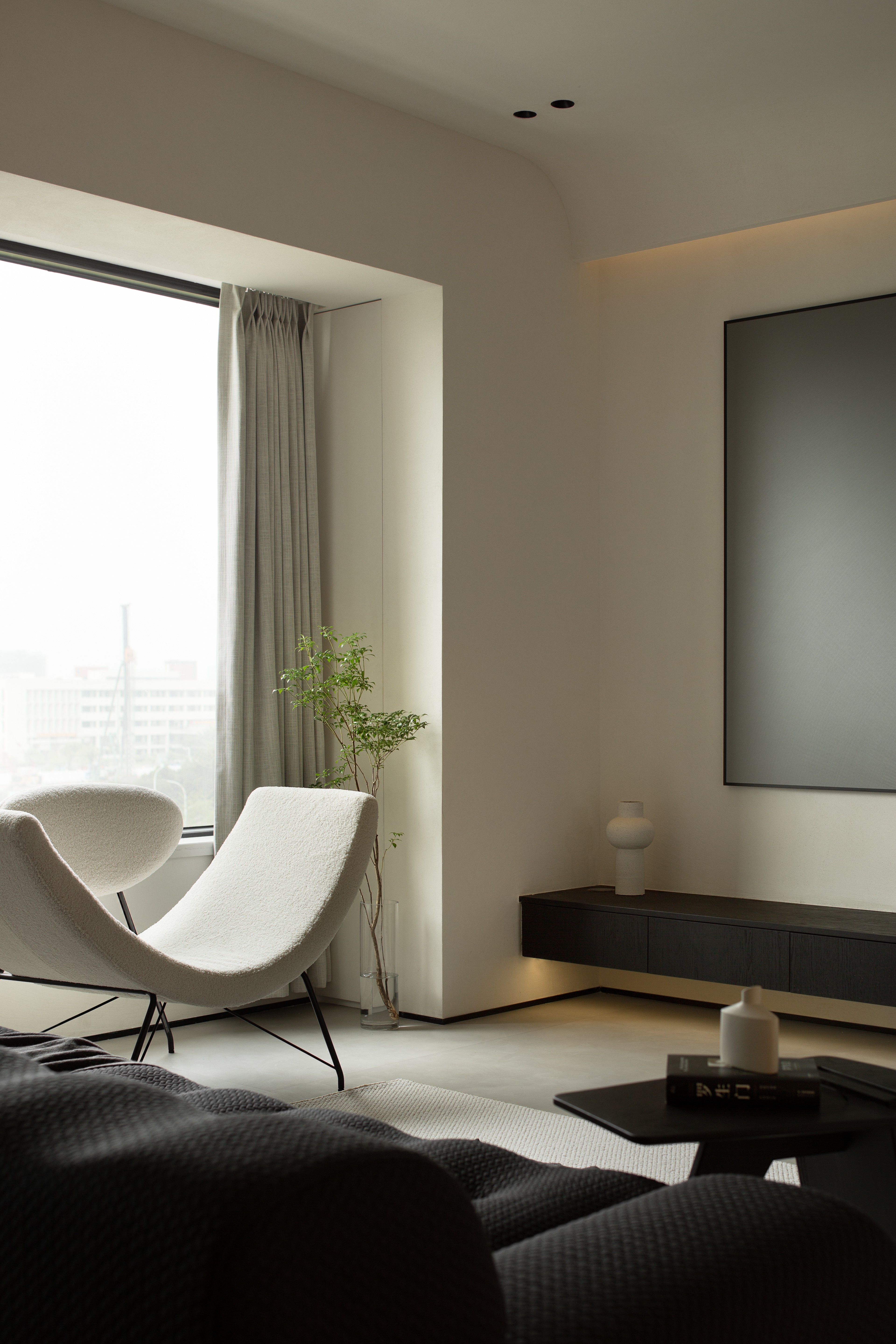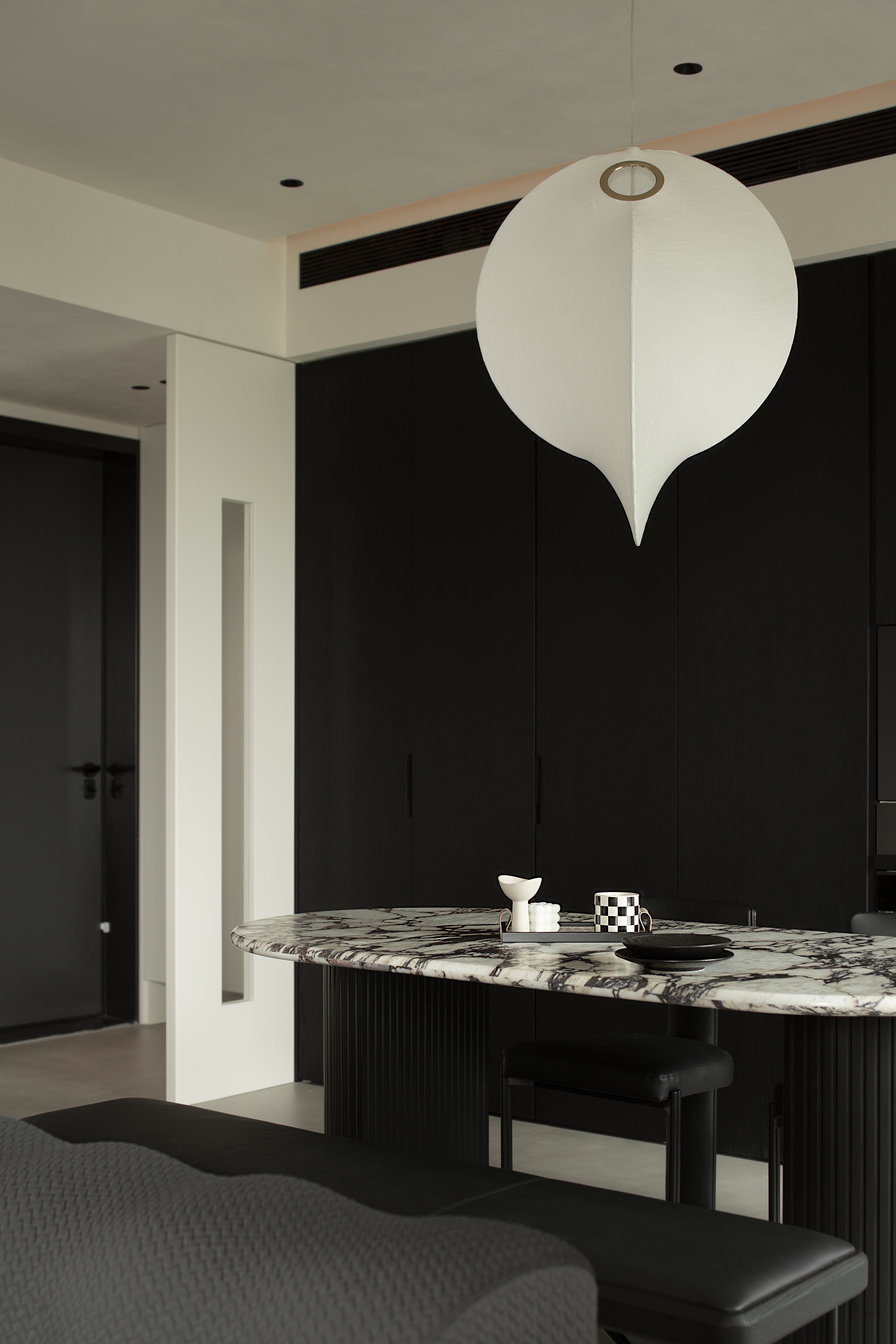 整体以黑白为主,但是其中家具饰品,灯具才是这个家的灵魂所在。黑色的橡木实木贴皮,让柜子,楼梯更显质感。墙顶面是微水泥的原浆色,带点暖白,我选择是比较粗糙的质感面。地面是比微水泥色深点的纯哑光岩板通铺。