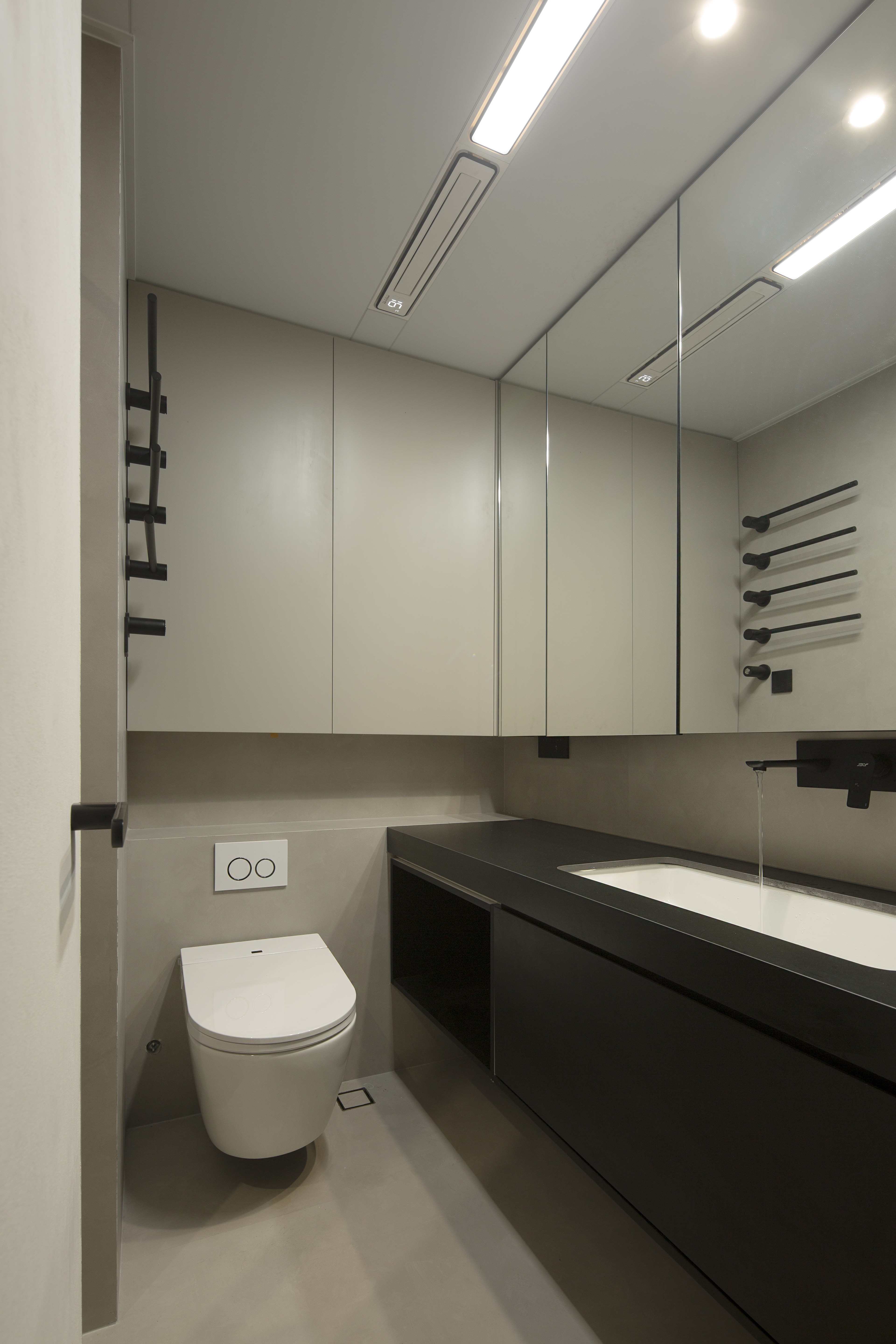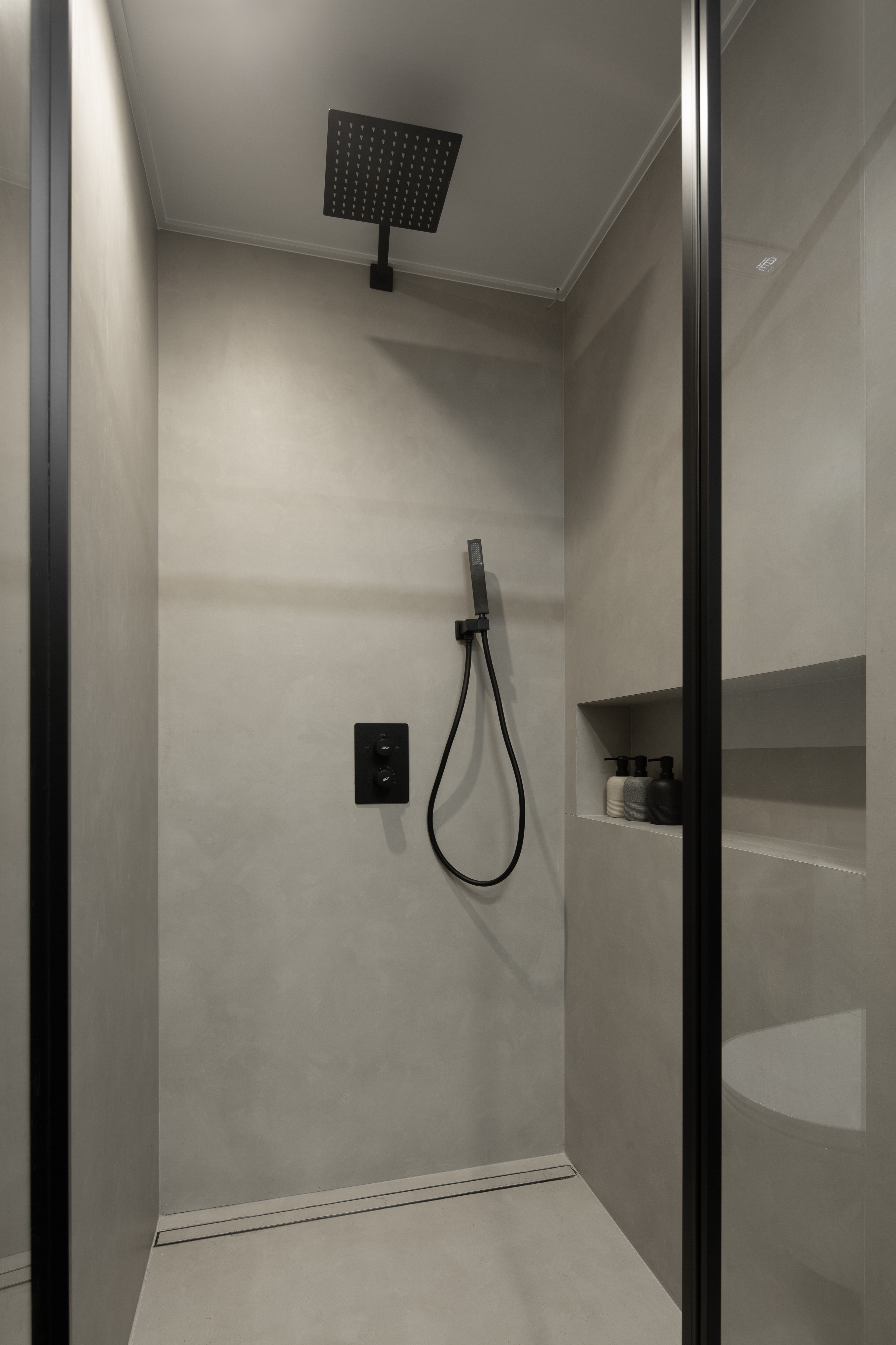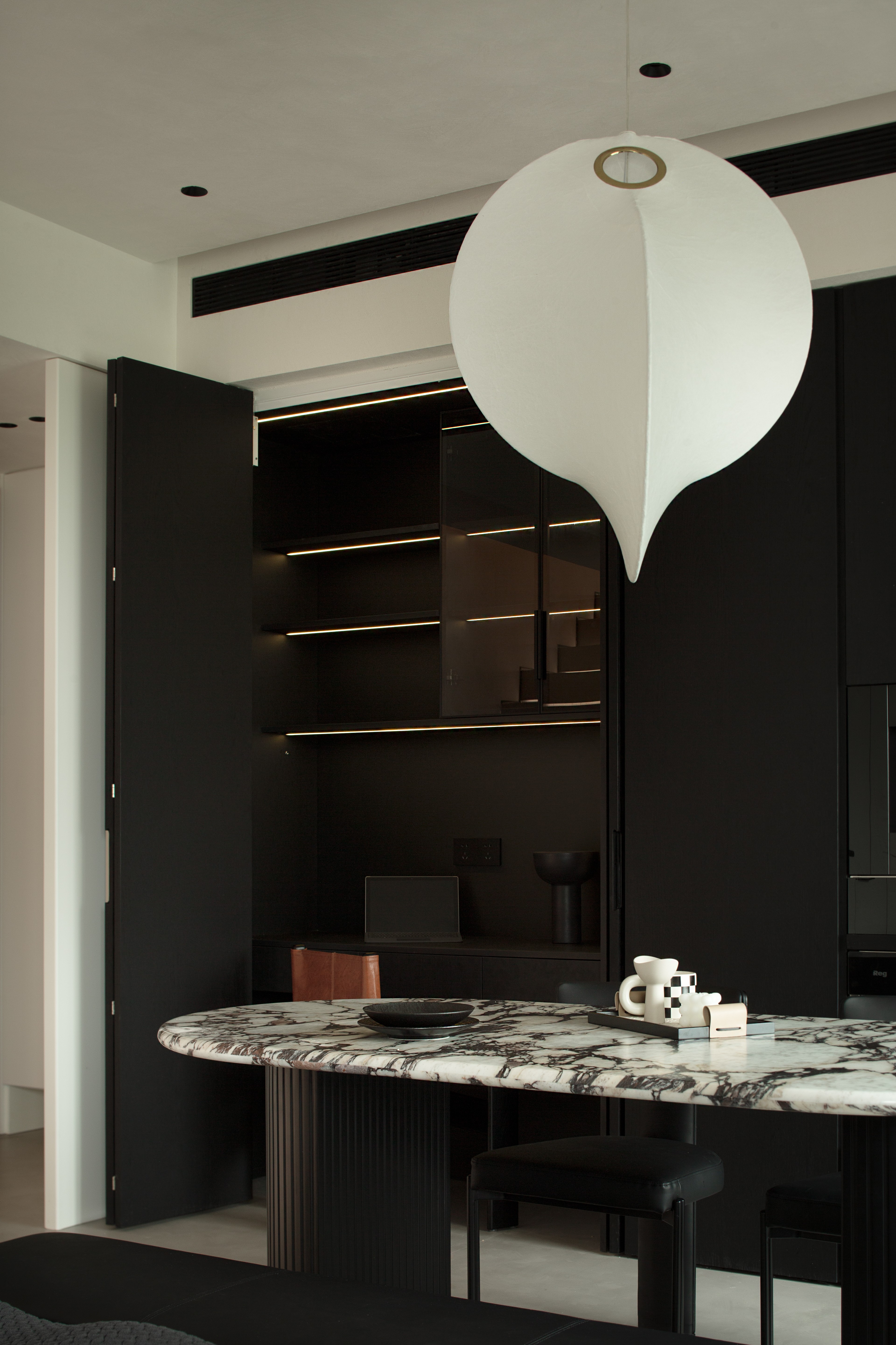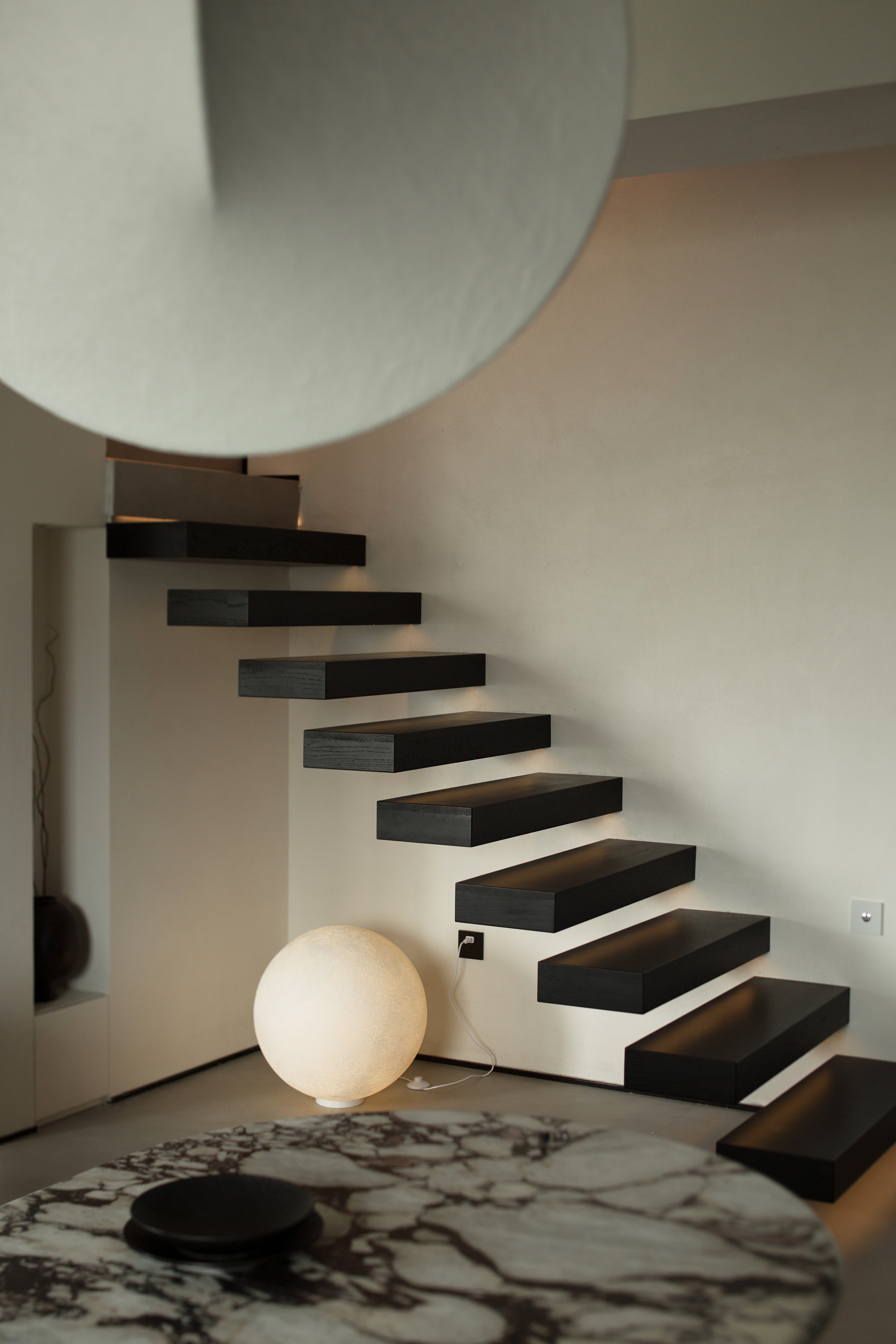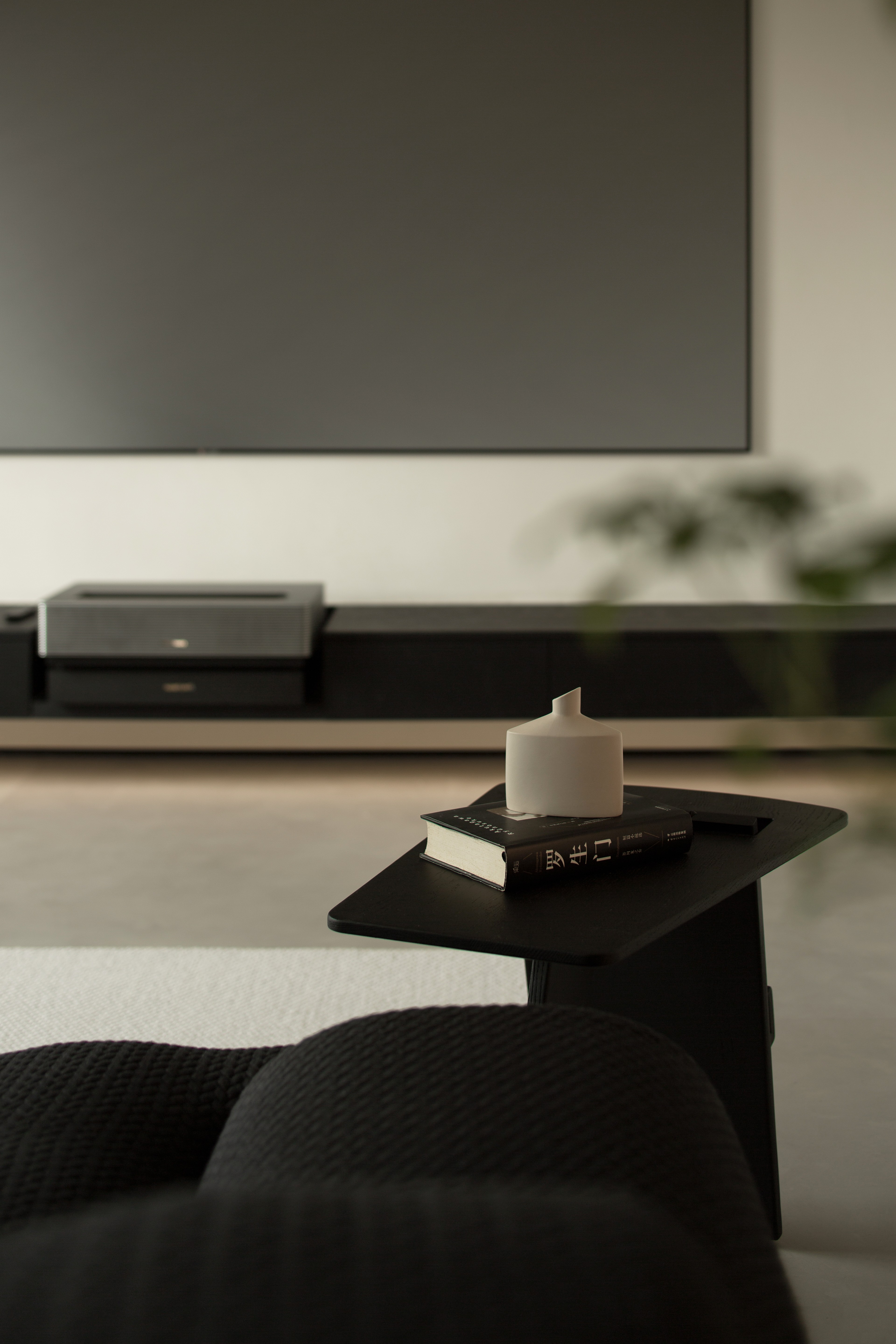 整体以黑白为主,但是其中家具饰品,灯具才是这个家的灵魂所在。黑色的橡木实木贴皮,让柜子,楼梯更显质感。墙顶面是微水泥的原浆色,带点暖白,我选择是比较粗糙的质感面。地面是比微水泥色深点的纯哑光岩板通铺。