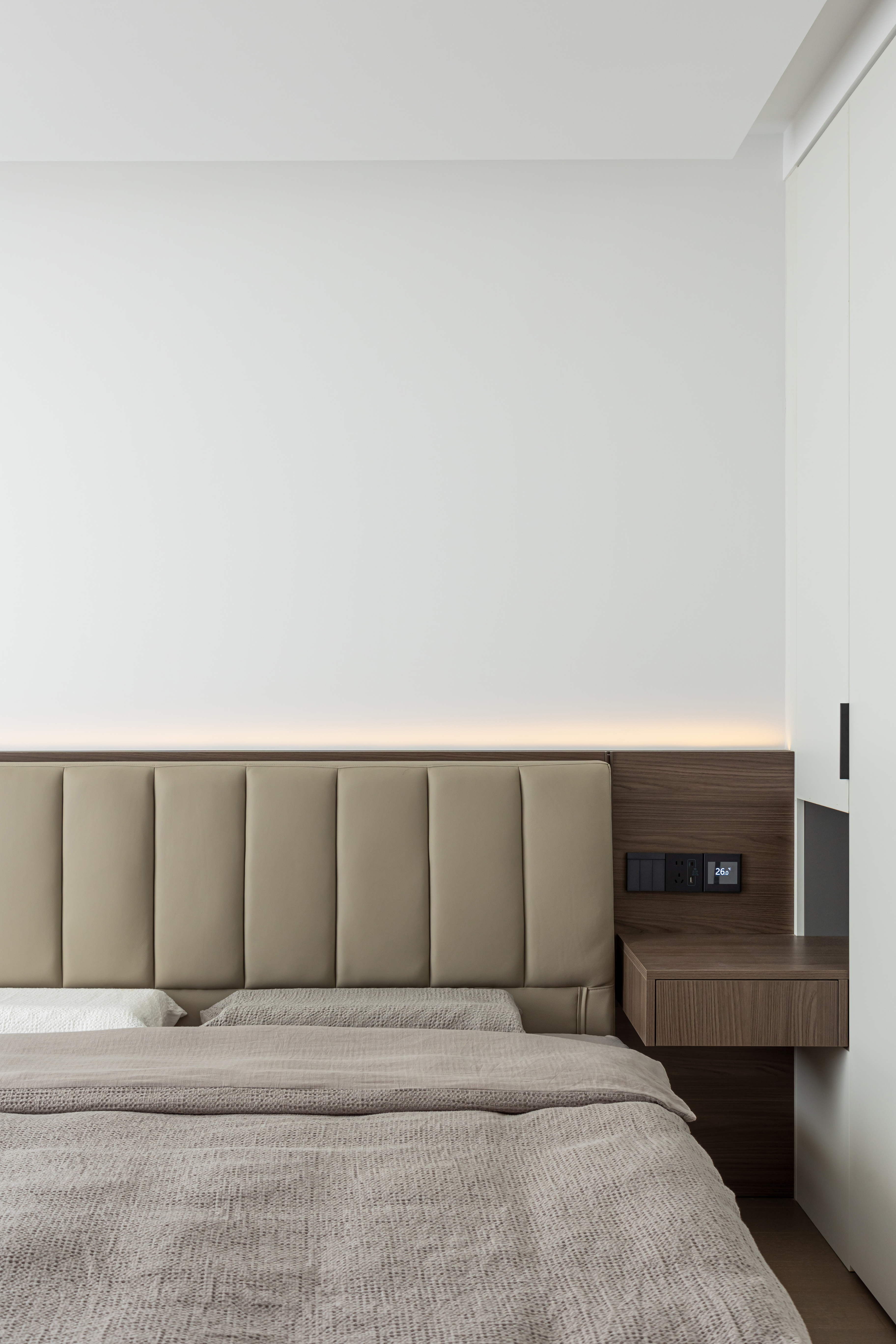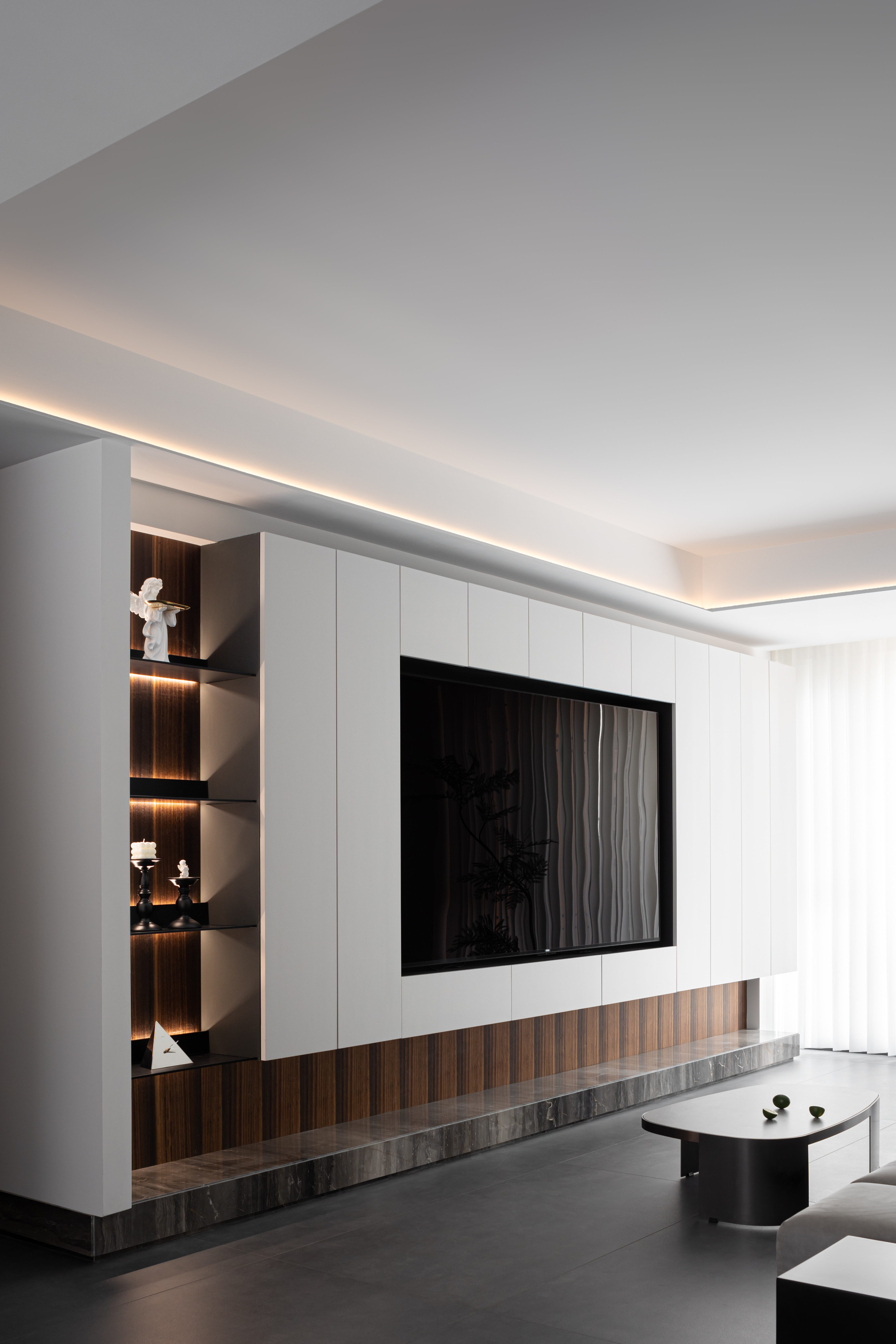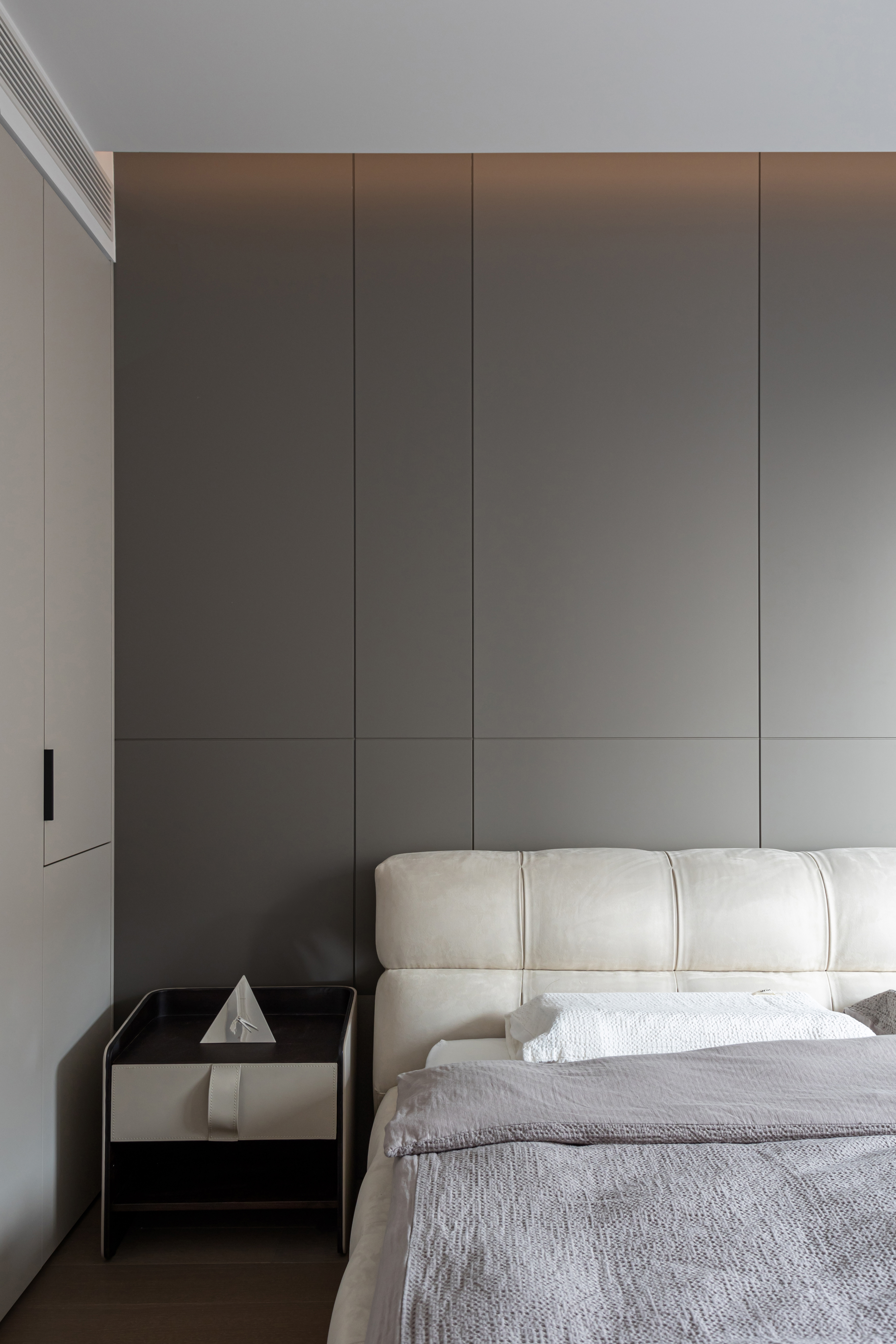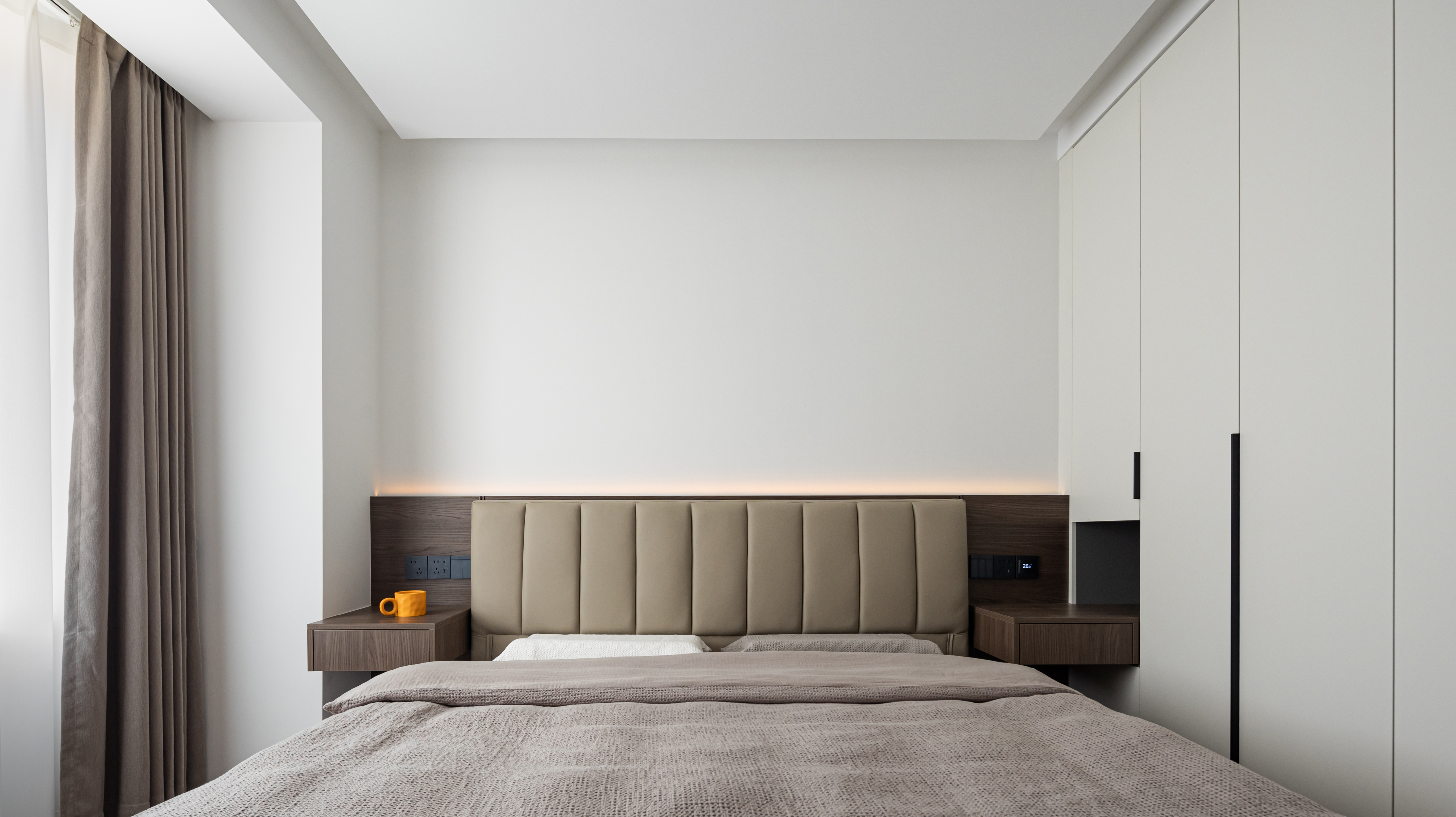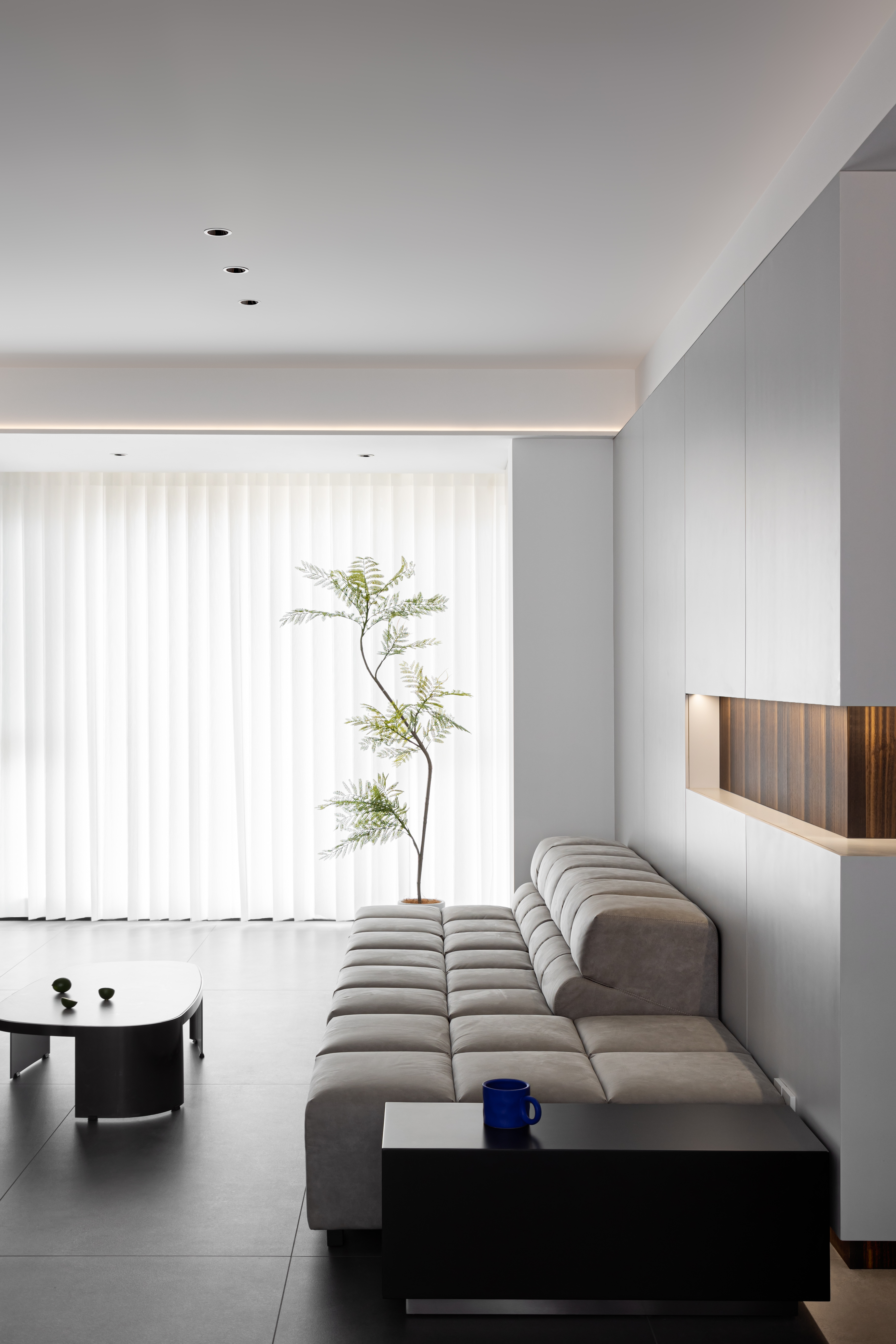 能深刻有力地满足人们心灵简练的美,都来自于其内在的复杂性。每一寸光影的投射,从神性到人性,在日常生活里激荡起生命的体验,这是空间给人的持久感染力之源。 空间氛围的营造即空间的艺术,从进门那一刻开启光的叙事之旅。明与暗,非常对立而统一,静谧感激发出空间想象,它能够用来表达富有哲理性的东西。它是减法的艺术,去除颜色干扰,表现出恒久与稳定。 白色的墙面,木色组合其中,沉静而温暖。希望给予更多却又拿捏着分寸,设计师运用颜色构建空间,划分区域,相互独立又彼此衬托。犹如黄渤海那条清晰的分界线,永恒的神秘与美妙。 沙发背景墙采用凹进墙面和凸出的置物设计,通过凹凸感来丰富视觉上的层次感。大面积白色墙体构建一个放空与留白的空间,简洁干净之余更有延申视觉层次的感觉,一切皆有可能不正是人世间最大的乐趣吗? 万物皆有裂痕,那是光照进来的地方,光赋予空间以生命和灵魂,循序渐进的自然光线令视线变得开朗。阳台没有隔断的分隔,空间极具层次,以窗为界便获得充足的光线,绿植点缀,阳光毫不吝啬地挥洒,设计拉近人、光、自然的关系,为空间营造艺术质感,在室内空间中沉浸光线,体验自然和空间逻辑之美。 荷兰画家伦勃朗善于用光,魔术般的处理画面的明暗关系,当光如一束集中线打在主要部分,原本黑暗中的一切便开始散发出魅力。朦胧、柔和中是丰富的细节,时间与阅历刻画在人的脸上,那种神秘的气息让人着迷。空间亦是如此。 光在这里拥有了多重的含义,它是空间的旋律,时而澎湃,时而轻柔;它是一种装饰,毫不费力就可填满空间;它是一种材质,在灰、白与木之间寻找到一种平衡。 设计师认为“好设计”应该是:简约和品质并重、功能性优先于形式感、装饰依功能而生。既要简单有序的整体结构,又要多样暧昧的空间细节。 食物与自然同样具有治愈能力,大抵是食物是人与自然紧密联系的纽带,香气构筑成了家里最独特的气味,从视觉到嗅觉到触觉,美食调动起人最丰富的感官,然后激发起最愉悦的情绪。 设计师对细节的关注、独到的审美视角以及熟练的材料运用,打造出具有多重功能的整体厨房空间,并成为建筑结构的重要组成部分。它是提供美食的完美场所,与餐厅之间的关系密不可分,是将家人聚在一起的紧密枢纽。 打造幸福感卧室的要点是什么?越来越趋向于中性色调与极简线条的转变。设计师大面积用温润的咖色做背景,以沉稳的黑色为点缀,再搭配温润木质地板,为业主创造出心中最舒适的起居环境,低调中尽显优雅气质。 卧室没有纷乱的杂物,遵循着极简法则,配合空间细节使空间感受更舒服放松。若风雪夜归人,归的是这样一个家,又怎会惧怕这世间风起云涌,惊涛骇浪! 极简的生活,不是一味的断舍离,而是消除不必要的东西,为生活留出空间与时间。把空间聚焦到光线、自然、尺度的表达上,探寻人对空间最真实的需求,在所需之处感受幸福,幸福源自内心,源自充满意义的生活。
