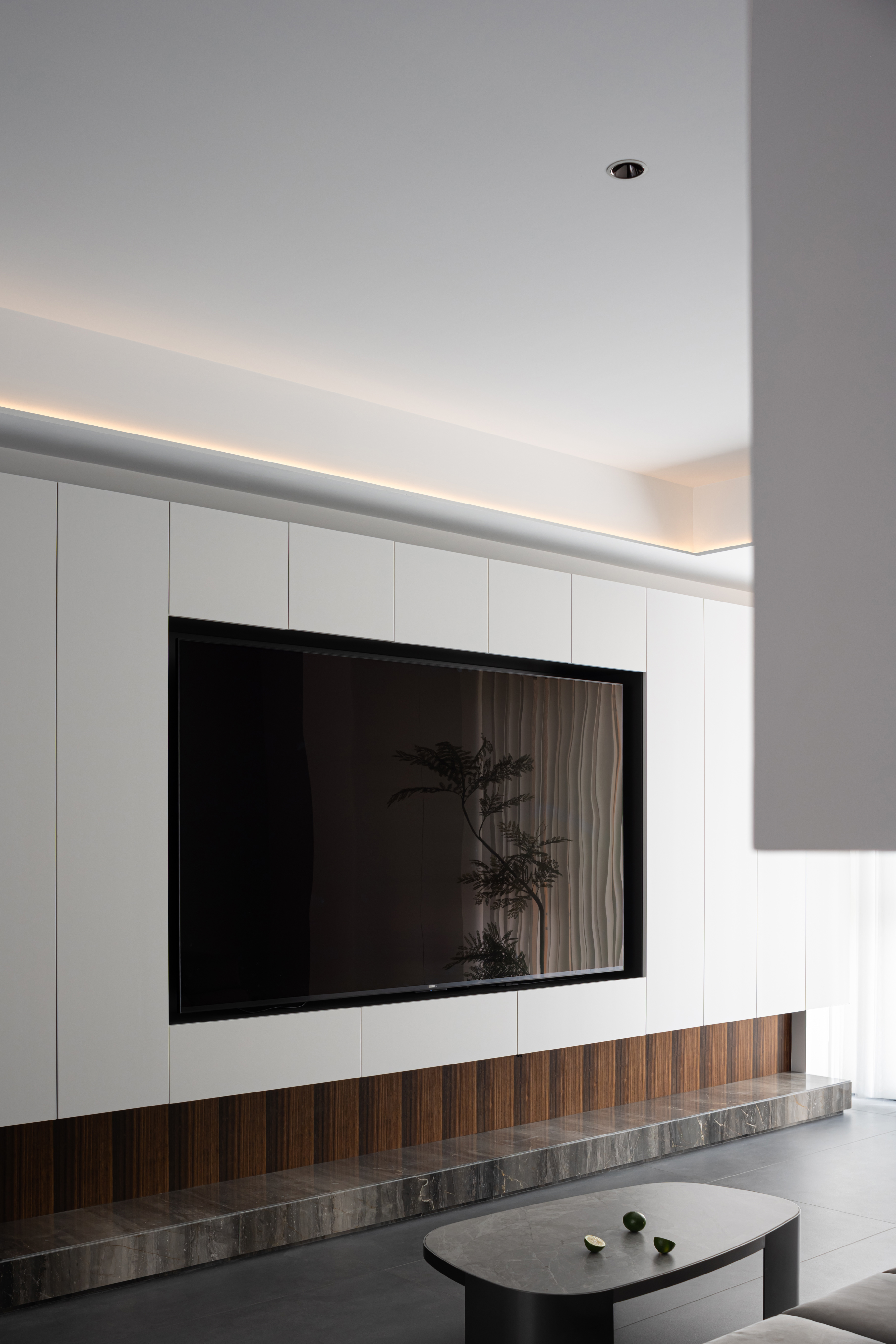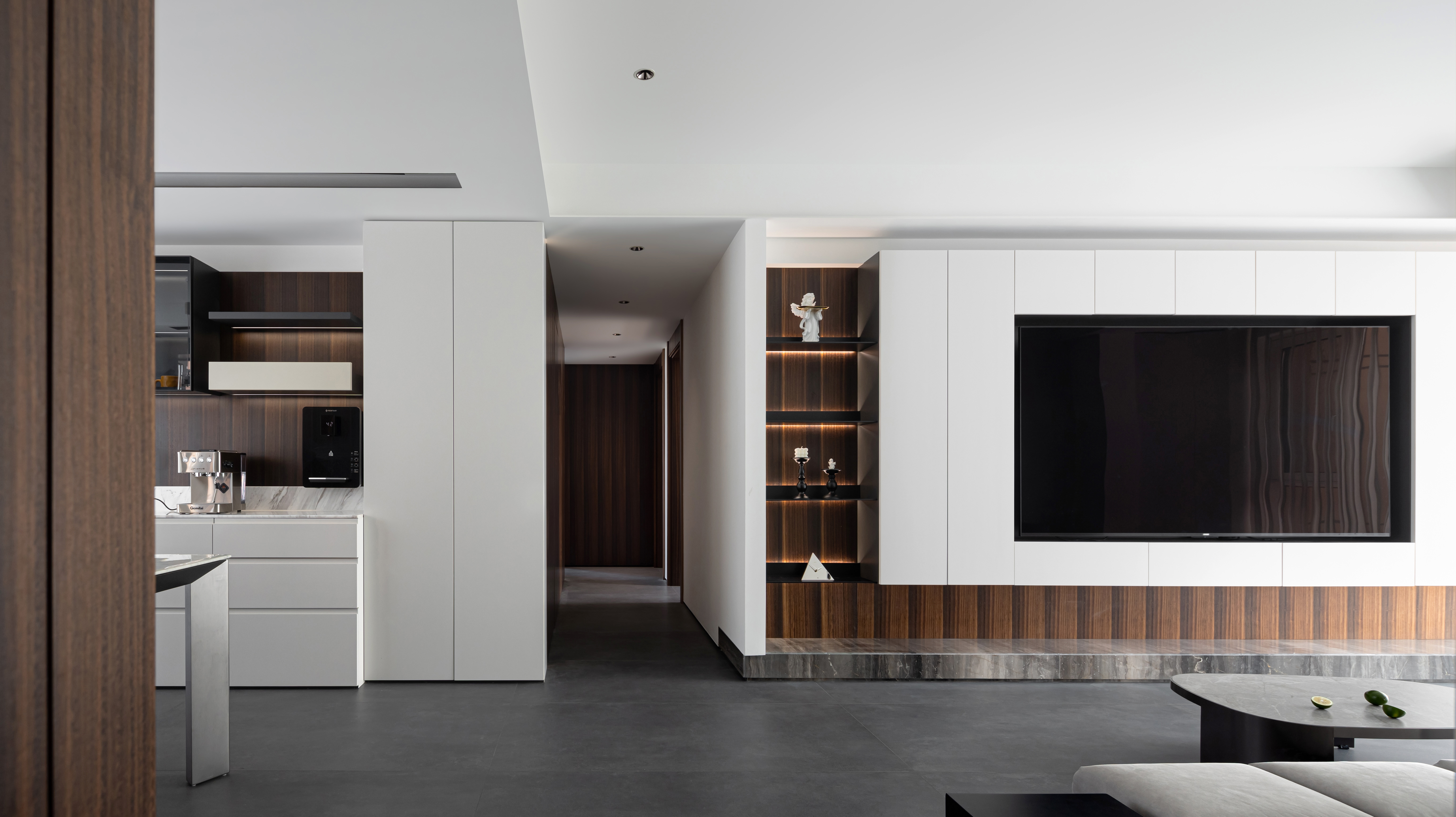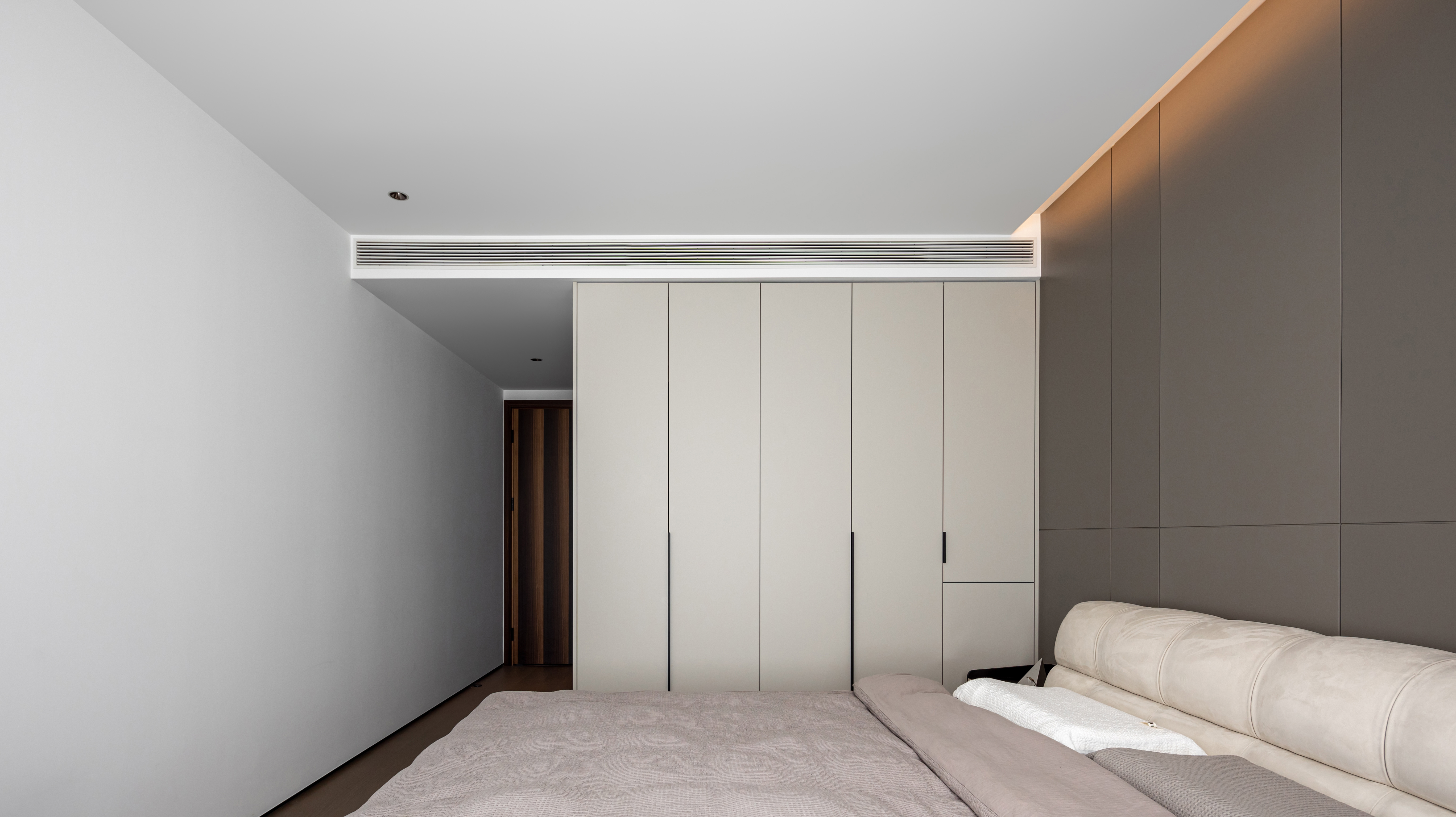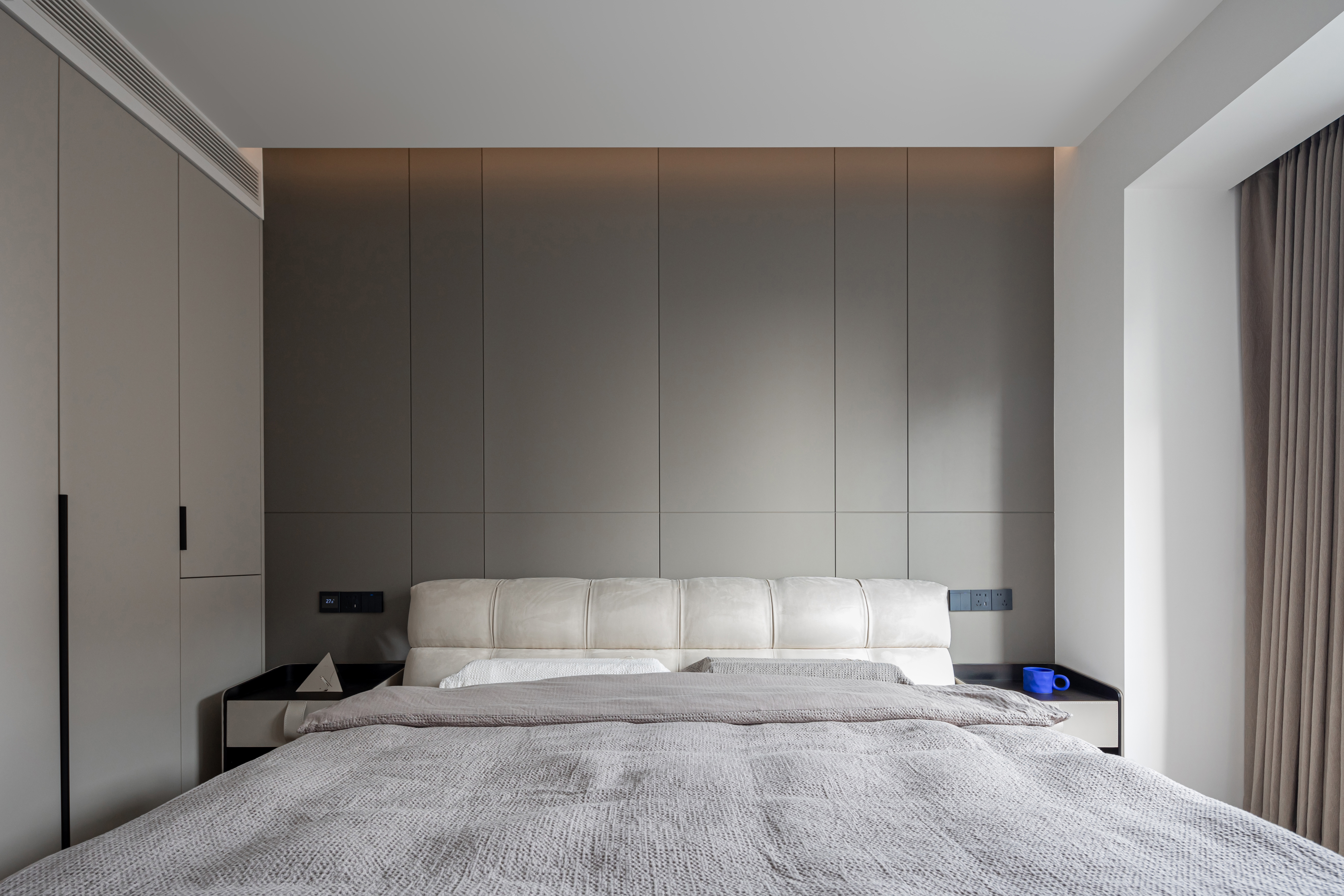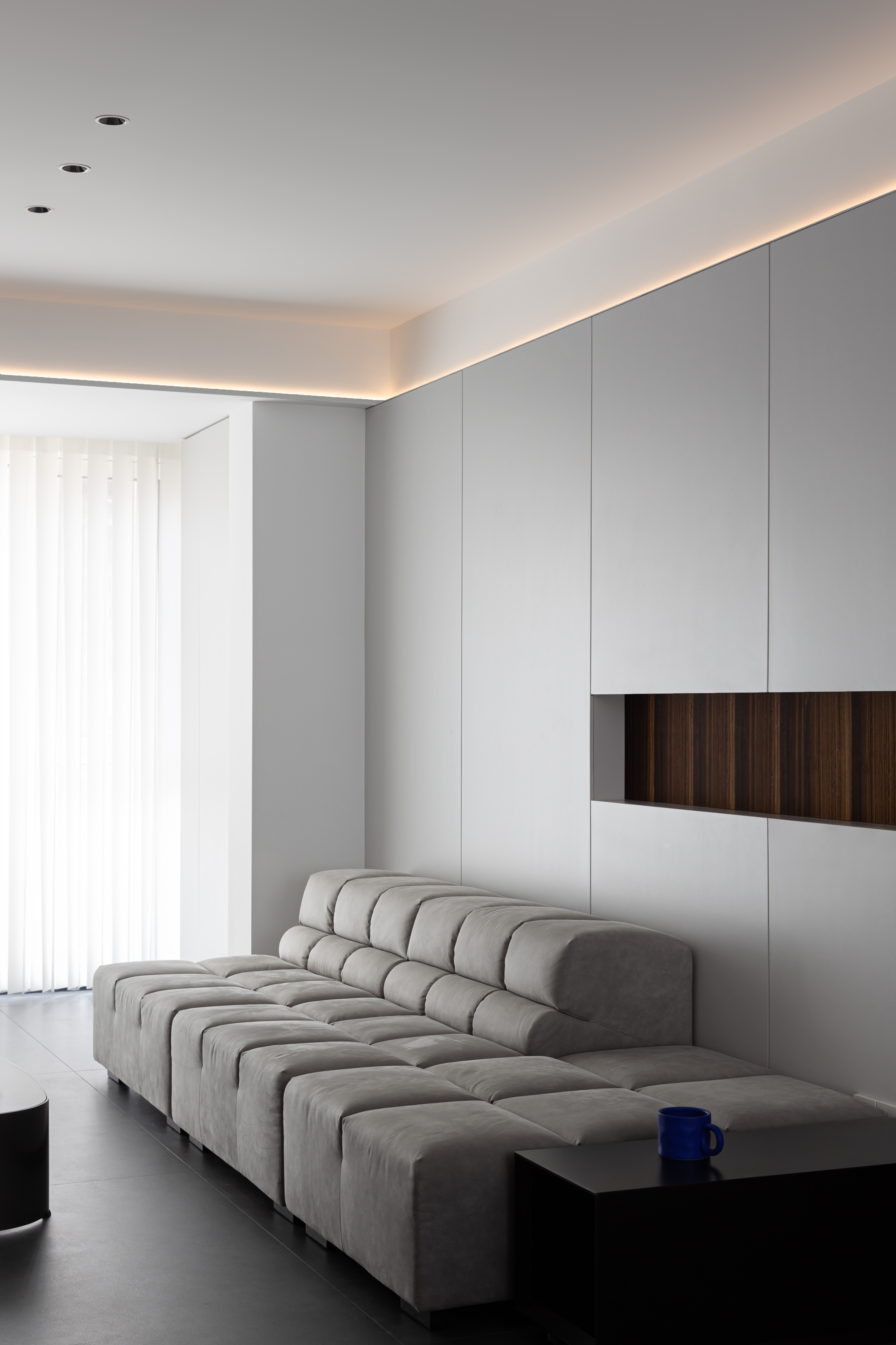 能深刻有力地满足人们心灵简练的美,都来自于其内在的复杂性。每一寸光影的投射,从神性到人性,在日常生活里激荡起生命的体验,这是空间给人的持久感染力之源。 空间氛围的营造即空间的艺术,从进门那一刻开启光的叙事之旅。明与暗,非常对立而统一,静谧感激发出空间想象,它能够用来表达富有哲理性的东西。它是减法的艺术,去除颜色干扰,表现出恒久与稳定。 白色的墙面,木色组合其中,沉静而温暖。希望给予更多却又拿捏着分寸,设计师运用颜色构建空间,划分区域,相互独立又彼此衬托。犹如黄渤海那条清晰的分界线,永恒的神秘与美妙。 沙发背景墙采用凹进墙面和凸出的置物设计,通过凹凸感来丰富视觉上的层次感。大面积白色墙体构建一个放空与留白的空间,简洁干净之余更有延申视觉层次的感觉,一切皆有可能不正是人世间最大的乐趣吗? 万物皆有裂痕,那是光照进来的地方,光赋予空间以生命和灵魂,循序渐进的自然光线令视线变得开朗。阳台没有隔断的分隔,空间极具层次,以窗为界便获得充足的光线,绿植点缀,阳光毫不吝啬地挥洒,设计拉近人、光、自然的关系,为空间营造艺术质感,在室内空间中沉浸光线,体验自然和空间逻辑之美。 荷兰画家伦勃朗善于用光,魔术般的处理画面的明暗关系,当光如一束集中线打在主要部分,原本黑暗中的一切便开始散发出魅力。朦胧、柔和中是丰富的细节,时间与阅历刻画在人的脸上,那种神秘的气息让人着迷。空间亦是如此。 光在这里拥有了多重的含义,它是空间的旋律,时而澎湃,时而轻柔;它是一种装饰,毫不费力就可填满空间;它是一种材质,在灰、白与木之间寻找到一种平衡。 设计师认为“好设计”应该是:简约和品质并重、功能性优先于形式感、装饰依功能而生。既要简单有序的整体结构,又要多样暧昧的空间细节。 食物与自然同样具有治愈能力,大抵是食物是人与自然紧密联系的纽带,香气构筑成了家里最独特的气味,从视觉到嗅觉到触觉,美食调动起人最丰富的感官,然后激发起最愉悦的情绪。 设计师对细节的关注、独到的审美视角以及熟练的材料运用,打造出具有多重功能的整体厨房空间,并成为建筑结构的重要组成部分。它是提供美食的完美场所,与餐厅之间的关系密不可分,是将家人聚在一起的紧密枢纽。 打造幸福感卧室的要点是什么?越来越趋向于中性色调与极简线条的转变。设计师大面积用温润的咖色做背景,以沉稳的黑色为点缀,再搭配温润木质地板,为业主创造出心中最舒适的起居环境,低调中尽显优雅气质。 卧室没有纷乱的杂物,遵循着极简法则,配合空间细节使空间感受更舒服放松。若风雪夜归人,归的是这样一个家,又怎会惧怕这世间风起云涌,惊涛骇浪! 极简的生活,不是一味的断舍离,而是消除不必要的东西,为生活留出空间与时间。把空间聚焦到光线、自然、尺度的表达上,探寻人对空间最真实的需求,在所需之处感受幸福,幸福源自内心,源自充满意义的生活。
