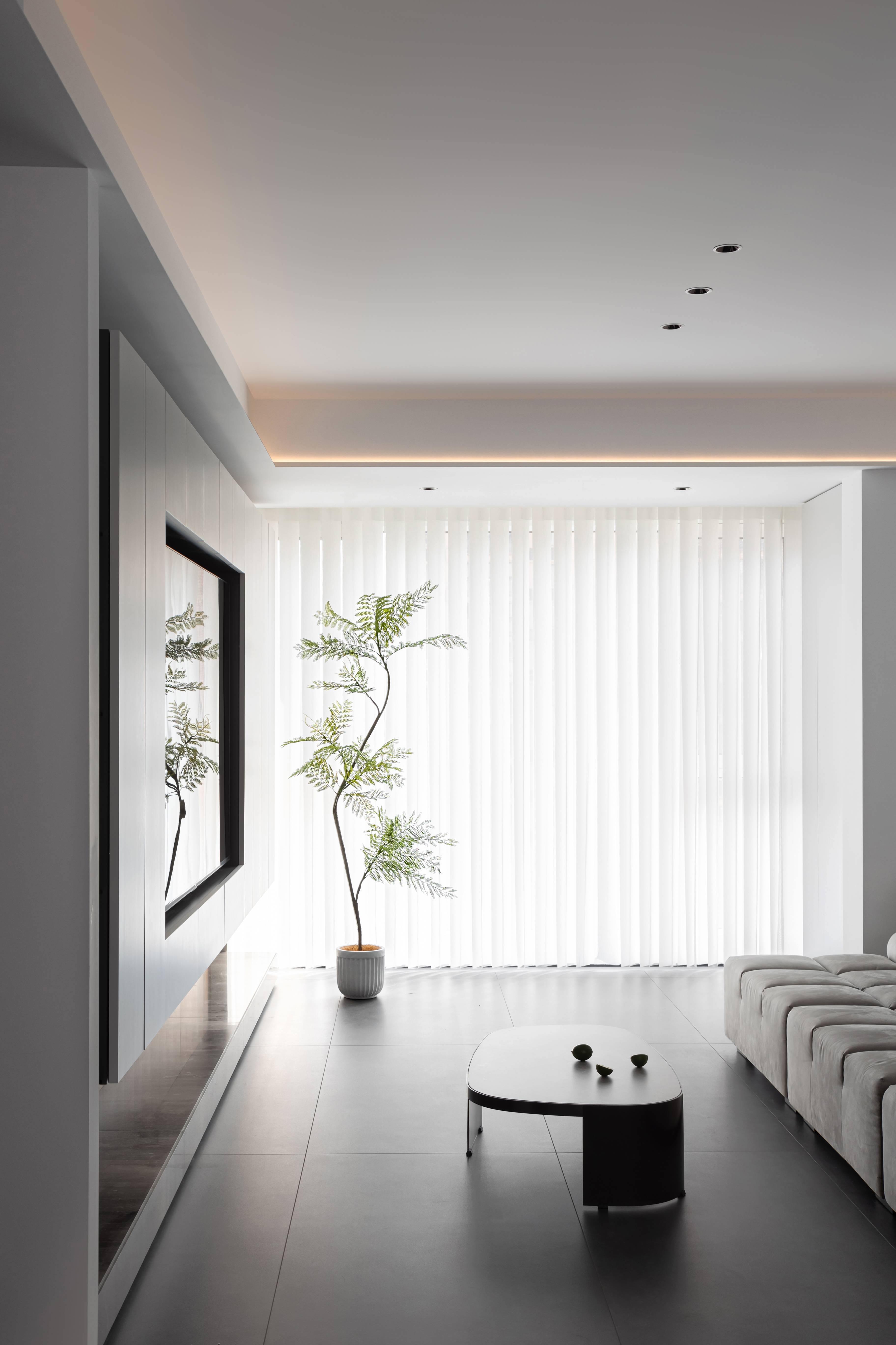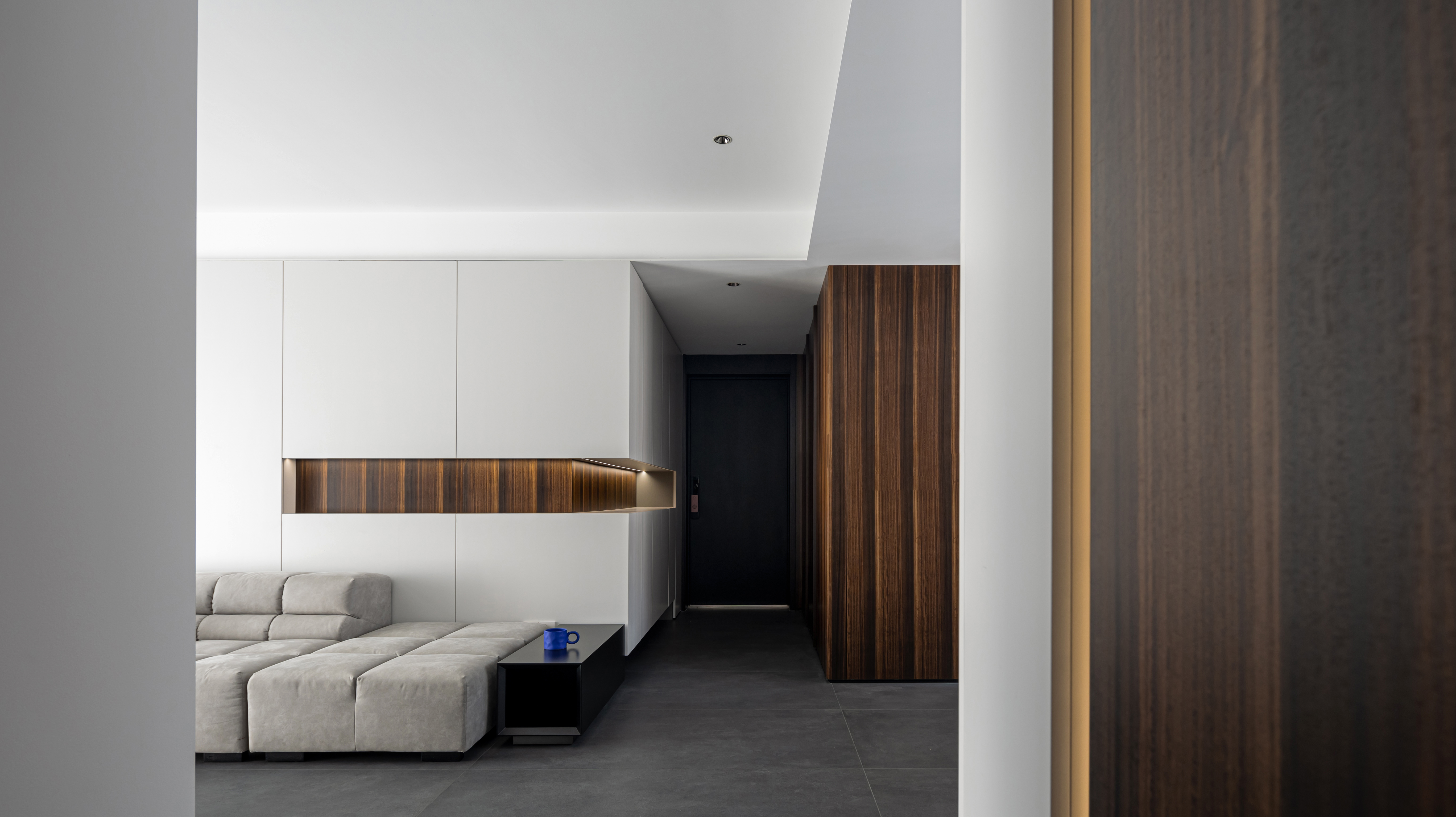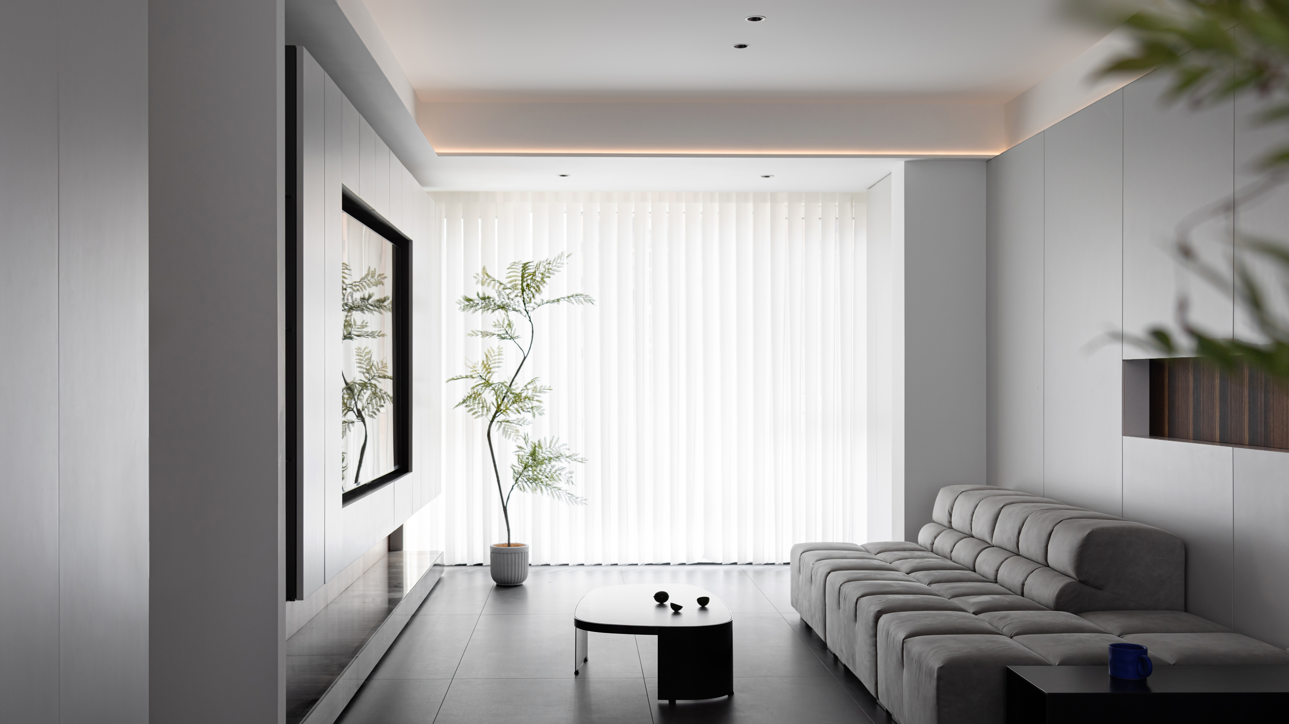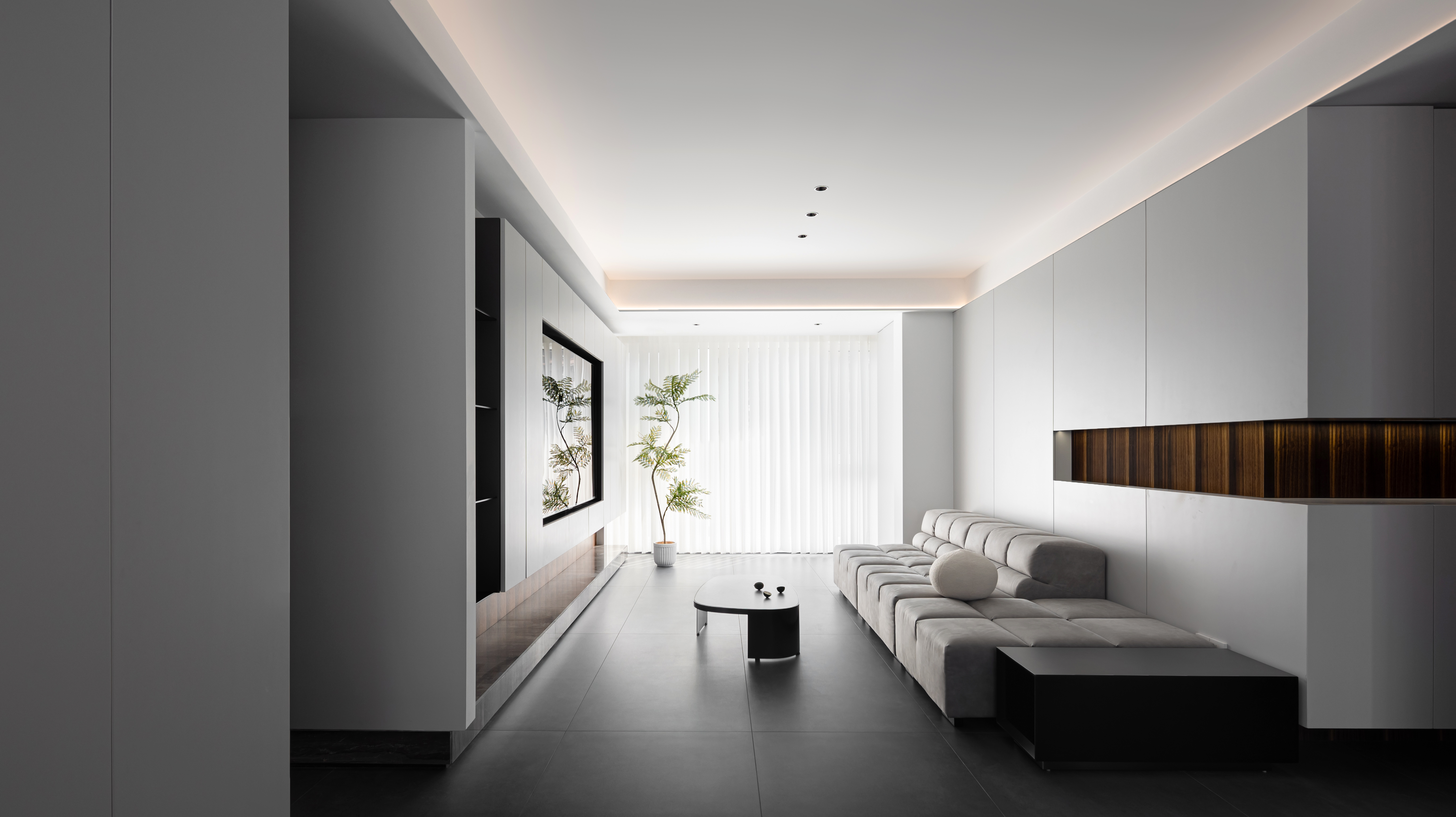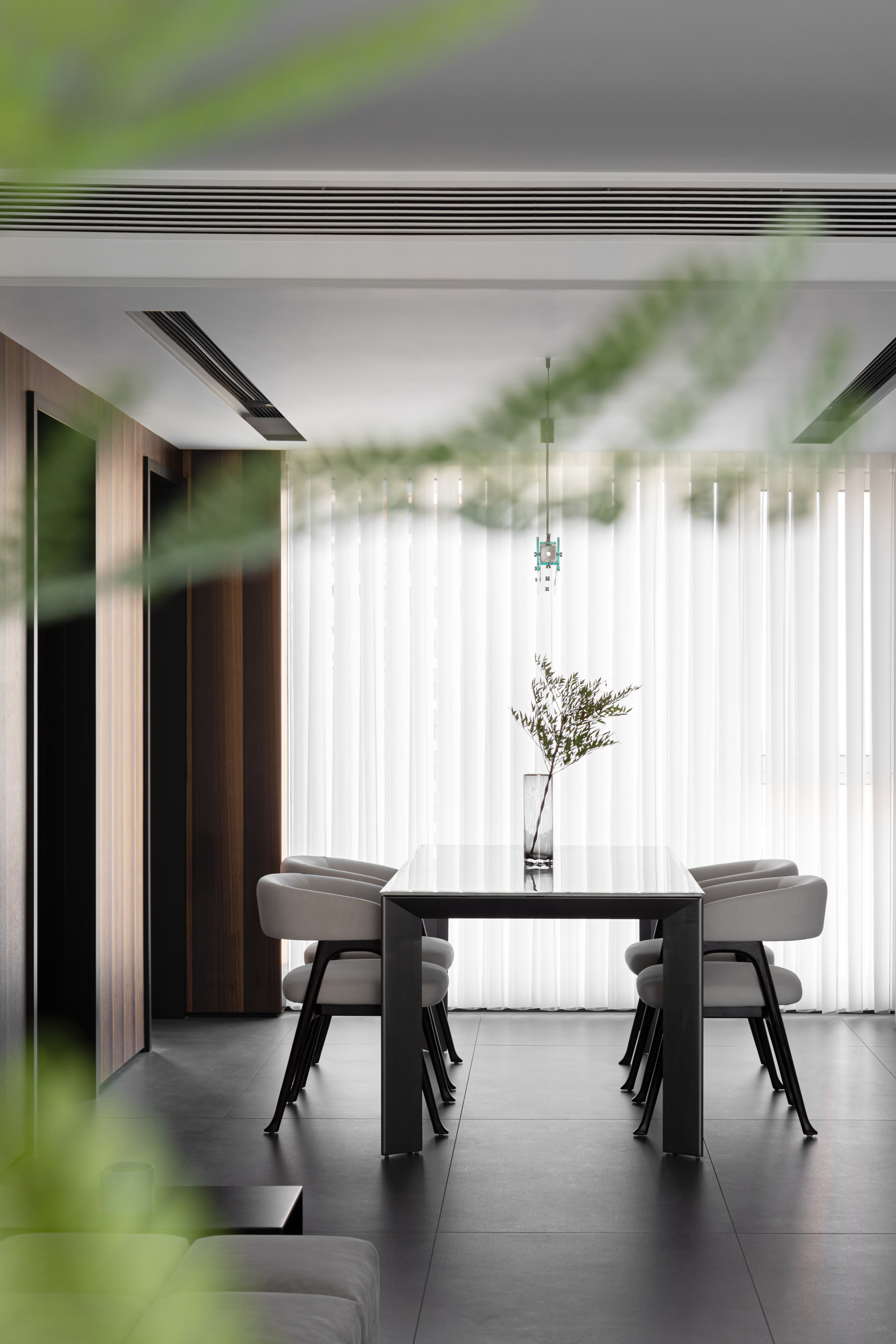 能深刻有力地满足人们心灵简练的美,都来自于其内在的复杂性。每一寸光影的投射,从神性到人性,在日常生活里激荡起生命的体验,这是空间给人的持久感染力之源。 空间氛围的营造即空间的艺术,从进门那一刻开启光的叙事之旅。明与暗,非常对立而统一,静谧感激发出空间想象,它能够用来表达富有哲理性的东西。它是减法的艺术,去除颜色干扰,表现出恒久与稳定。 白色的墙面,木色组合其中,沉静而温暖。希望给予更多却又拿捏着分寸,设计师运用颜色构建空间,划分区域,相互独立又彼此衬托。犹如黄渤海那条清晰的分界线,永恒的神秘与美妙。 沙发背景墙采用凹进墙面和凸出的置物设计,通过凹凸感来丰富视觉上的层次感。大面积白色墙体构建一个放空与留白的空间,简洁干净之余更有延申视觉层次的感觉,一切皆有可能不正是人世间最大的乐趣吗? 万物皆有裂痕,那是光照进来的地方,光赋予空间以生命和灵魂,循序渐进的自然光线令视线变得开朗。阳台没有隔断的分隔,空间极具层次,以窗为界便获得充足的光线,绿植点缀,阳光毫不吝啬地挥洒,设计拉近人、光、自然的关系,为空间营造艺术质感,在室内空间中沉浸光线,体验自然和空间逻辑之美。 荷兰画家伦勃朗善于用光,魔术般的处理画面的明暗关系,当光如一束集中线打在主要部分,原本黑暗中的一切便开始散发出魅力。朦胧、柔和中是丰富的细节,时间与阅历刻画在人的脸上,那种神秘的气息让人着迷。空间亦是如此。 光在这里拥有了多重的含义,它是空间的旋律,时而澎湃,时而轻柔;它是一种装饰,毫不费力就可填满空间;它是一种材质,在灰、白与木之间寻找到一种平衡。 设计师认为“好设计”应该是:简约和品质并重、功能性优先于形式感、装饰依功能而生。既要简单有序的整体结构,又要多样暧昧的空间细节。 食物与自然同样具有治愈能力,大抵是食物是人与自然紧密联系的纽带,香气构筑成了家里最独特的气味,从视觉到嗅觉到触觉,美食调动起人最丰富的感官,然后激发起最愉悦的情绪。 设计师对细节的关注、独到的审美视角以及熟练的材料运用,打造出具有多重功能的整体厨房空间,并成为建筑结构的重要组成部分。它是提供美食的完美场所,与餐厅之间的关系密不可分,是将家人聚在一起的紧密枢纽。 打造幸福感卧室的要点是什么?越来越趋向于中性色调与极简线条的转变。设计师大面积用温润的咖色做背景,以沉稳的黑色为点缀,再搭配温润木质地板,为业主创造出心中最舒适的起居环境,低调中尽显优雅气质。 卧室没有纷乱的杂物,遵循着极简法则,配合空间细节使空间感受更舒服放松。若风雪夜归人,归的是这样一个家,又怎会惧怕这世间风起云涌,惊涛骇浪! 极简的生活,不是一味的断舍离,而是消除不必要的东西,为生活留出空间与时间。把空间聚焦到光线、自然、尺度的表达上,探寻人对空间最真实的需求,在所需之处感受幸福,幸福源自内心,源自充满意义的生活。