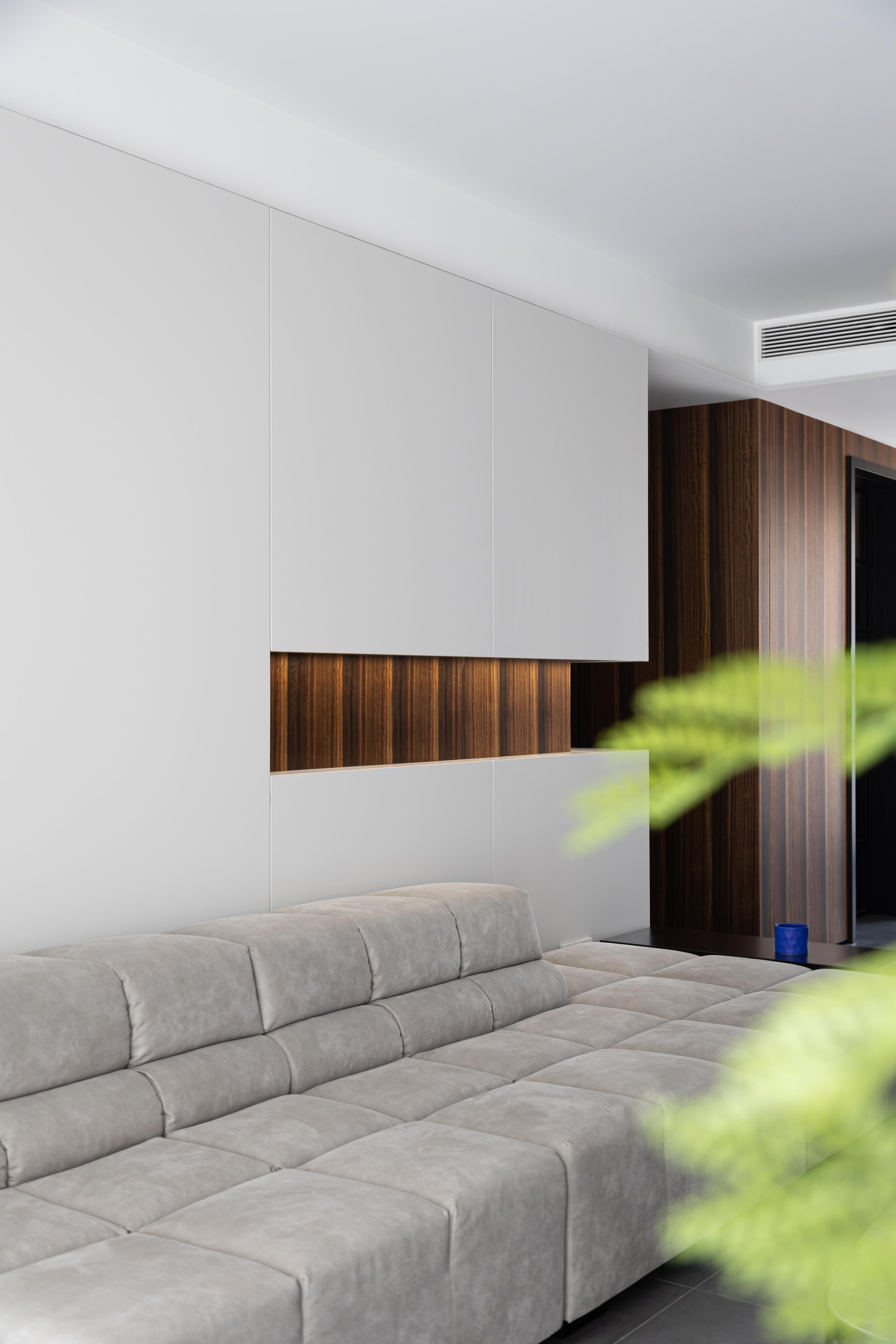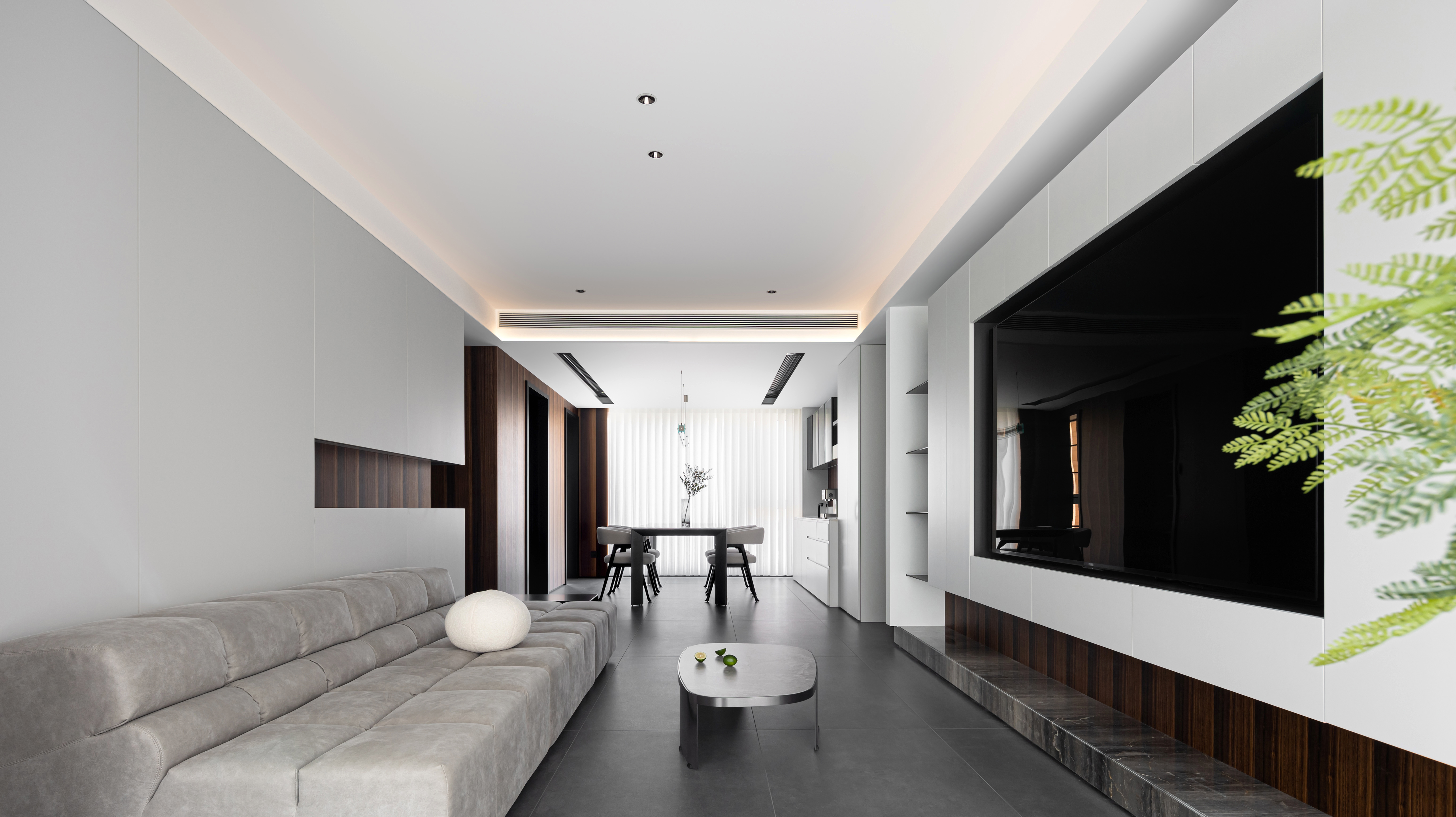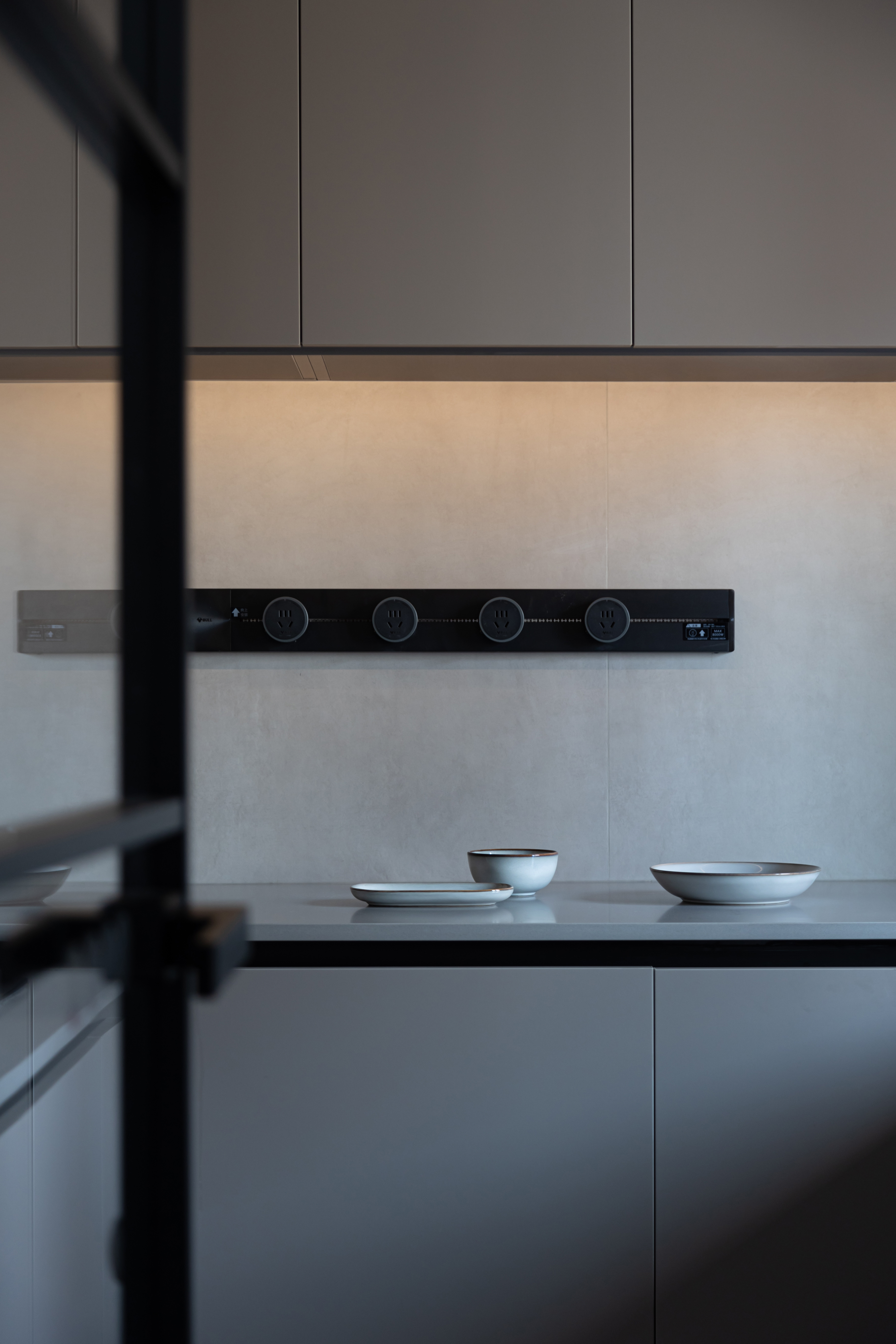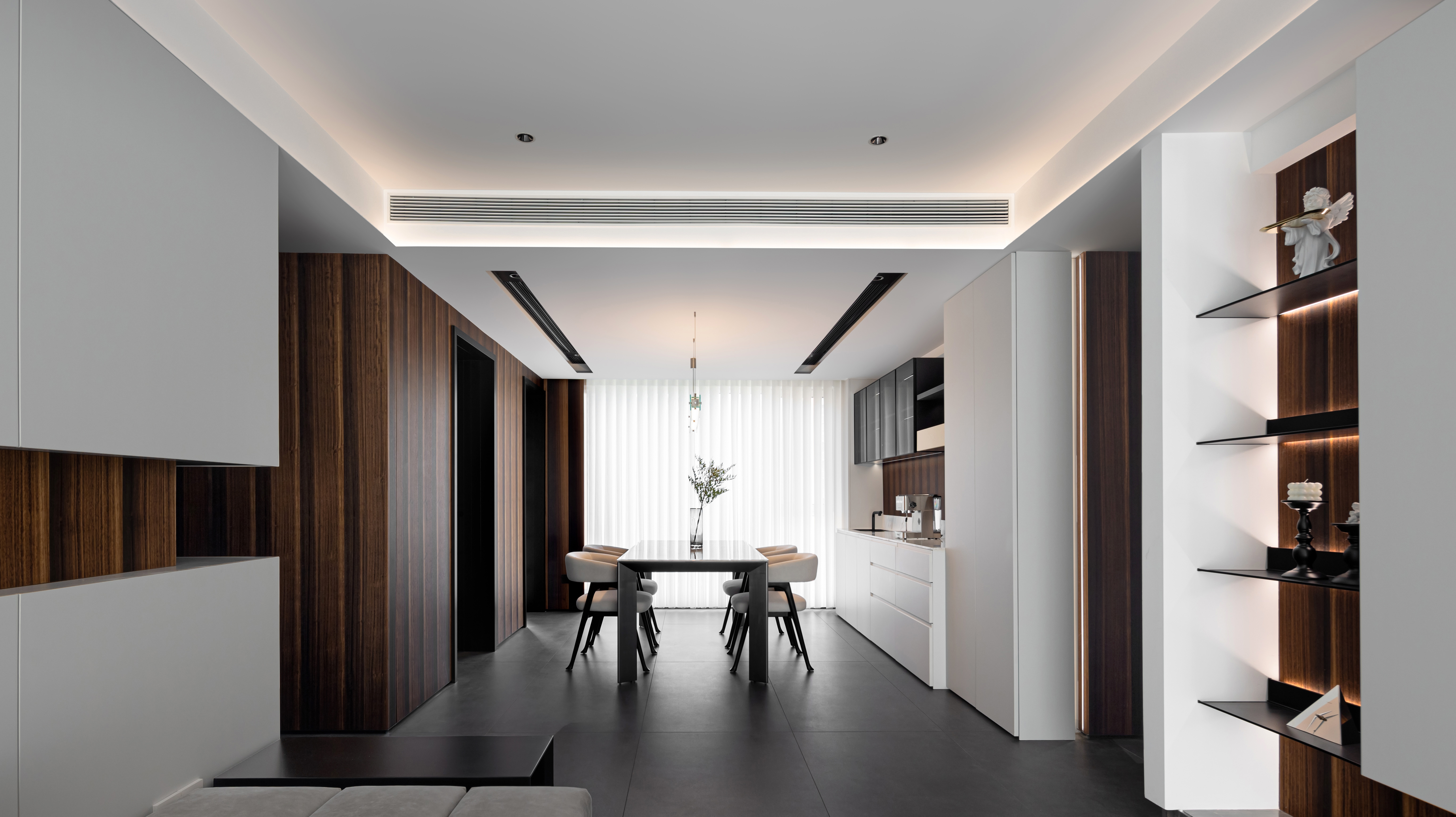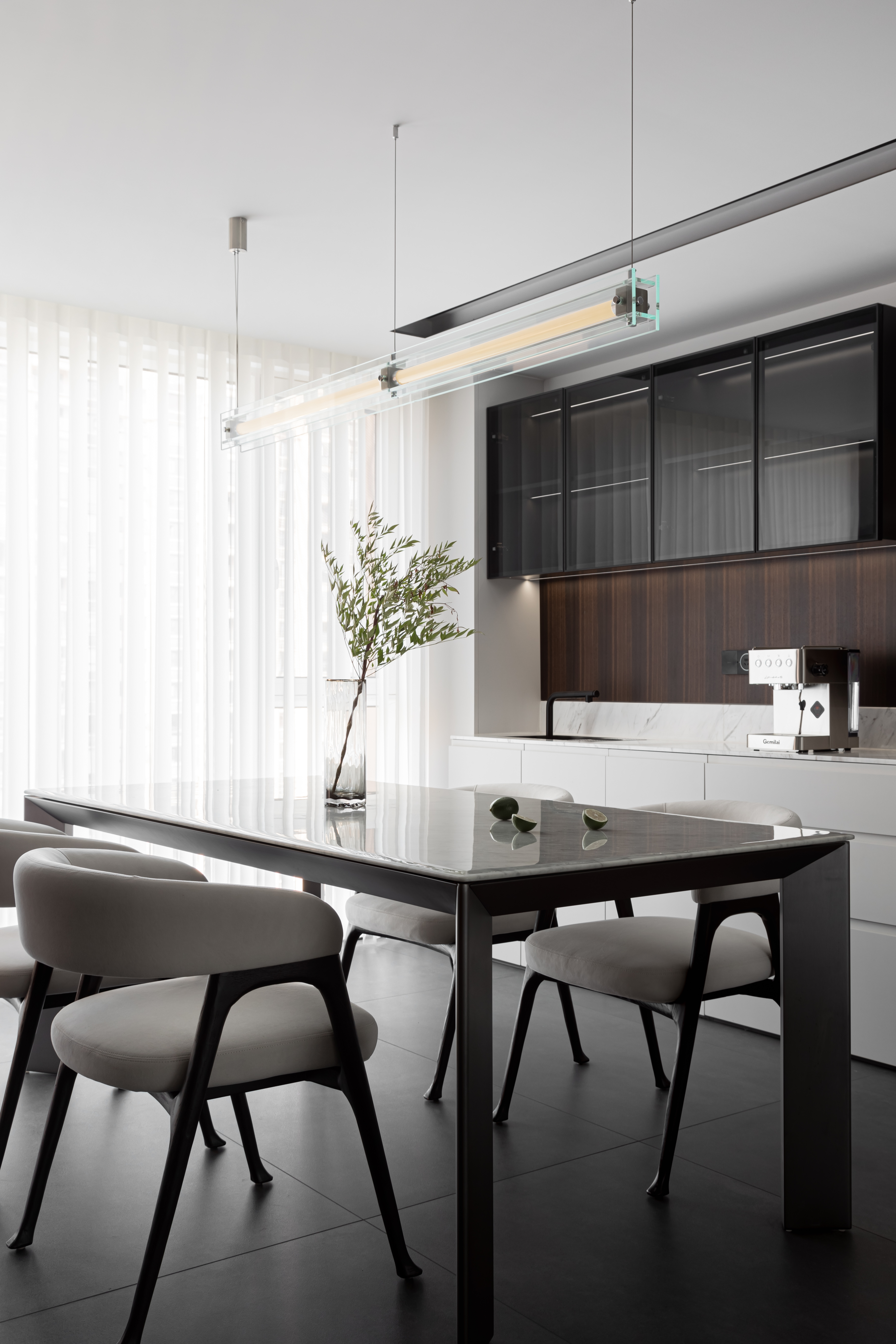 能深刻有力地满足人们心灵简练的美,都来自于其内在的复杂性。每一寸光影的投射,从神性到人性,在日常生活里激荡起生命的体验,这是空间给人的持久感染力之源。 空间氛围的营造即空间的艺术,从进门那一刻开启光的叙事之旅。明与暗,非常对立而统一,静谧感激发出空间想象,它能够用来表达富有哲理性的东西。它是减法的艺术,去除颜色干扰,表现出恒久与稳定。 白色的墙面,木色组合其中,沉静而温暖。希望给予更多却又拿捏着分寸,设计师运用颜色构建空间,划分区域,相互独立又彼此衬托。犹如黄渤海那条清晰的分界线,永恒的神秘与美妙。 沙发背景墙采用凹进墙面和凸出的置物设计,通过凹凸感来丰富视觉上的层次感。大面积白色墙体构建一个放空与留白的空间,简洁干净之余更有延申视觉层次的感觉,一切皆有可能不正是人世间最大的乐趣吗? 万物皆有裂痕,那是光照进来的地方,光赋予空间以生命和灵魂,循序渐进的自然光线令视线变得开朗。阳台没有隔断的分隔,空间极具层次,以窗为界便获得充足的光线,绿植点缀,阳光毫不吝啬地挥洒,设计拉近人、光、自然的关系,为空间营造艺术质感,在室内空间中沉浸光线,体验自然和空间逻辑之美。 荷兰画家伦勃朗善于用光,魔术般的处理画面的明暗关系,当光如一束集中线打在主要部分,原本黑暗中的一切便开始散发出魅力。朦胧、柔和中是丰富的细节,时间与阅历刻画在人的脸上,那种神秘的气息让人着迷。空间亦是如此。 光在这里拥有了多重的含义,它是空间的旋律,时而澎湃,时而轻柔;它是一种装饰,毫不费力就可填满空间;它是一种材质,在灰、白与木之间寻找到一种平衡。 设计师认为“好设计”应该是:简约和品质并重、功能性优先于形式感、装饰依功能而生。既要简单有序的整体结构,又要多样暧昧的空间细节。 食物与自然同样具有治愈能力,大抵是食物是人与自然紧密联系的纽带,香气构筑成了家里最独特的气味,从视觉到嗅觉到触觉,美食调动起人最丰富的感官,然后激发起最愉悦的情绪。 设计师对细节的关注、独到的审美视角以及熟练的材料运用,打造出具有多重功能的整体厨房空间,并成为建筑结构的重要组成部分。它是提供美食的完美场所,与餐厅之间的关系密不可分,是将家人聚在一起的紧密枢纽。 打造幸福感卧室的要点是什么?越来越趋向于中性色调与极简线条的转变。设计师大面积用温润的咖色做背景,以沉稳的黑色为点缀,再搭配温润木质地板,为业主创造出心中最舒适的起居环境,低调中尽显优雅气质。 卧室没有纷乱的杂物,遵循着极简法则,配合空间细节使空间感受更舒服放松。若风雪夜归人,归的是这样一个家,又怎会惧怕这世间风起云涌,惊涛骇浪! 极简的生活,不是一味的断舍离,而是消除不必要的东西,为生活留出空间与时间。把空间聚焦到光线、自然、尺度的表达上,探寻人对空间最真实的需求,在所需之处感受幸福,幸福源自内心,源自充满意义的生活。