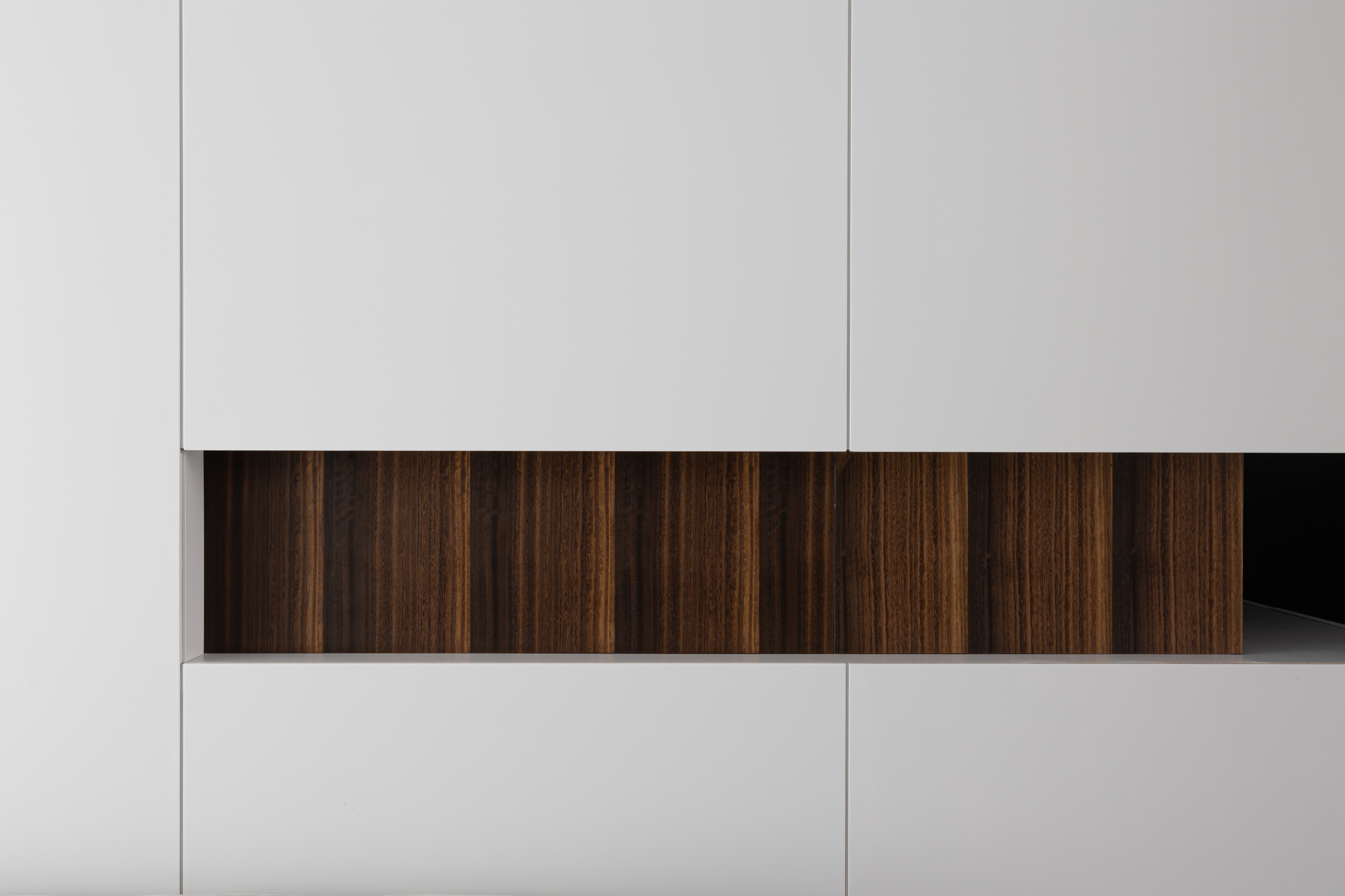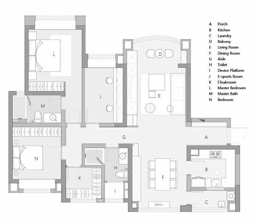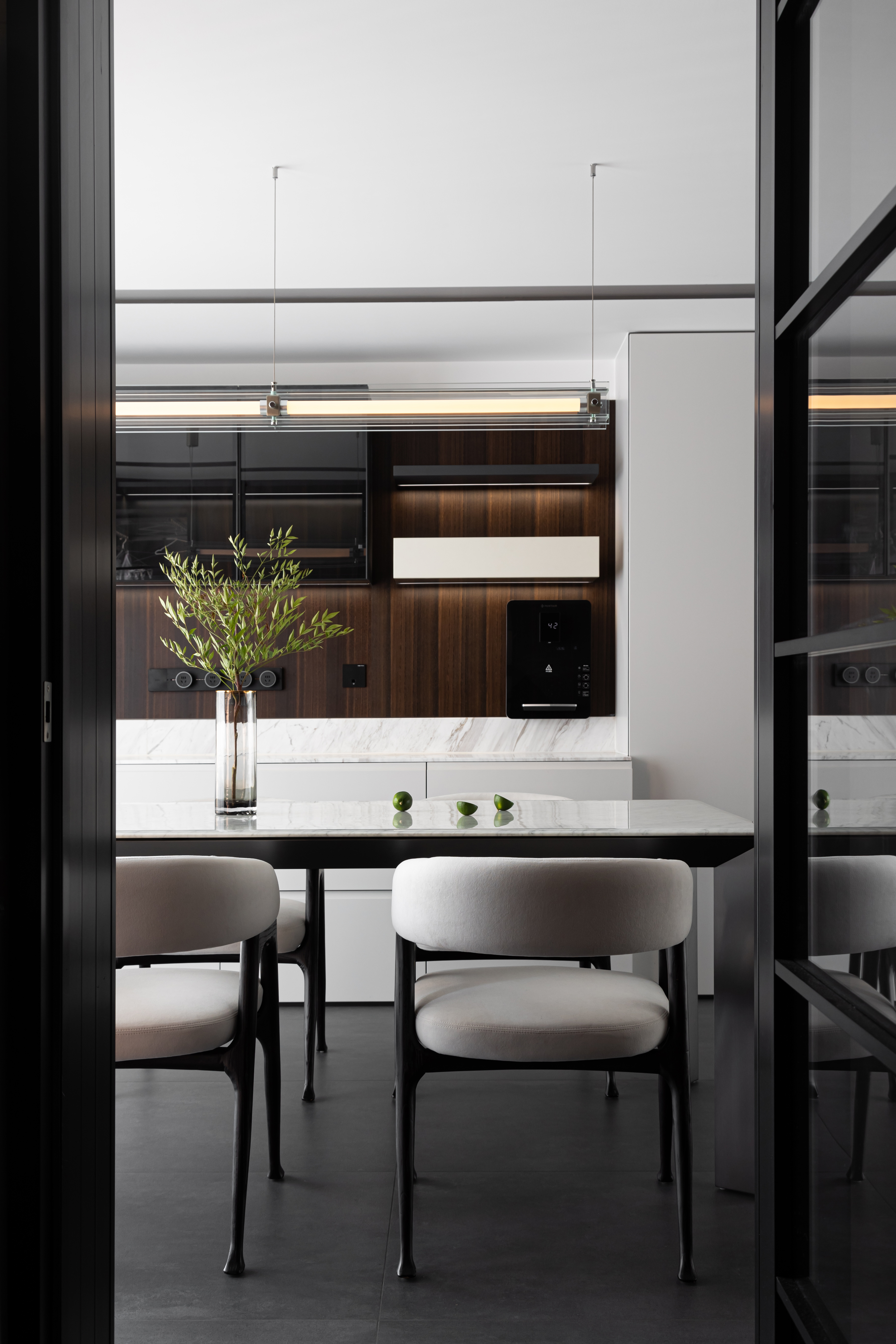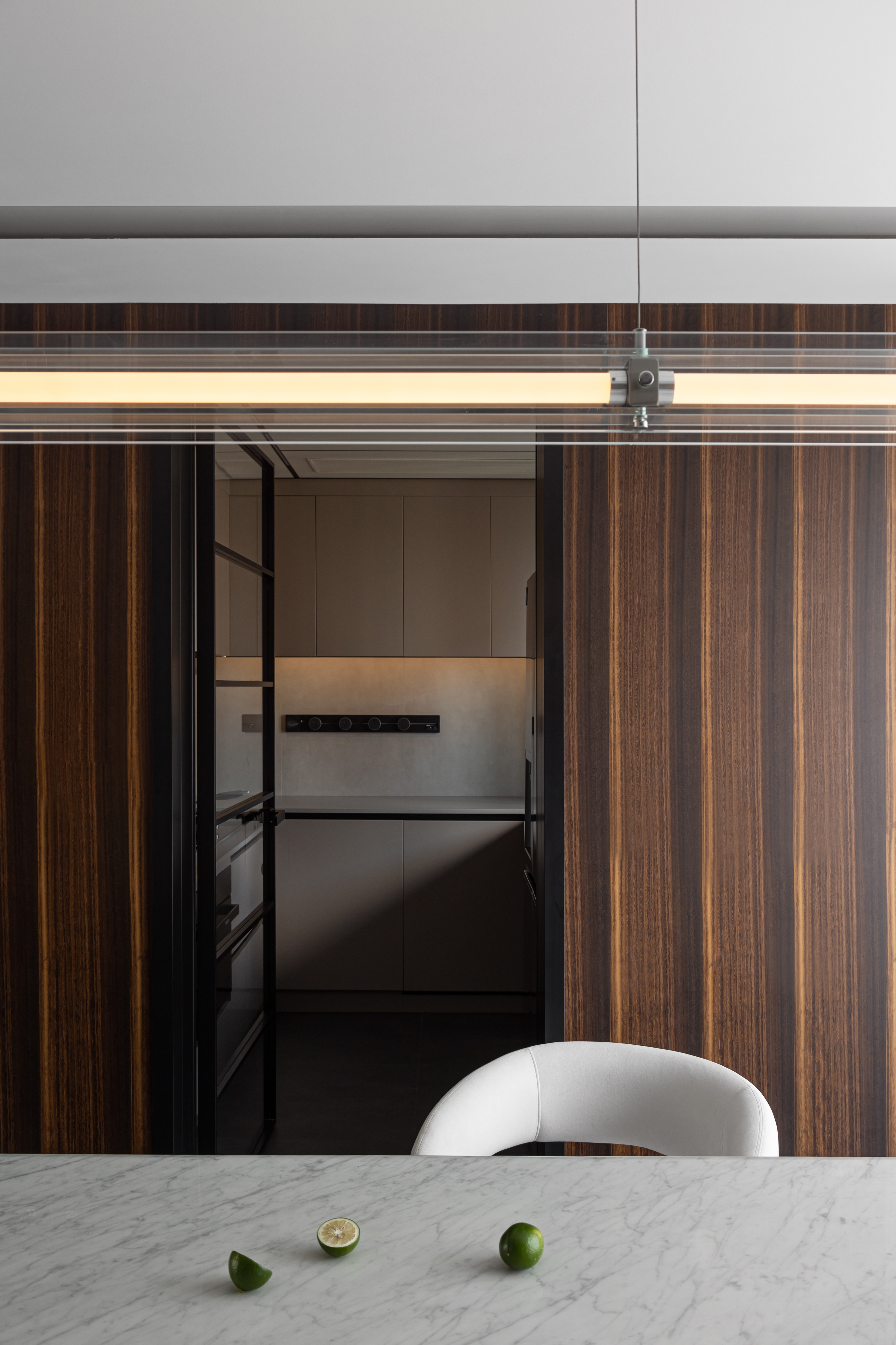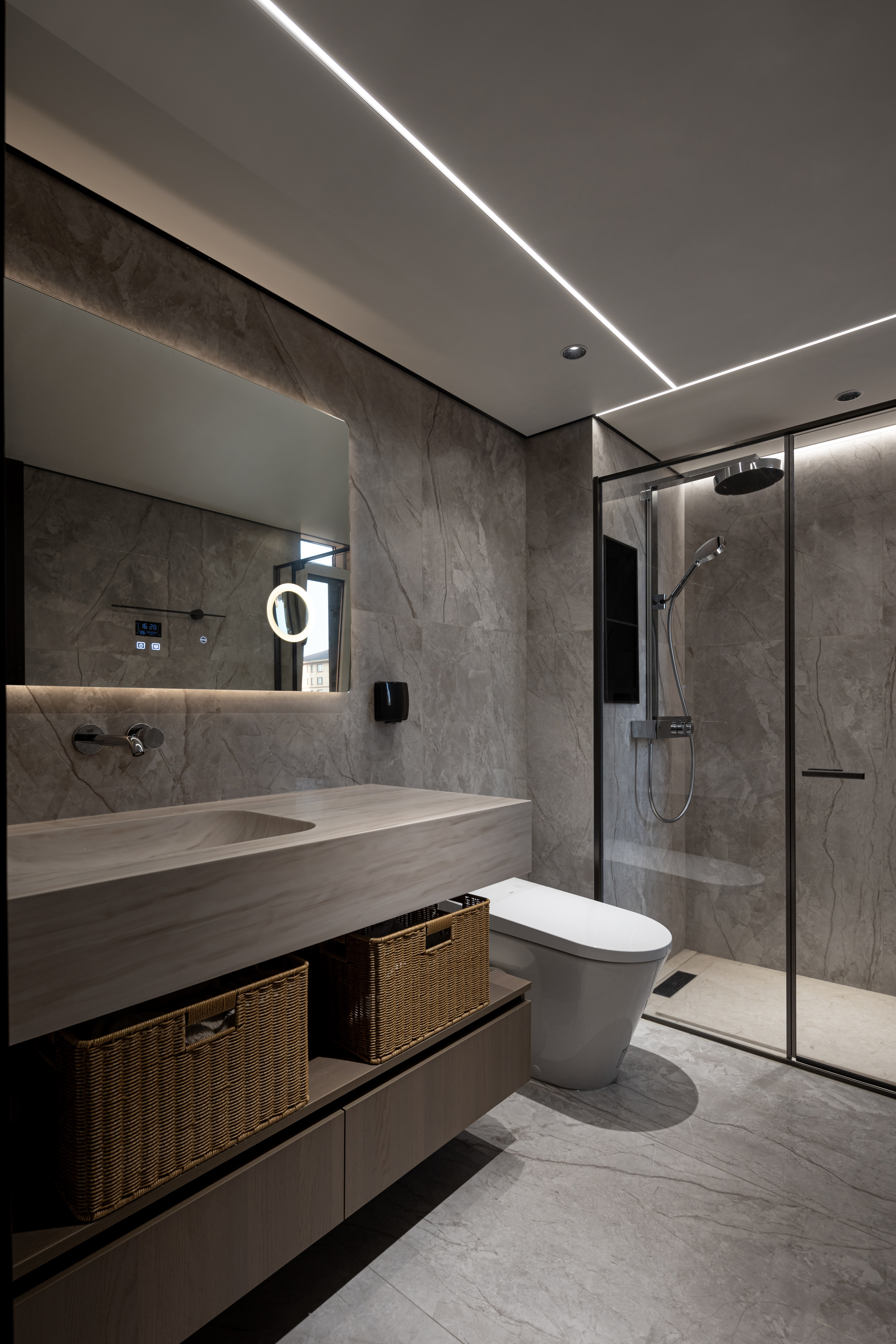 能深刻有力地满足人们心灵简练的美,都来自于其内在的复杂性。每一寸光影的投射,从神性到人性,在日常生活里激荡起生命的体验,这是空间给人的持久感染力之源。 空间氛围的营造即空间的艺术,从进门那一刻开启光的叙事之旅。明与暗,非常对立而统一,静谧感激发出空间想象,它能够用来表达富有哲理性的东西。它是减法的艺术,去除颜色干扰,表现出恒久与稳定。 白色的墙面,木色组合其中,沉静而温暖。希望给予更多却又拿捏着分寸,设计师运用颜色构建空间,划分区域,相互独立又彼此衬托。犹如黄渤海那条清晰的分界线,永恒的神秘与美妙。 沙发背景墙采用凹进墙面和凸出的置物设计,通过凹凸感来丰富视觉上的层次感。大面积白色墙体构建一个放空与留白的空间,简洁干净之余更有延申视觉层次的感觉,一切皆有可能不正是人世间最大的乐趣吗? 万物皆有裂痕,那是光照进来的地方,光赋予空间以生命和灵魂,循序渐进的自然光线令视线变得开朗。阳台没有隔断的分隔,空间极具层次,以窗为界便获得充足的光线,绿植点缀,阳光毫不吝啬地挥洒,设计拉近人、光、自然的关系,为空间营造艺术质感,在室内空间中沉浸光线,体验自然和空间逻辑之美。 荷兰画家伦勃朗善于用光,魔术般的处理画面的明暗关系,当光如一束集中线打在主要部分,原本黑暗中的一切便开始散发出魅力。朦胧、柔和中是丰富的细节,时间与阅历刻画在人的脸上,那种神秘的气息让人着迷。空间亦是如此。 光在这里拥有了多重的含义,它是空间的旋律,时而澎湃,时而轻柔;它是一种装饰,毫不费力就可填满空间;它是一种材质,在灰、白与木之间寻找到一种平衡。 设计师认为“好设计”应该是:简约和品质并重、功能性优先于形式感、装饰依功能而生。既要简单有序的整体结构,又要多样暧昧的空间细节。 食物与自然同样具有治愈能力,大抵是食物是人与自然紧密联系的纽带,香气构筑成了家里最独特的气味,从视觉到嗅觉到触觉,美食调动起人最丰富的感官,然后激发起最愉悦的情绪。 设计师对细节的关注、独到的审美视角以及熟练的材料运用,打造出具有多重功能的整体厨房空间,并成为建筑结构的重要组成部分。它是提供美食的完美场所,与餐厅之间的关系密不可分,是将家人聚在一起的紧密枢纽。 打造幸福感卧室的要点是什么?越来越趋向于中性色调与极简线条的转变。设计师大面积用温润的咖色做背景,以沉稳的黑色为点缀,再搭配温润木质地板,为业主创造出心中最舒适的起居环境,低调中尽显优雅气质。 卧室没有纷乱的杂物,遵循着极简法则,配合空间细节使空间感受更舒服放松。若风雪夜归人,归的是这样一个家,又怎会惧怕这世间风起云涌,惊涛骇浪! 极简的生活,不是一味的断舍离,而是消除不必要的东西,为生活留出空间与时间。把空间聚焦到光线、自然、尺度的表达上,探寻人对空间最真实的需求,在所需之处感受幸福,幸福源自内心,源自充满意义的生活。