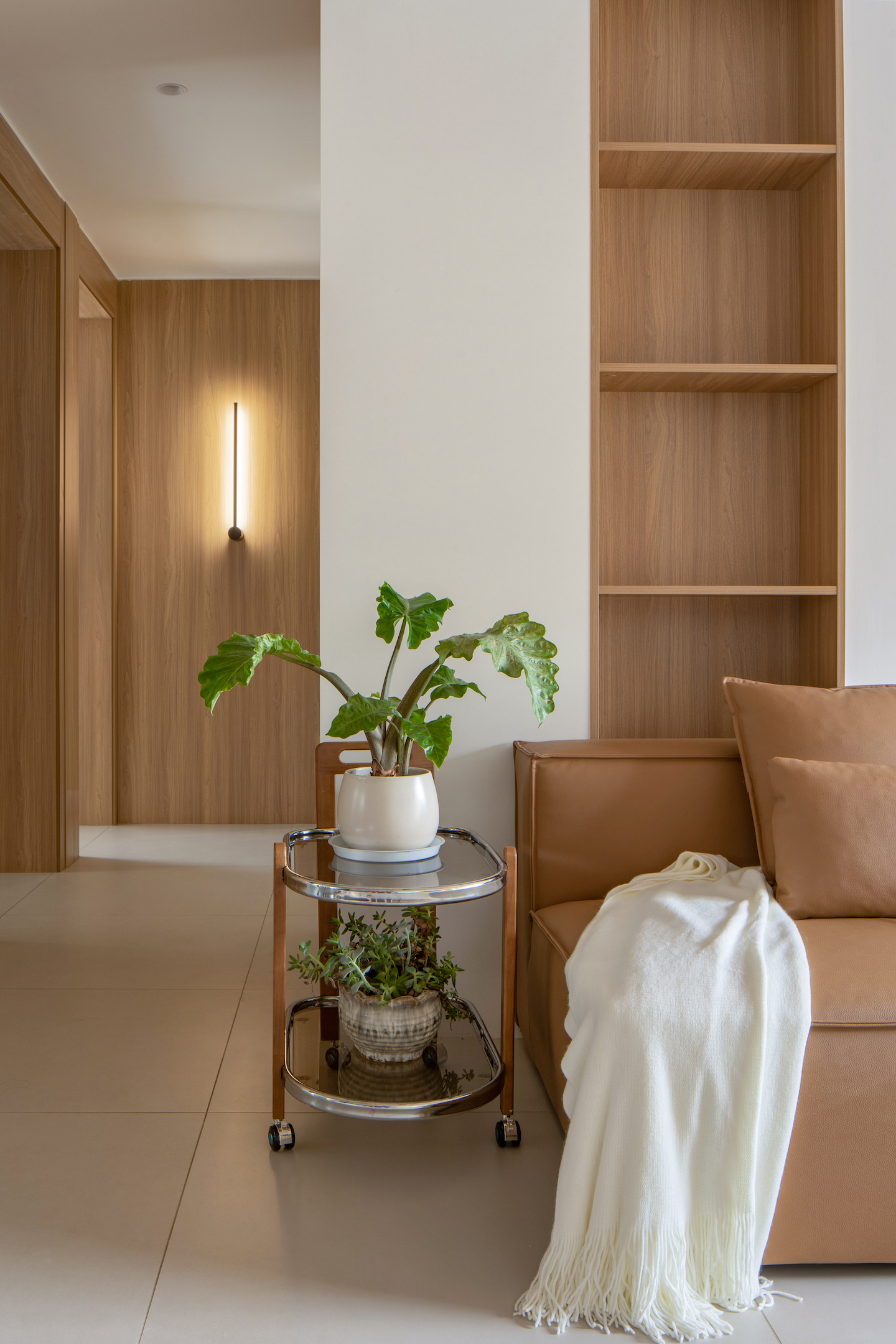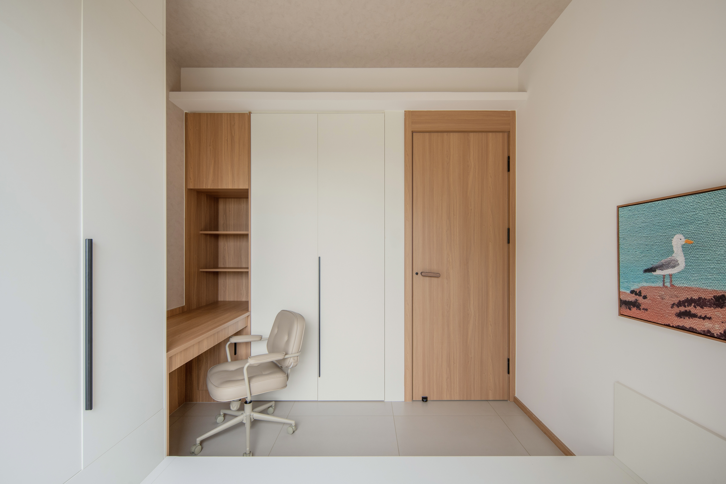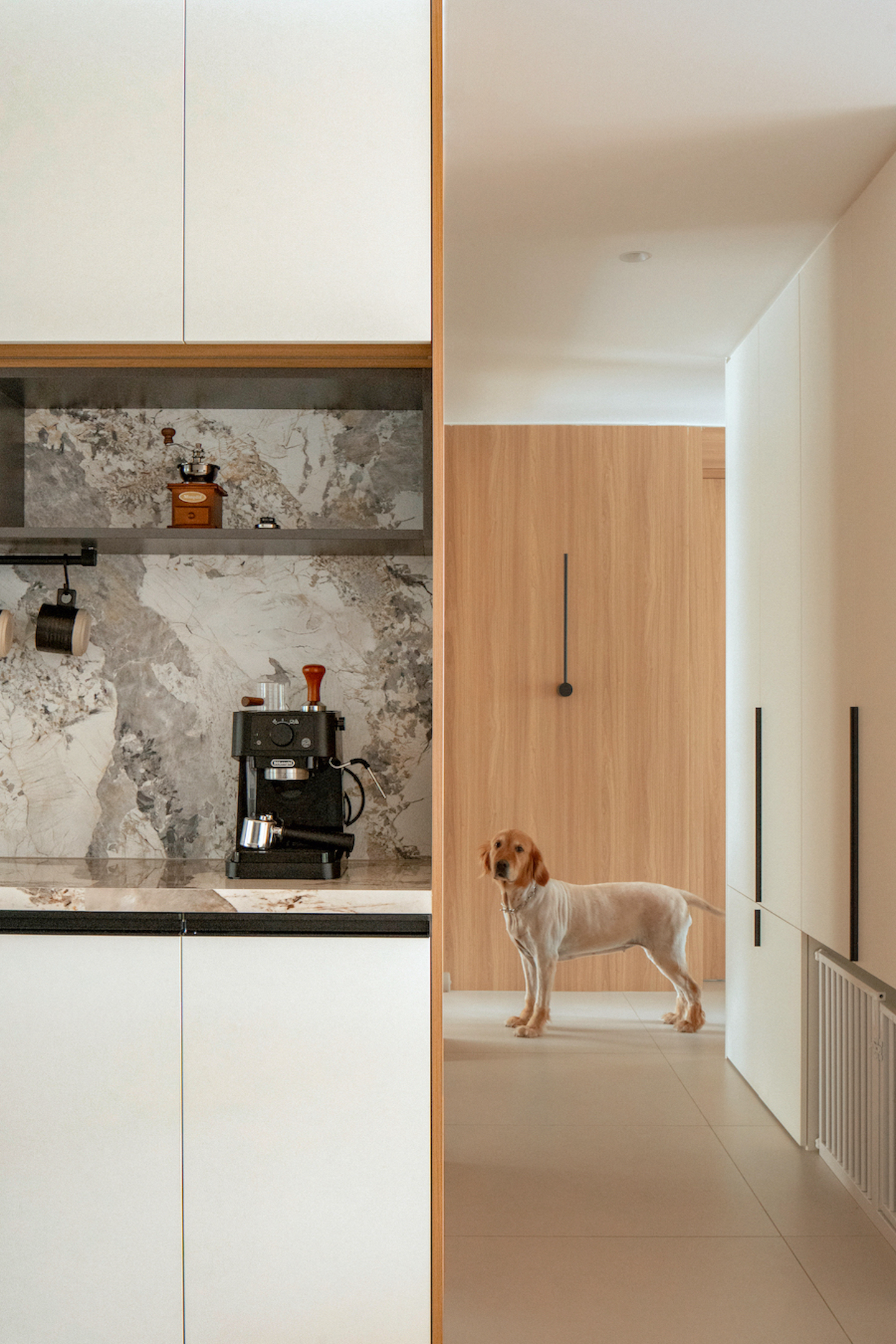 设计过程中跟业主依次确认了材料,最终定调:白色为大面积基调,搭配竖纹橡木肌理,结合部分实木与藤编元素;选择杏仁奶油系纯色瓷砖通铺全屋。避免因为宠物犬的破坏造成地面材质经常更换的浪费。