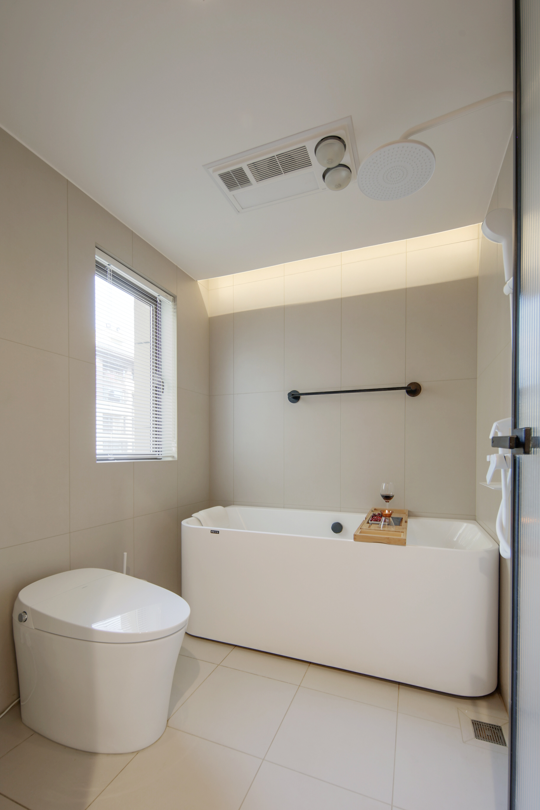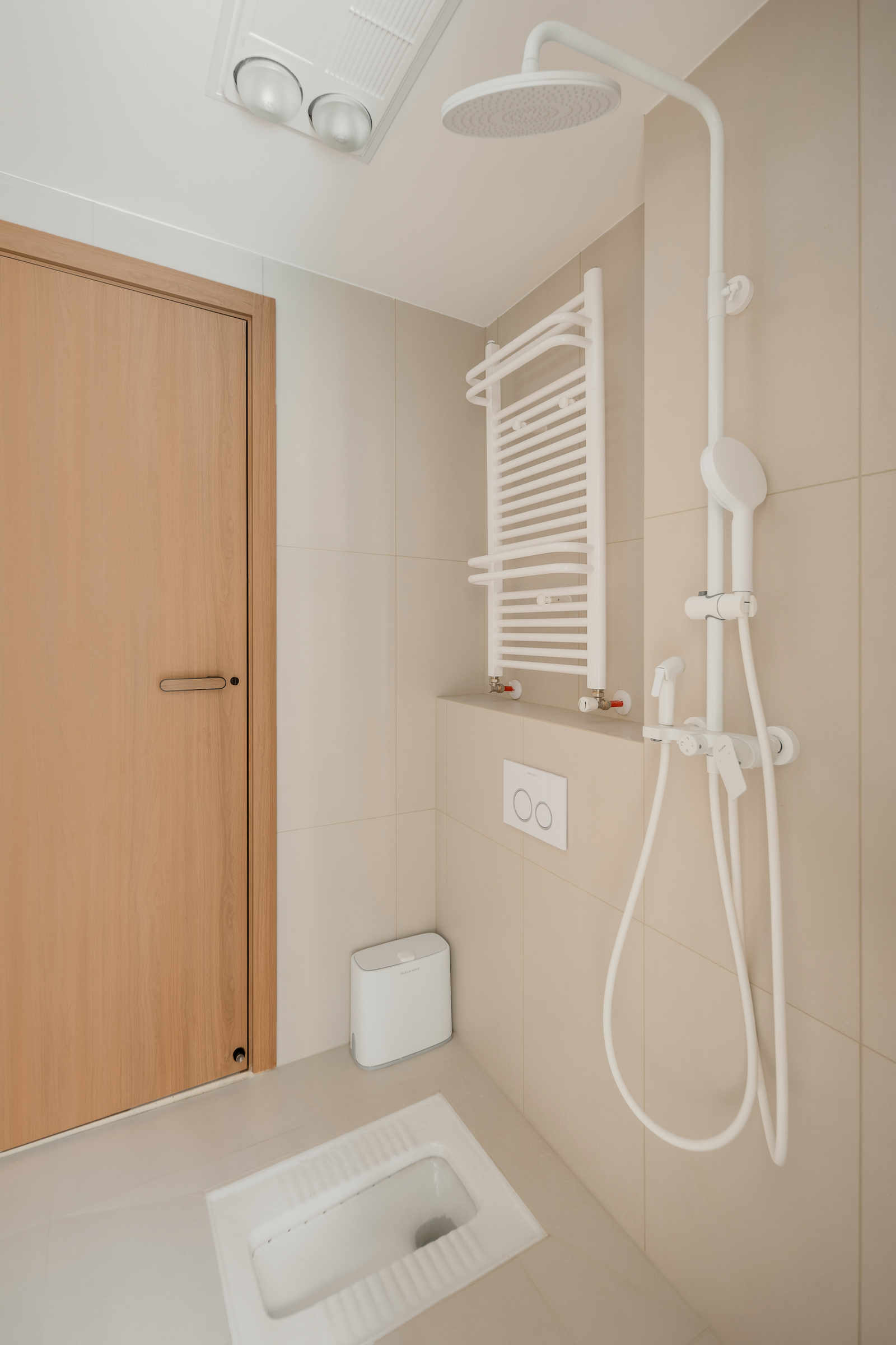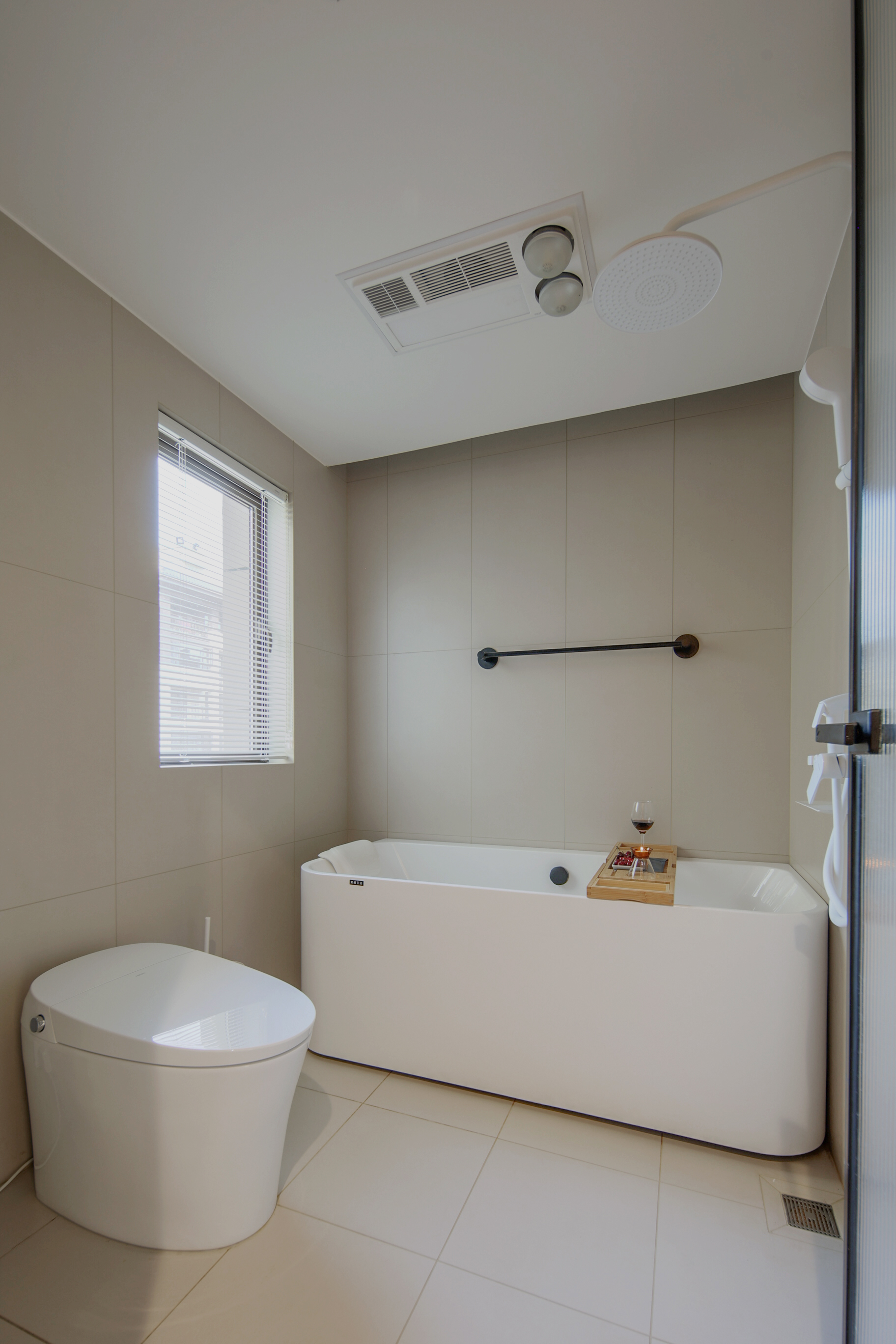 设计过程中跟业主依次确认了材料,最终定调:白色为大面积基调,搭配竖纹橡木肌理,结合部分实木与藤编元素;选择杏仁奶油系纯色瓷砖通铺全屋。避免因为宠物犬的破坏造成地面材质经常更换的浪费。