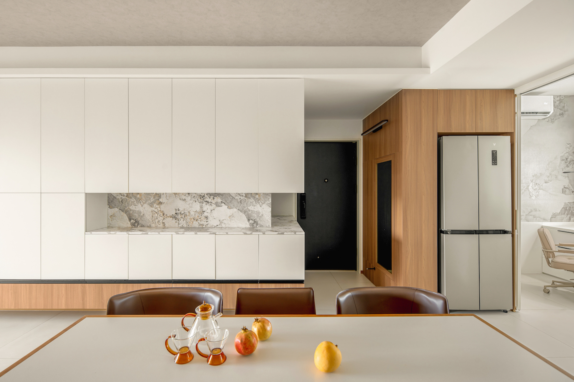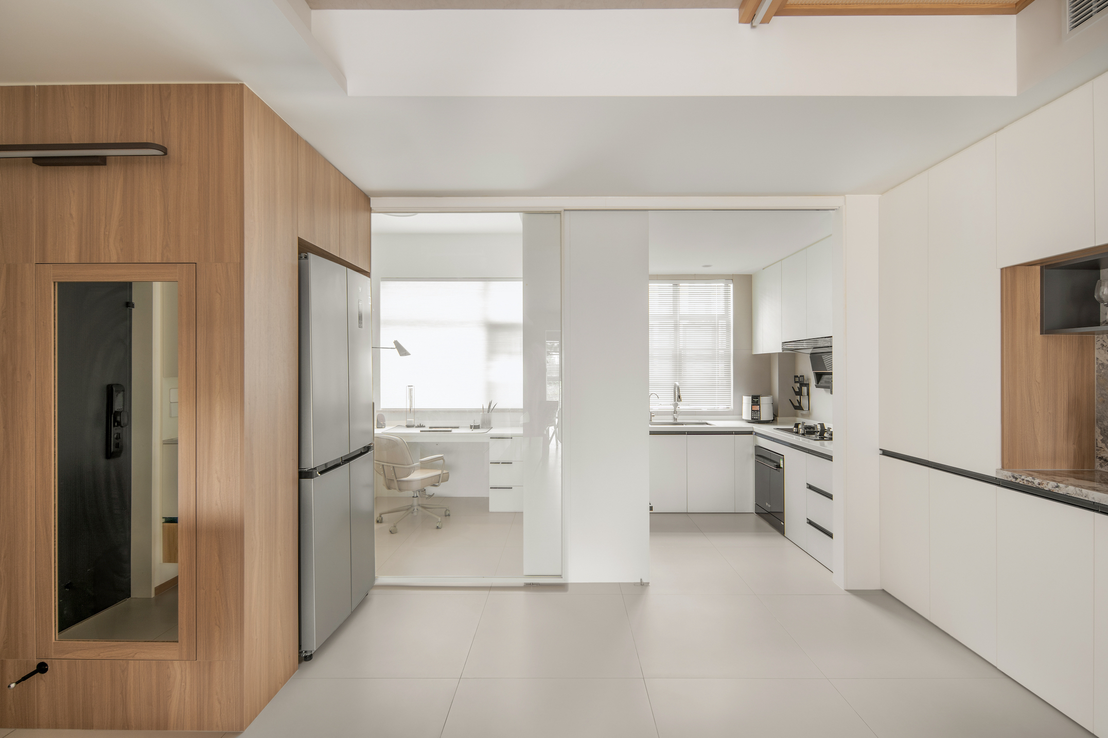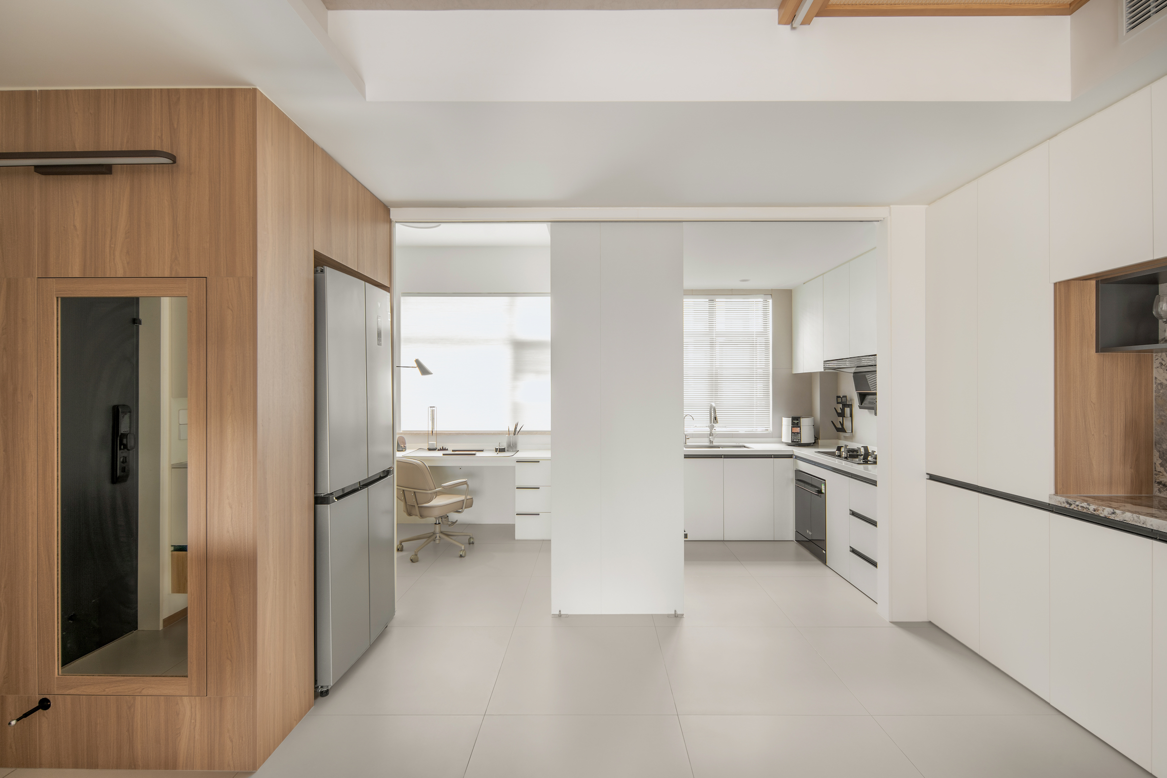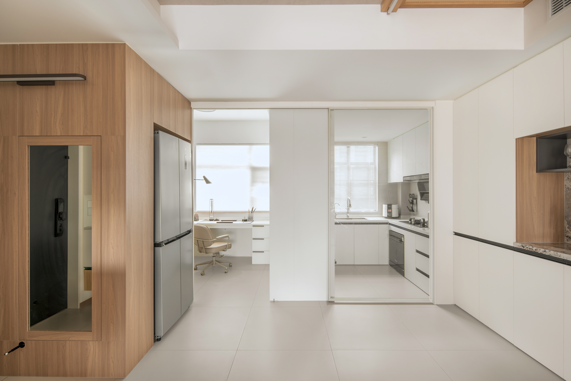 ​原始厨房面积过小,将原始两个空间的分隔墙拆除,冰箱外移,以书柜和橱柜背靠背分割空间,让两个空间独立,同时增加更多储物空间。