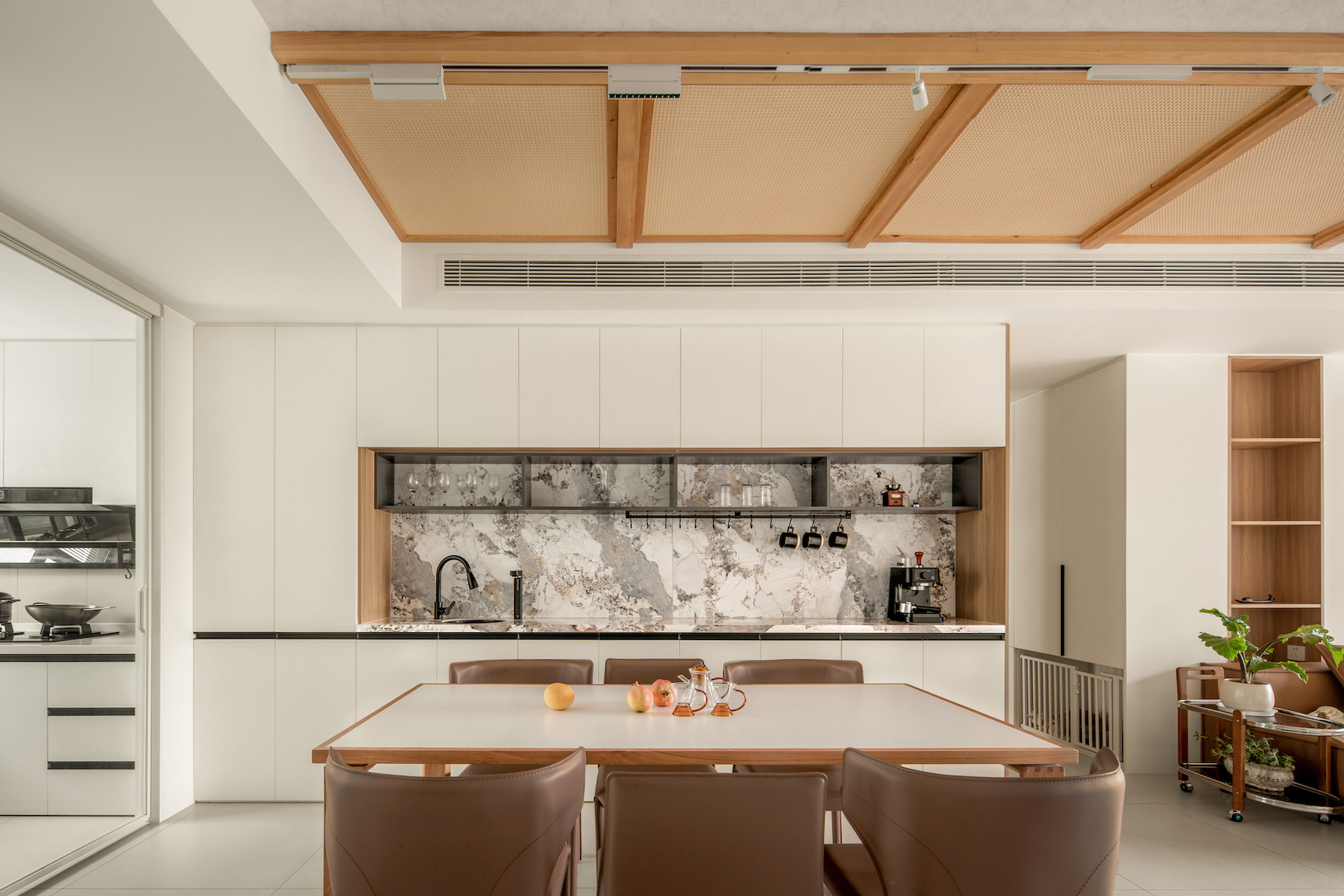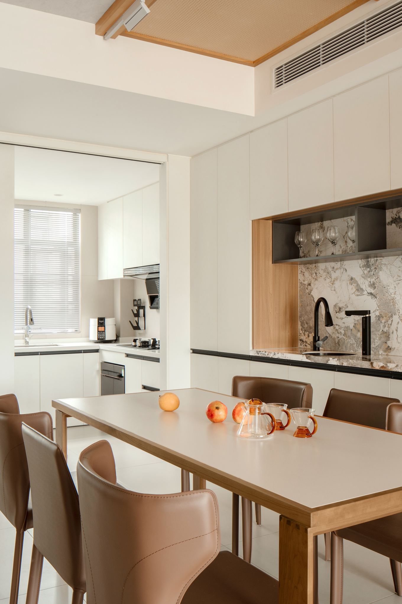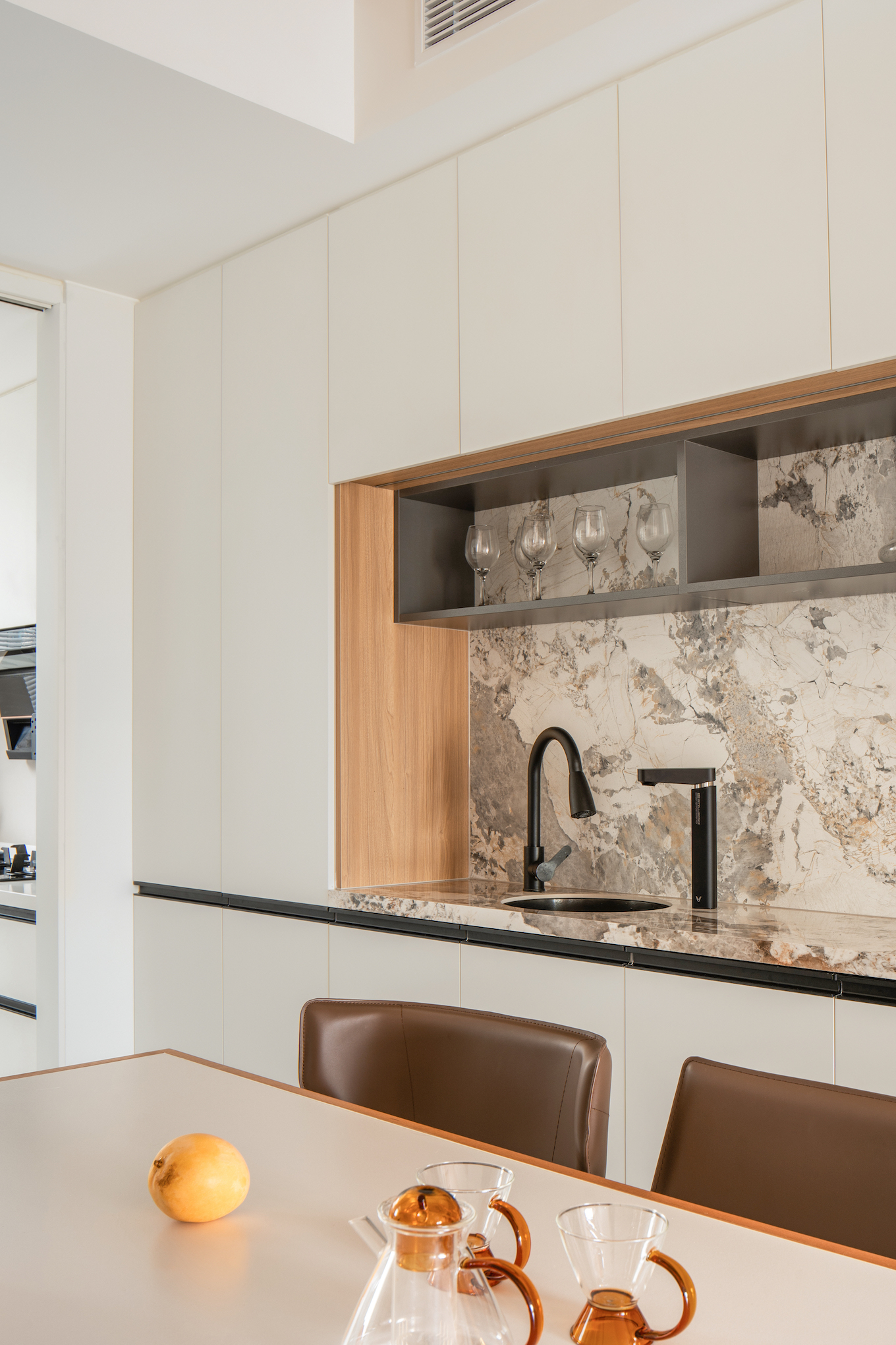 ​原始厨房面积过小,将原始两个空间的分隔墙拆除,冰箱外移,以书柜和橱柜背靠背分割空间,让两个空间独立,同时增加更多储物空间。