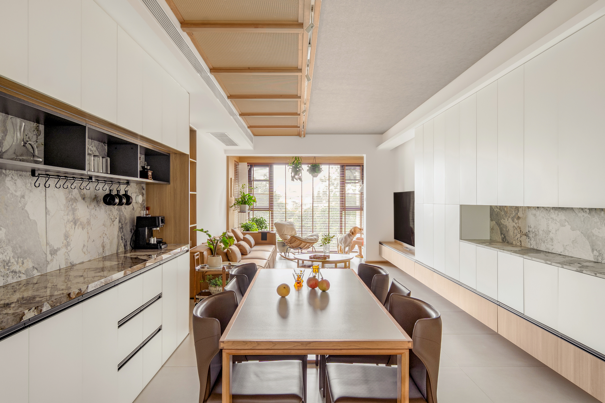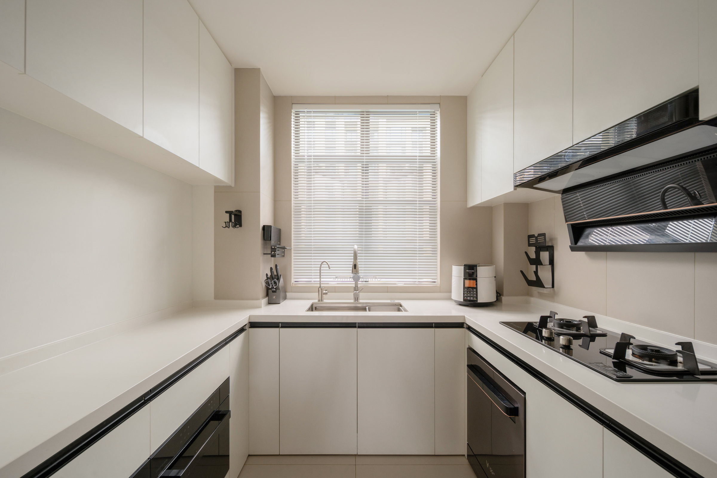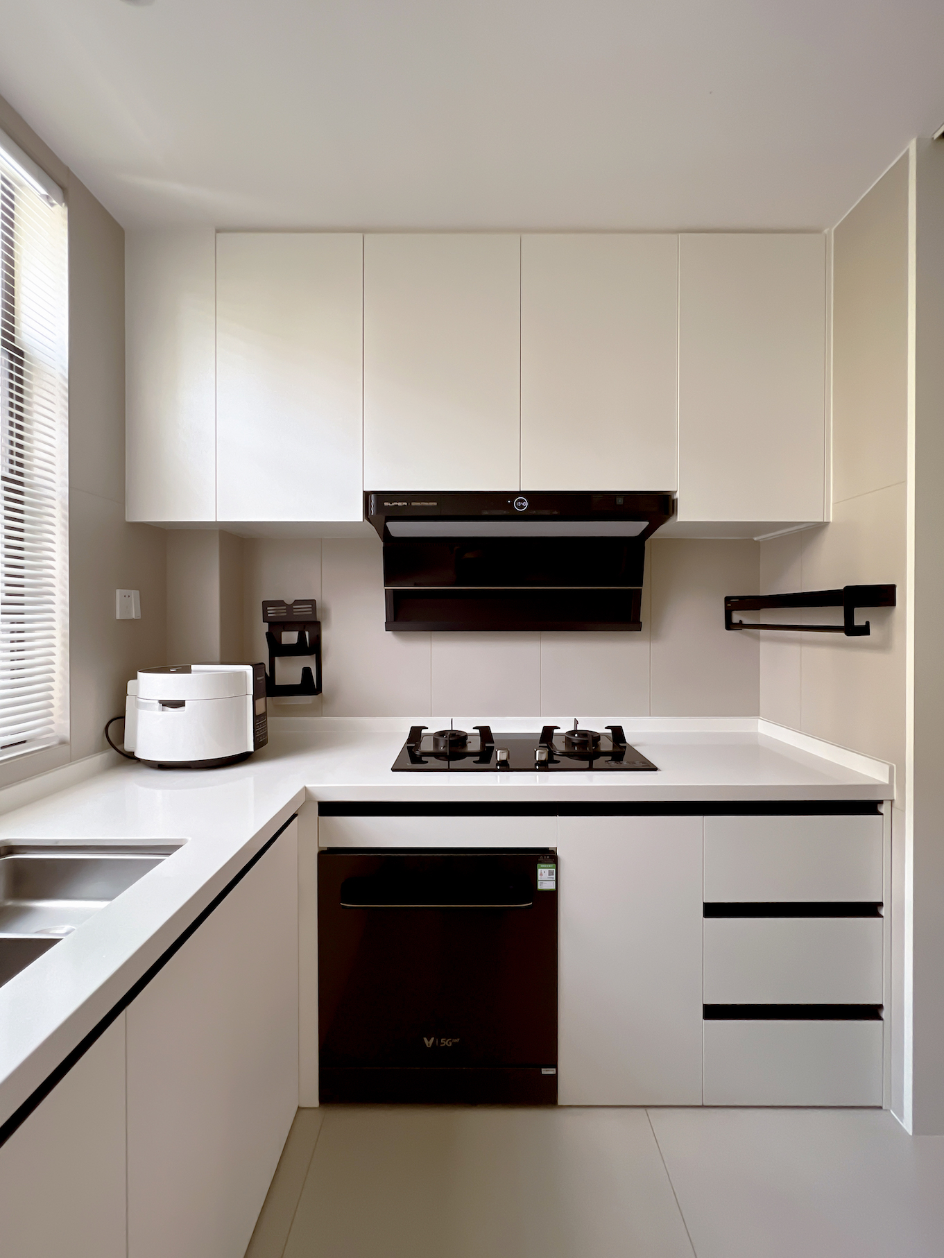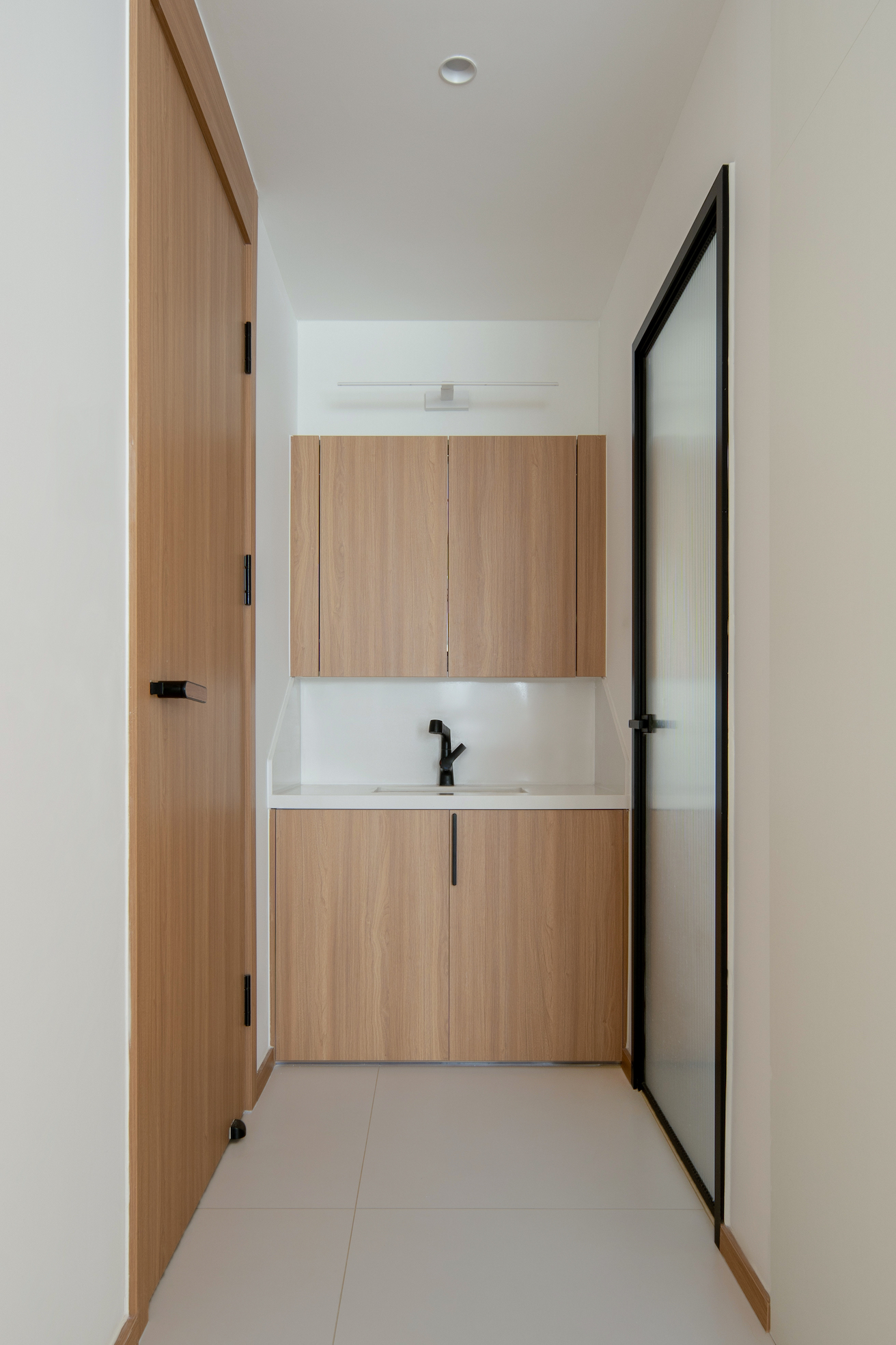 ​原始厨房面积过小,将原始两个空间的分隔墙拆除,冰箱外移,以书柜和橱柜背靠背分割空间,让两个空间独立,同时增加更多储物空间。