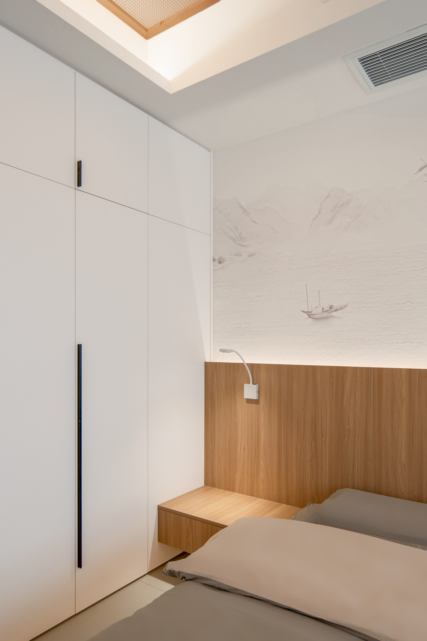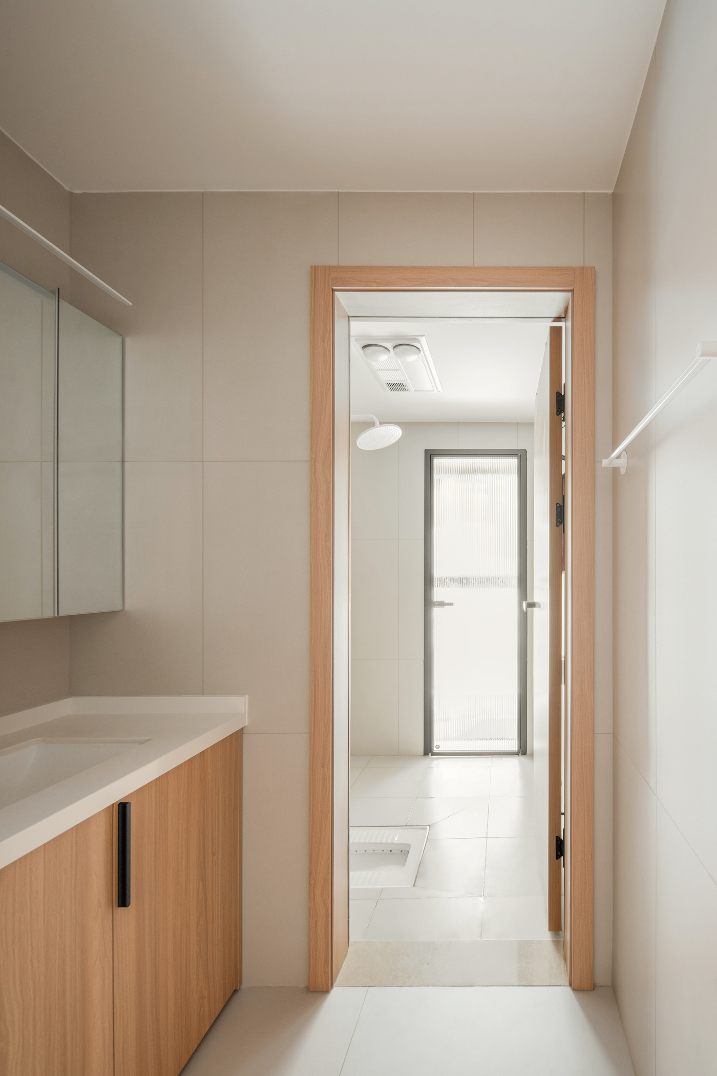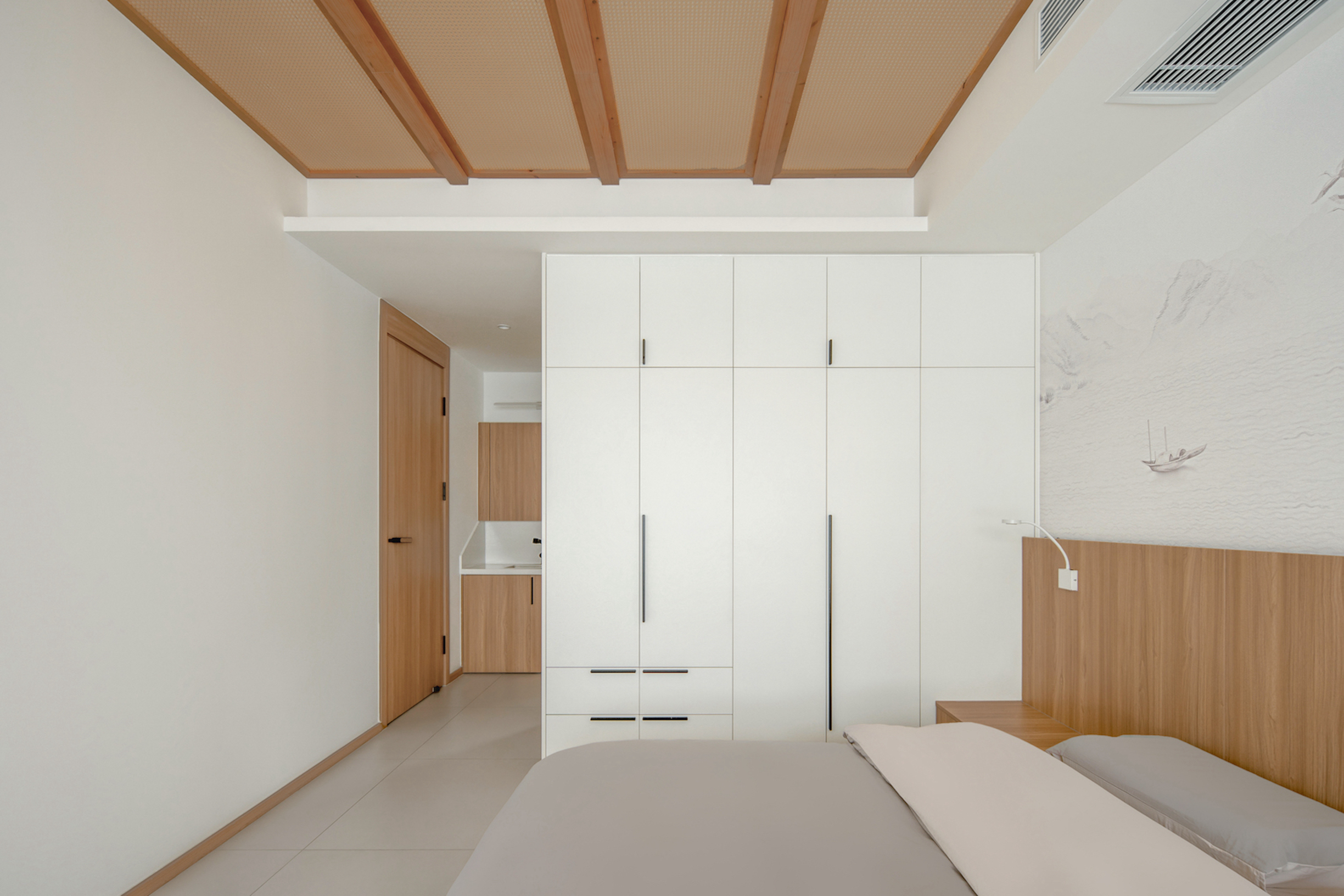 将次卧与主卧之间的墙体打通,主卧门平移且不再正对过道,以双面柜隔开,次卧一面是衣柜,主卧一面是洗面台,实现主卫的干湿分离。