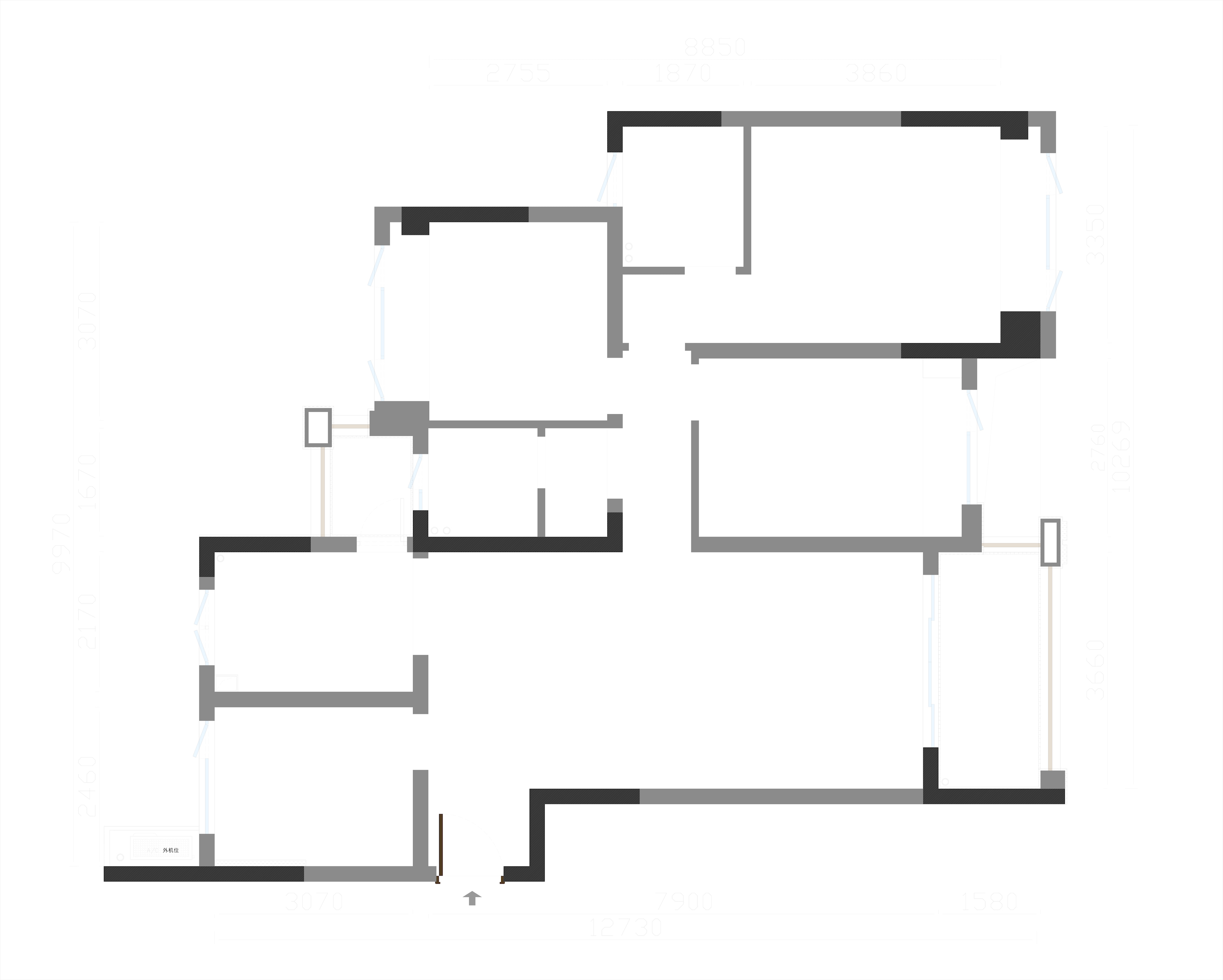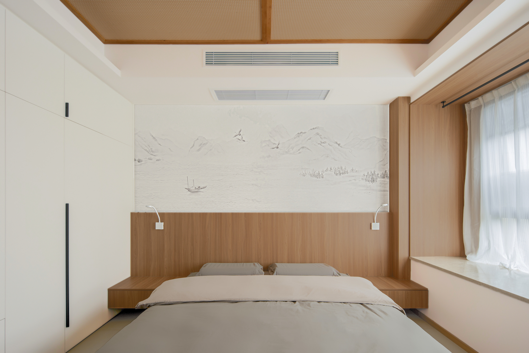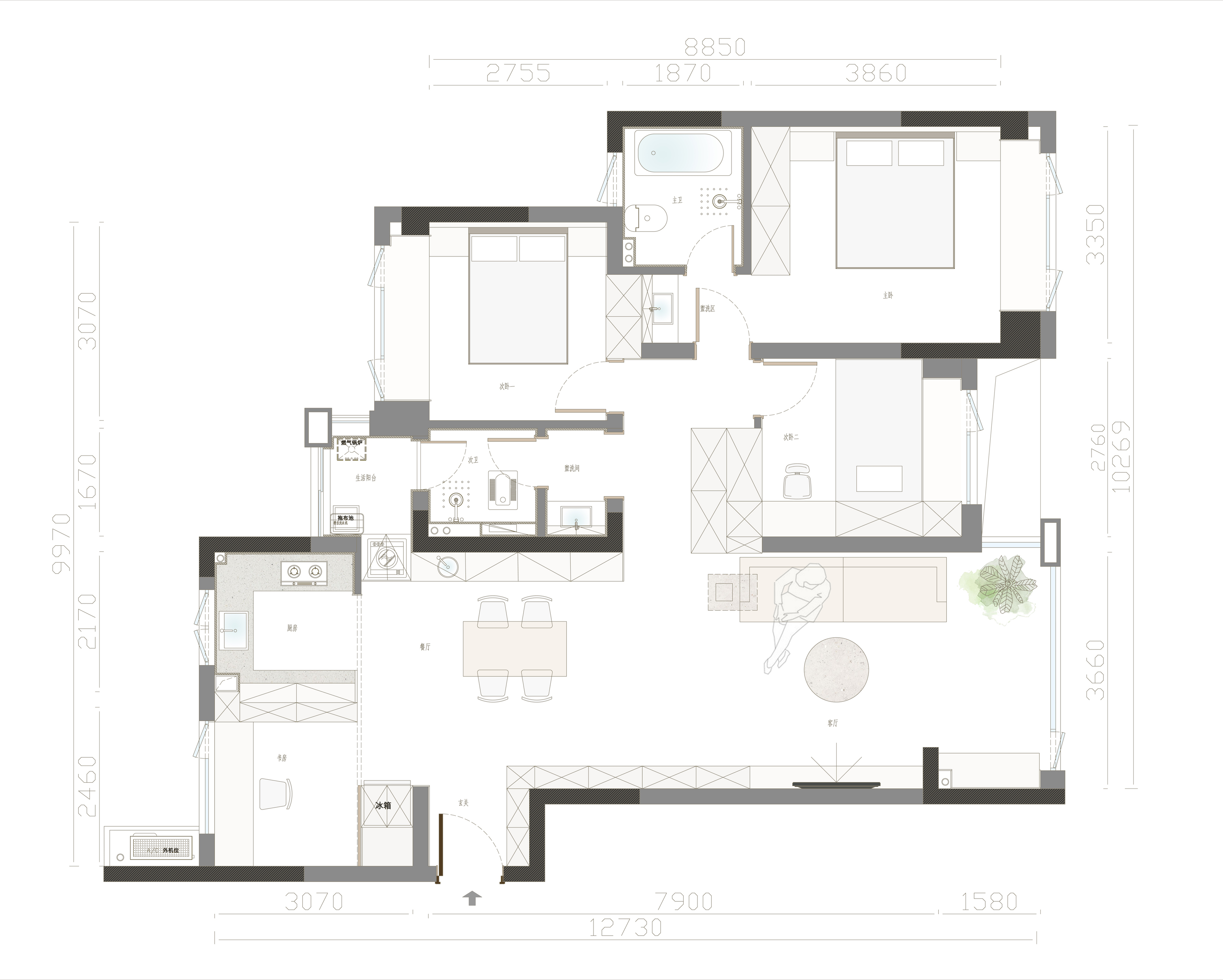 将次卧与主卧之间的墙体打通,主卧门平移且不再正对过道,以双面柜隔开,次卧一面是衣柜,主卧一面是洗面台,实现主卫的干湿分离。
