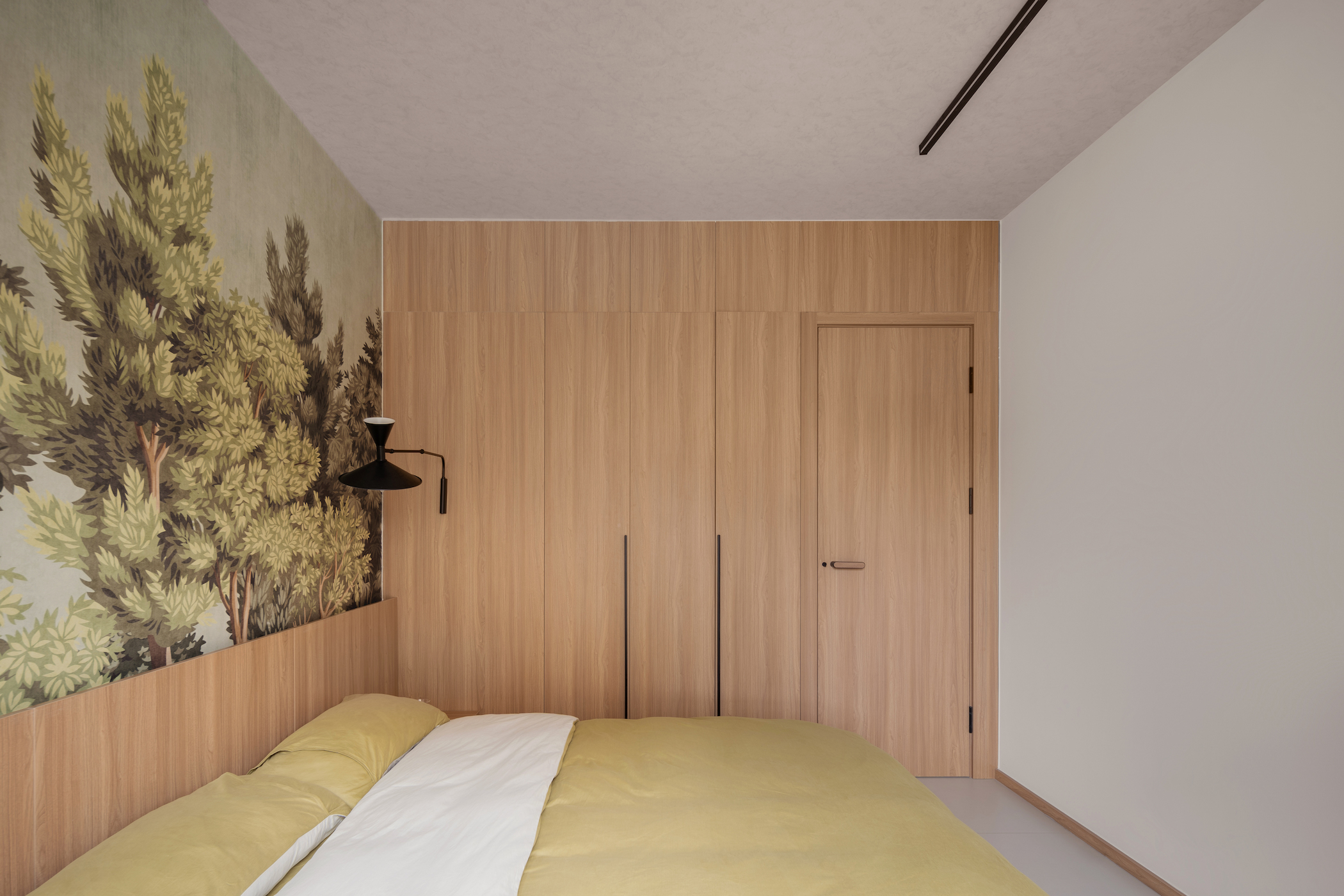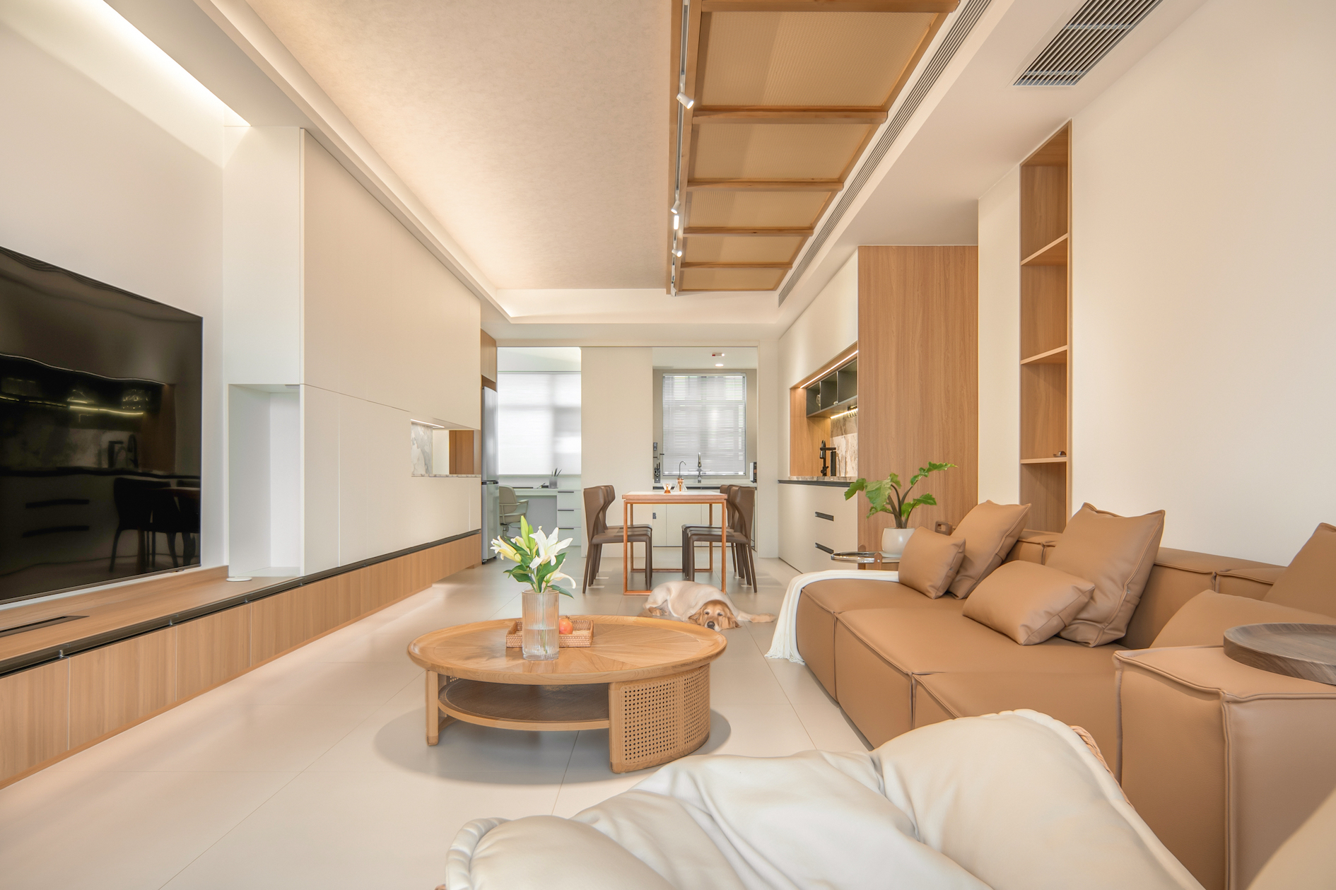 关于整体风格倾向,业主夫妇期望未来家里是温暖的浅色系,不希望有过多吊顶,敞亮干净且方便打理,还可以有很多温润的木质元素。但是,因为两只狗的生活习惯问题,不方便用木地板,所以全屋做了地砖图通铺。