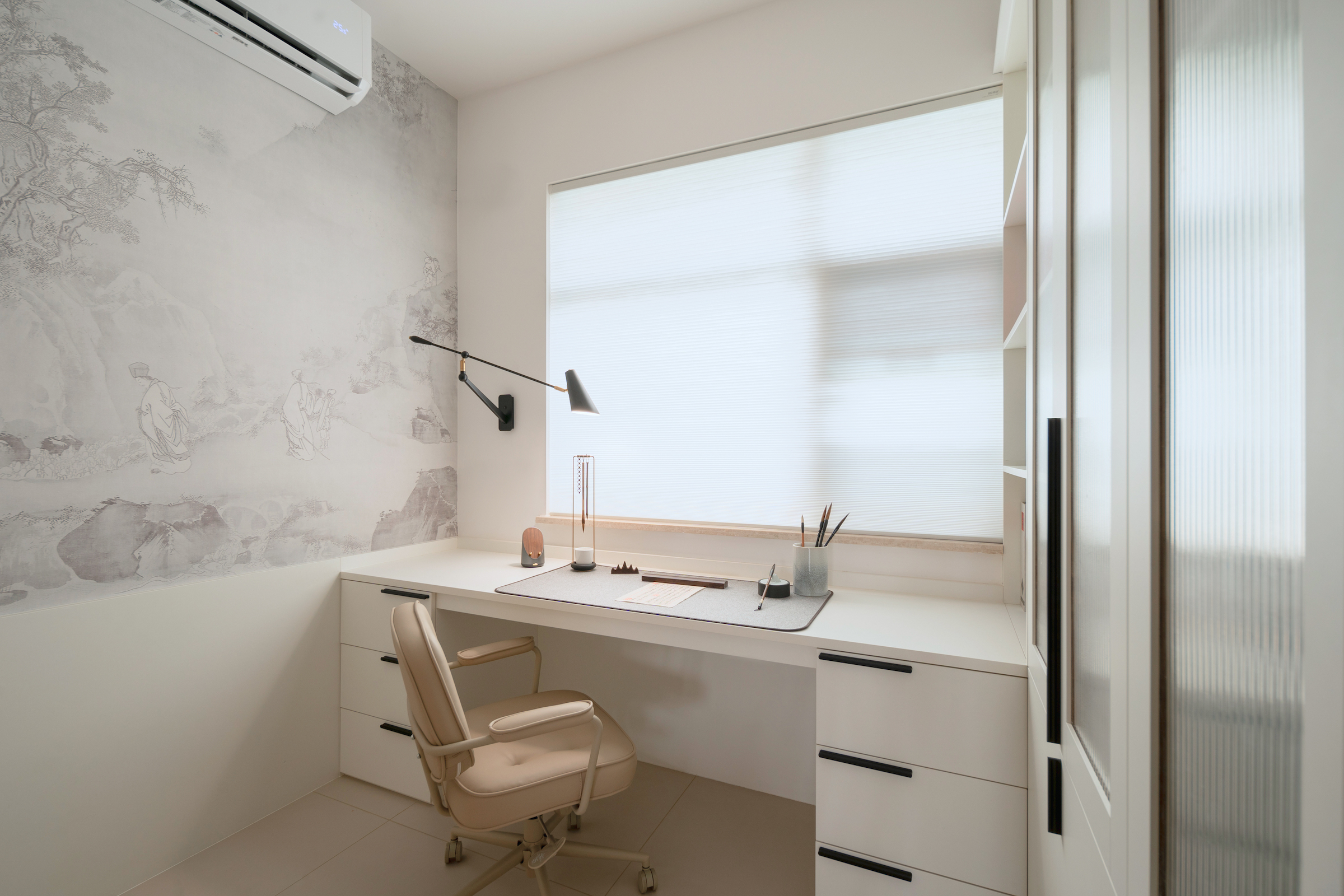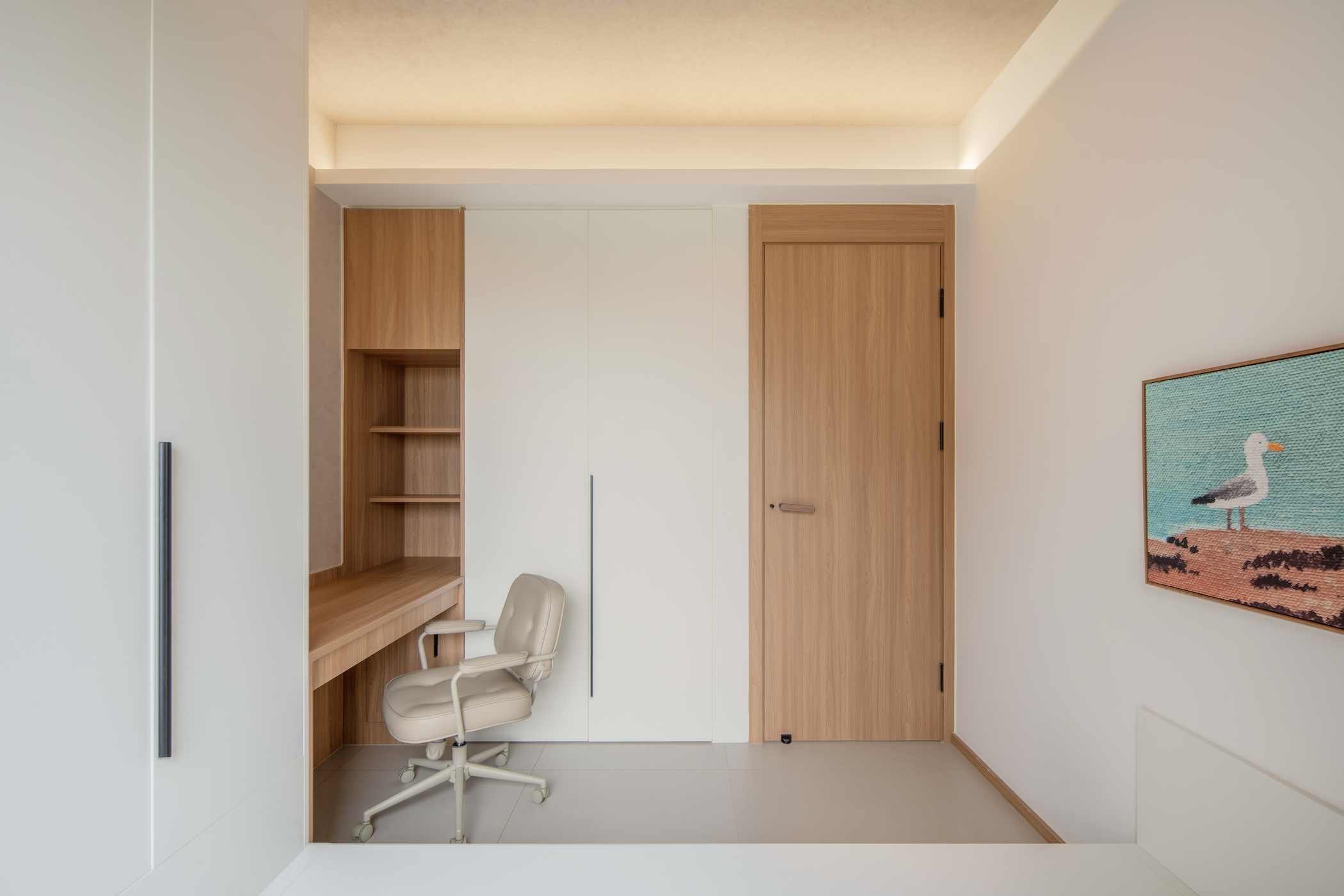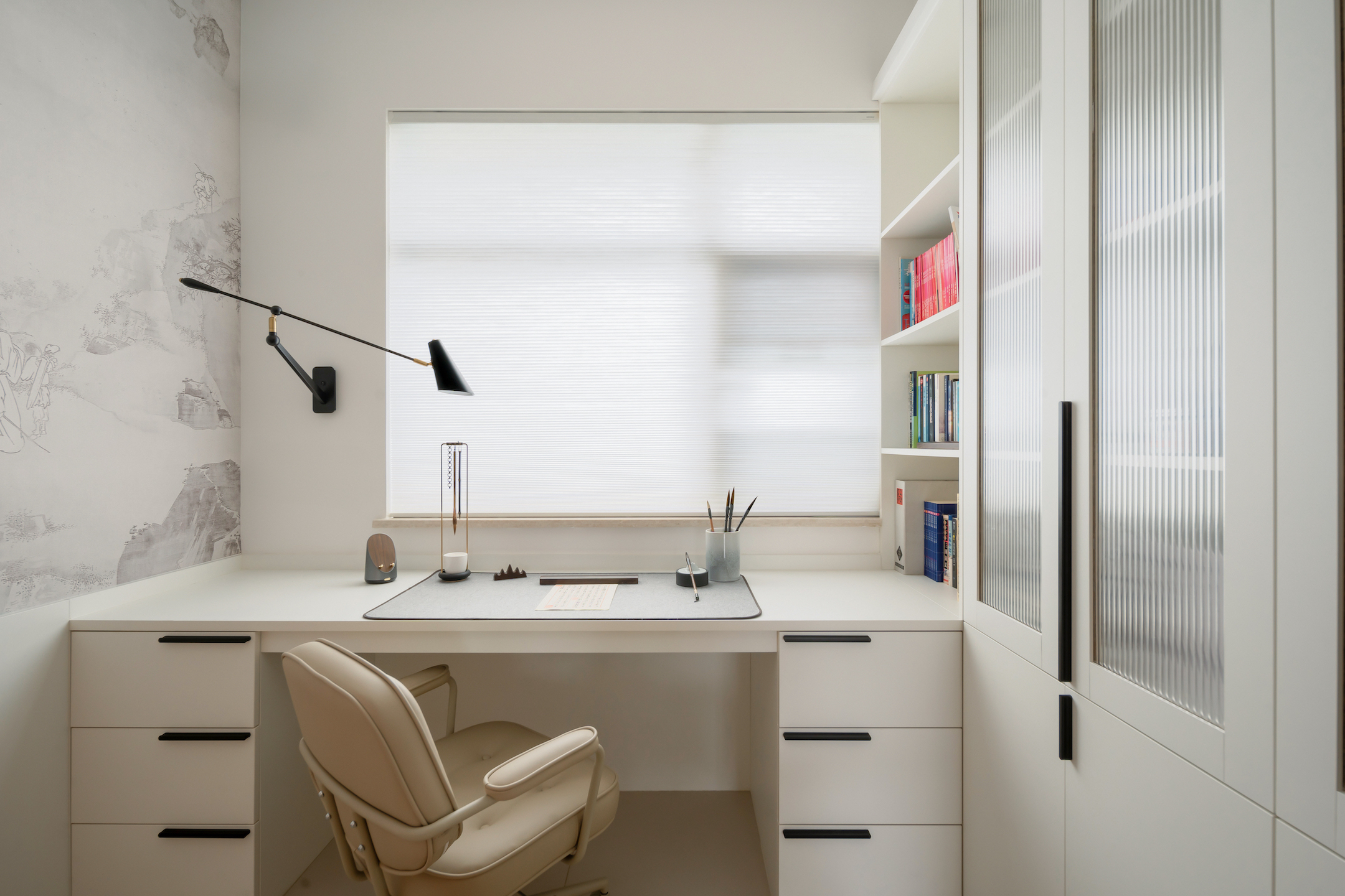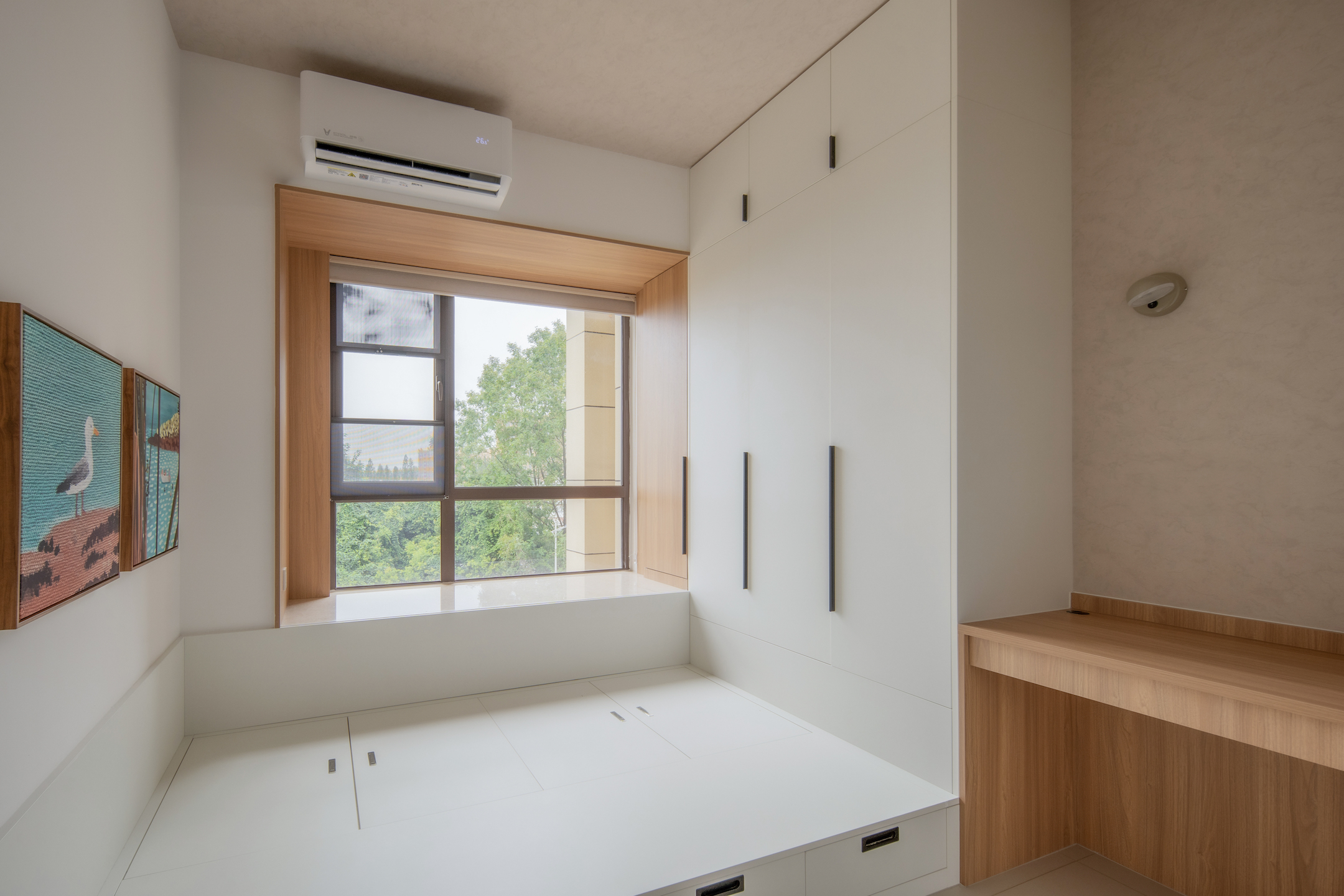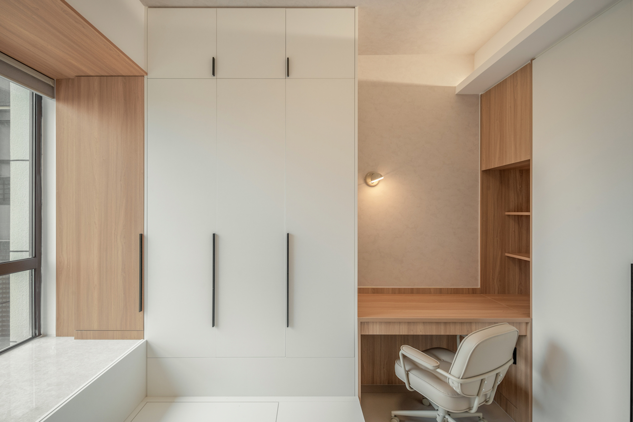 拆除客卧与走廊的隔墙,用双面柜划分空间,走廊一面是次净衣柜+泰迪多多的家,客卧一面是储物衣柜+书桌。