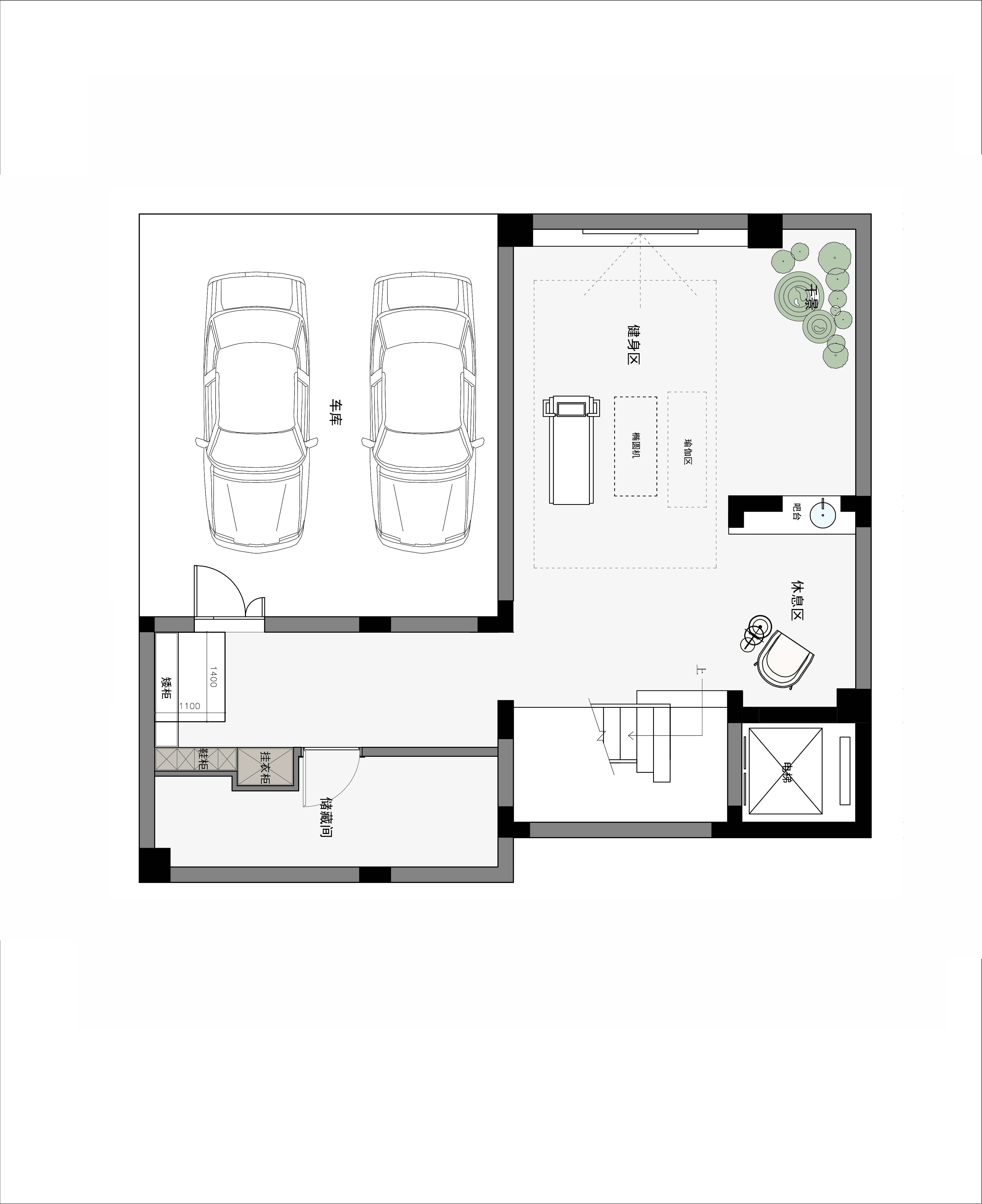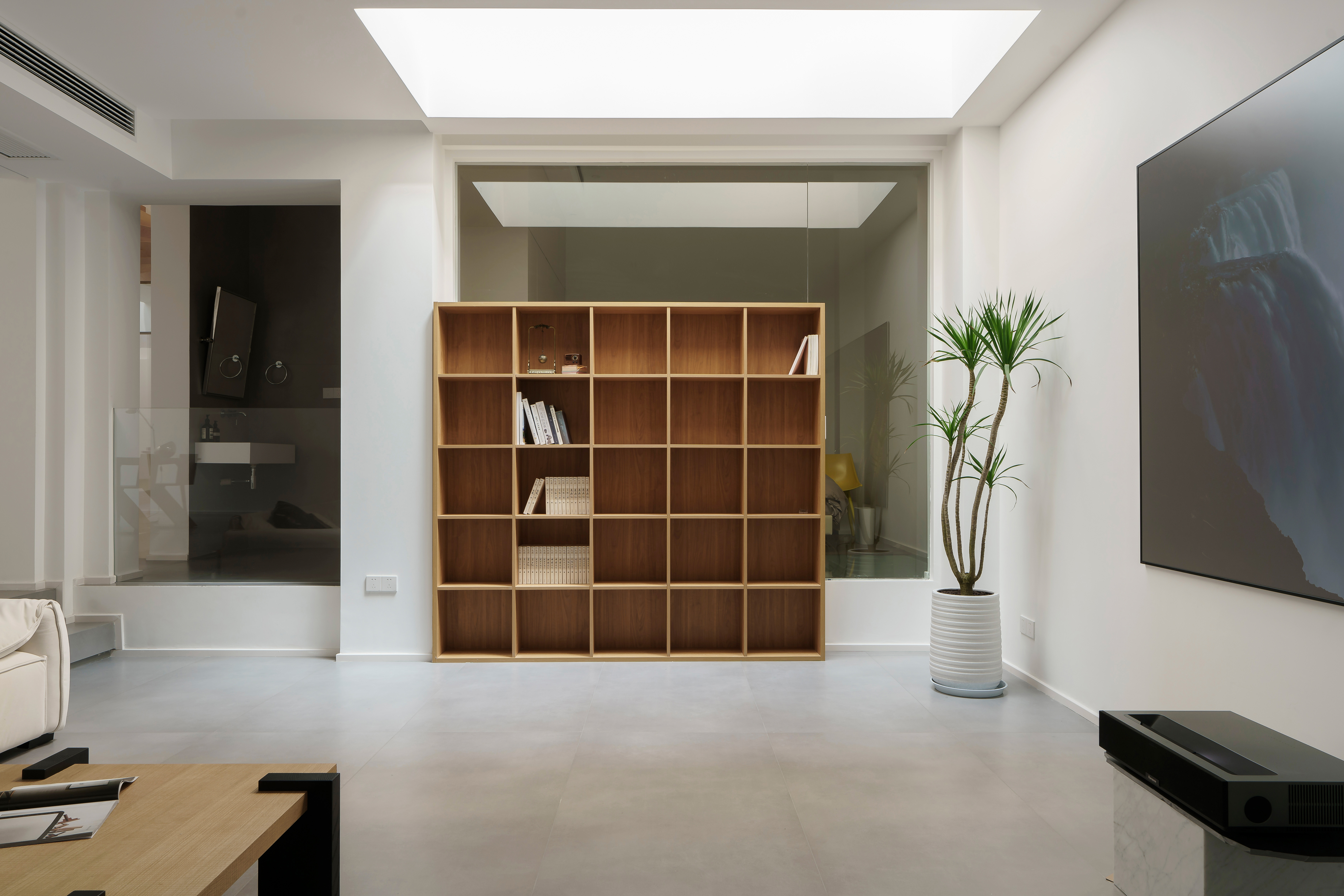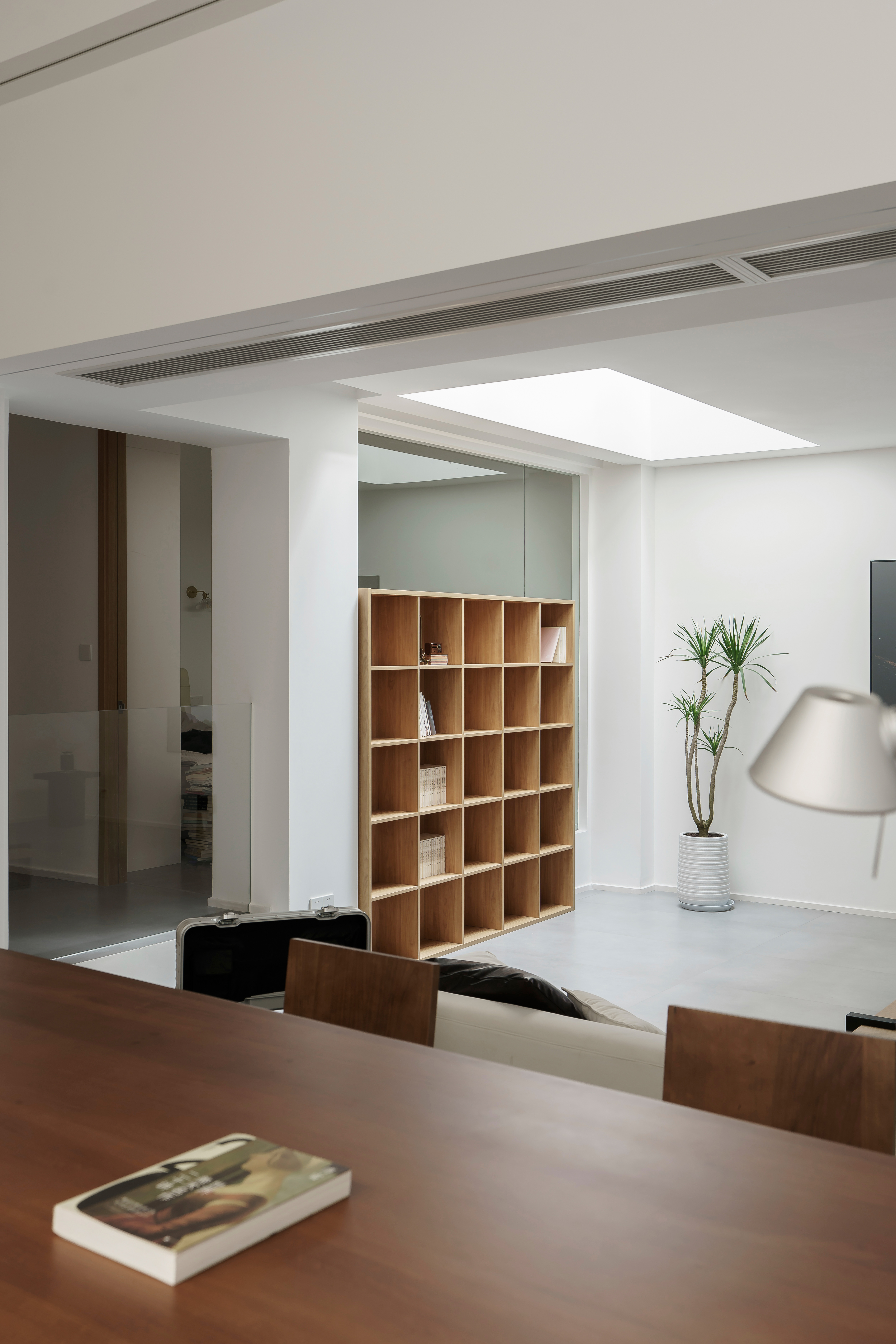 空间布局:地下室的客厅更加随性与私密,一桌二椅,一书架一绿植,简单自然,洗净铅华。