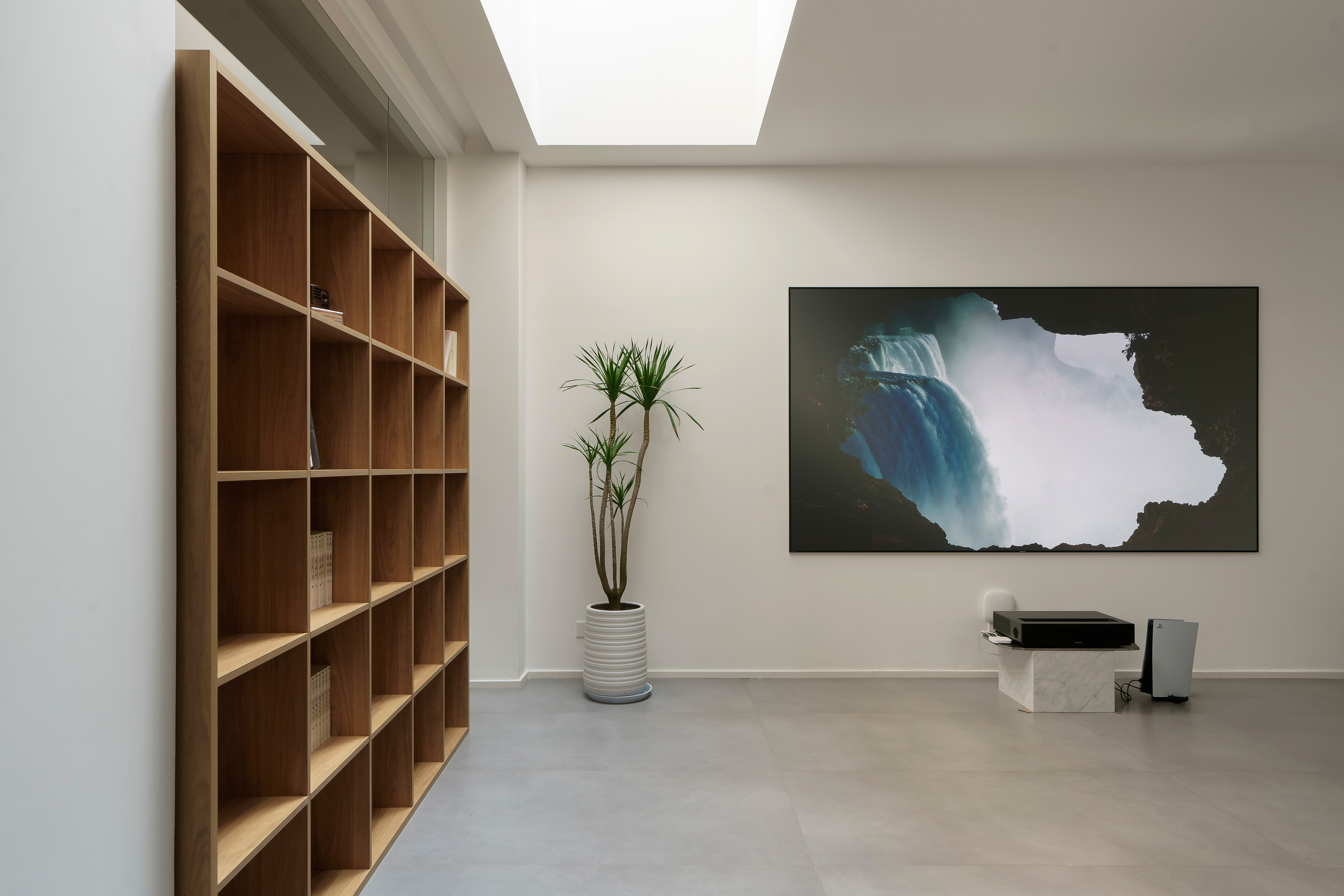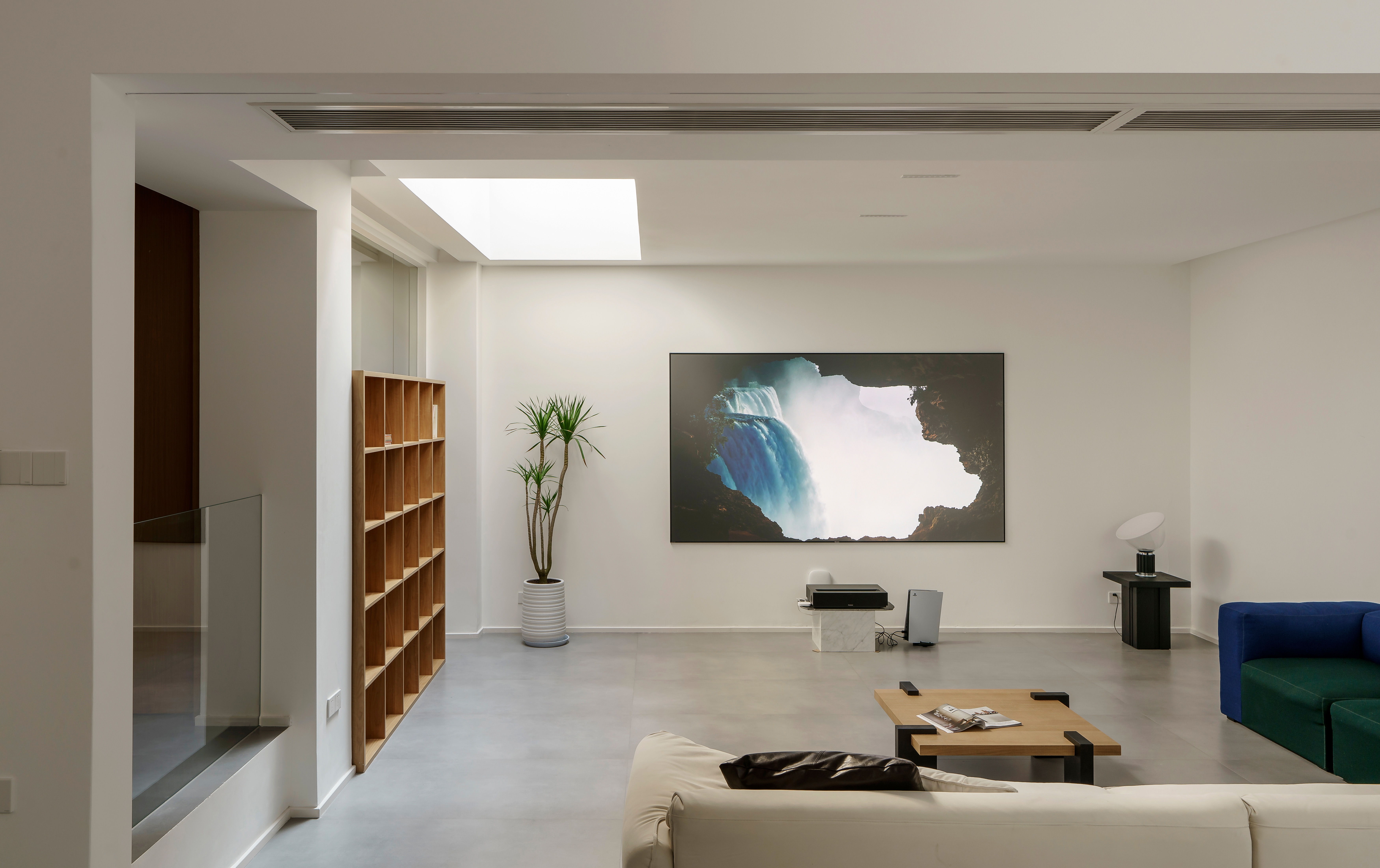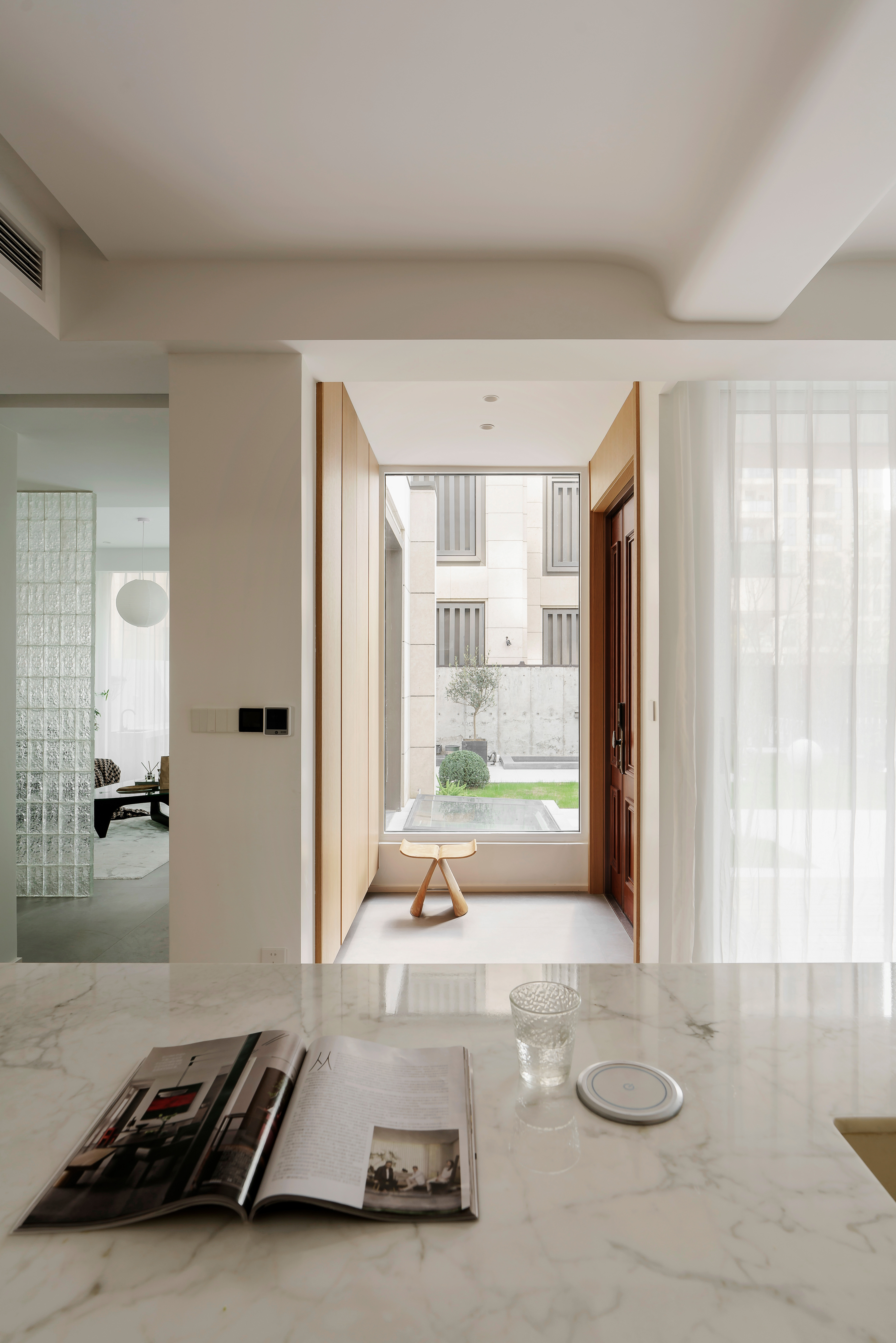 空间布局:地下室的客厅更加随性与私密,一桌二椅,一书架一绿植,简单自然,洗净铅华。