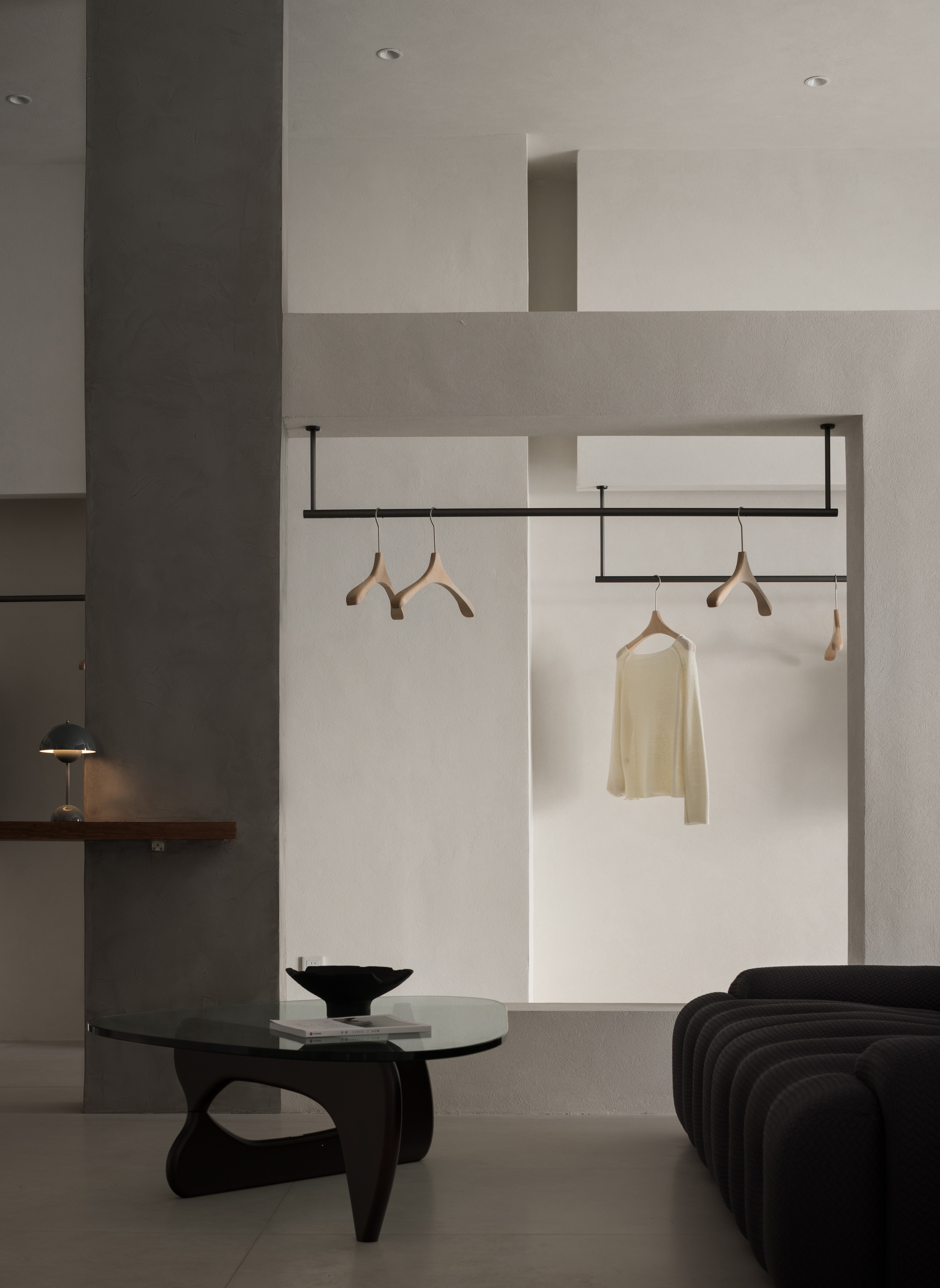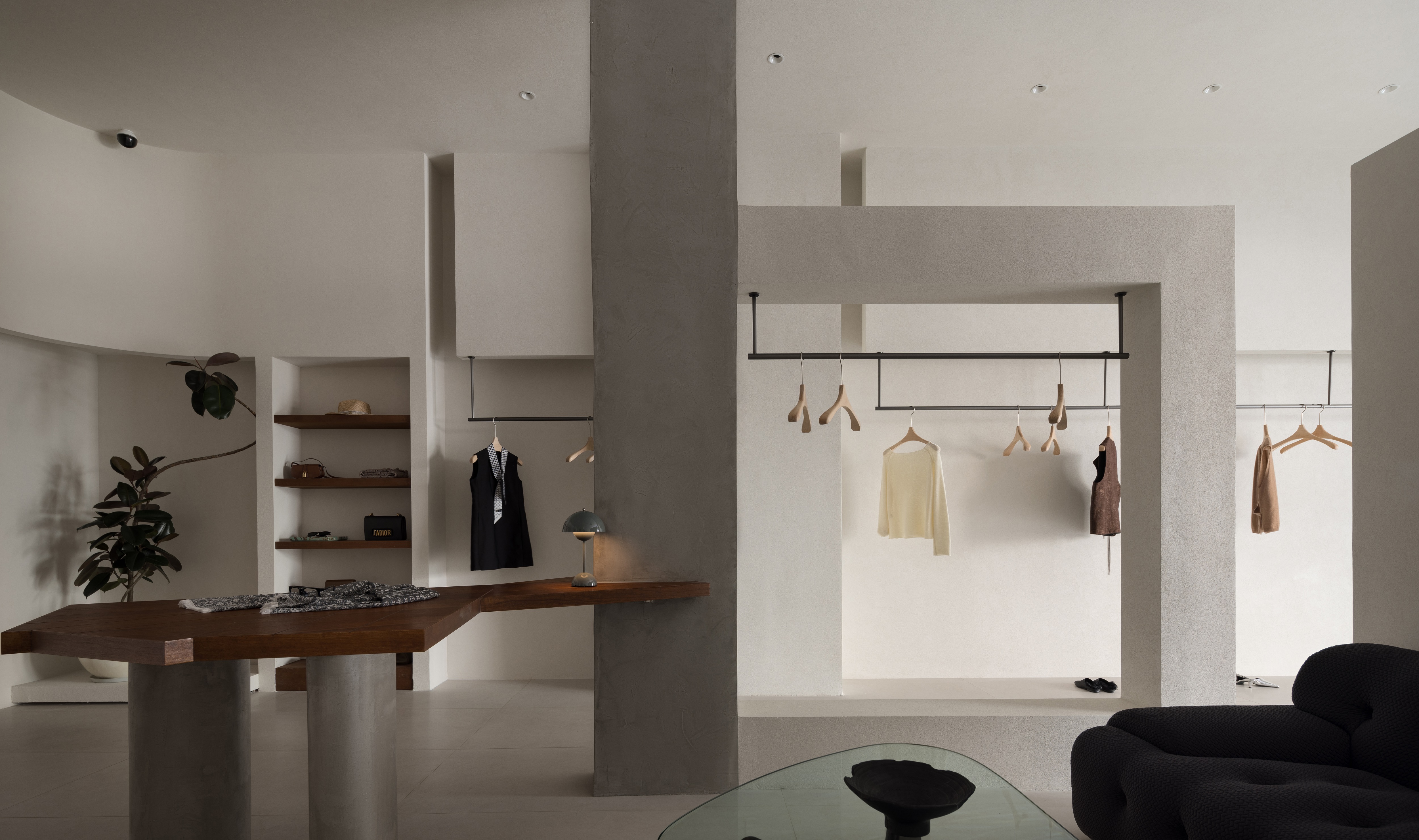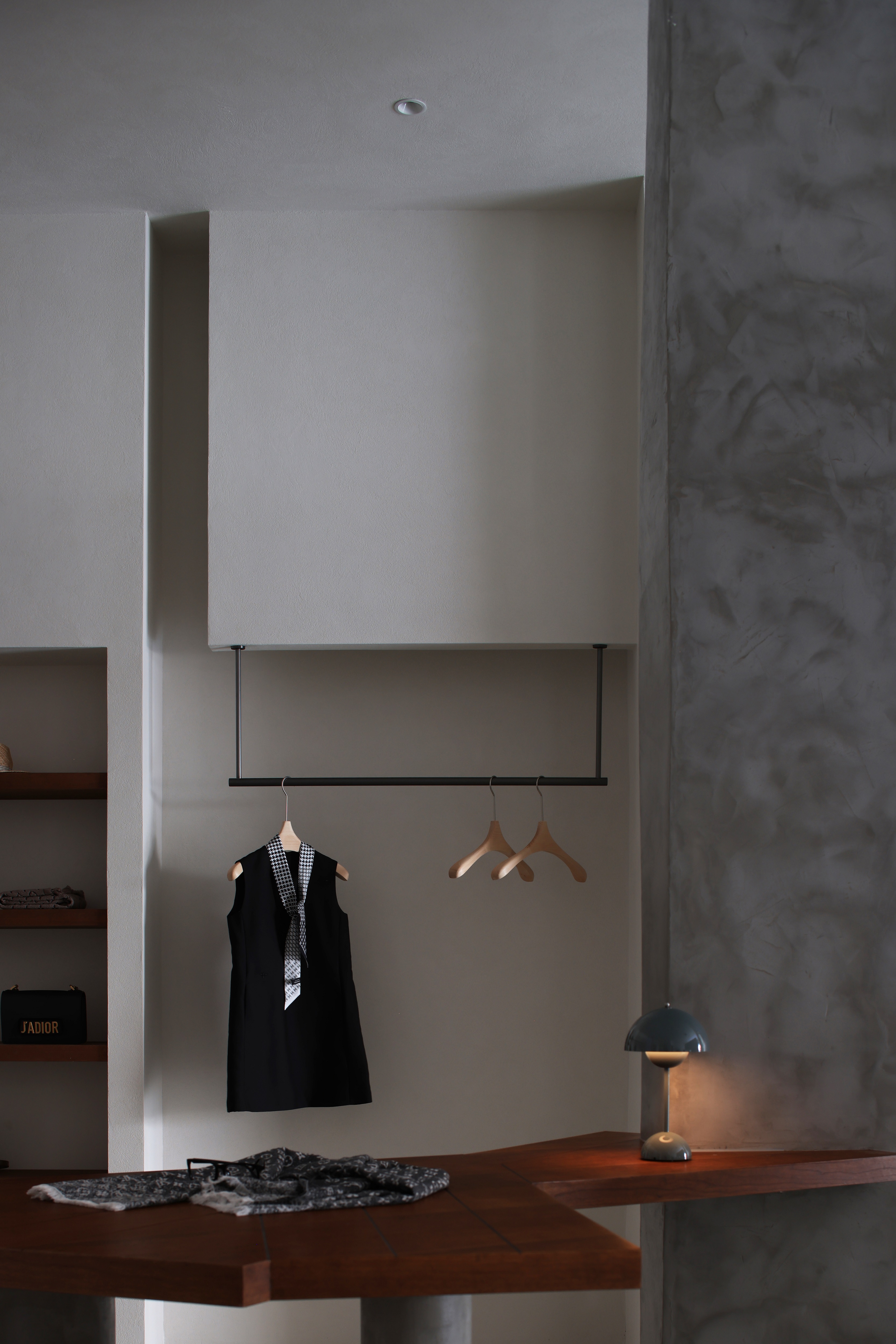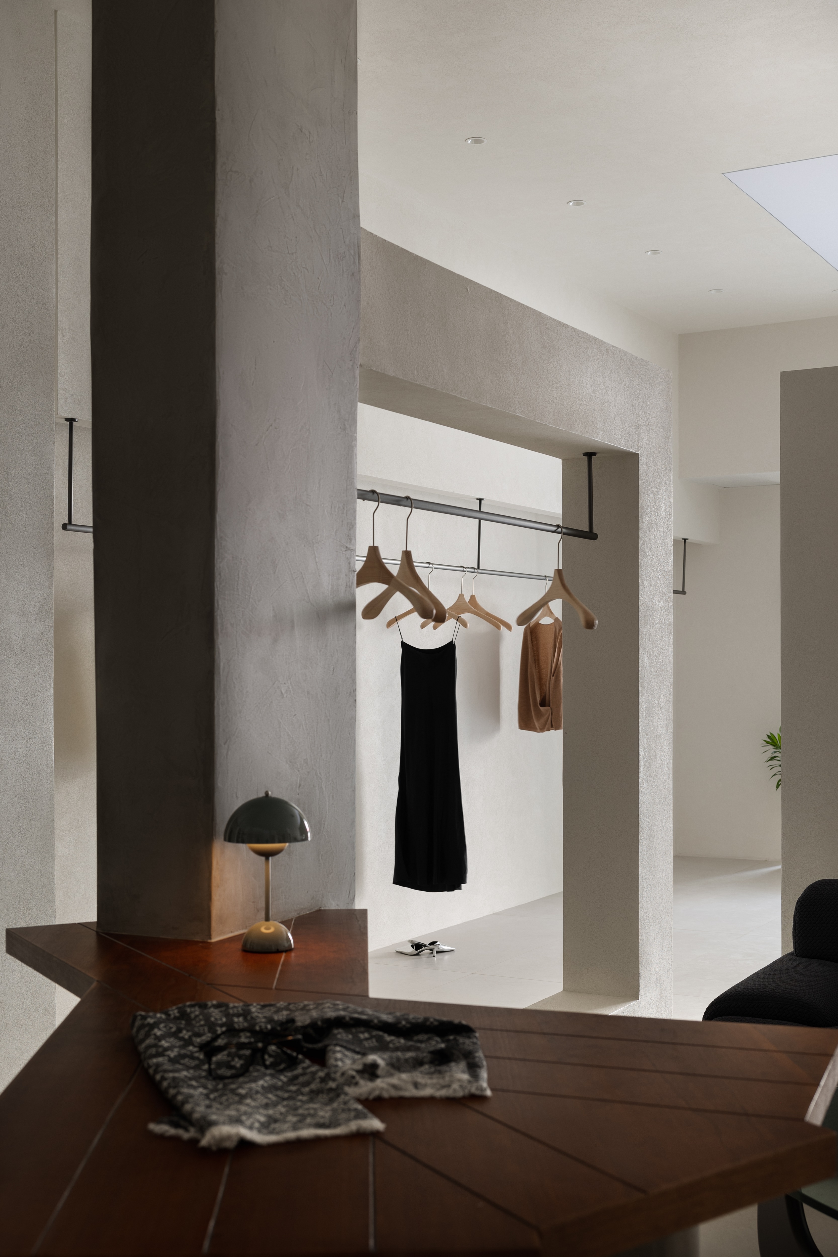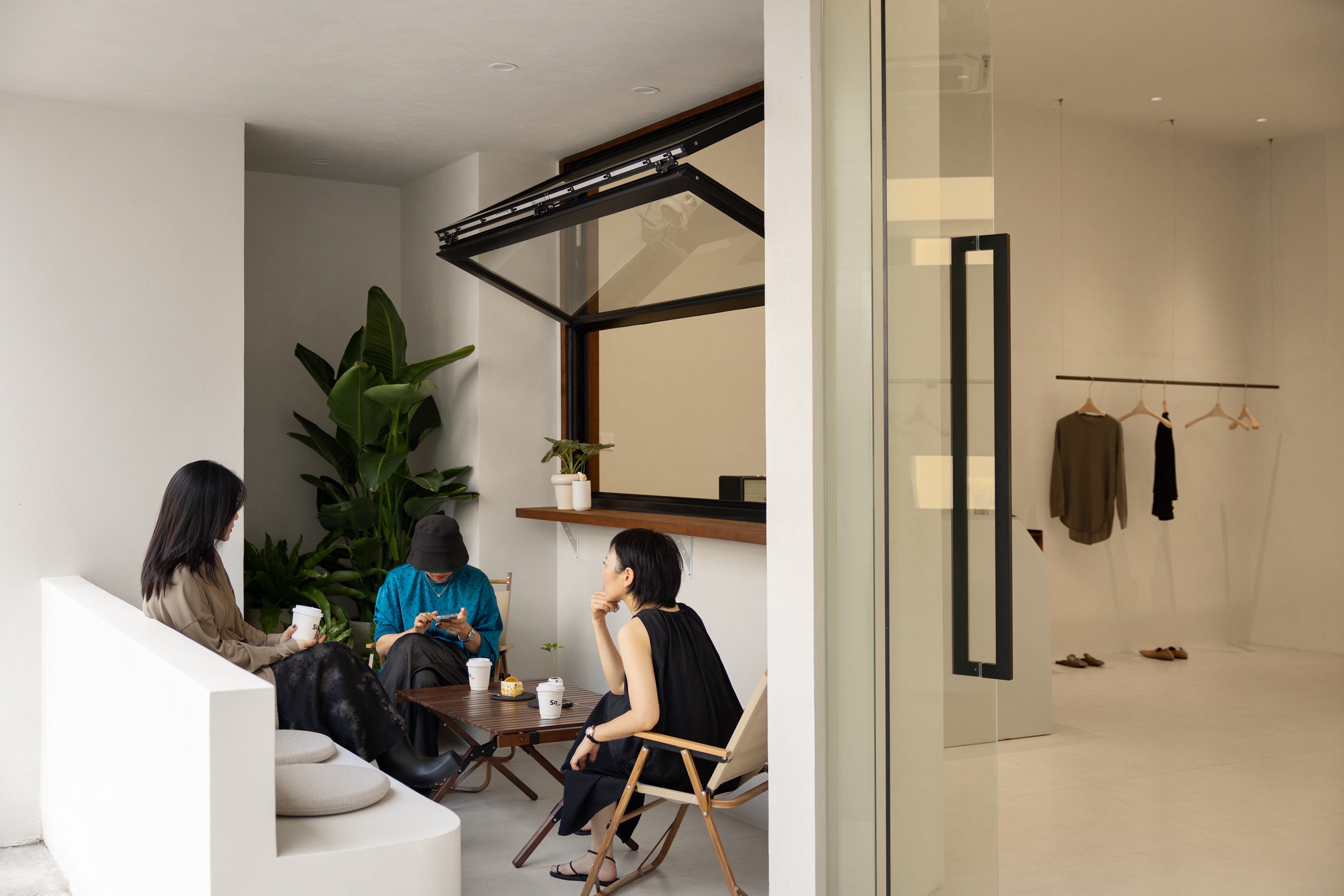 用户体验:本案最大的亮点是打破了传统服装门店展示形式,“牺牲”一部分室内面积给室外,打造休闲区。这样的好处有两点:一、增加商业产品模糊感,让消费者更加轻松购物,降低消费者的消费界线;二、把空间留给“路人”,路人累了也可以随时停下脚步小憩,想象一下,悠闲的午后,店主透过窗户递来亲手调制的咖啡,三两好友闲坐于此,甚是惬意。这种形式使得该店可以呈现更多的包容性,开放性,给未来多业态的发展提供了空间,它不仅仅只是一家单纯的女装店。