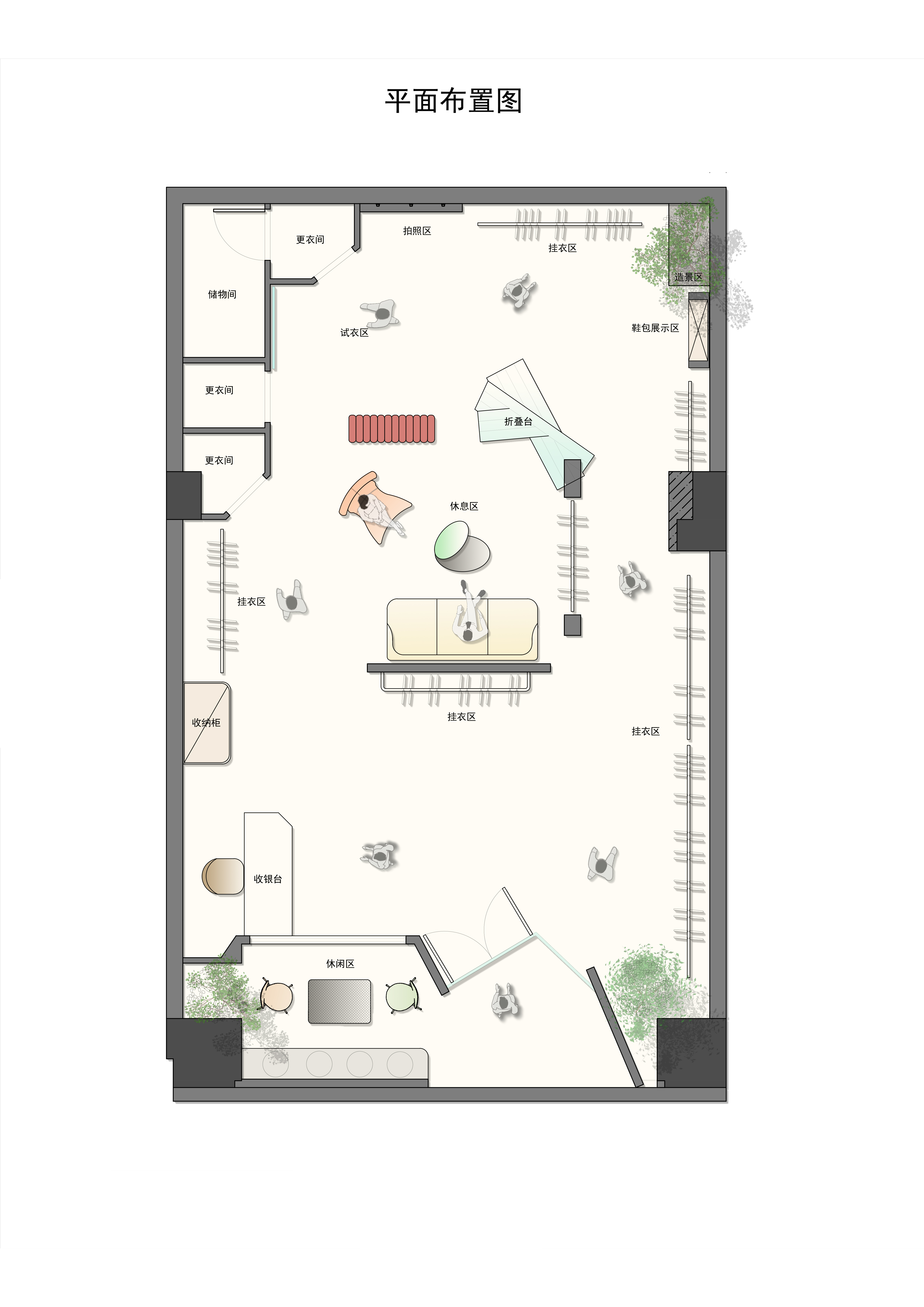 空间布局:部大部分线形流畅简洁,搭配边角的立面不规则形体以及异形的半高折叠台,元素呼应,整体统一,简洁干练又不失时尚,将其服装产品中性并富有女人独有气质的特点完美诠释。