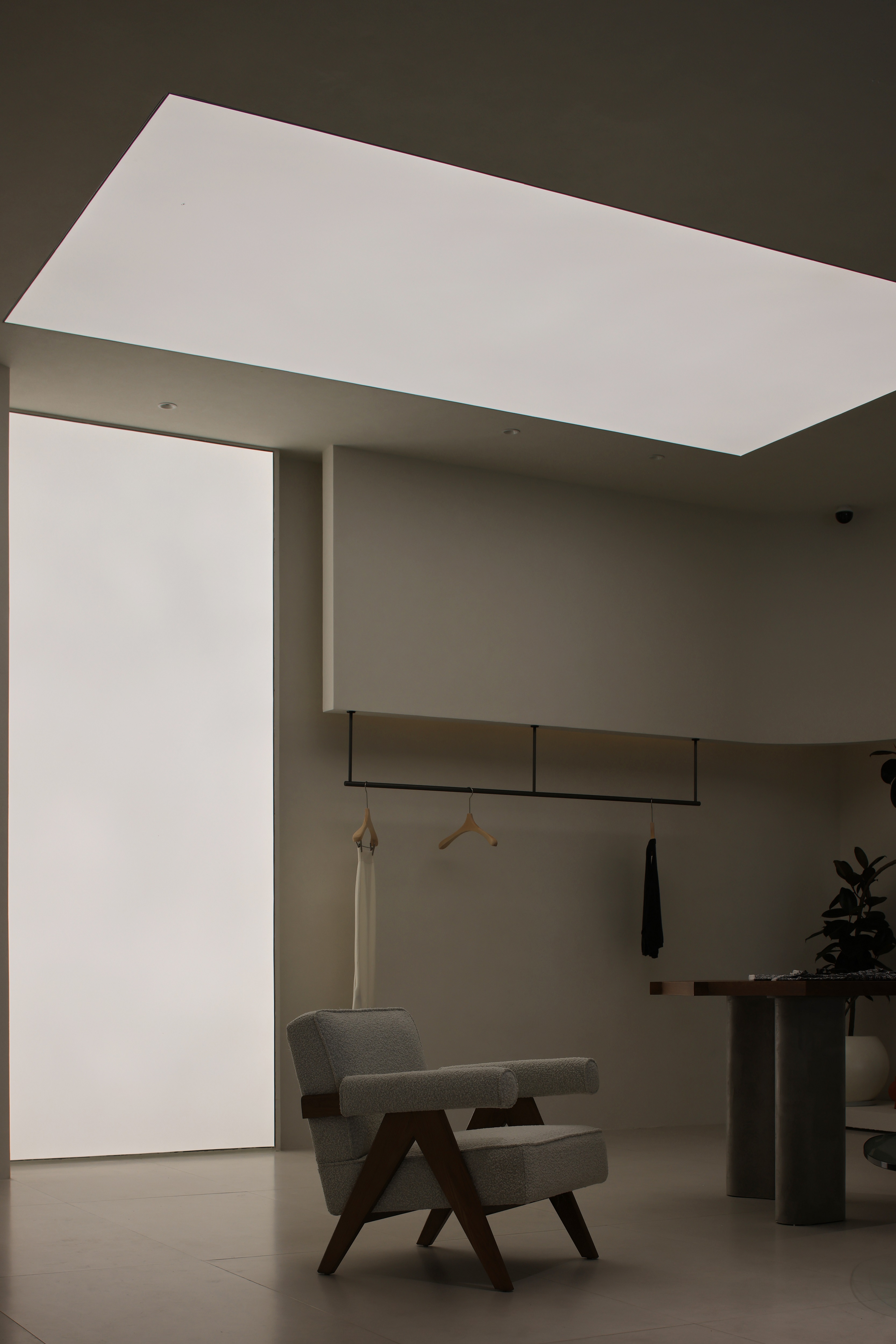 设计选材:两块大面积的透光膜天花提供了日常照明的同时,营造出犹如自然光线的光照氛围,柔和的光线更有利于服装产品的展示,拍照区立面的透光膜巧妙设计,可以给拍照区进行很好的补光,使得这里成为了顾客拍照打卡的最佳区域。